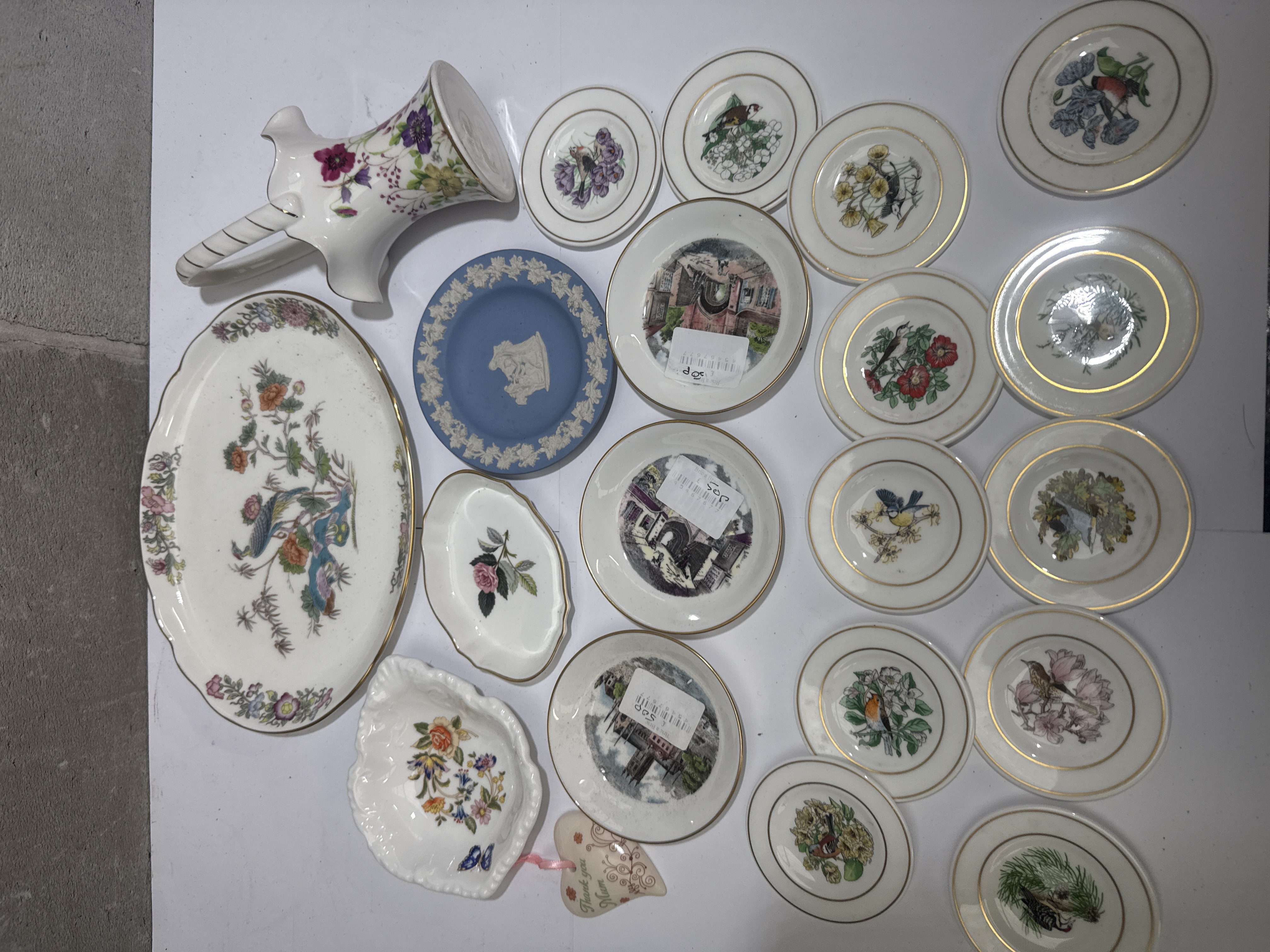 This lot consists of 21 ceramic items comprising various decorative tableware and cabinet pieces. The collection includes a white porcelain pitcher featuring polychrome floral decoration and a twisted handle, alongside a large oval platter decorated with a bird and floral motif. A blue jasperware plate with classical-inspired white relief work, characteristic of Wedgwood, is present. The assortment further contains multiple small decorative saucers and plates, many of which display ornithological illustrations or architectural landscape scenes, frequently finished with gilded rims, including examples by Aynsley and others. Additional components include a scalloped bowl with floral sprays, an oval dish with rose decoration, and a small heart-shaped ceramic tag inscribed Thank You Mum. Several pieces retain adhesive price labels.