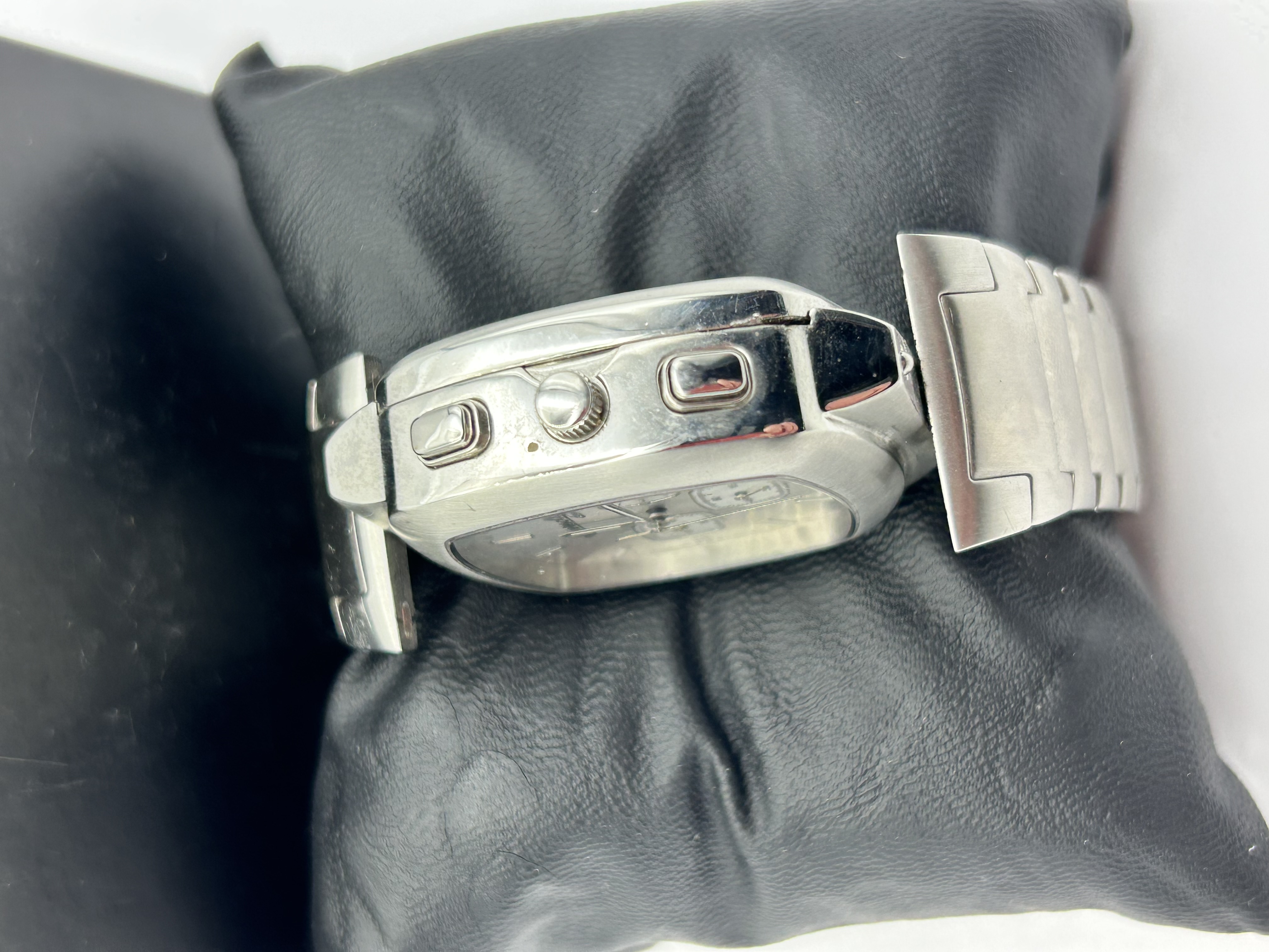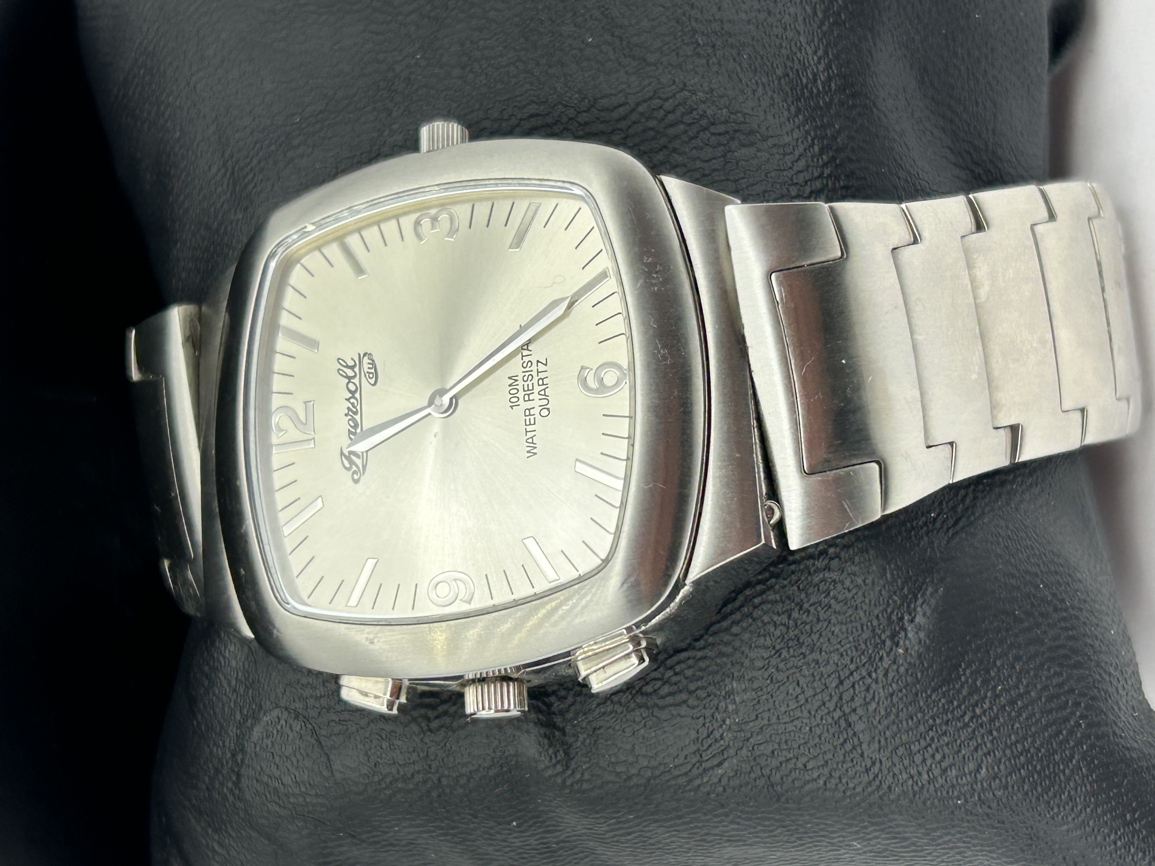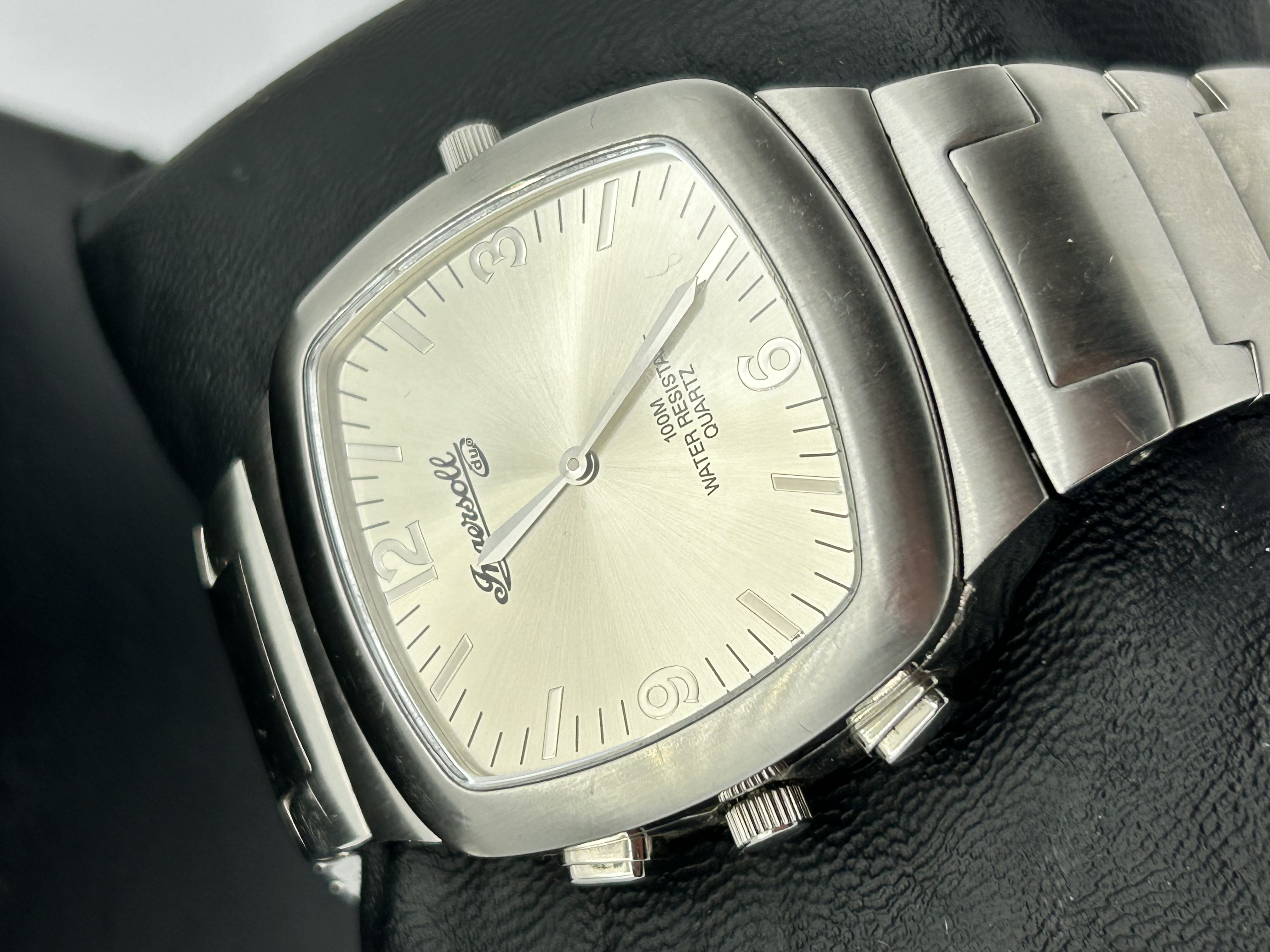 An Ingersoll Duo reversible wristwatch featuring a dual-dial design. The watch is housed in a rectangular brushed and polished stainless steel pivoting case with an integrated link bracelet. One face presents a salmon-colored chronograph dial with three sub-dials and baton indices. The reverse face features a silver sunburst finish with Arabic numerals at the 12, 3, 6, and 9 o’clock positions. Both dials are marked Ingersoll duo, with the silver face further inscribed 100M Water Resistant Quartz. The piece is equipped with two pushers and a central crown on the side of the pivoting case.