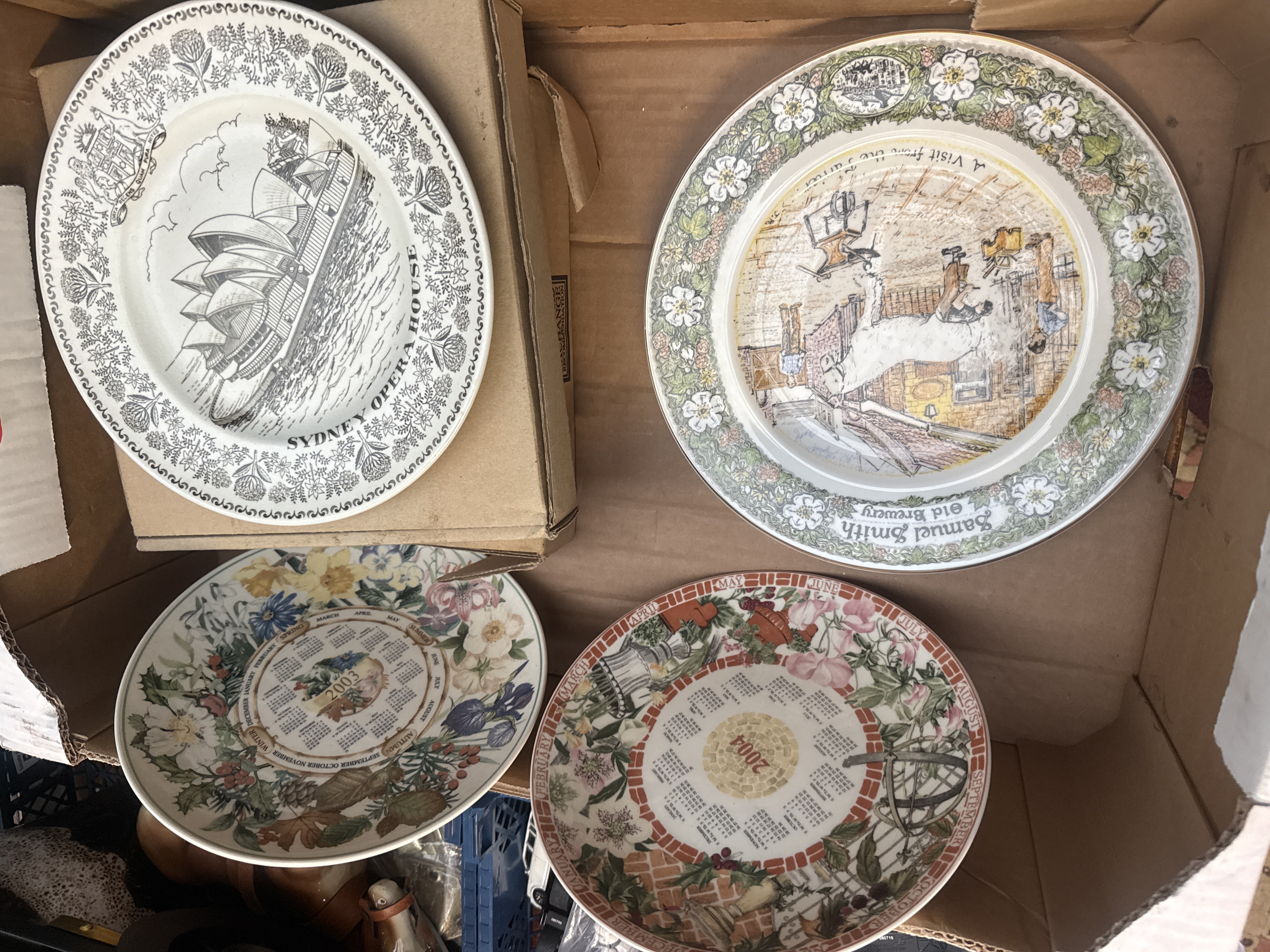 A group of various ceramic and porcelain decorative and commemorative tableware and serving pieces. The collection includes several plates from a series featuring vintage automobiles with turquoise borders, including a Krieger Electric 1904 and a Rolls Royce 1904. Featured are two lidded tureens with floral and rooster motifs, a fluted dish with fruit transfers, and a large platter depicting a turkey with a maroon and gold border. Commemorative items include a black and white transfer-decorated plate of the Sydney Opera House, a Samuel Smith Old Brewery scene plate, and calendar plates for 2003 and 2004. The lot further comprises floral-patterned pitchers, a fish-themed platter, and several landscape and floral-decorated plates, including a Staffordshire ABC child’s plate and other antique children’s transferware.