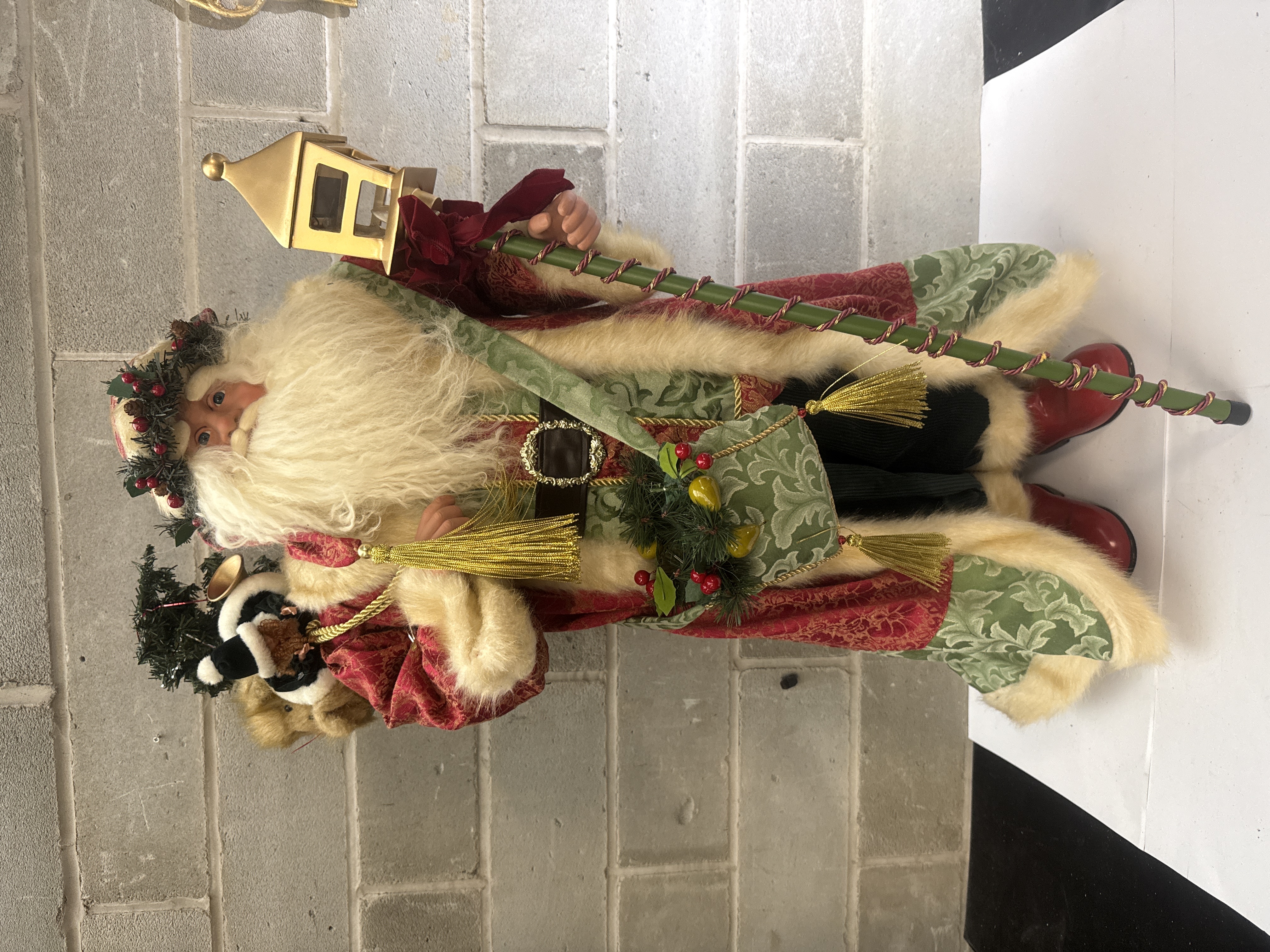 An Ashton Drake Galleries collector’s edition figure titled Lamplight Santa, designed by Thomas Kinkade. This 35-inch standing figure is dressed in a traditional Father Christmas style, featuring a long robe of red and green patterned brocade fabric with cream-colored plush faux fur trim. The figure includes a synthetic white beard and hair, a holly wreath headpiece, and a coordinating green patterned satchel embellished with gold-toned tassels and festive berry accents. He carries a tall green staff topped with a gold-toned lantern and wears red boots with a black belt featuring a gold-colored buckle. This item comes in its original box.