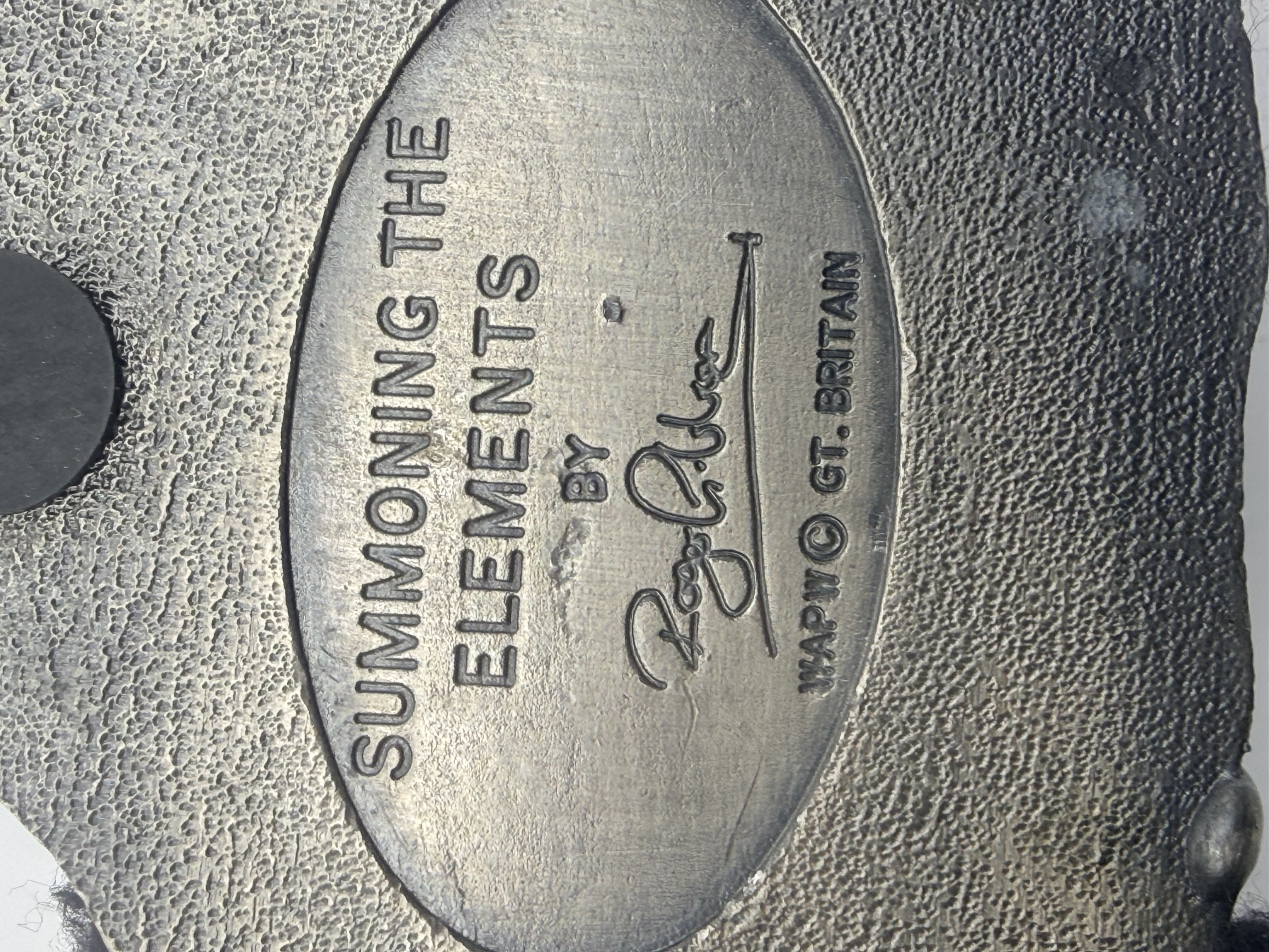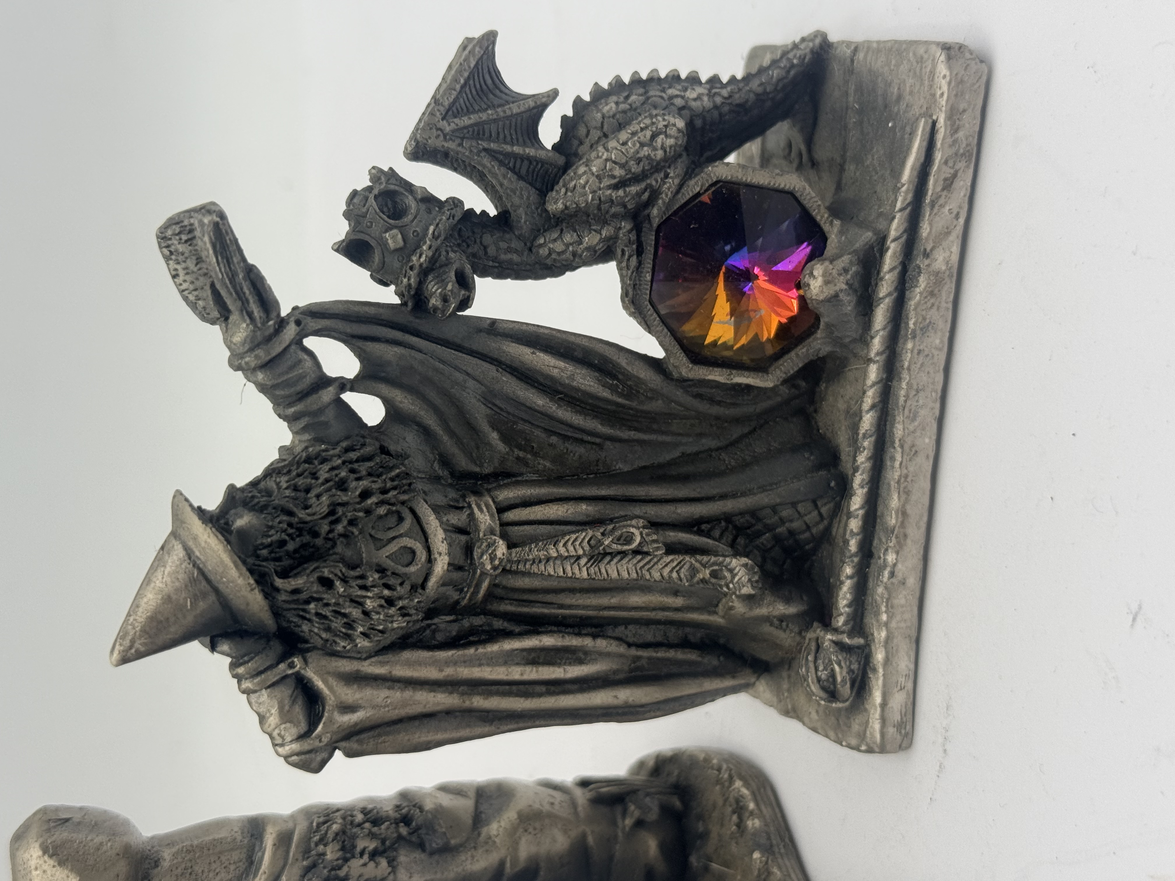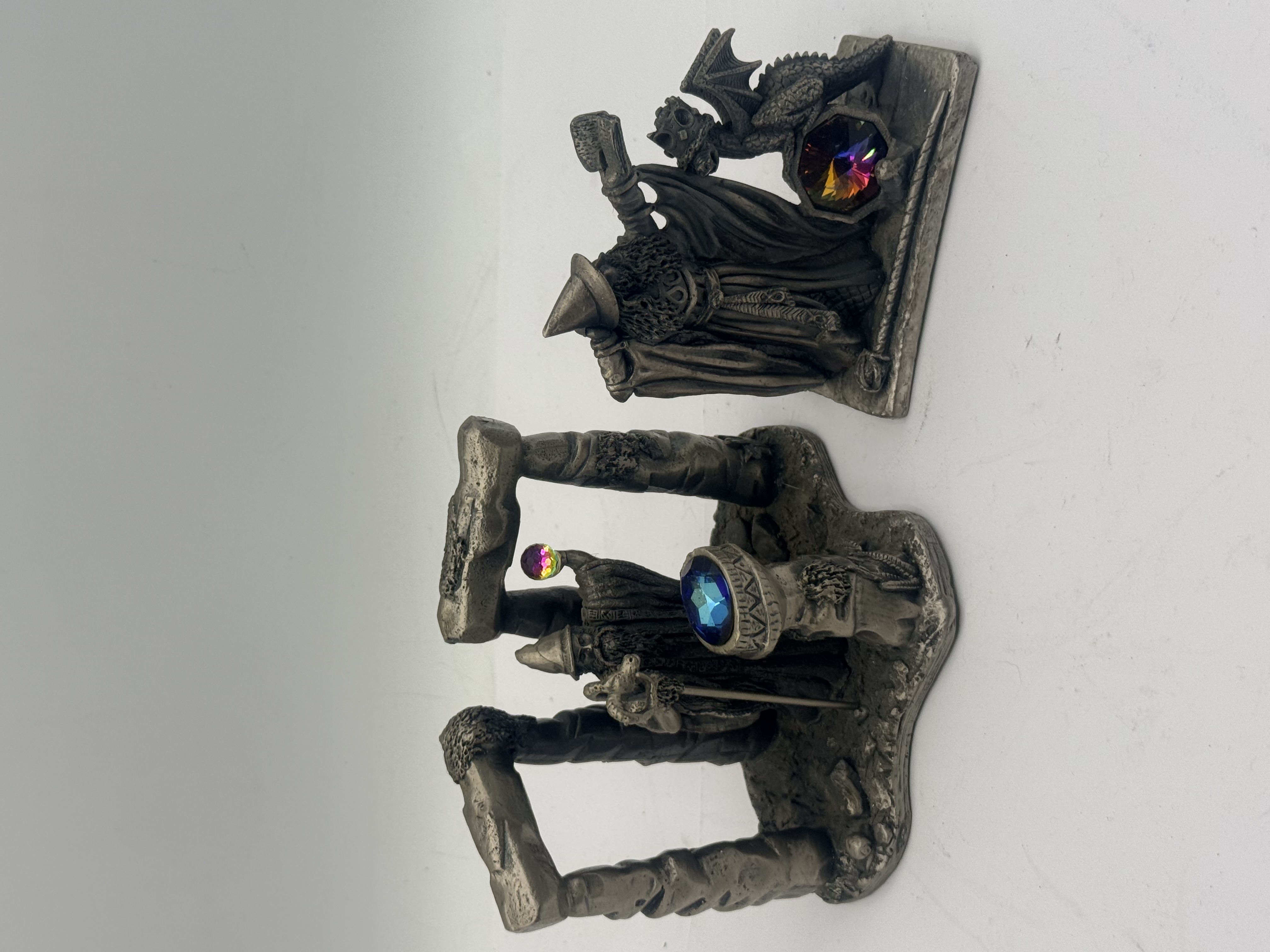 Two WAPW Myth and Magic pewter figurines. The first figurine, titled Summoning the Elements, depicts a robed wizard standing within a trilithon-style stone structure, accented with a large inset blue faceted crystal and a smaller, multi-colored iridescent orb. The second figurine features a wizard figure accompanied by a small dragon, both positioned adjacent to a large, octagonal iridescent crystal. Both pieces are cast in pewter with a weathered, darkened metallic finish. The underside of the Summoning the Elements piece is marked SUMMONING THE ELEMENTS BY Roger Gibbs and carries a WAPW © GT. BRITAIN copyright mark.