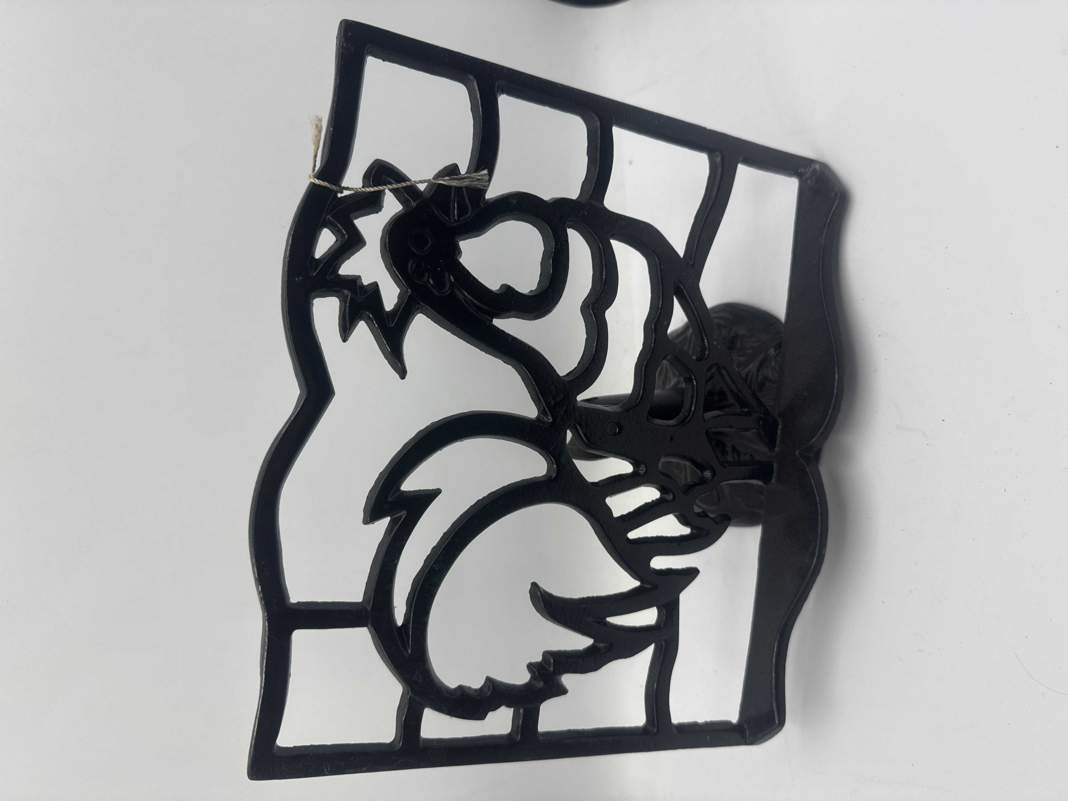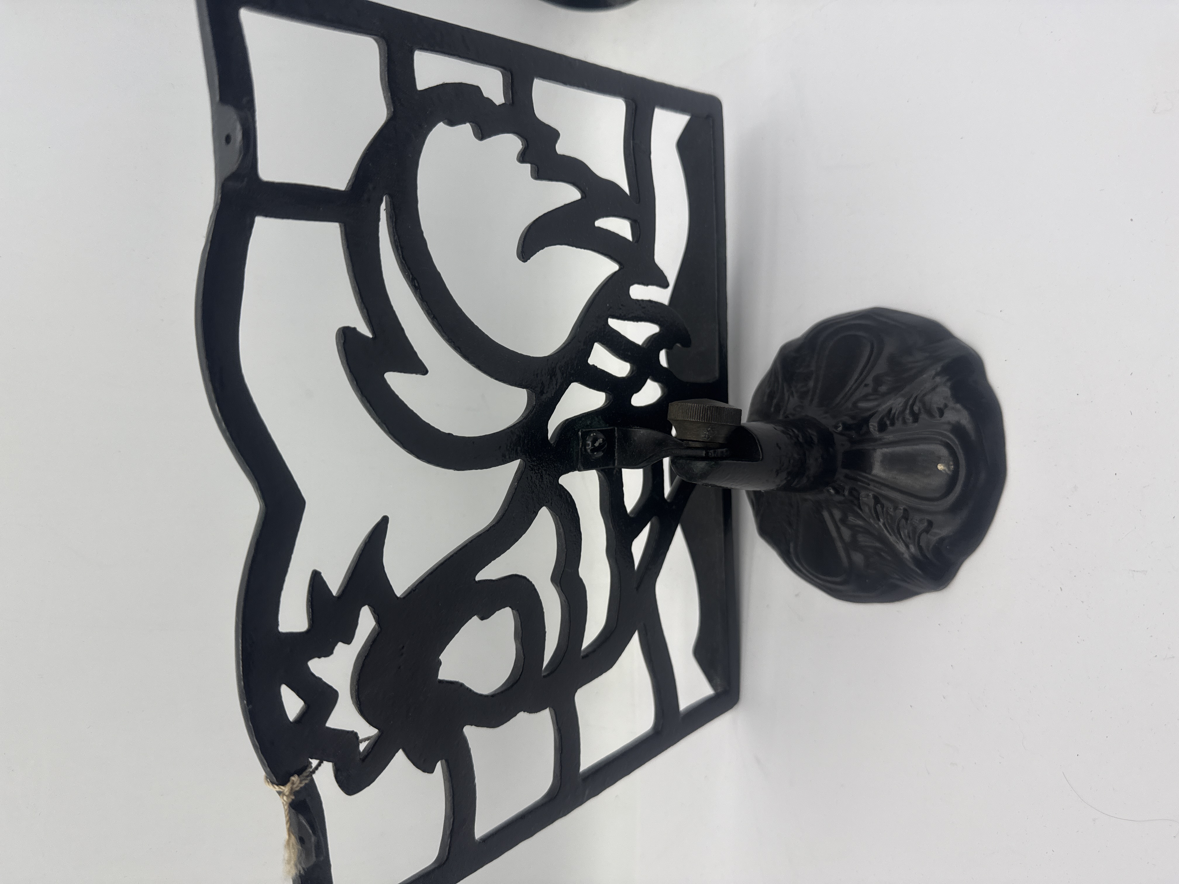 A wall-mounted decorative metal plaque featuring a stylized bird of prey in profile, set within an open grid-work rectangular frame. The piece is constructed from metal with a uniform matte black finish. The plaque is attached to a decorative, fluted circular wall mount by an adjustable hinged arm, which is secured with a metal thumbscrew. The design utilizes negative space to define the avian form against the linear grid background.