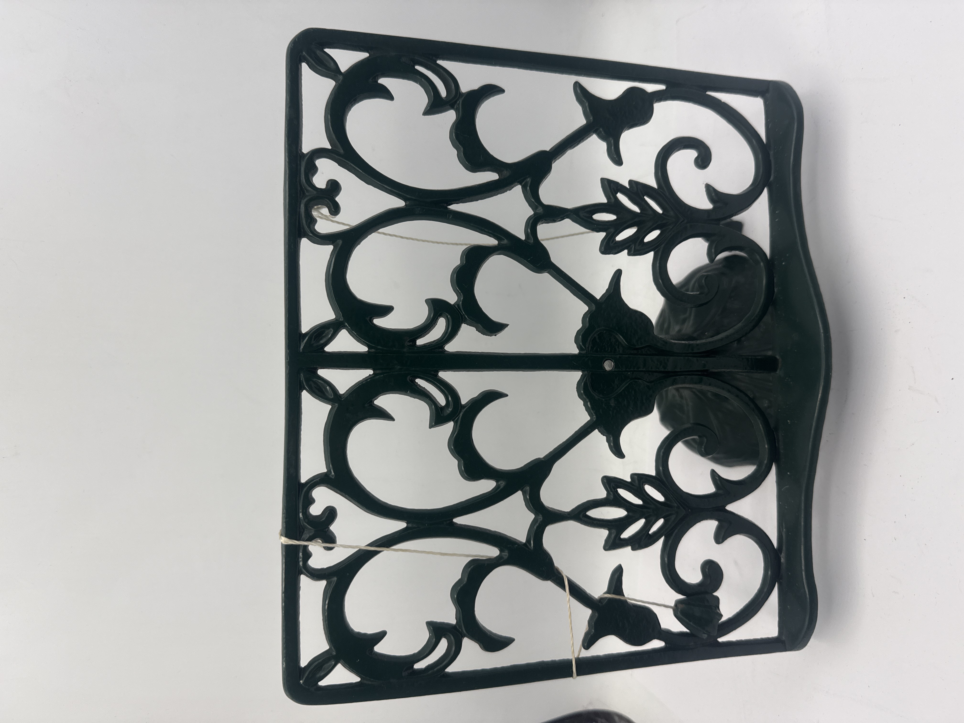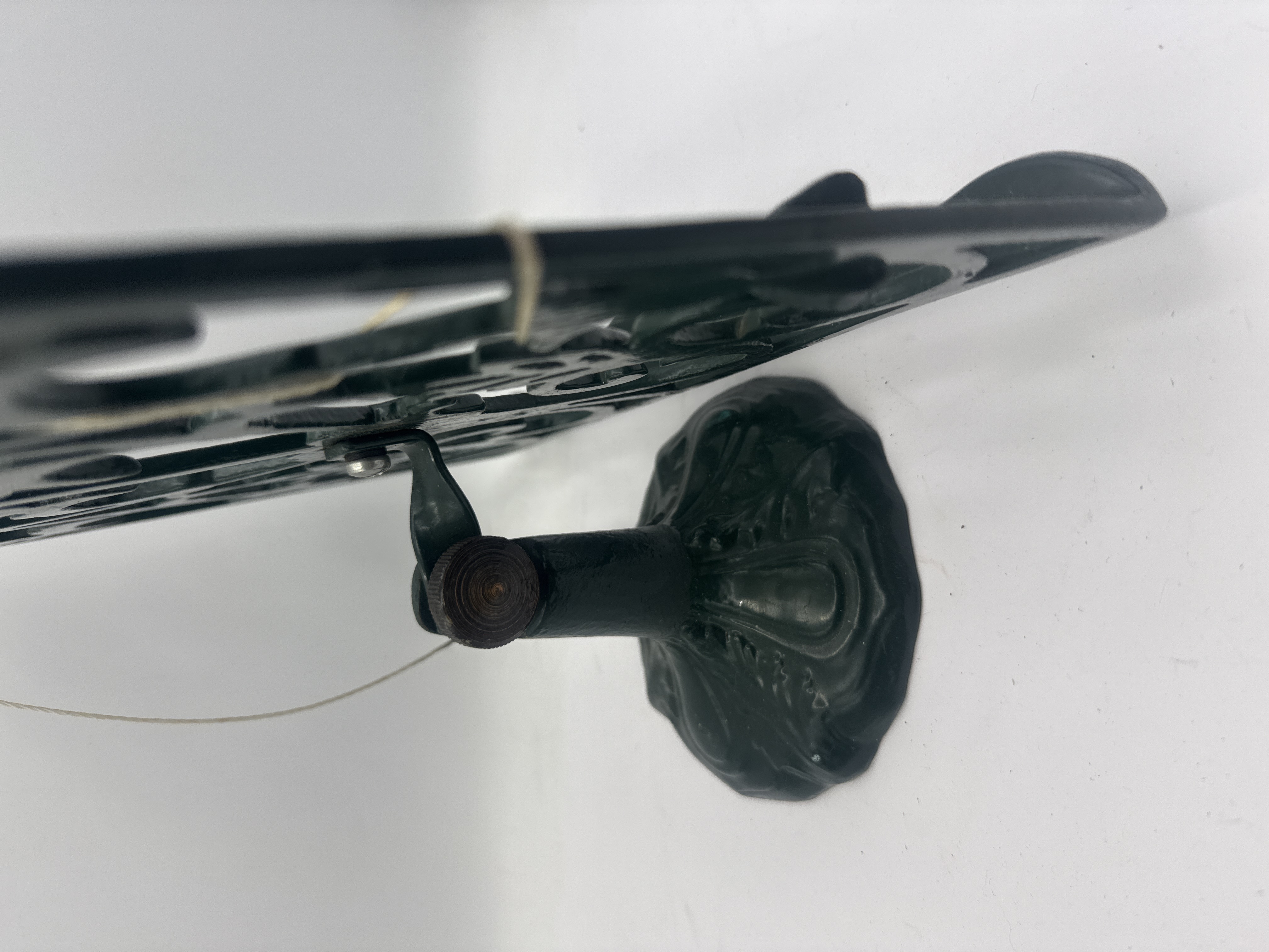 A cast iron cookbook stand or recipe holder featuring an ornate openwork design with symmetrical scrolling foliate and floral motifs. The piece is finished in a dark green or black coating. The rectangular rest is supported by an adjustable tilting mechanism with a knurled thumbscrew, allowing for various viewing angles. The assembly is mounted on a weighted, decorative circular base with molded detailing. A length of string is tied across the front face to assist in holding pages open. The design reflects a Victorian-influenced style. No manufacturer marks or signatures are visible.