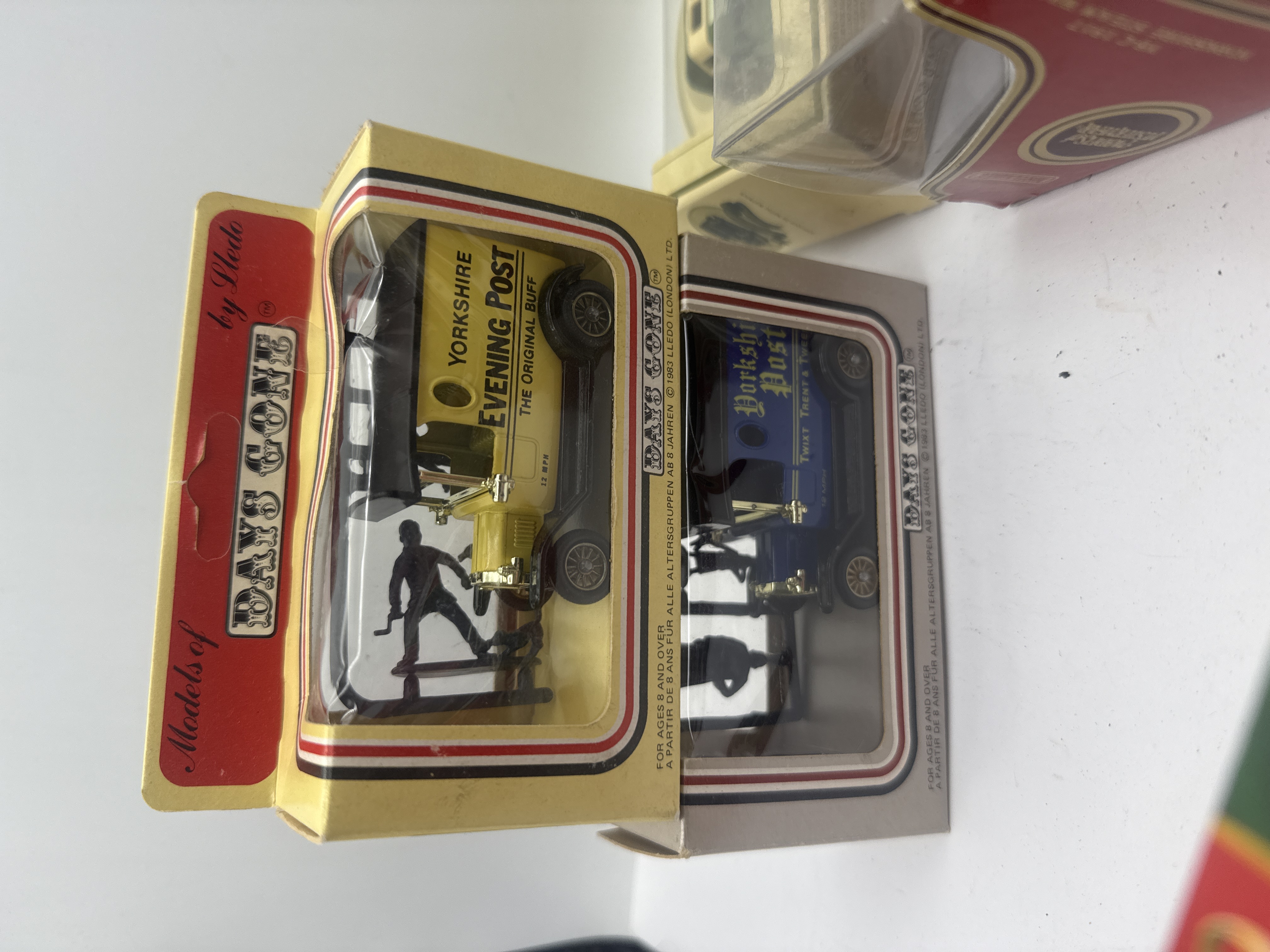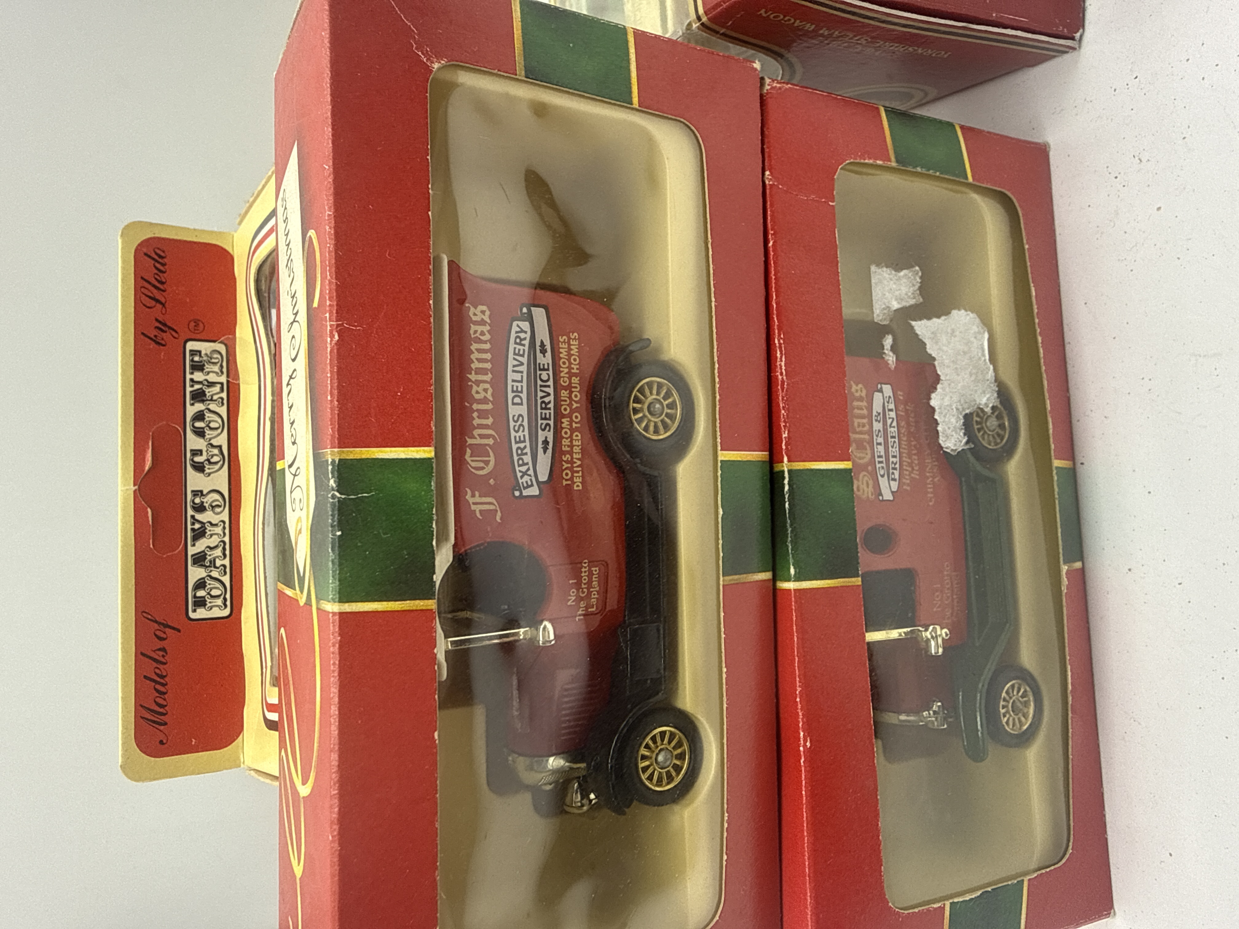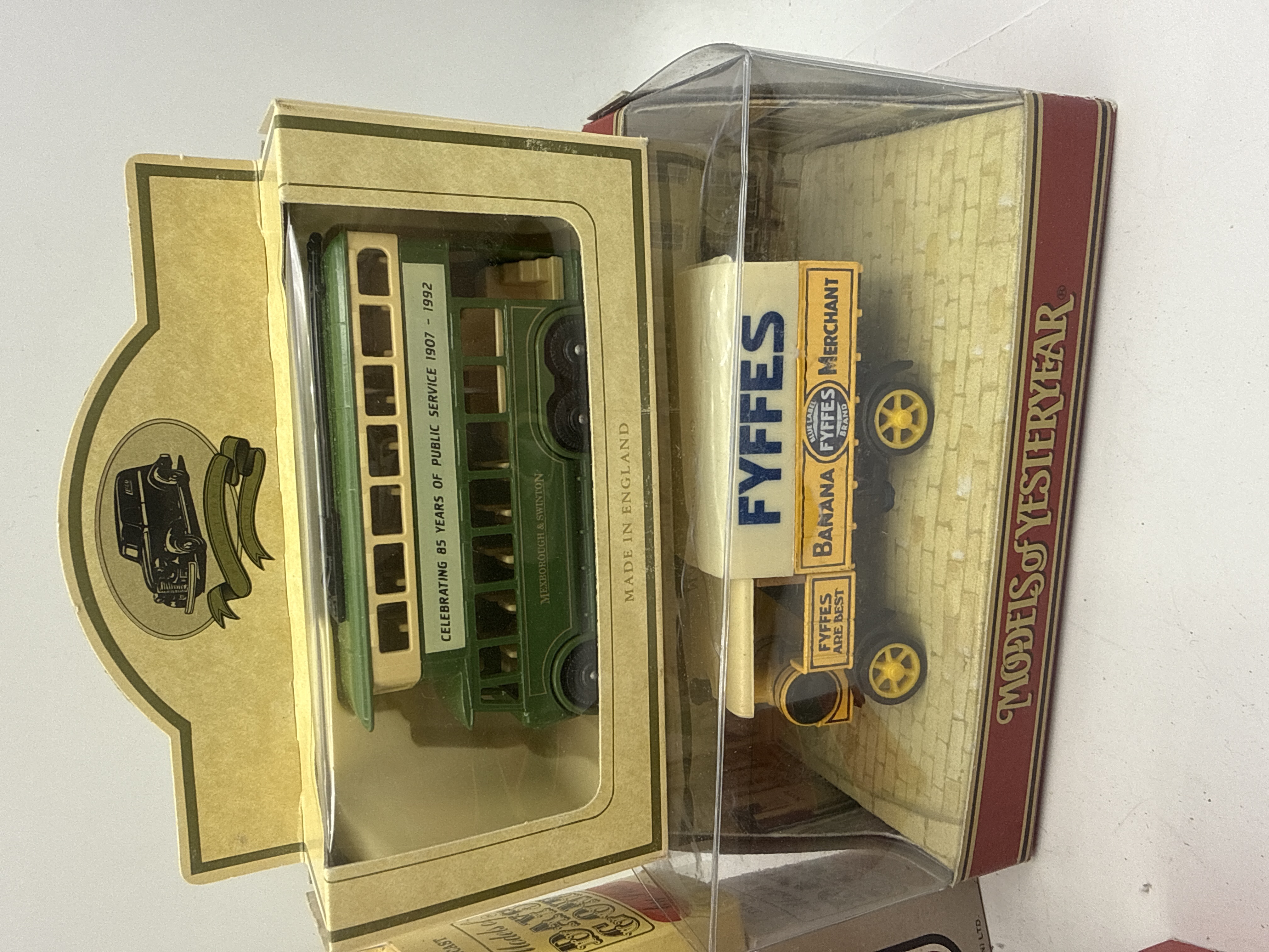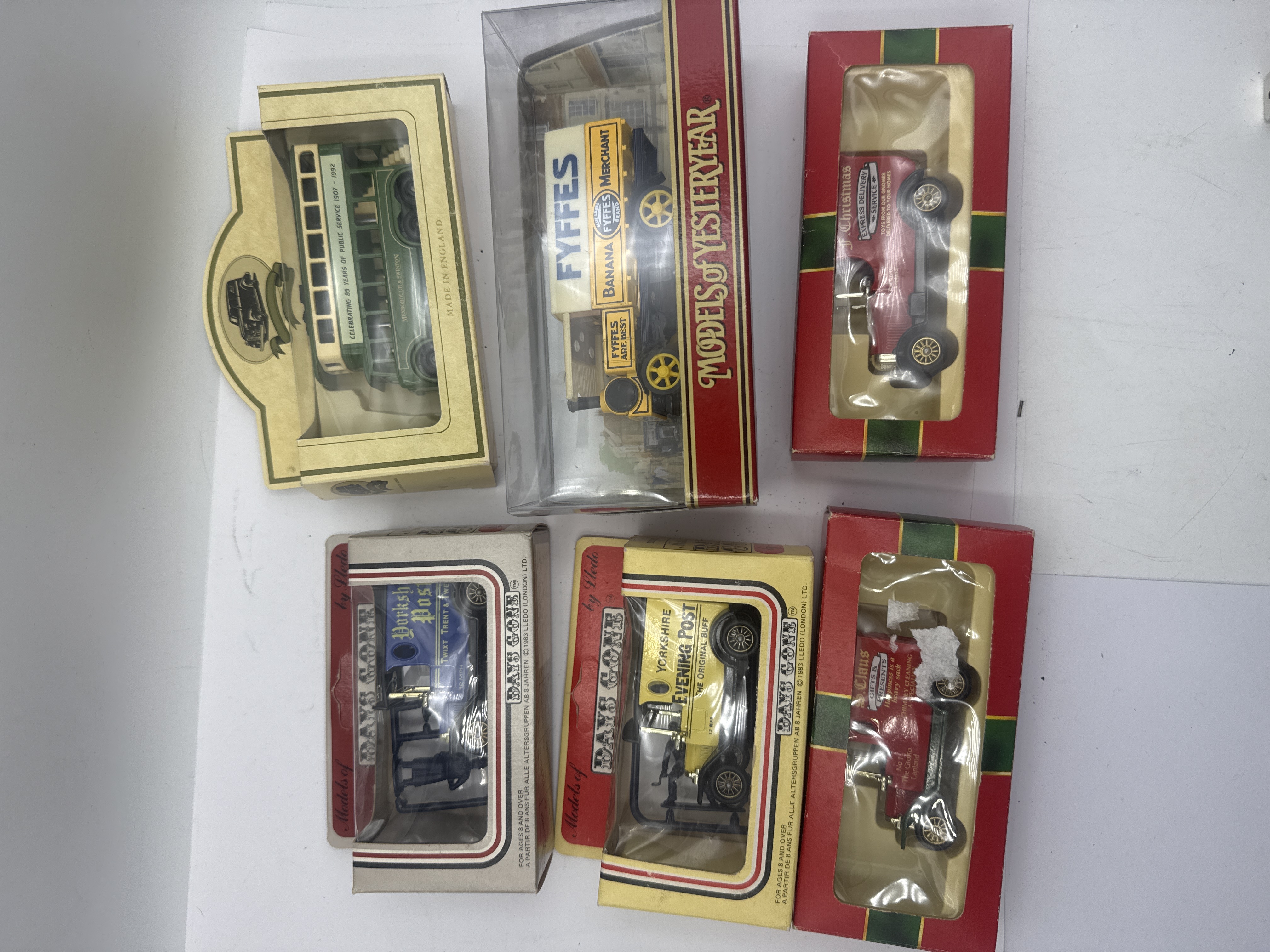 A collection of 6 die-cast model vehicles primarily from the Lledo Days Gone and Matchbox Models of Yesteryear series. The group includes a Lledo green double-decker bus celebrating 85 years of public service for Mexborough & Swinton (1907-1992), a Matchbox Models of Yesteryear yellow Fyffes Banana Merchant truck, and four Lledo Days Gone delivery vans. The delivery vans comprise a blue Yorkshire Post truck, a yellow Yorkshire Evening Post truck, and two red Christmas-themed vans labeled F. Christmas Express Delivery Service and S. Claus Gifts & Presents. Each model is constructed from die-cast metal with plastic parts and is housed in its original retail window packaging.