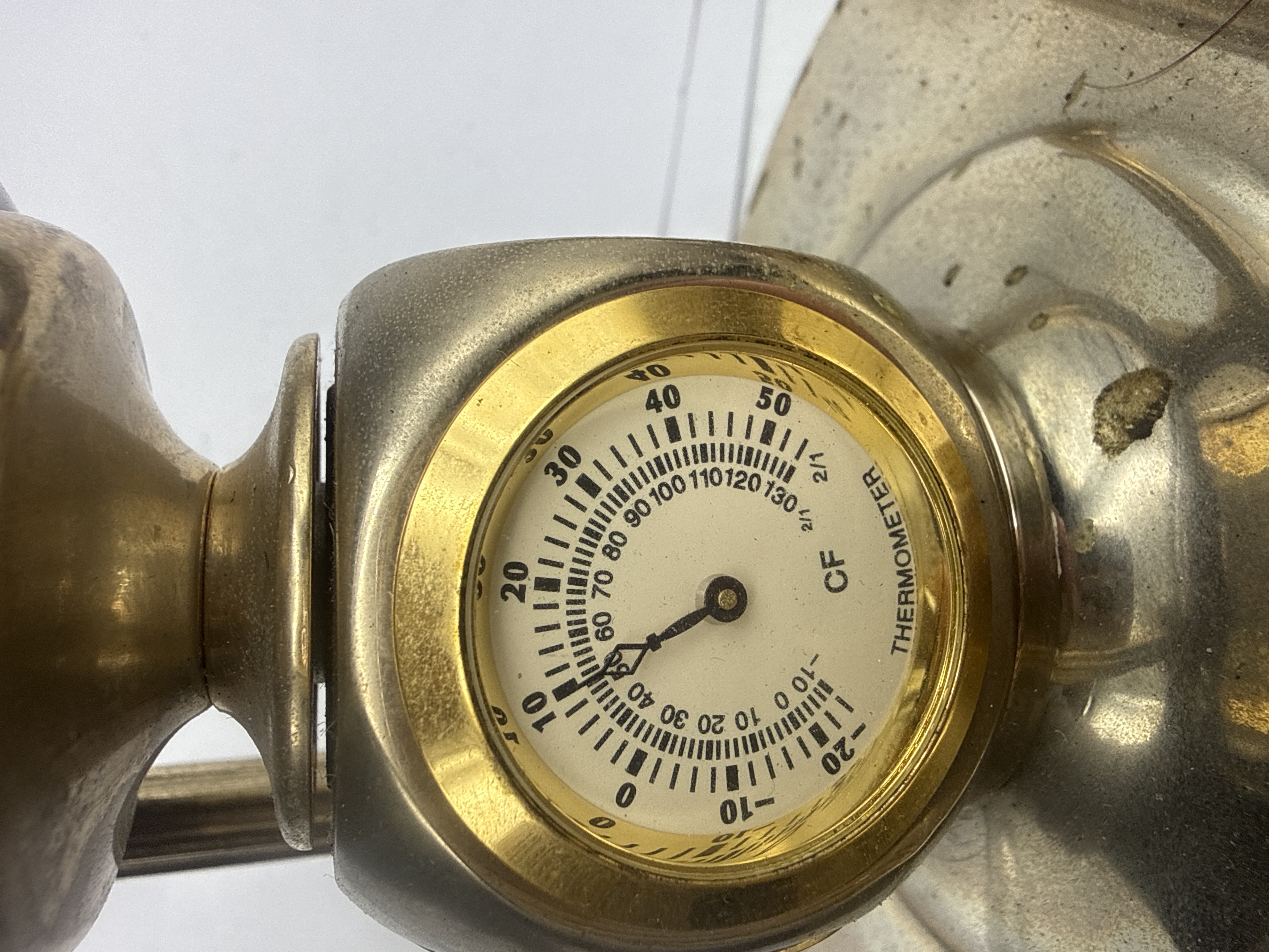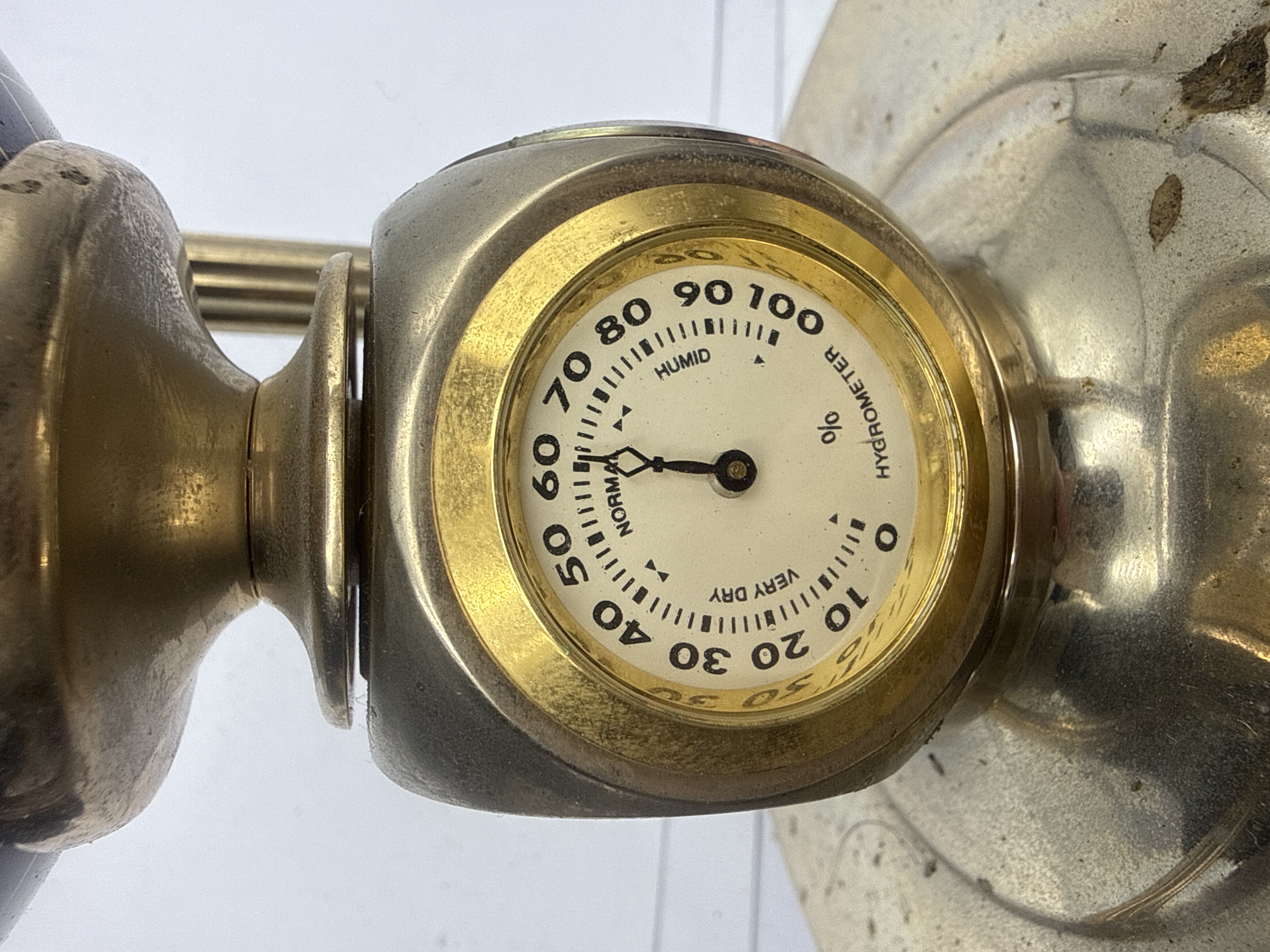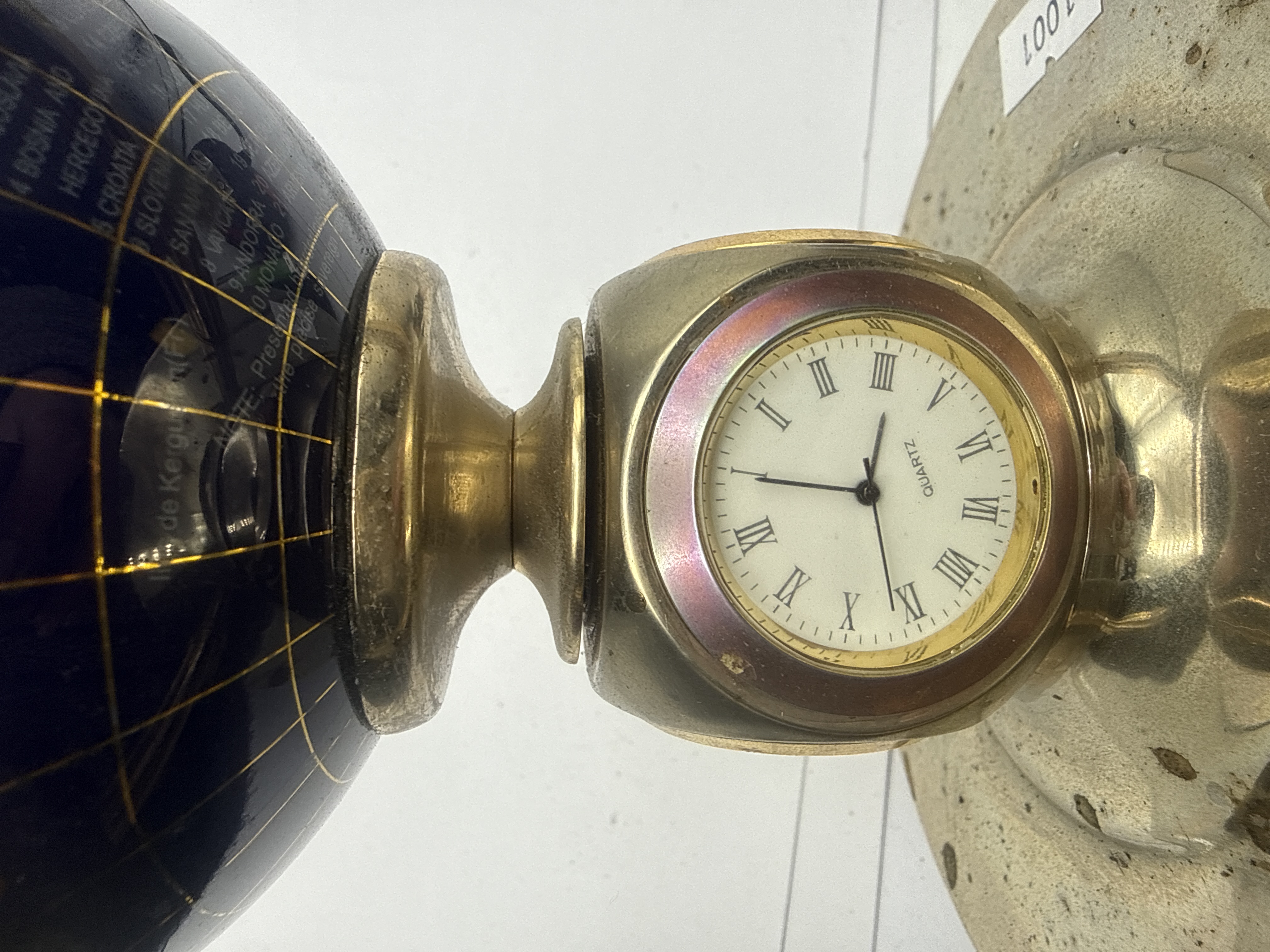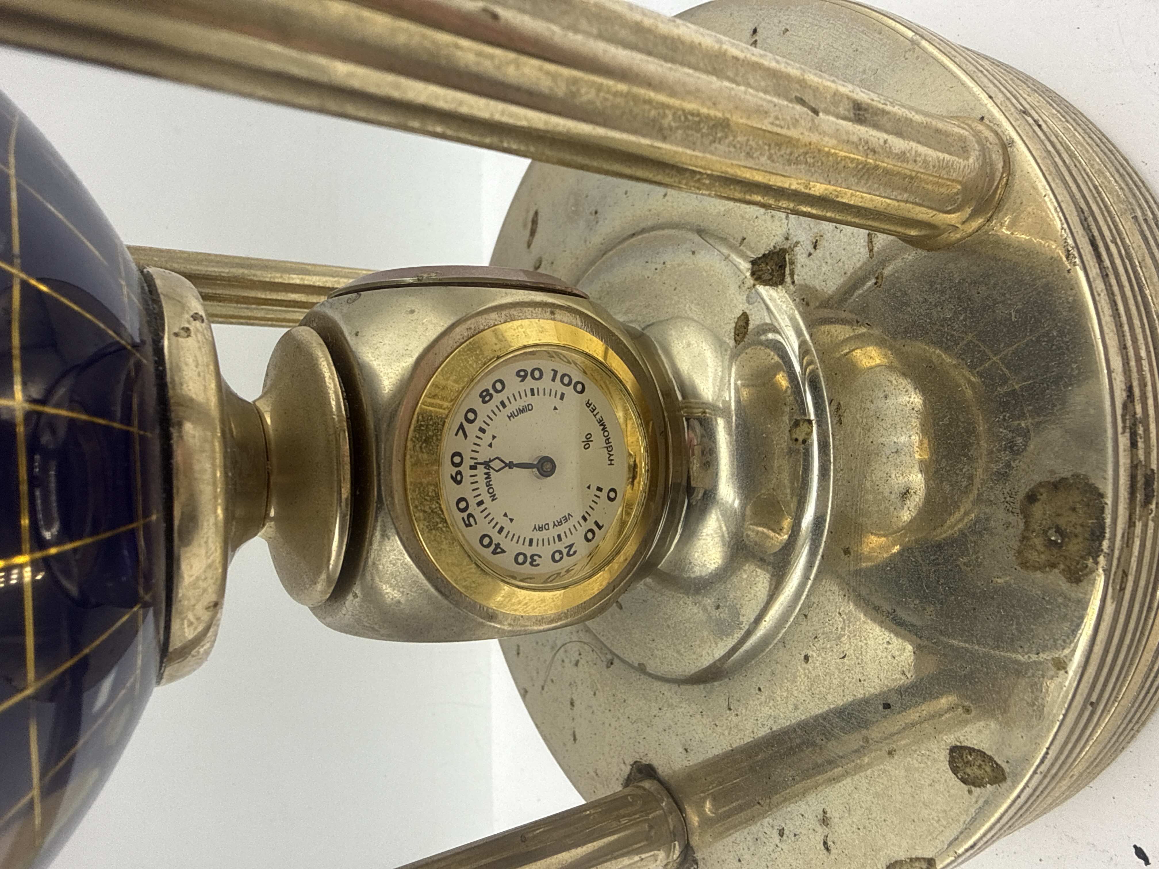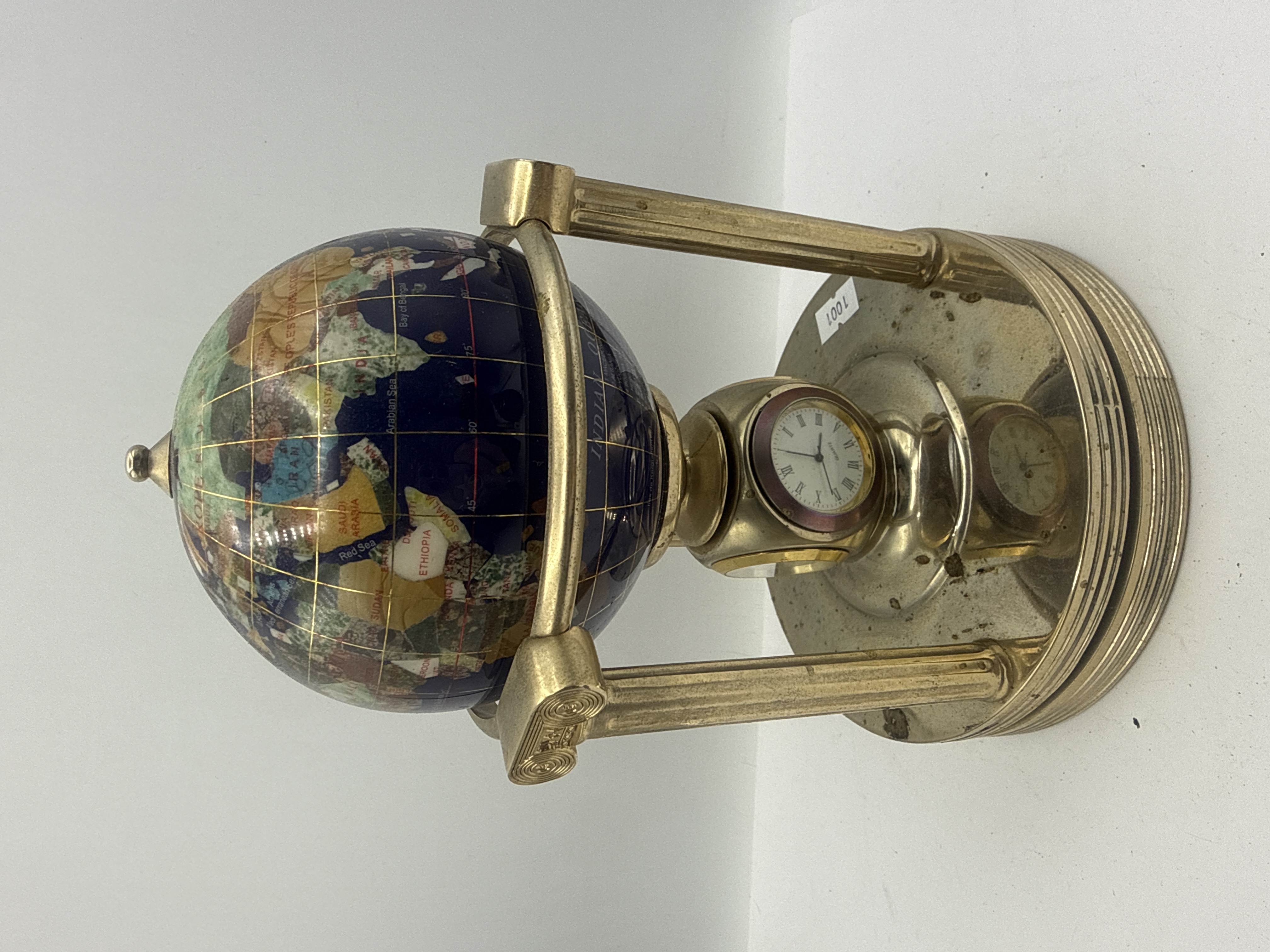 Alexander Kalifano gemstone inlay desk globe featuring a blue-toned ocean and continents composed of various semi-precious stones. The globe is set within a 24k gold plated gimbal and supported by a four-column frame. The central axis incorporates a three-instrument cluster including a quartz clock with a white dial and Roman numerals, a dual-scale thermometer in Celsius and Fahrenheit, and a hygrometer. The assembly is mounted on a circular, stepped metal base with a reflective finish. A small numerical label 1001 is affixed to the base.