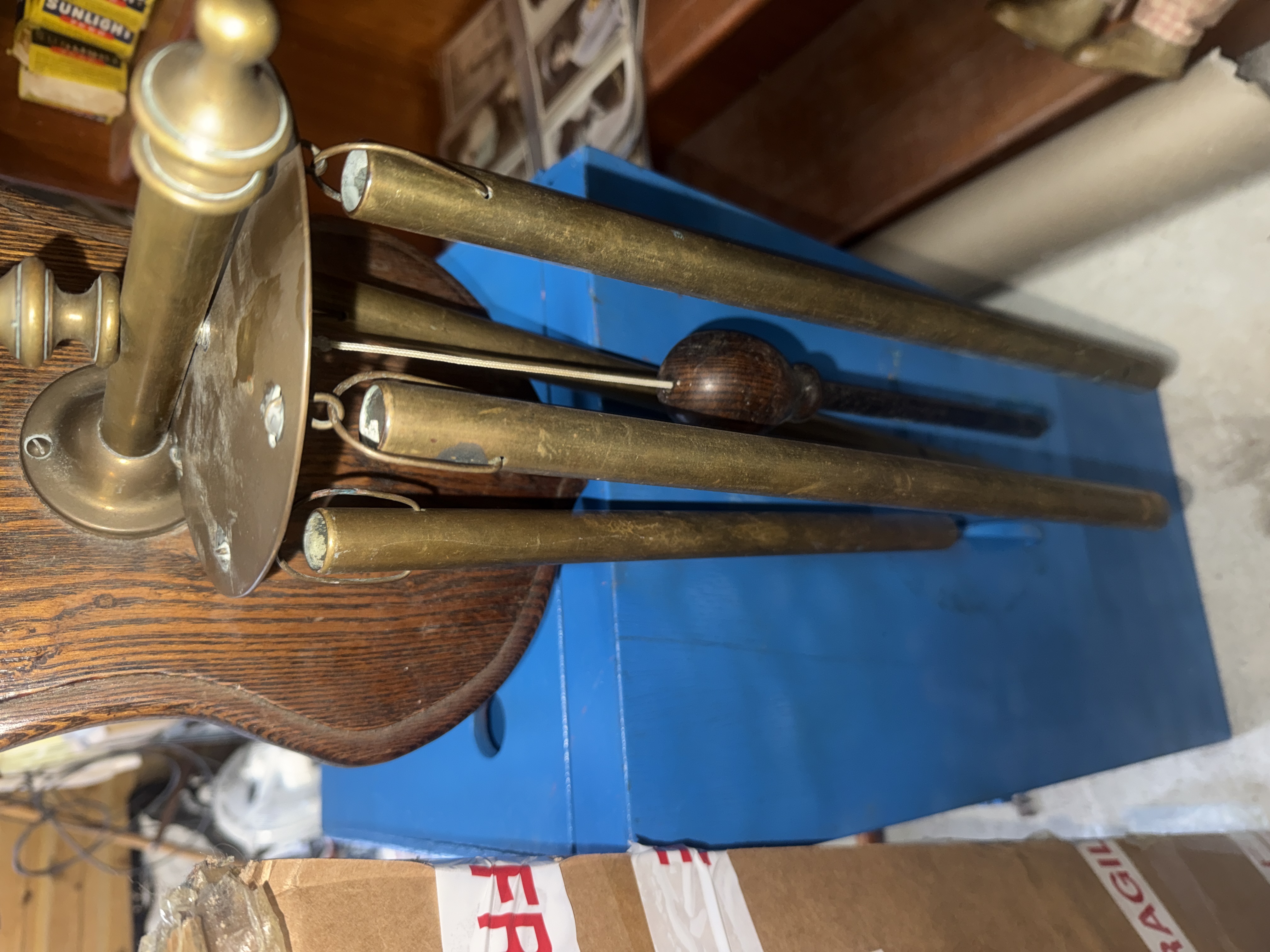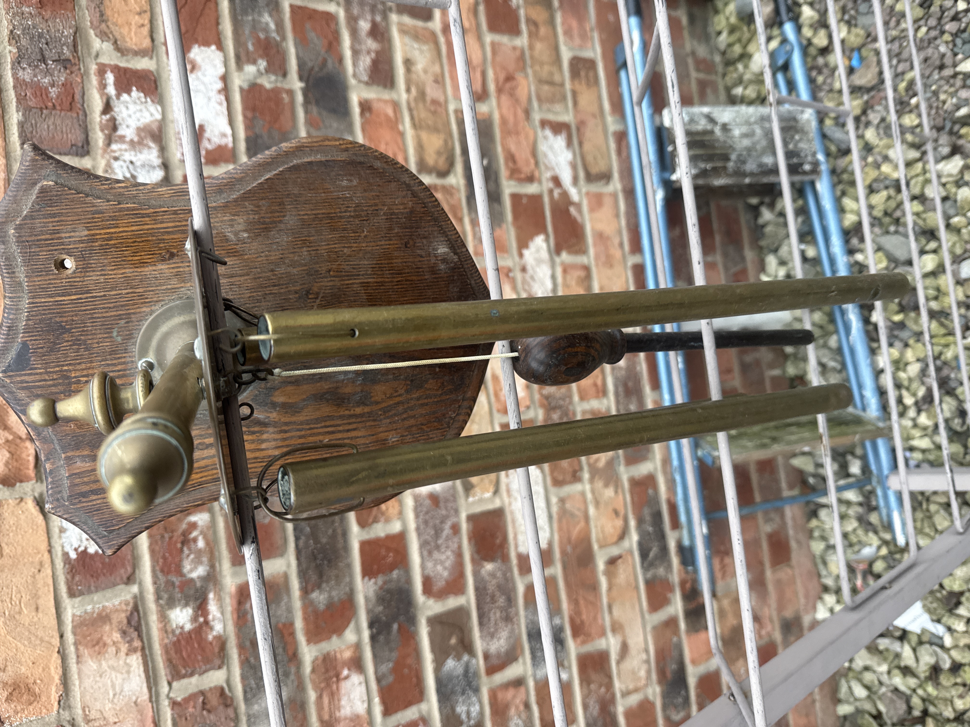 This lot features a set of vintage tubular dinner chimes consisting of multiple hollow brass tubes of graduated lengths. The tubes are suspended from a circular brass support assembly, which is mounted to a shield-shaped wooden wall plaque with a dark-stained finish and visible grain. The mounting post is accented with turned-brass finials. The piece includes an integrated hanging striker with a rounded wooden head and a slender dark handle.