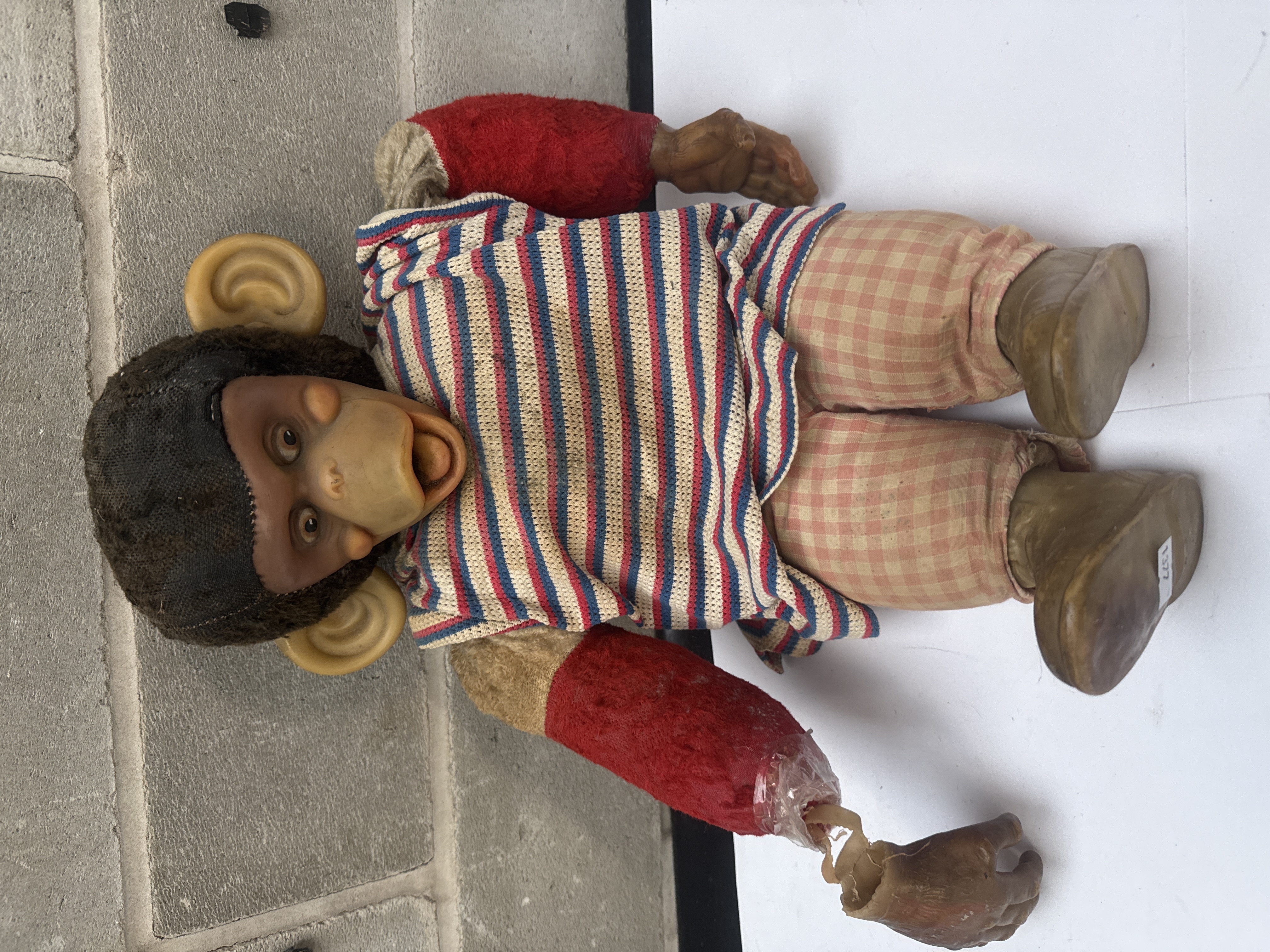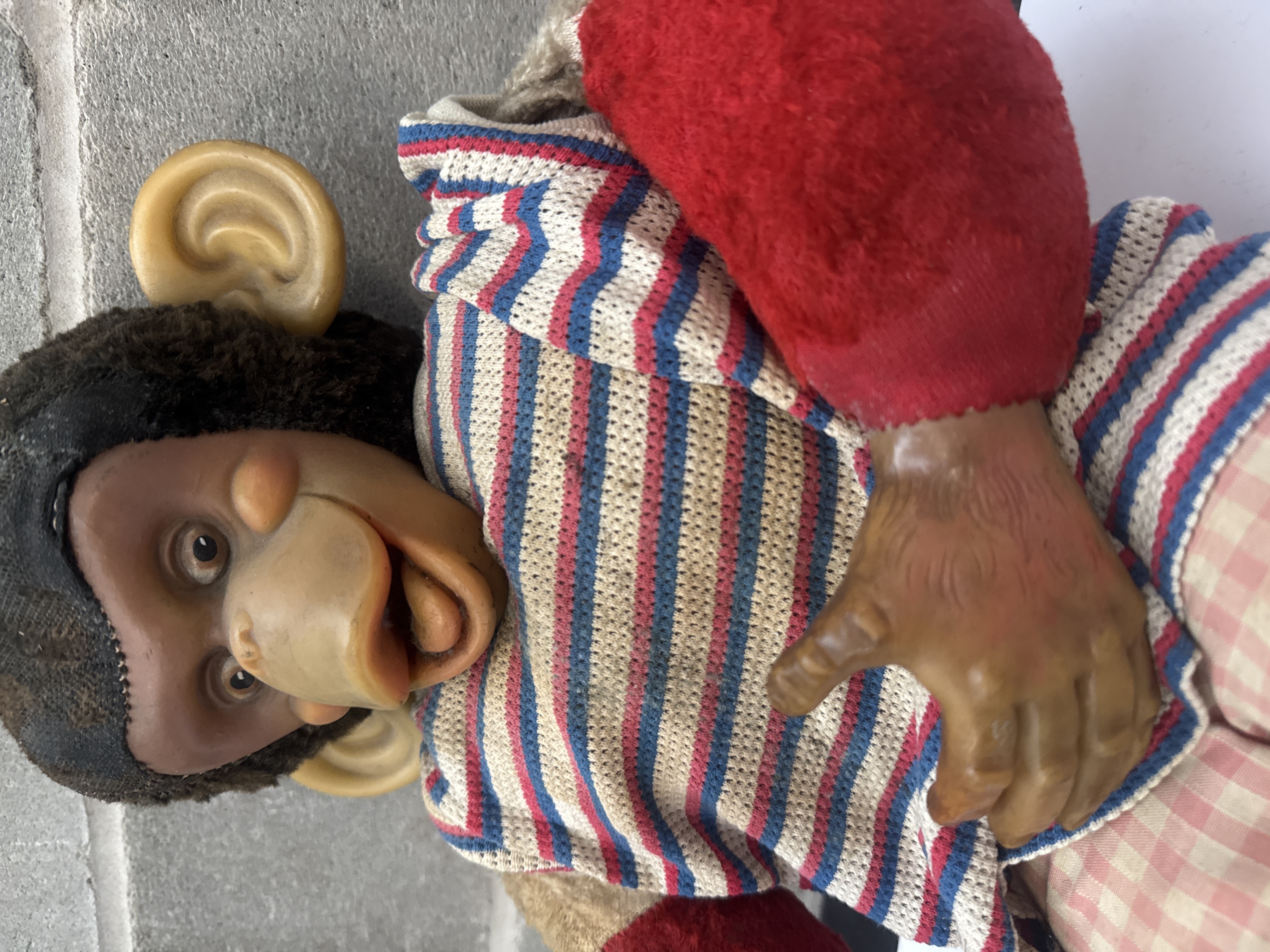 A vintage mid-century chimpanzee doll, identified as the Zippy or Mr. Bim character. The figure features a molded rubber or vinyl face, ears, hands, and feet, with a plush-covered body. It is dressed in a red, white, and blue striped knit shirt and pink and white checkered trousers. The face is designed with molded and painted features, including an open mouth. A white inventory sticker marked 1377 is affixed to the sole of the right foot.