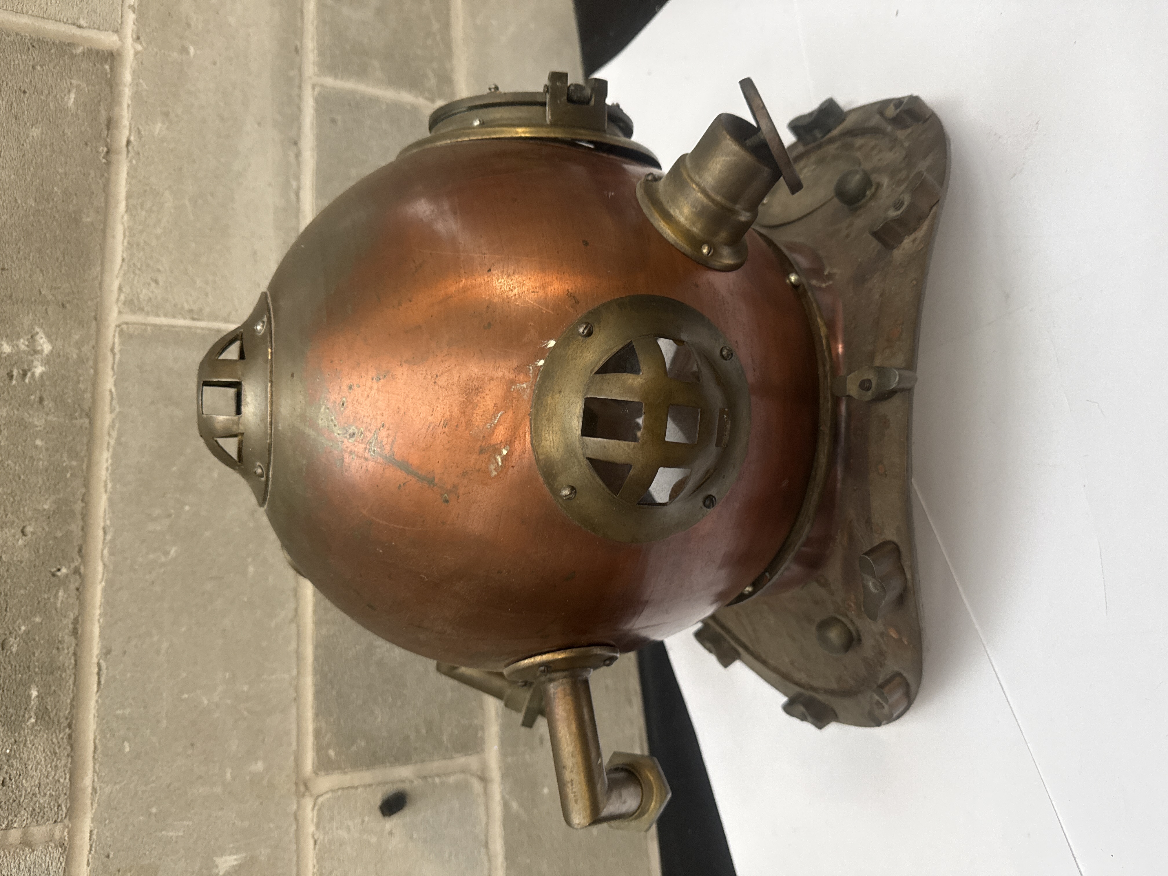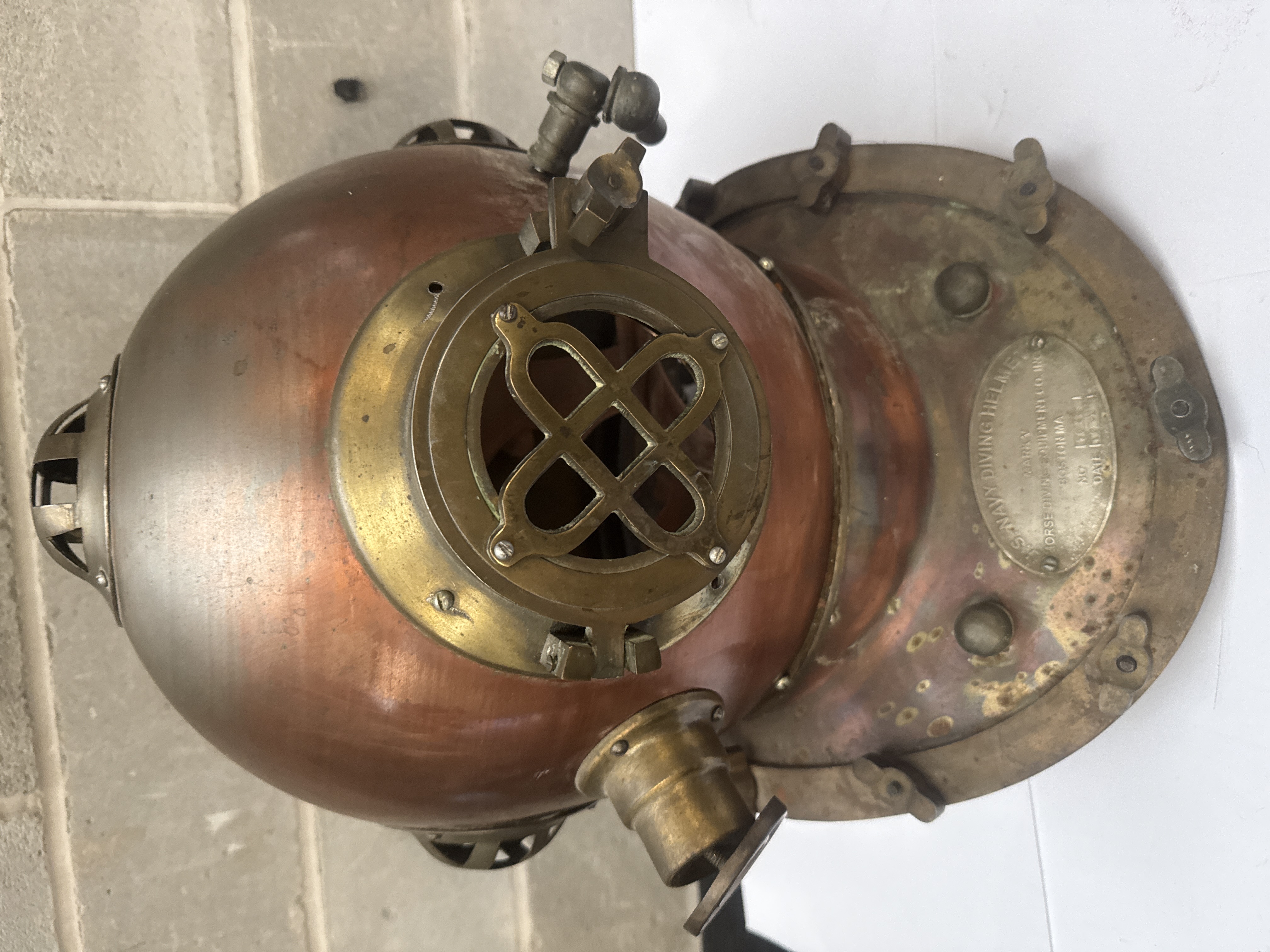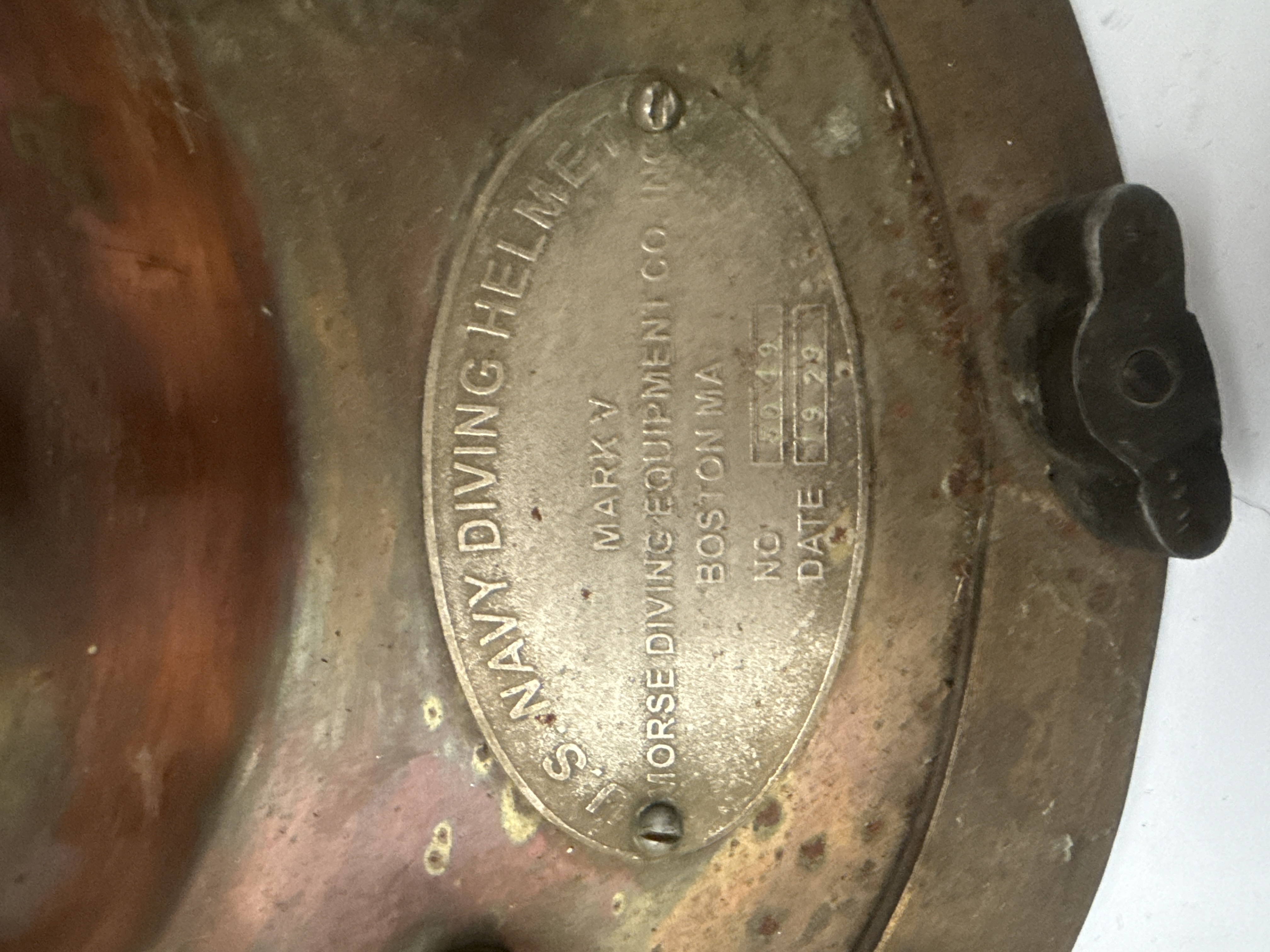 A U.S. Navy Mark V diving helmet manufactured by Morse Diving Equipment Co. Inc. of Boston, Massachusetts. The helmet is constructed from a copper bonnet with brass fittings and a standard twelve-bolt breastplate. It features three circular viewports, including two side ports and one front port, all protected by integrated brass grilles. An oval brass identification plate is secured to the breastplate and is inscribed with the following: U.S. NAVY DIVING HELMET, MARK V, MORSE DIVING EQUIPMENT CO. INC. BOSTON MA. The plate further displays the stamped serial number 5019 and the date 9 19 29. The helmet is equipped with a side-mounted exhaust valve, an air inlet, and a communication connection.