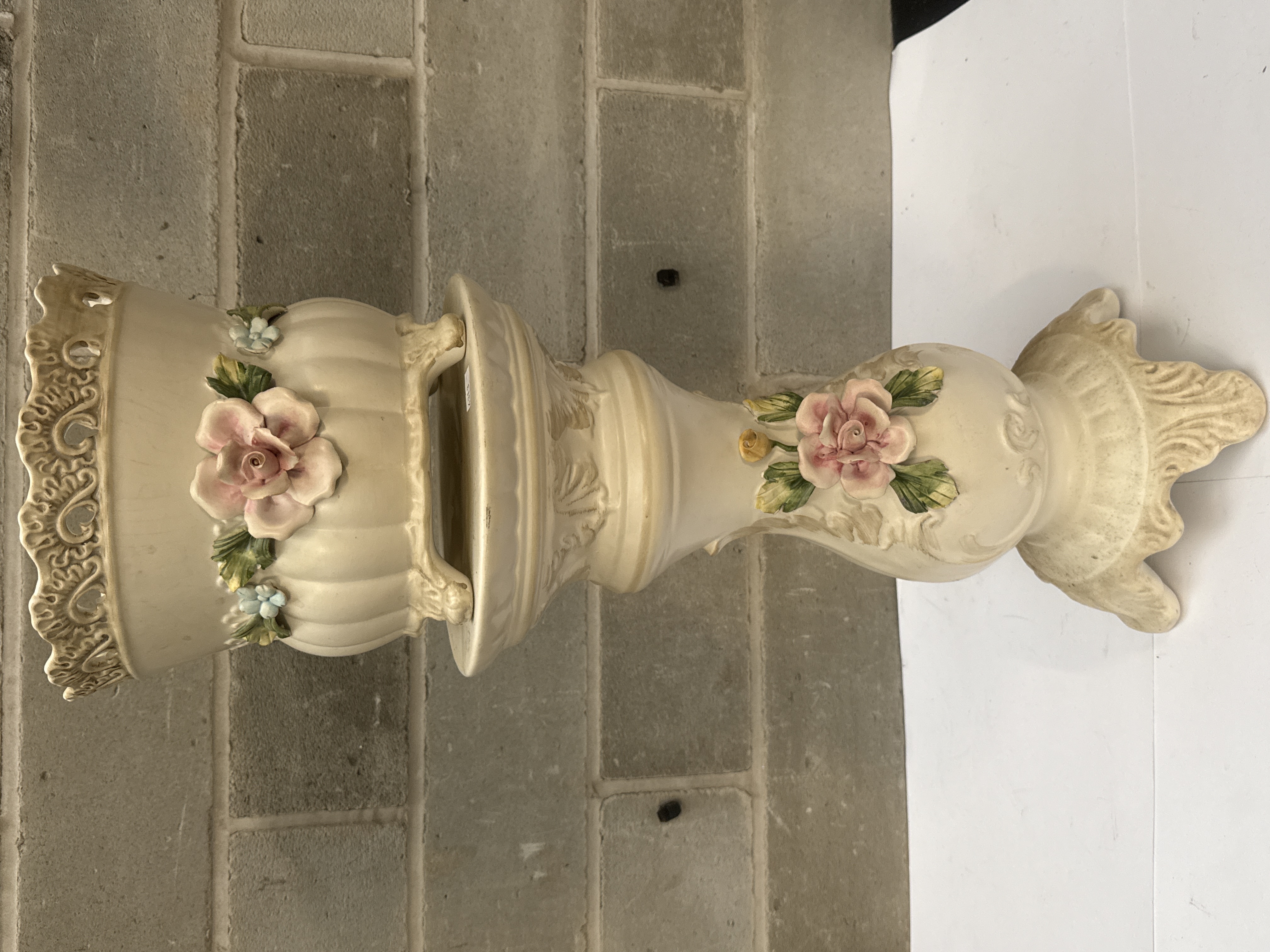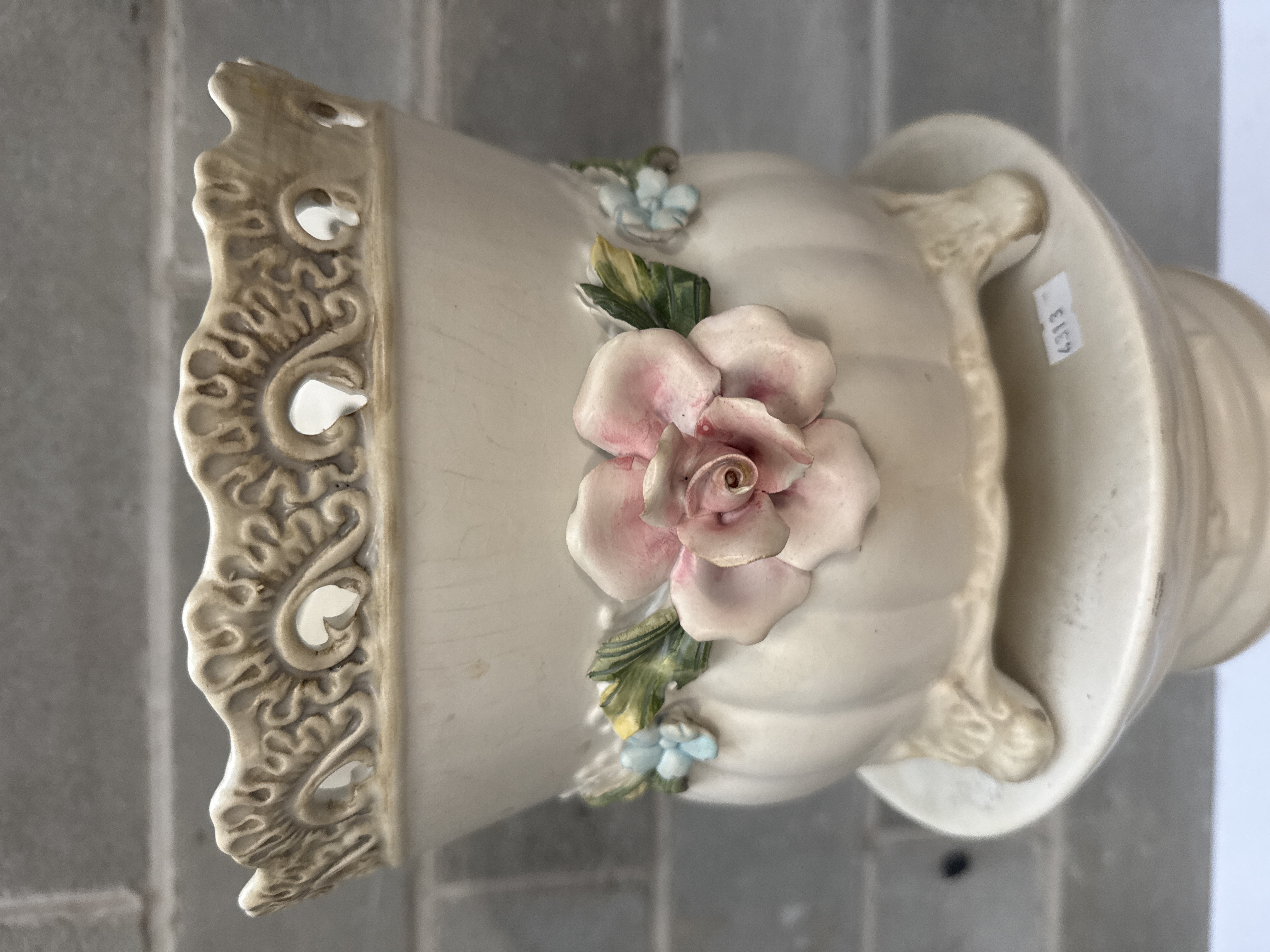 This two-piece set consists of a ceramic cachepot and a coordinating 26-inch tall pedestal, following the Capodimonte style. The cream-colored ceramic is decorated with hand-painted, applied floral motifs in high relief, including large pink roses, green leaves, and small blue blossoms. The planter features a reticulated scrollwork rim and sits atop a tall, baluster-form pedestal with a flared, scalloped base. A small inventory sticker numbered 4313 is visible on the upper surface of the pedestal.