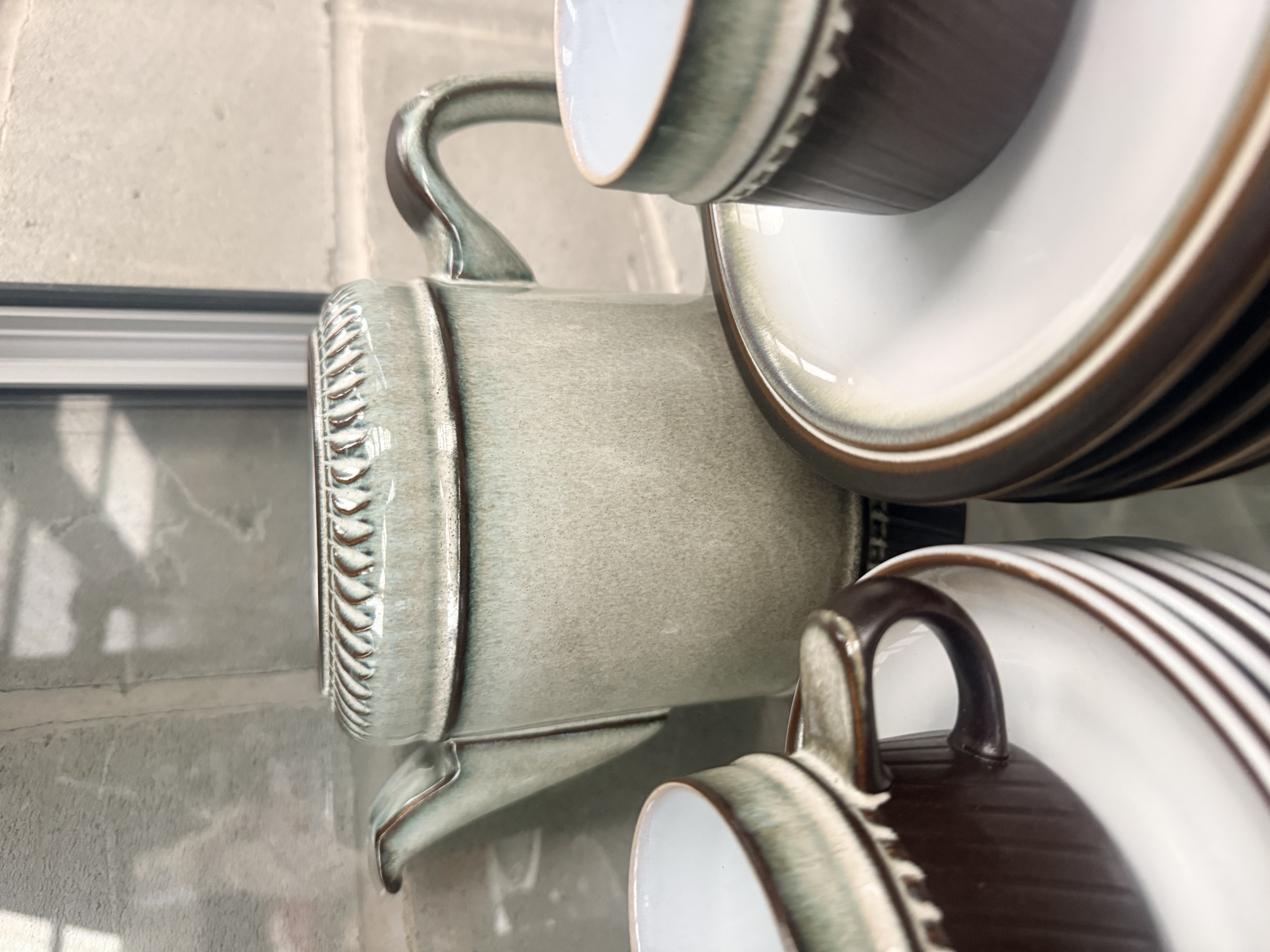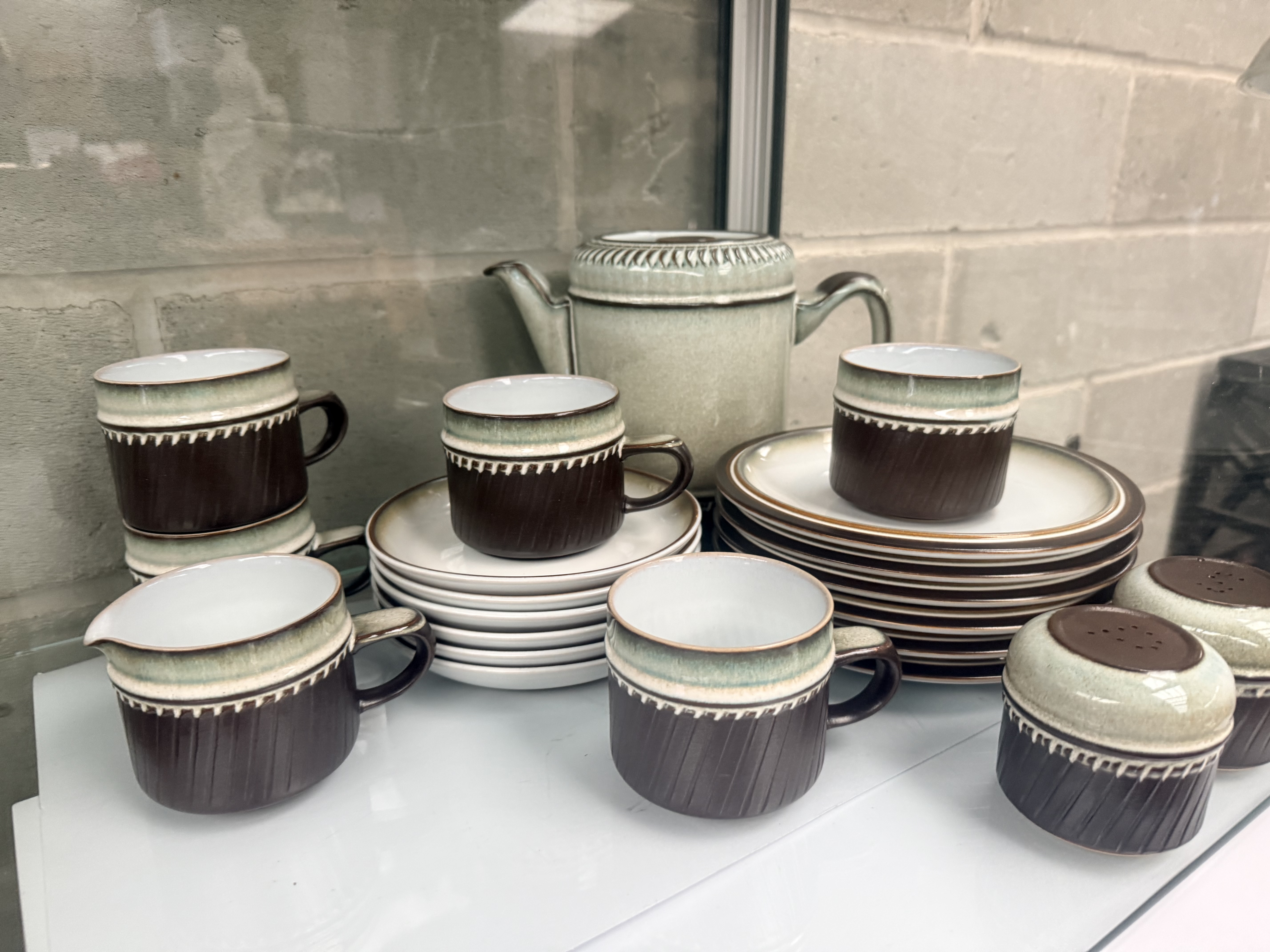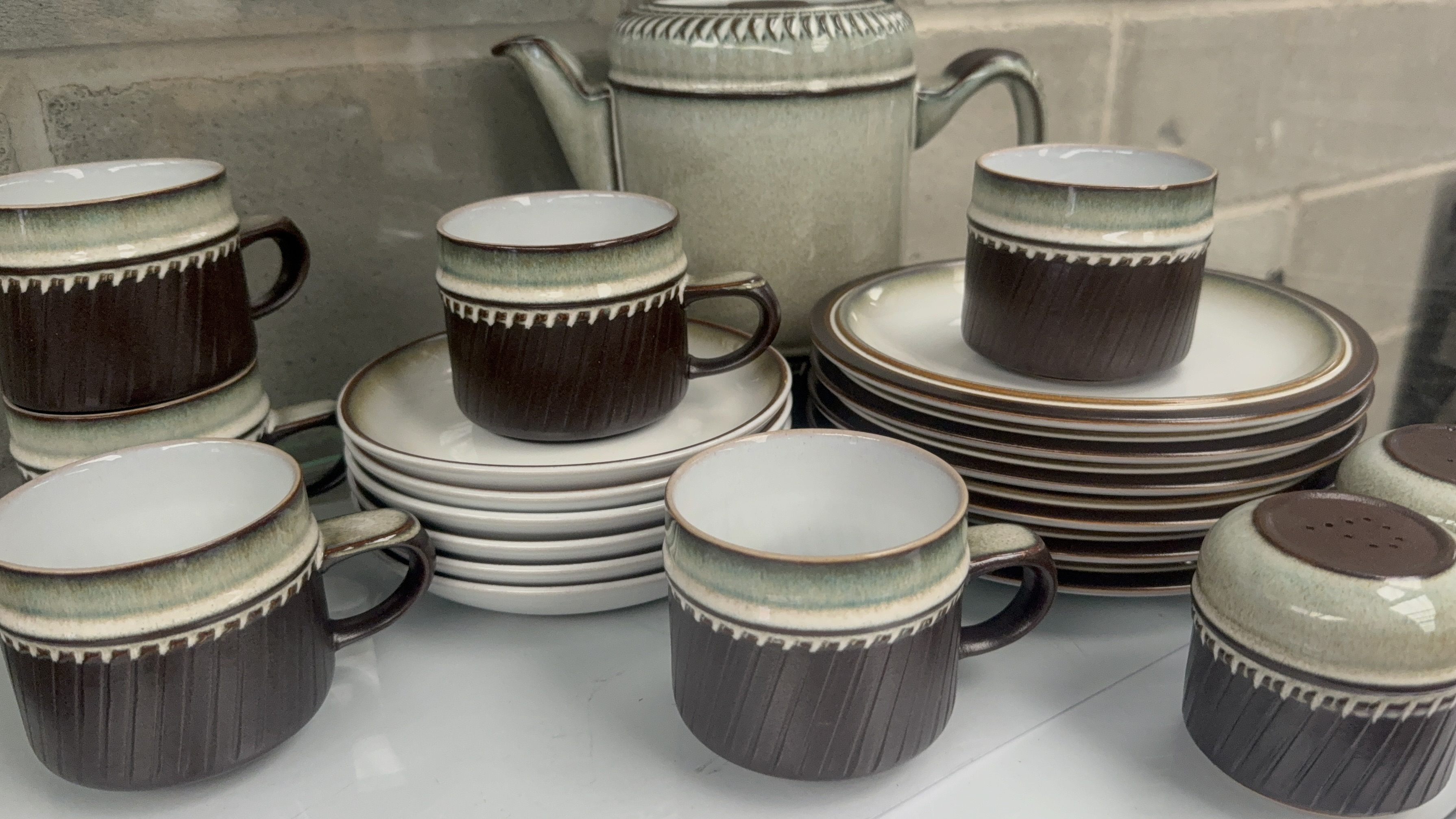 A 21-piece collection of Denby Rondo pattern stoneware ceramic tableware produced in England. The set features a distinctive two-tone glaze design characterized by a dark brown ribbed body on the lower portions, contrasted by a pale sage green speckled glaze on the upper rims and lids. A stylized cream-colored decorative border separates the two primary glaze colors. The collection includes a teapot, cups, saucers, plates, and a pair of shakers. Each piece is constructed from heavy stoneware. The bases feature a circular backstamp marked Denby ENGLAND.