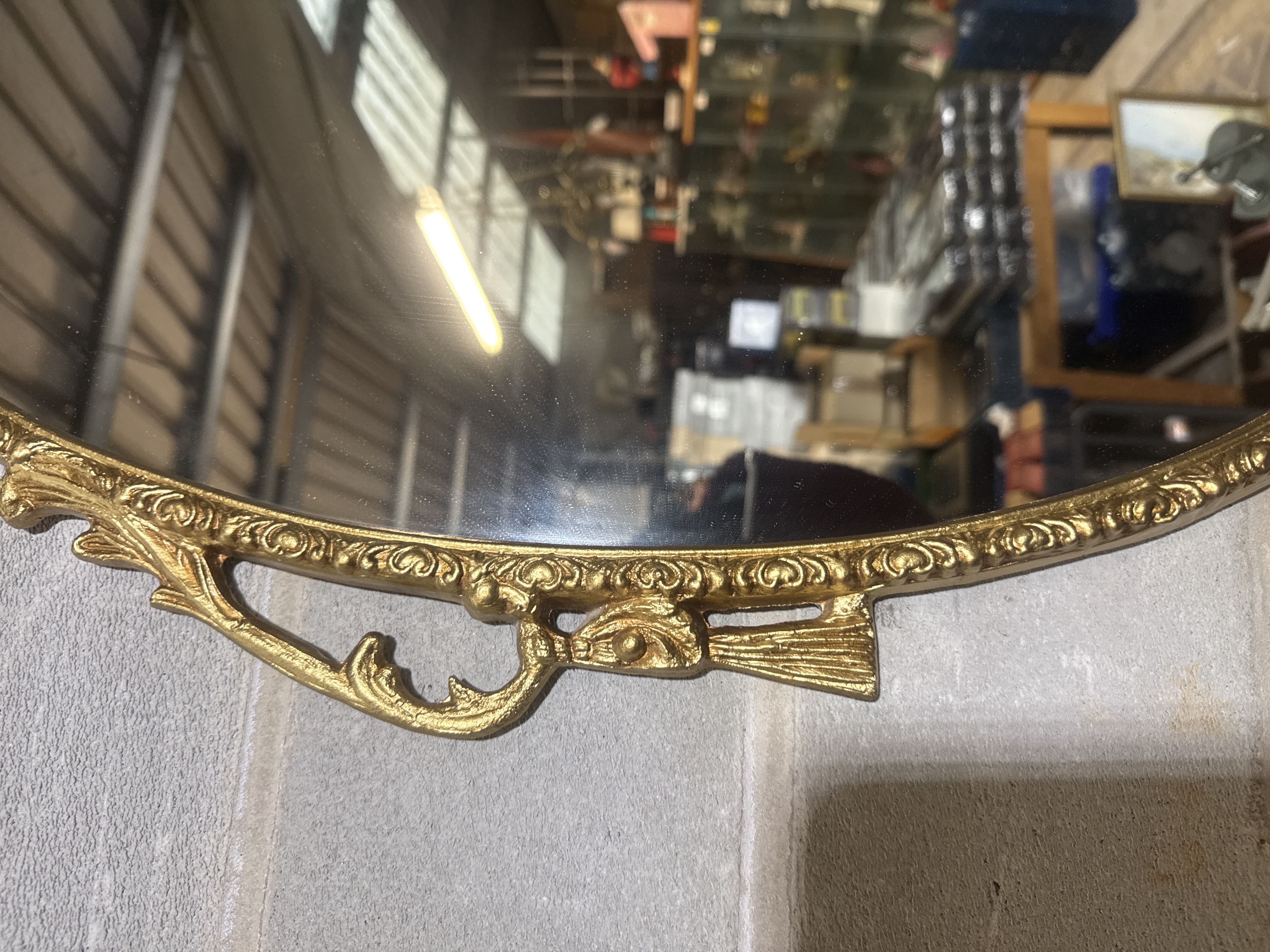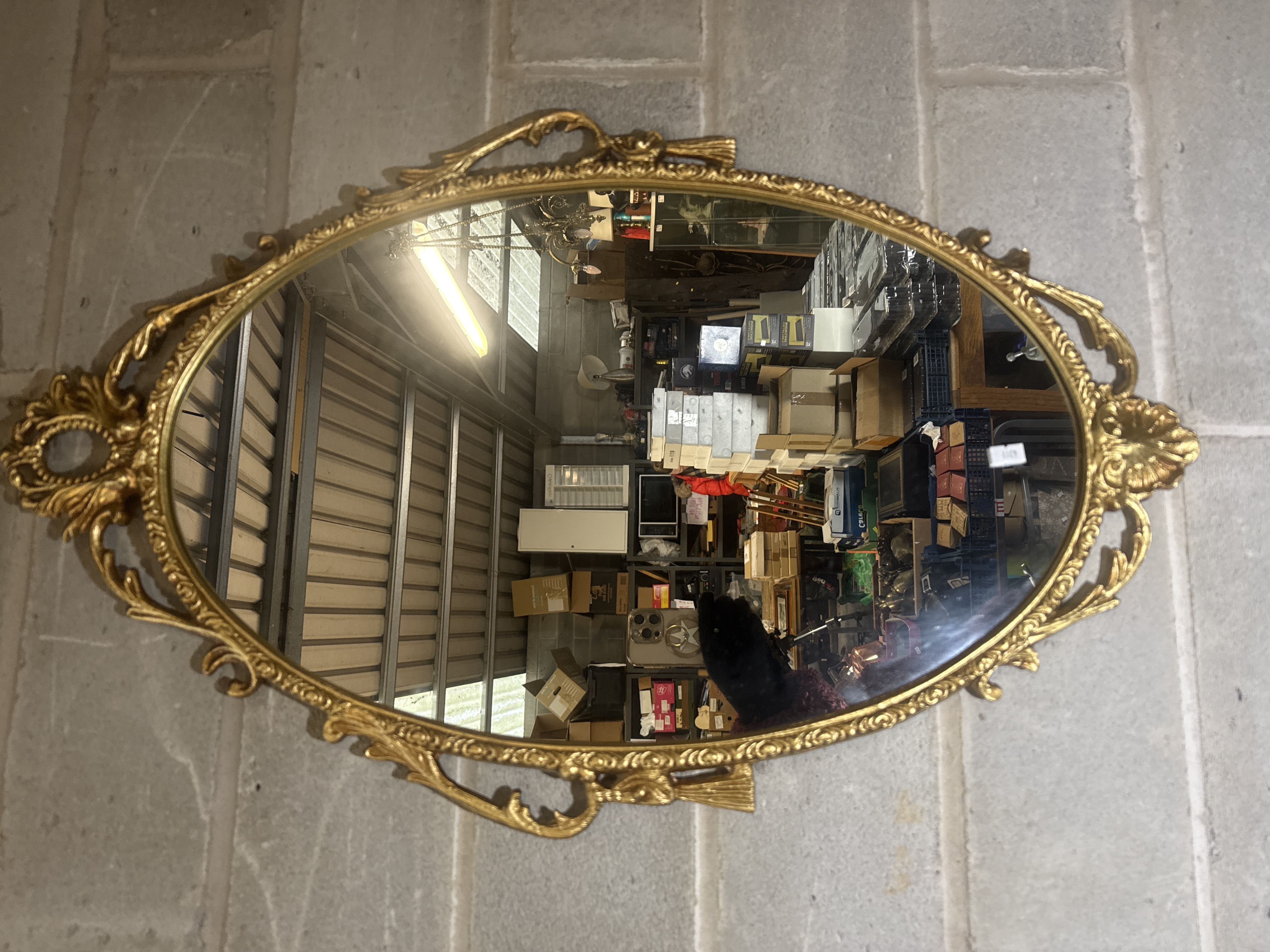 An oval wall mirror featuring an ornate, openwork frame in a Rococo-revival style. The frame is finished in a bright gold tone and decorated with intricate scrollwork, foliate motifs, and stylized bow elements at the top and bottom. The construction features a decorative openwork border surrounding the central mirror glass. No maker marks or signatures are visible on the piece.