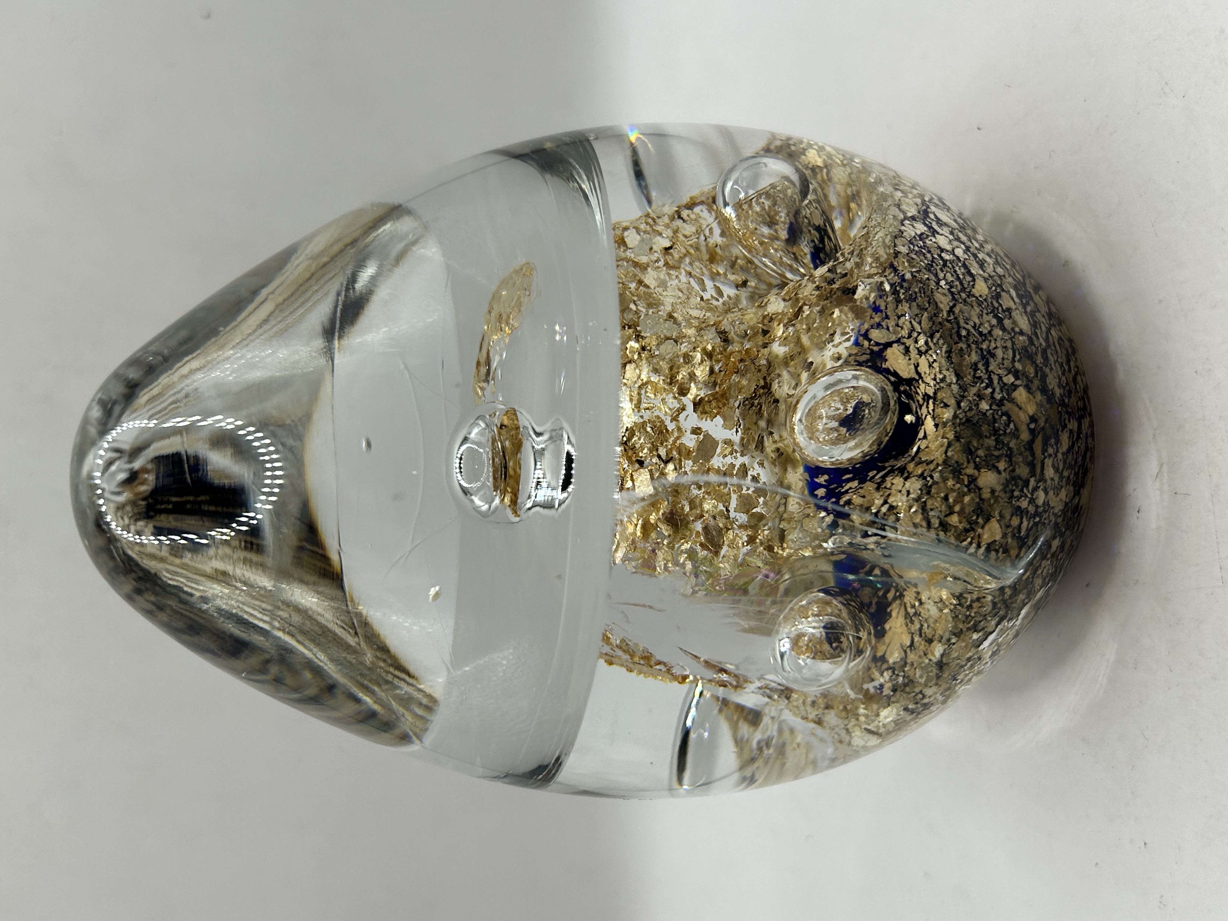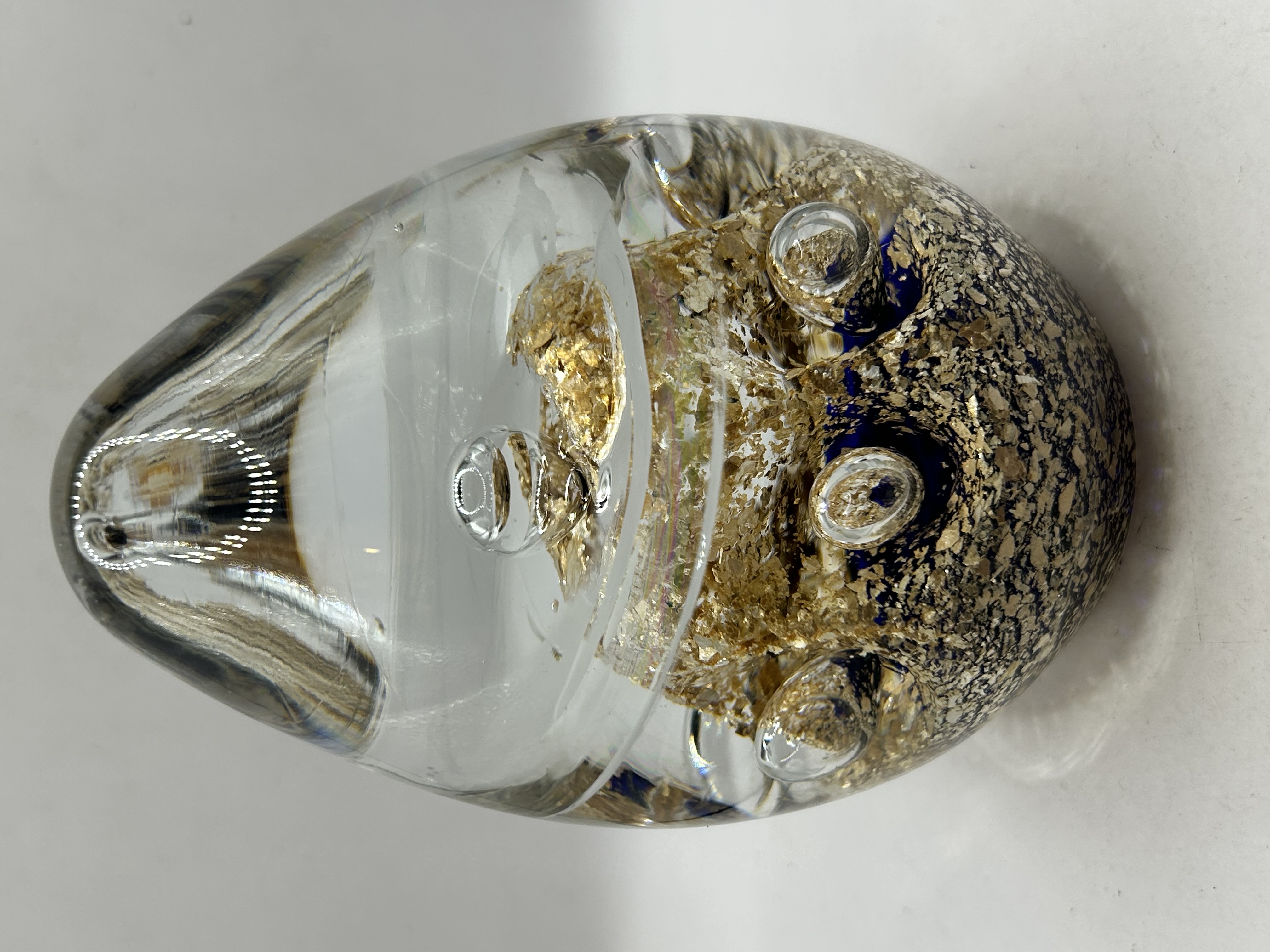 A Selkirk Glass art glass paperweight in the Sovereign pattern. This ovoid-shaped object features a clear glass exterior encasing a deep cobalt blue core. The interior is decorated with heavy gold-leaf inclusions and several large, controlled air bubbles. The piece is constructed using traditional glassblowing techniques. No maker marks or signatures are visible on the surface or base.