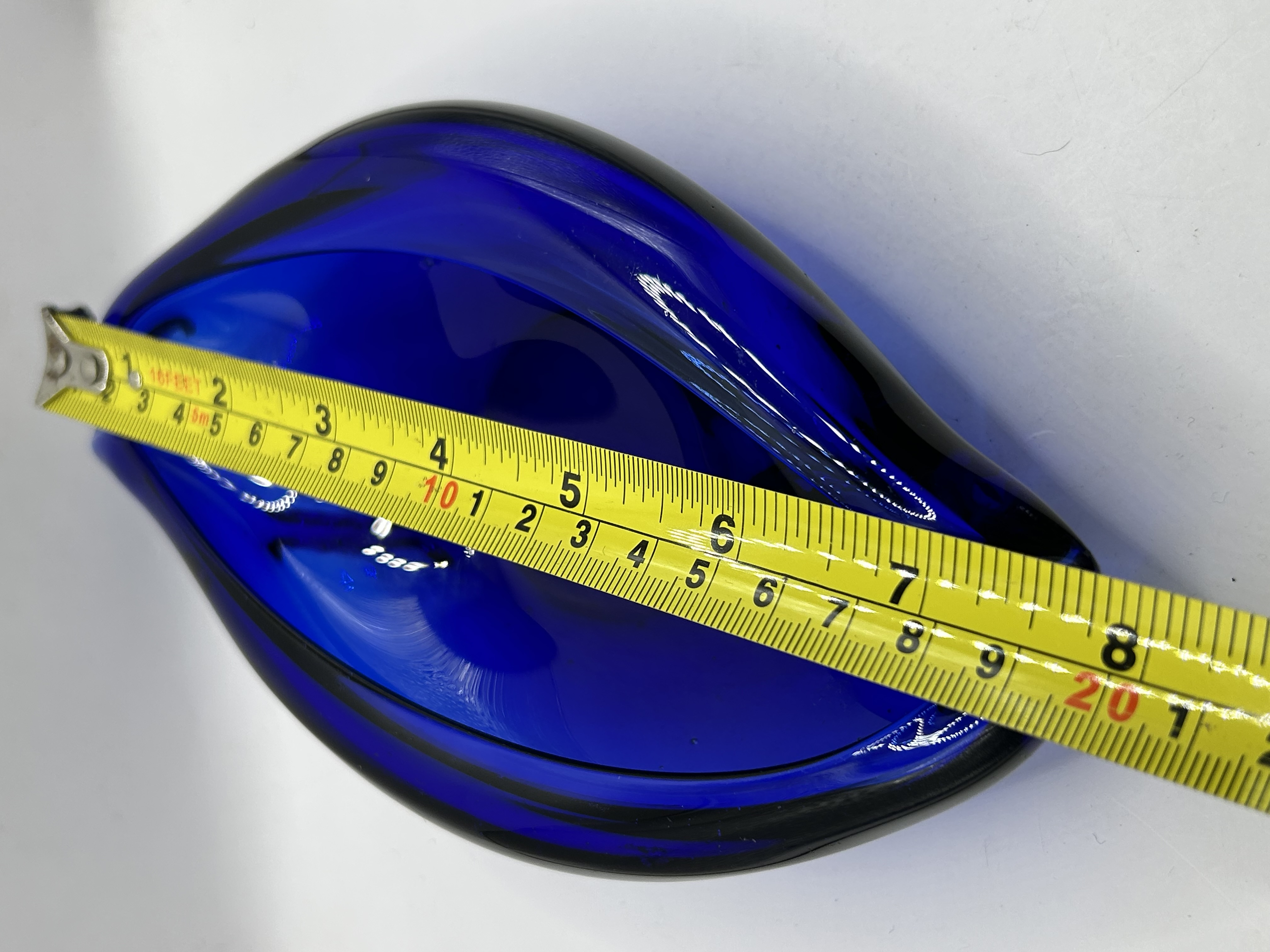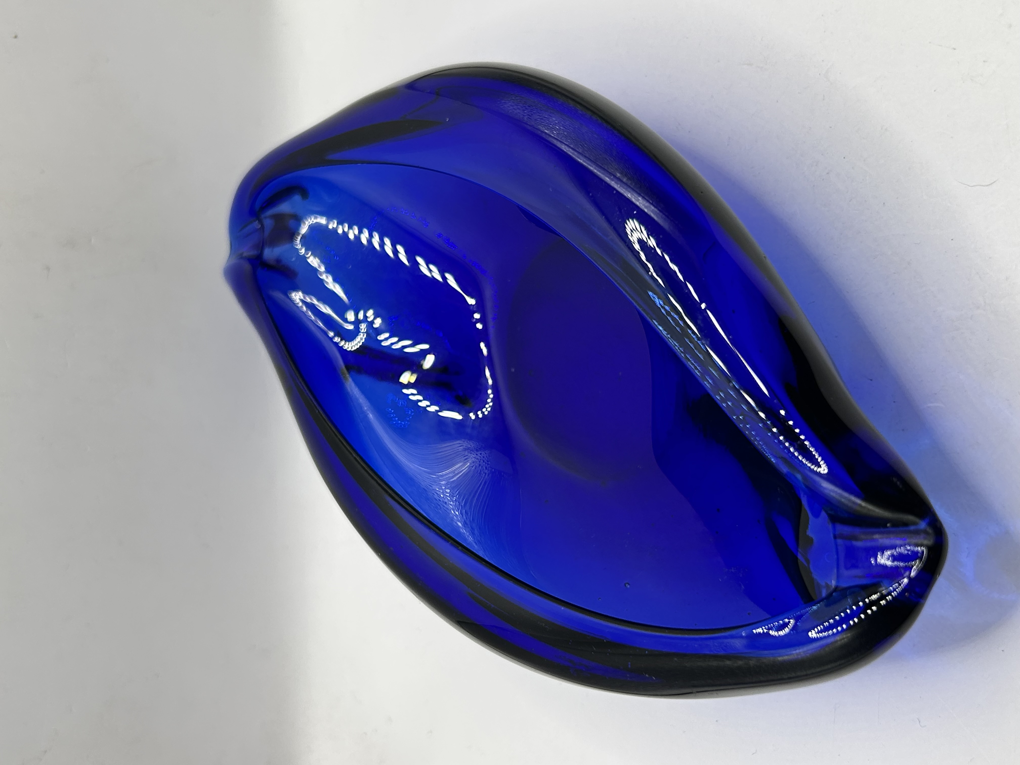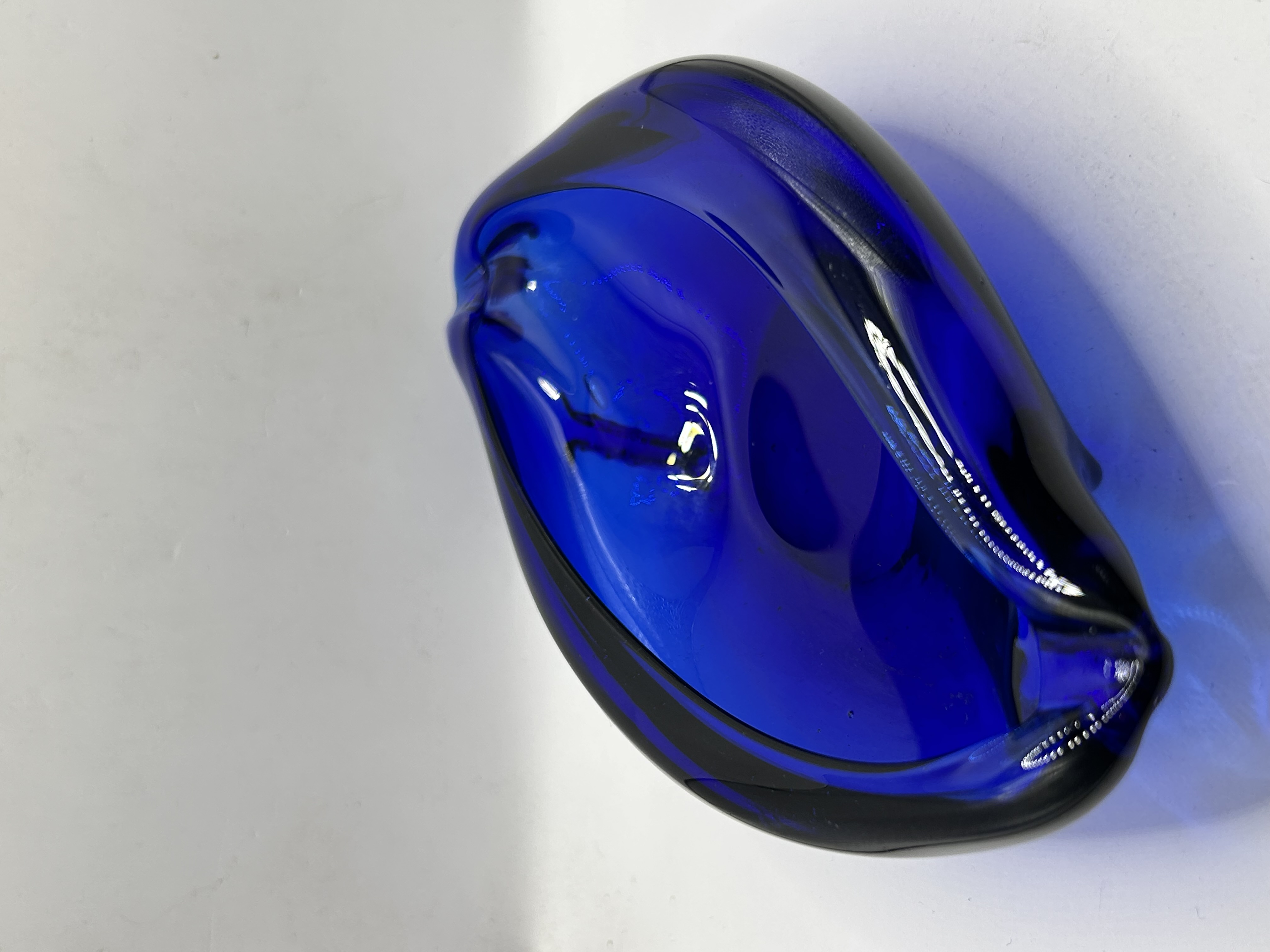 An Archimede Seguso attributed Murano art glass bowl. The piece is constructed from heavy-walled cobalt blue glass in an organic biomorphic form. It features a central well with high, sweeping edges and a freeform rim. The glass exhibits a deep, uniform color throughout the thick-walled structure. The underside is unsigned.