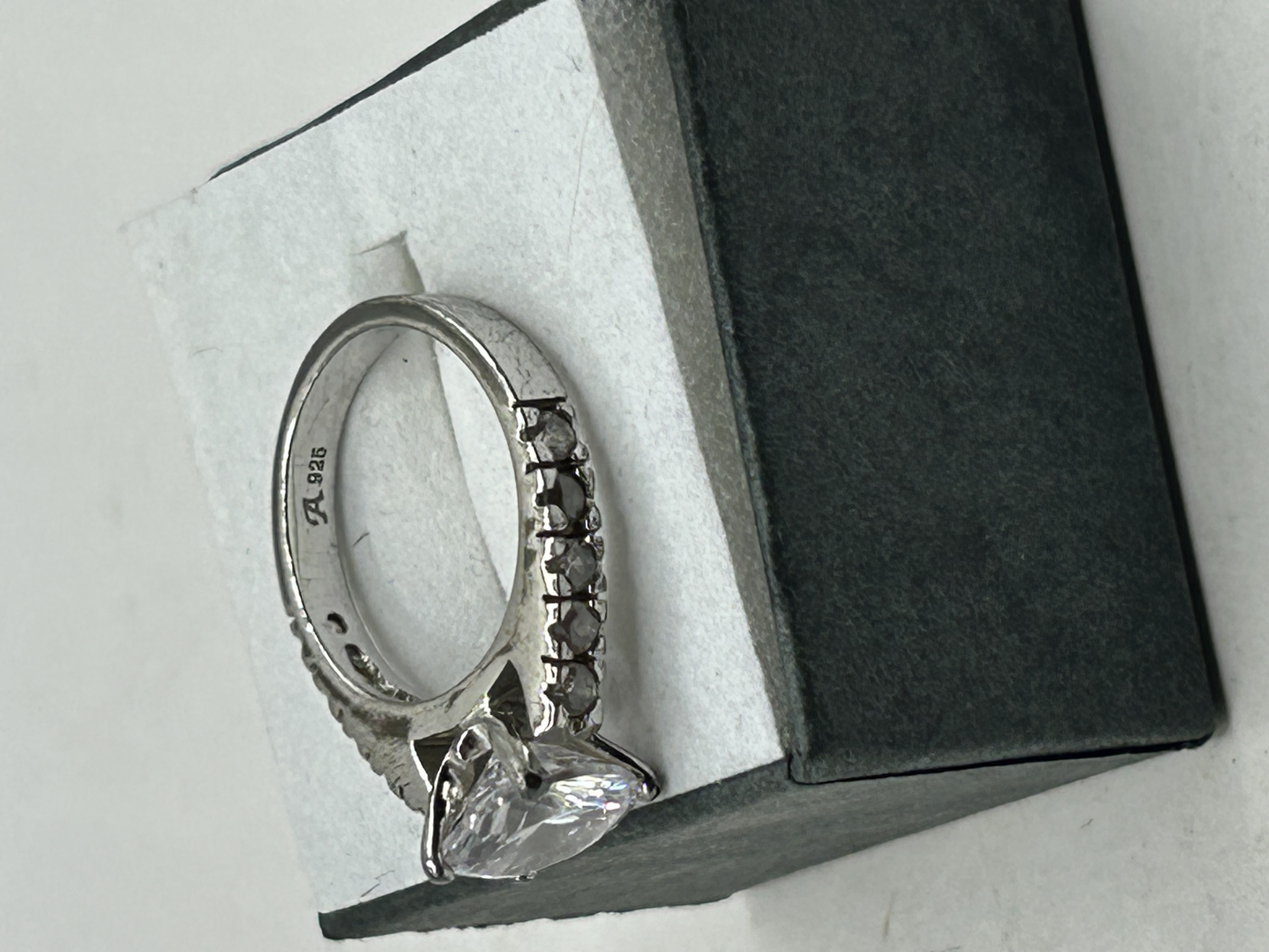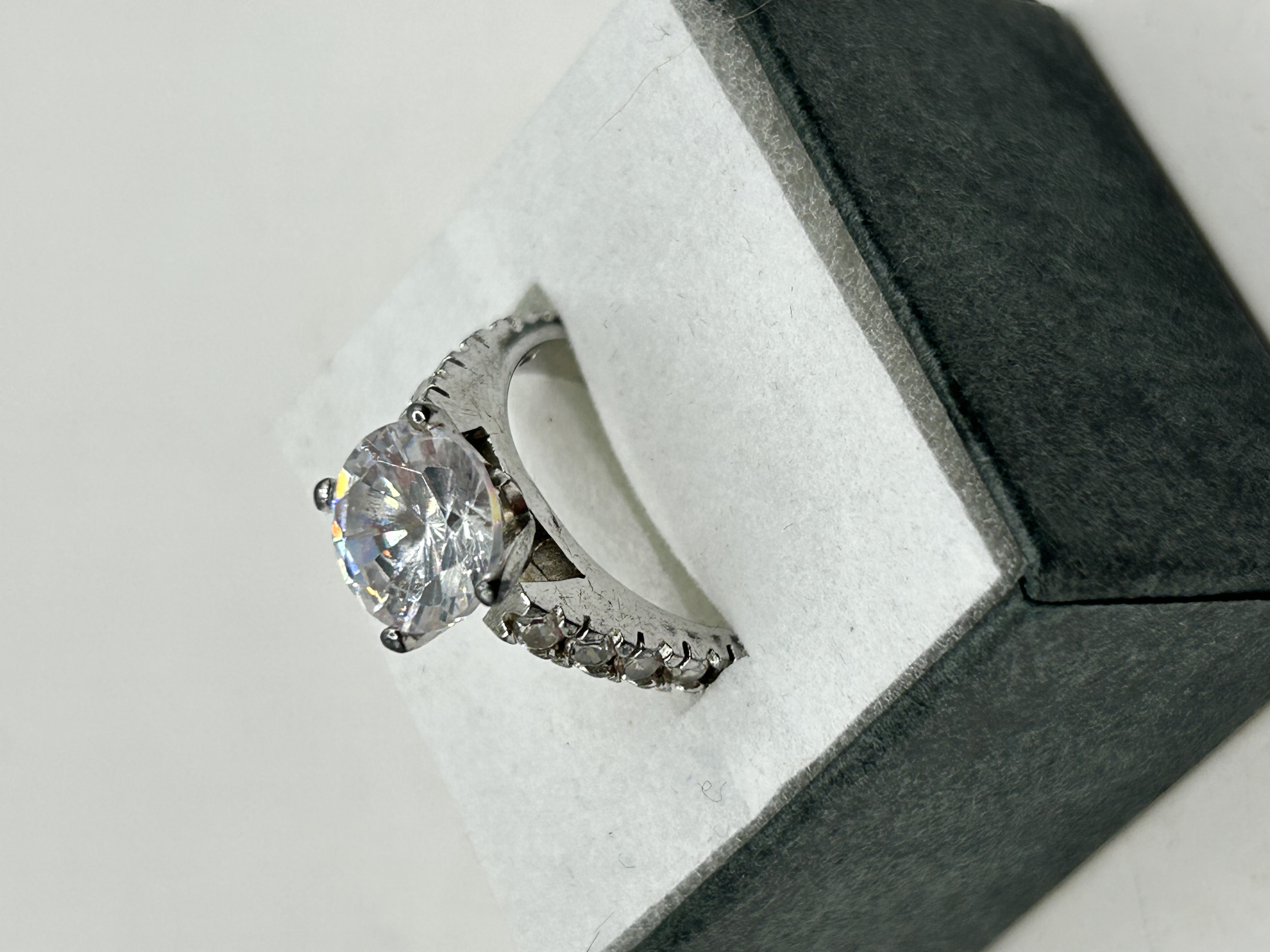 A silver engagement-style ring featuring a large, round brilliant-cut clear cubic zirconia center stone. The stone is held in a four-prong cathedral-style mounting. The shoulders of the shank are accented with several smaller, round-cut clear stones. The interior of the band is stamped with the hallmark A 925. The ring is presented in a dark-colored jewelry box with a white padded insert.