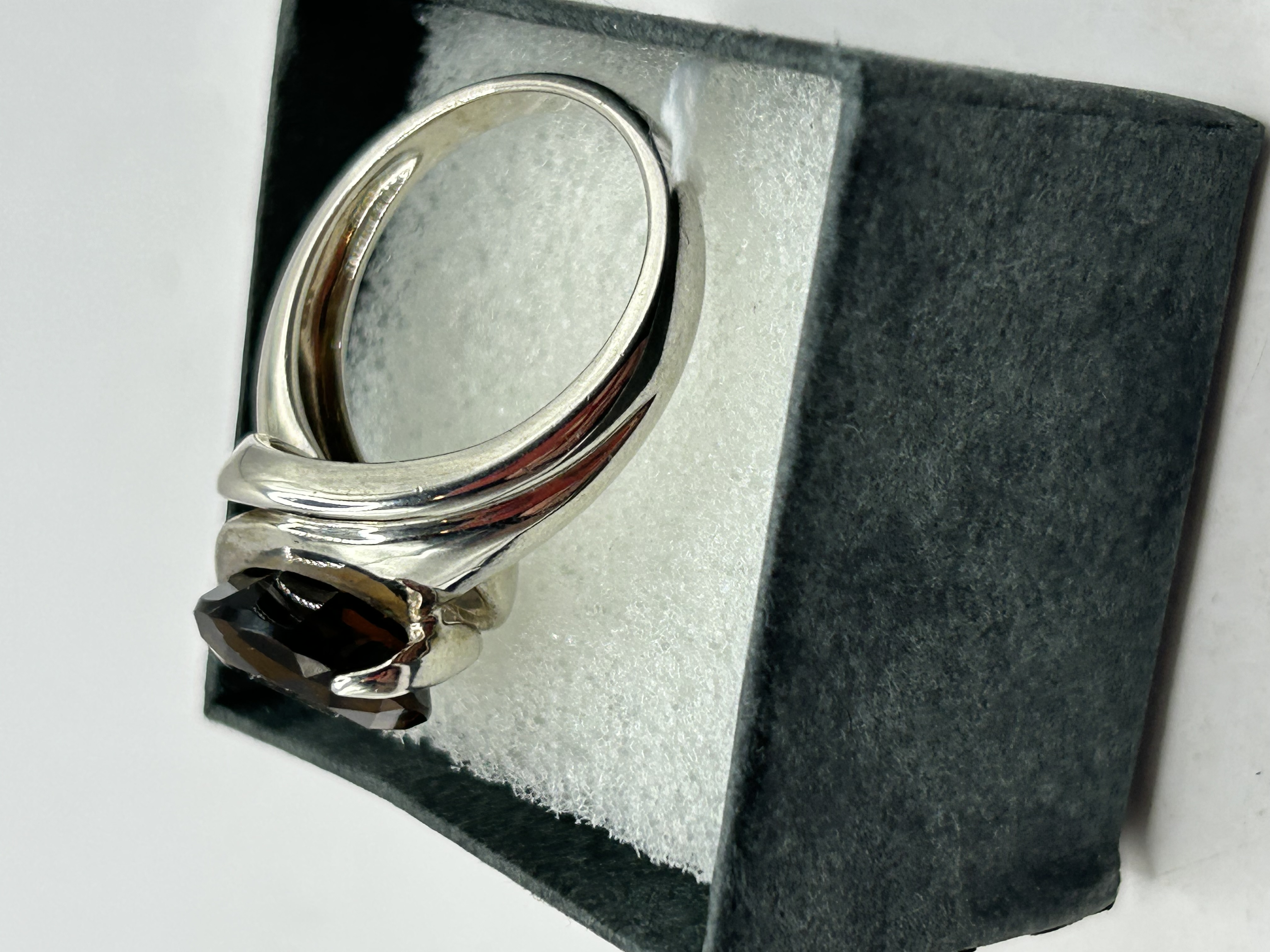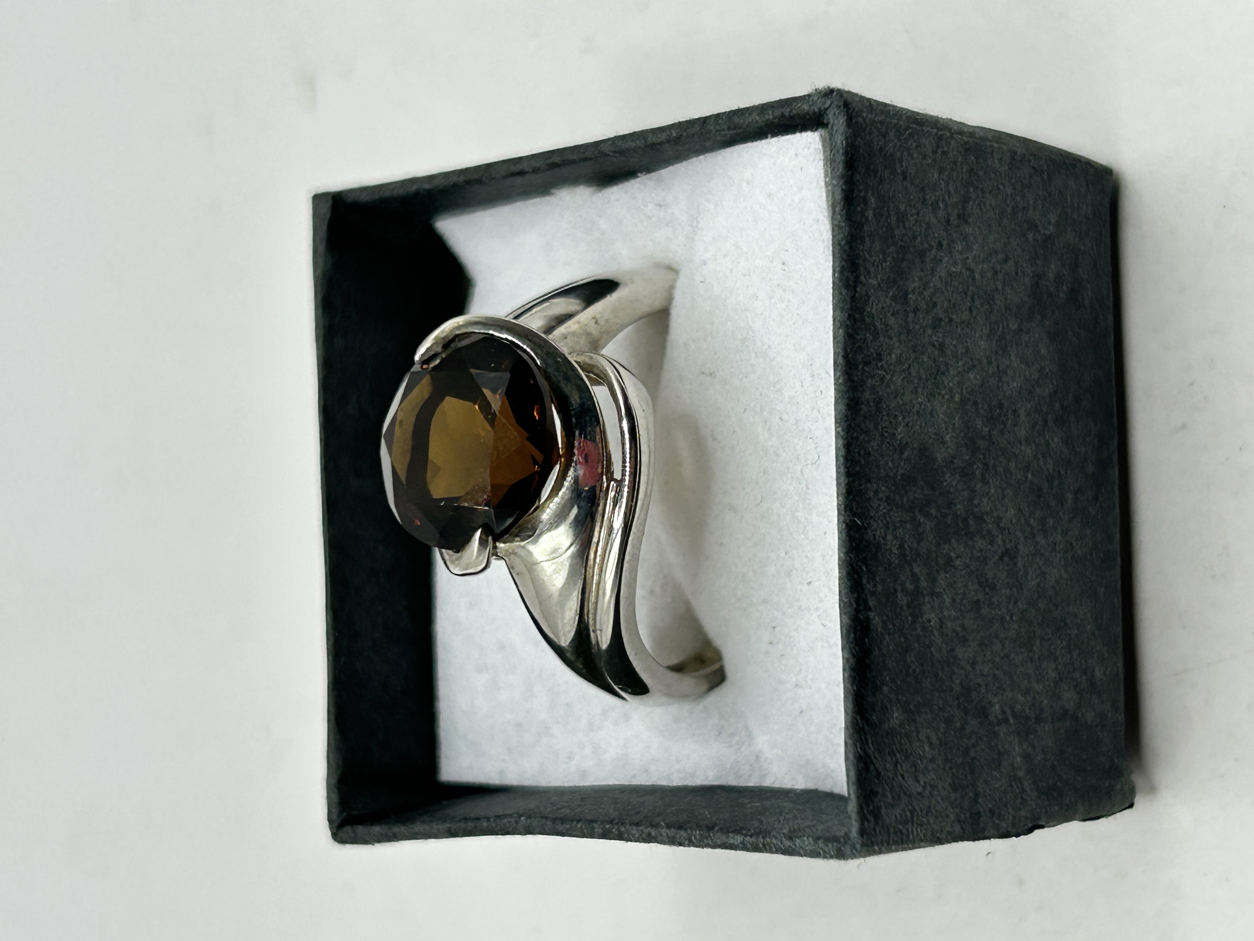 A contemporary silver ring featuring a large round faceted dark brown gemstone identified as smoky quartz. The gemstone is held within a sculptural wrap-around bypass-style band. The band is constructed from polished silver and features faint markings on the inner shank. The item is presented in a black rectangular jewelry box with a white foam insert.