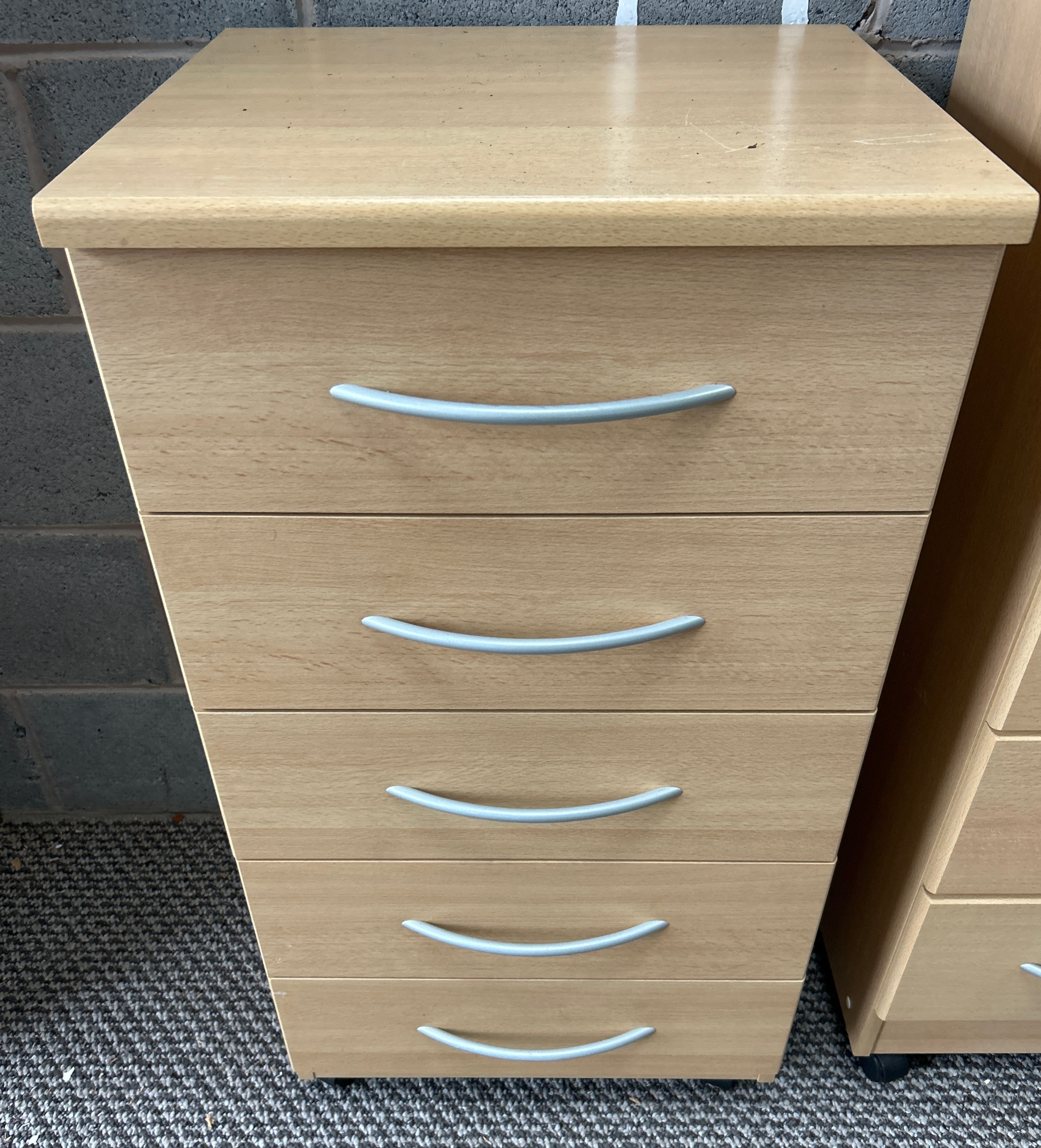 A pair of contemporary five-drawer mobile pedestal units manufactured by R White Cabinets. Each unit is constructed from a light wood-effect laminate with a beech finish. The design features five vertically stacked drawers, each equipped with a curved, silver-toned bow handle. The units are mounted on small black casters at the base to allow for mobility.
