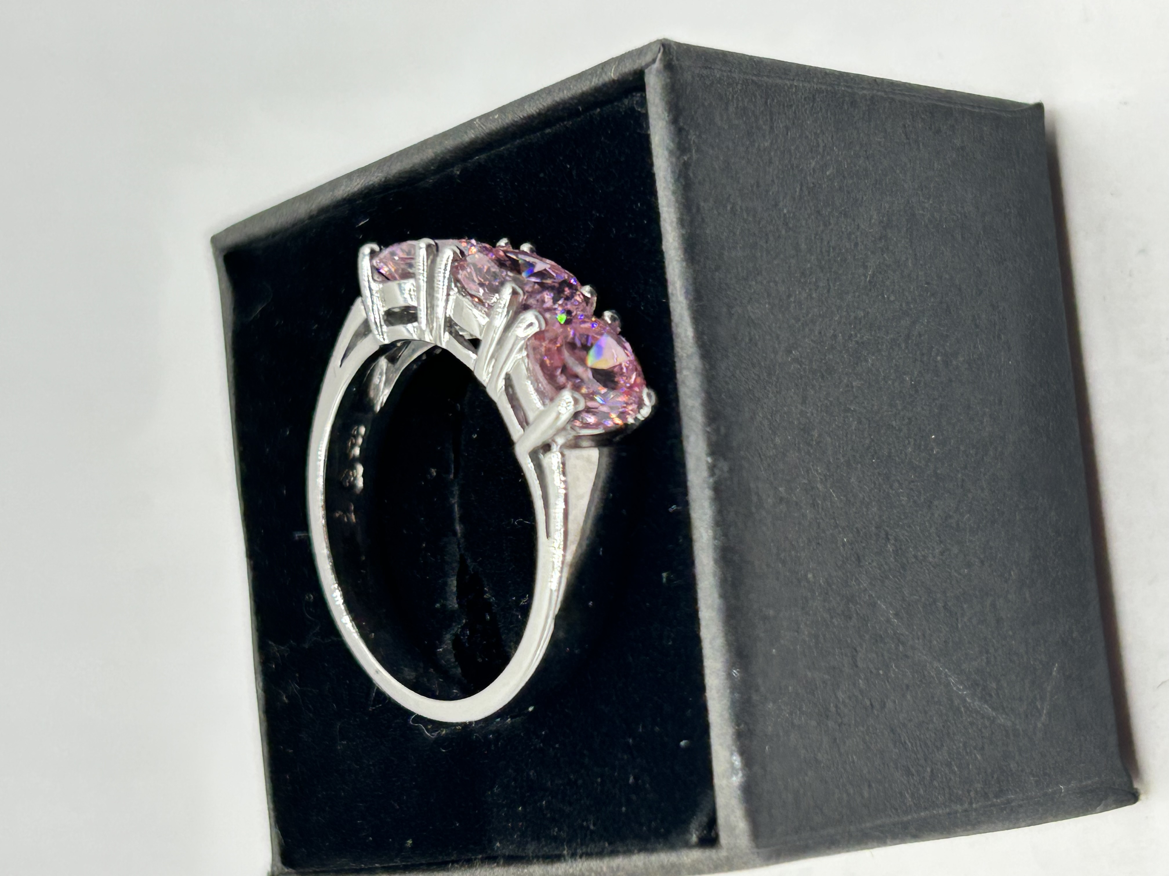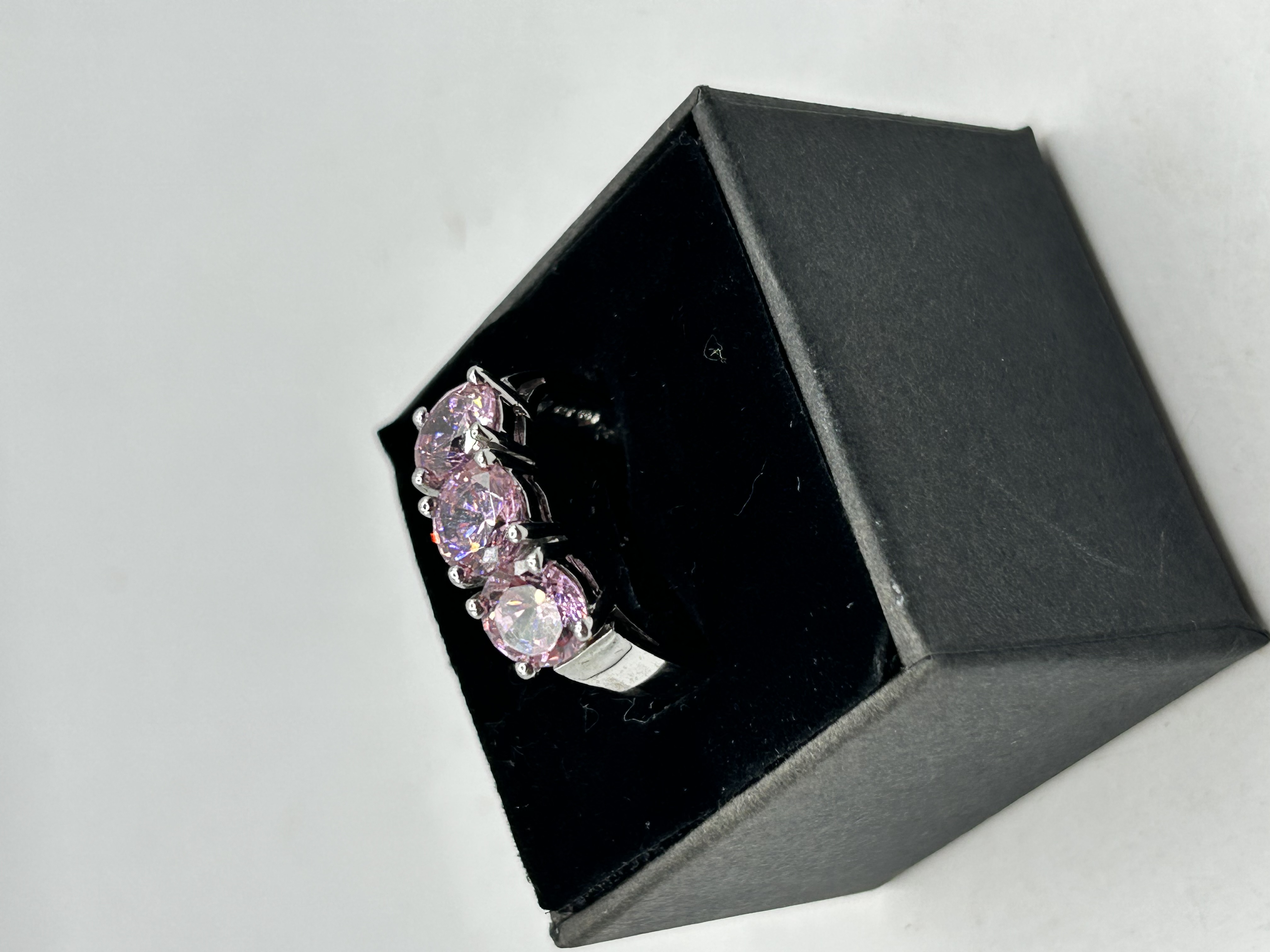 A silver ring featuring three round-cut pink stones. The stones are arranged in a row and secured in a claw setting. The polished silver band is stamped with a 925 hallmark on the interior. The ring is presented in a square black jeweler’s box with a dark velvet-lined interior.
