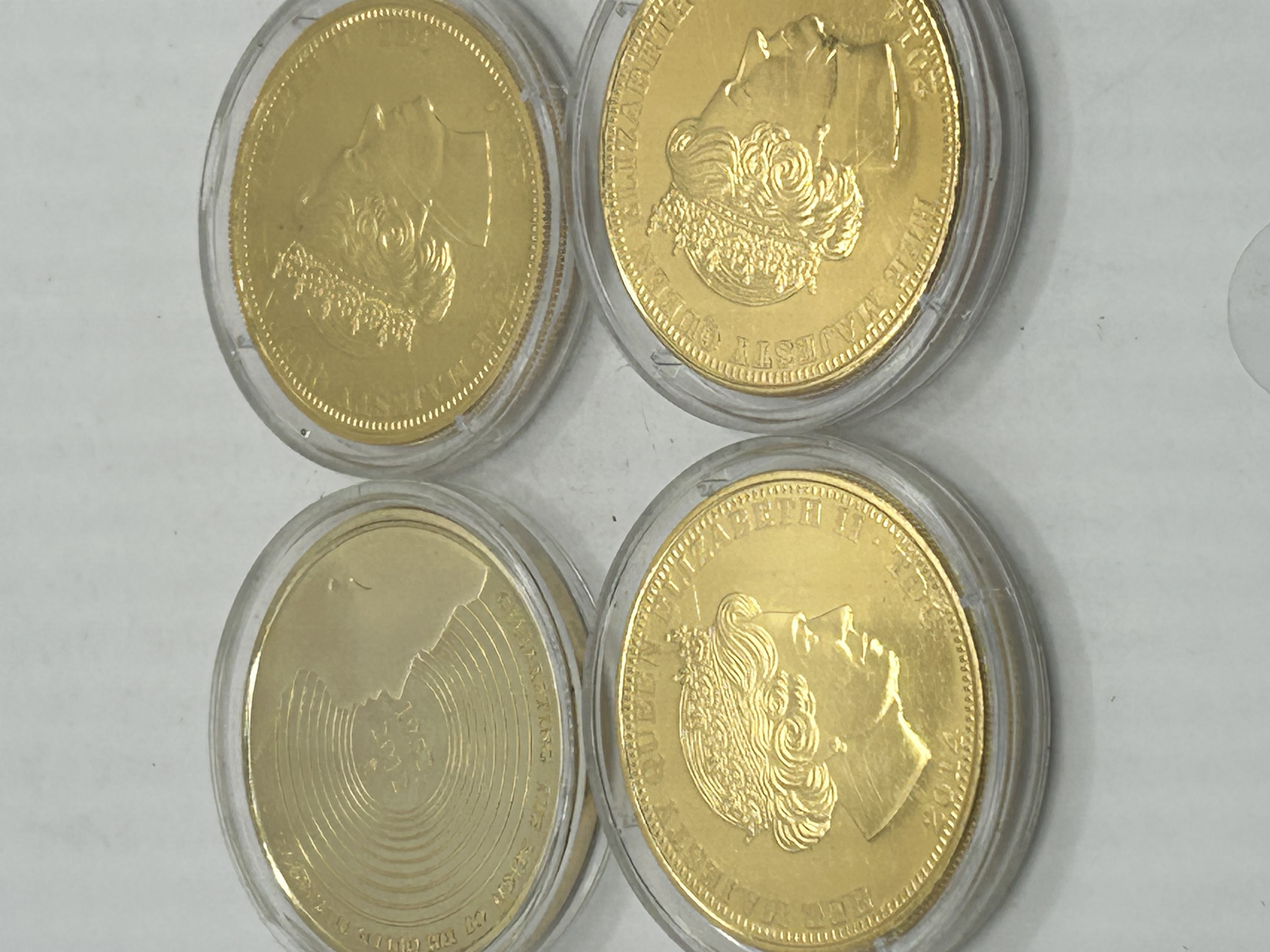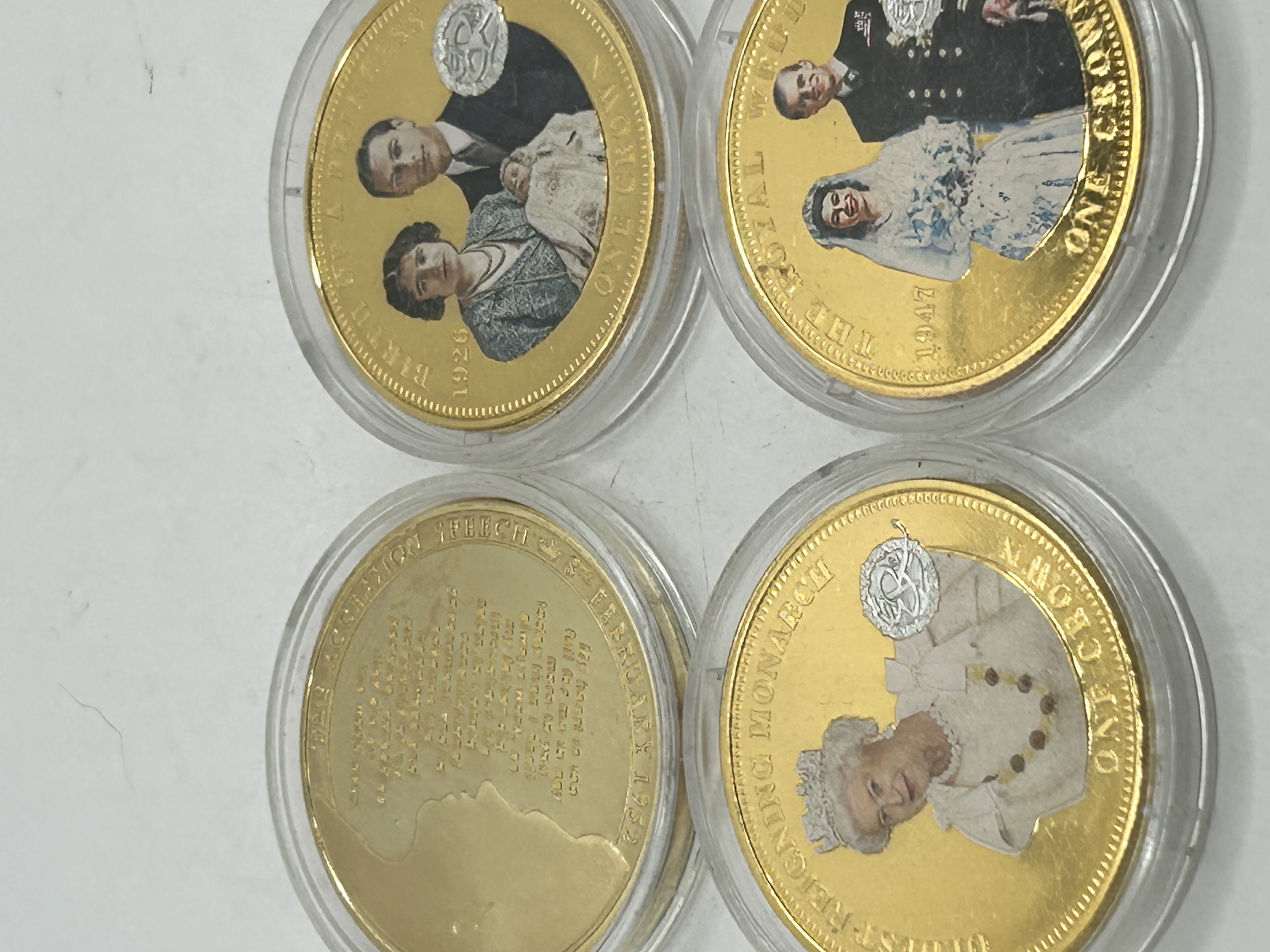 A collection of 24K gold-plated commemorative One Crown coins, attributed to the Bradford Exchange. Each piece features a colorized photographic image on the reverse celebrating milestones in the life of Queen Elizabeth II, including her birth in 1926, her wedding in 1947, and her status as the longest-reigning monarch. One coin commemorates the accession in 1952 with a text-based design. The obverses depict the effigy of Her Majesty Queen Elizabeth II with the inscription Tristan da Cunha and the date 2015. Each coin is housed in an individual clear plastic protective capsule.