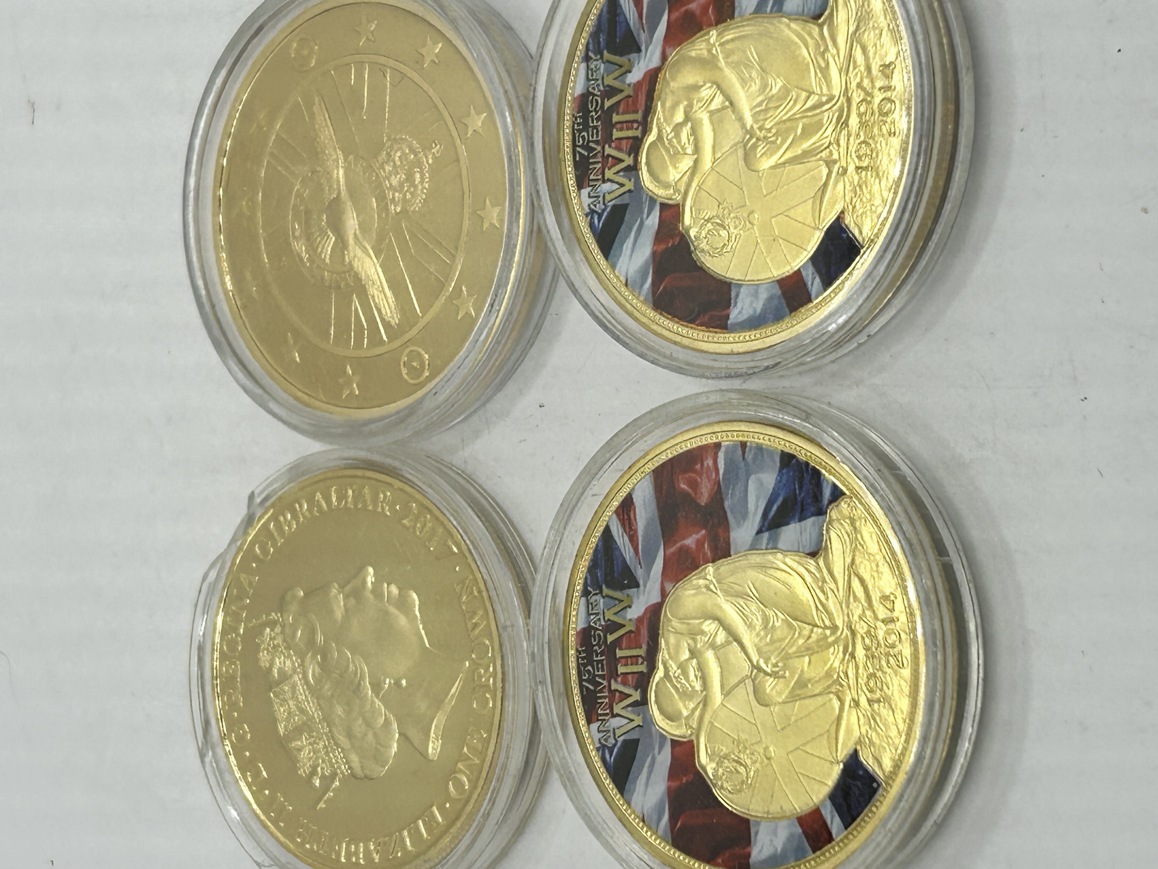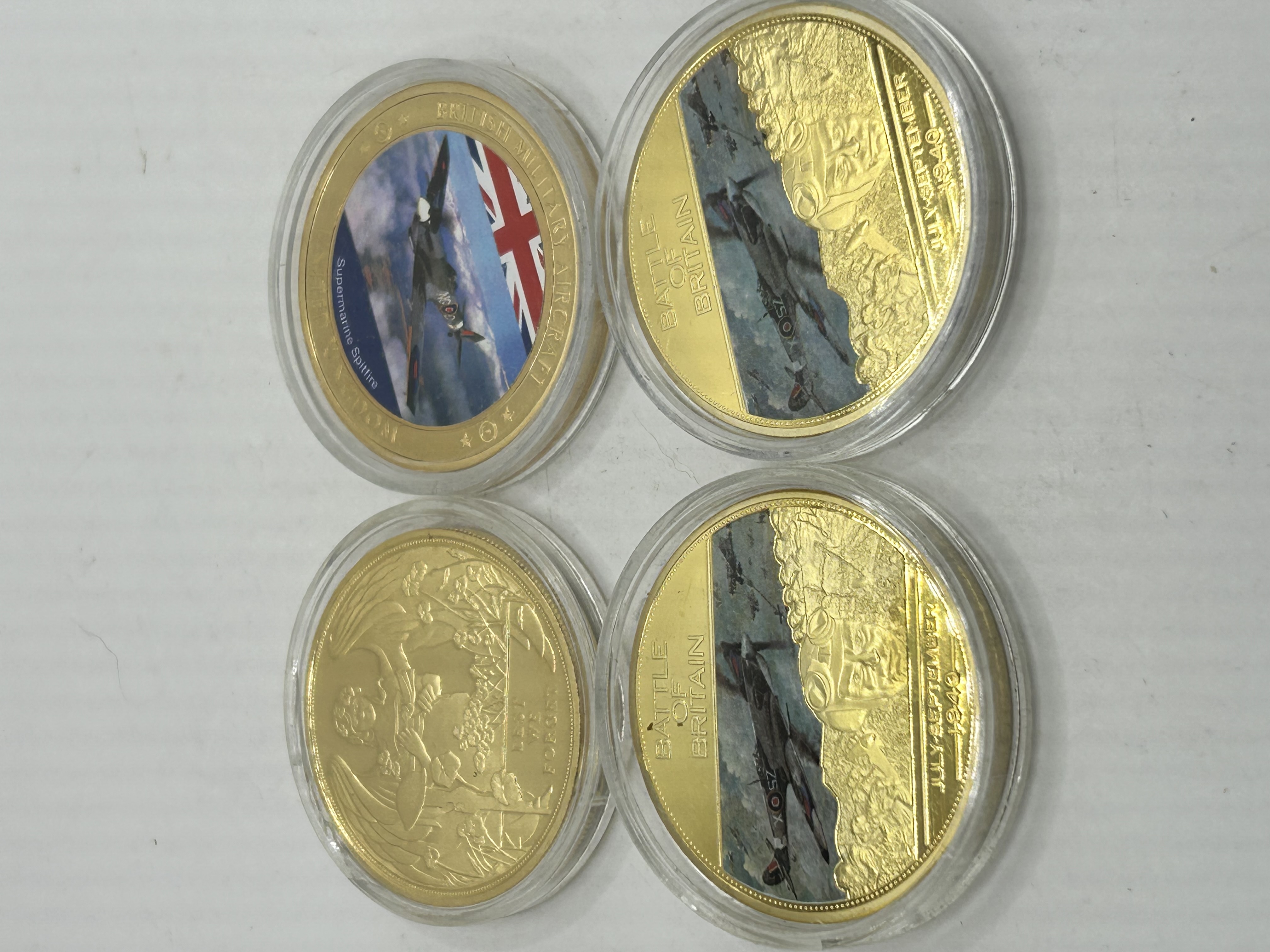 A collection of gold-plated copper commemorative coins and medals. The group includes a 2017 Gibraltar One Crown piece featuring the effigy of Queen Elizabeth II on the obverse and a Lest We Forget memorial design on the reverse. Also included is a British Military Aircraft medal depicting a Supermarine Spitfire with a colorized Union Jack background. The collection further contains two 75th Anniversary of WWII Battle of Britain medals (July-September 1940) featuring colorized Union Jack graphic overlays and dated 1939-2014. Each piece exhibits a high-luster, proof-like finish and is housed in a clear protective plastic capsule.