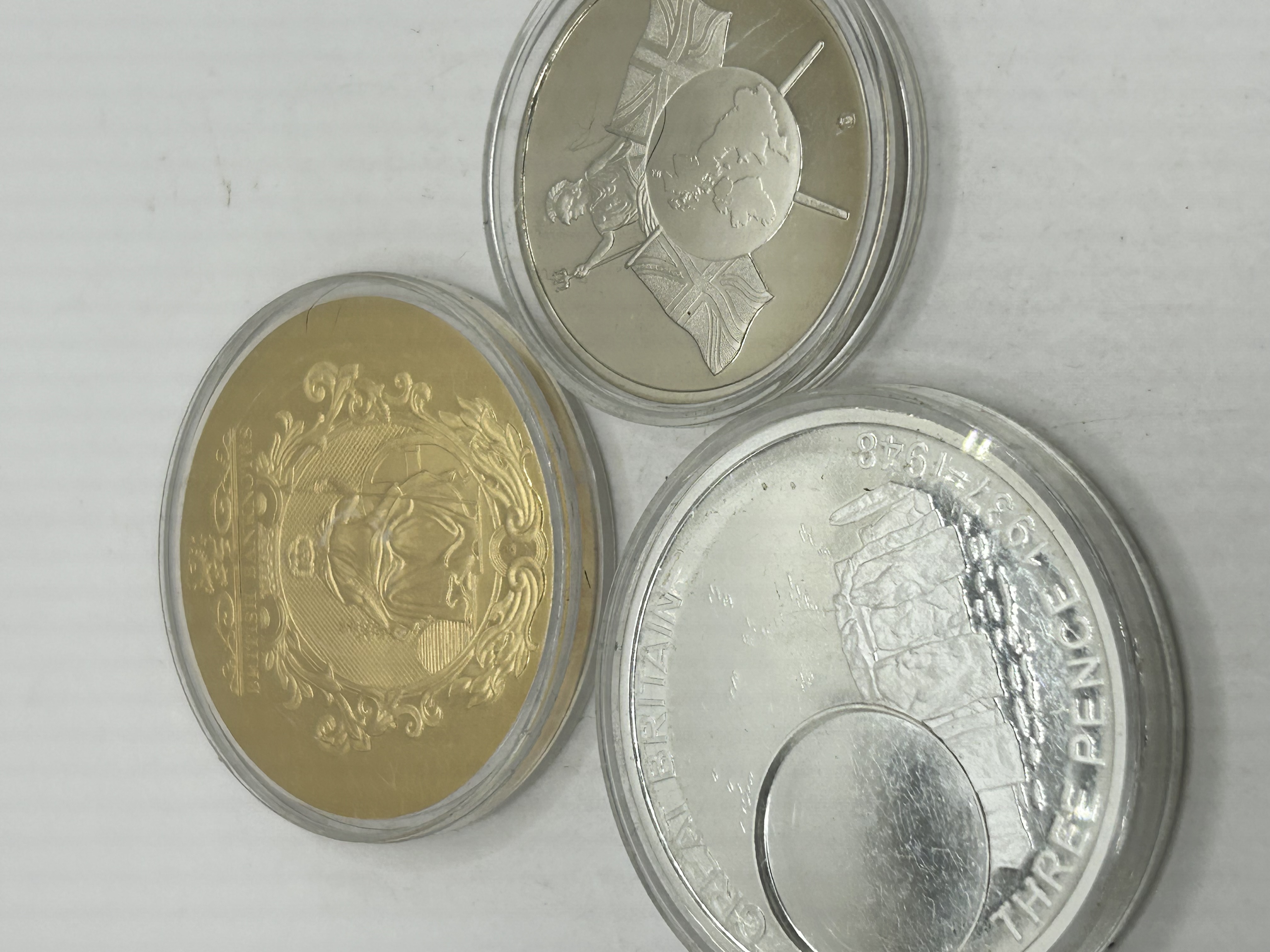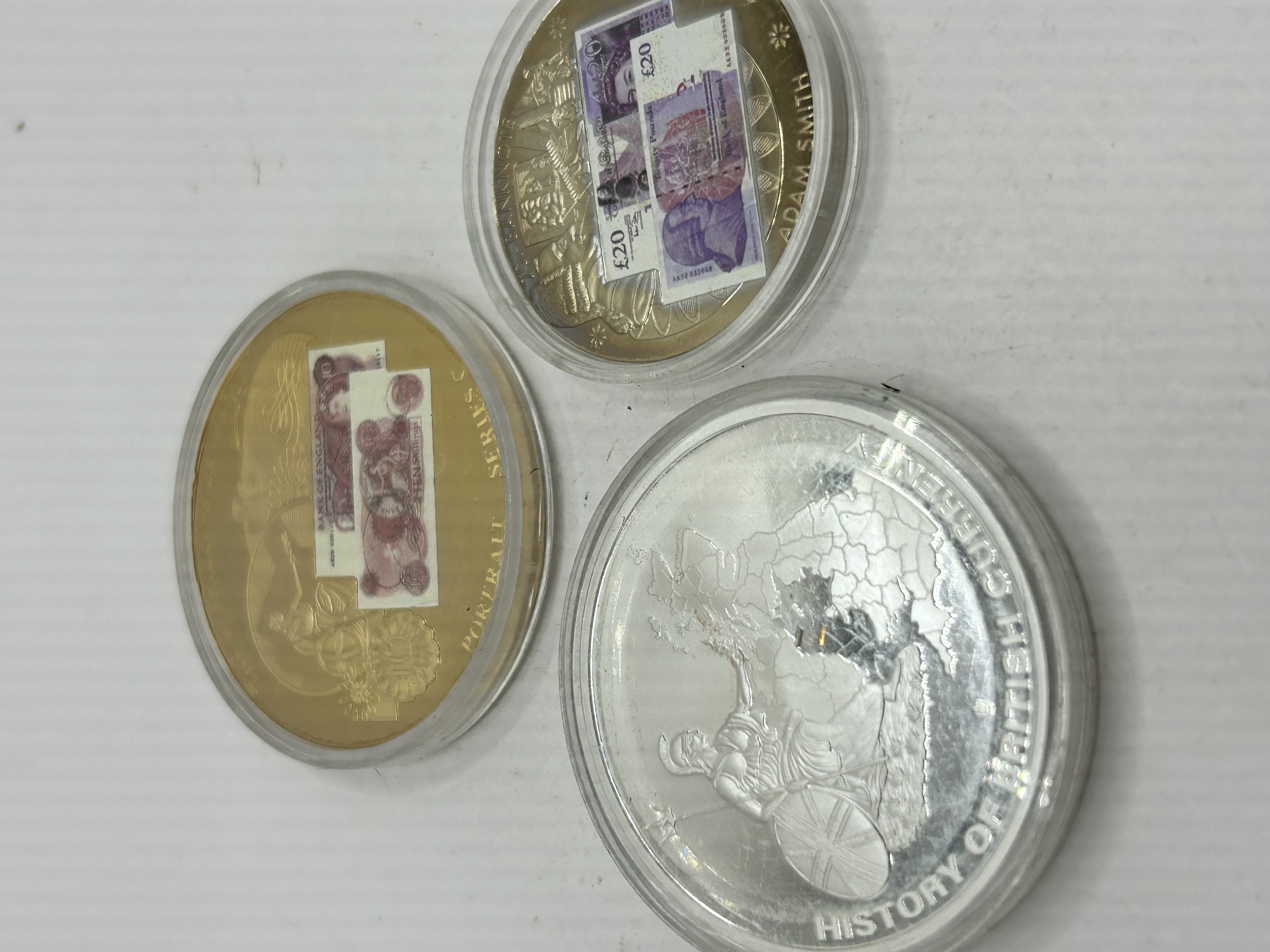 A trio of commemorative medallions celebrating the history of British currency. The group includes two gold-toned pieces and one larger silver-toned piece. The first gold-toned medallion features the Adam Smith twenty pound banknote design on the obverse, with a reverse depicting Britannia, a globe, and Union Jack flags. The second gold-toned medallion features the Ten Shilling Portrait Series C banknote design on the obverse, with a decorative crest on the reverse. The silver-toned medallion is inscribed History of British Currency and depicts Britannia with a map on the obverse, while the reverse features a Great Britain Three Pence 1937-1948 coin design. Each medallion is housed in a clear plastic protective capsule.