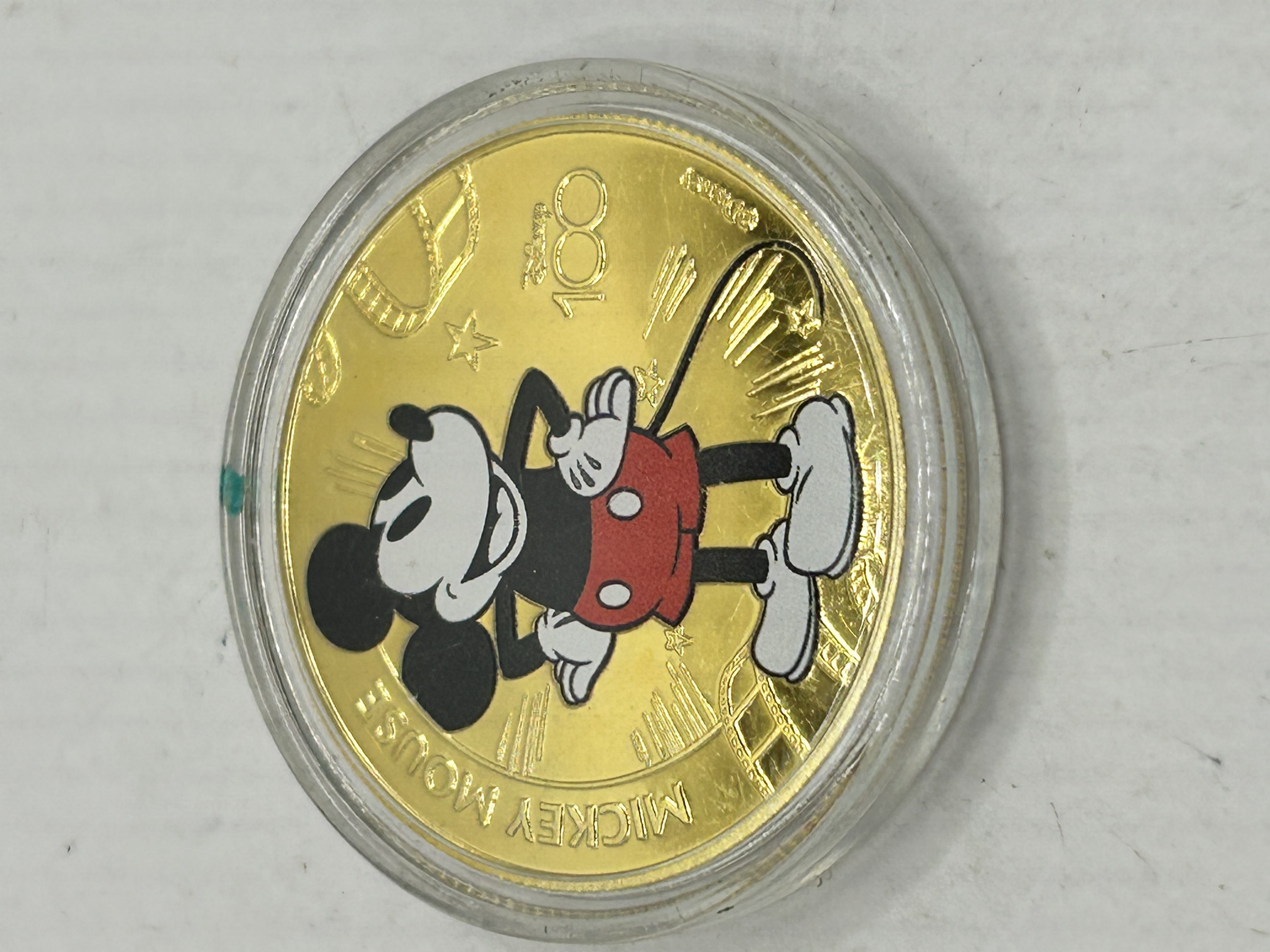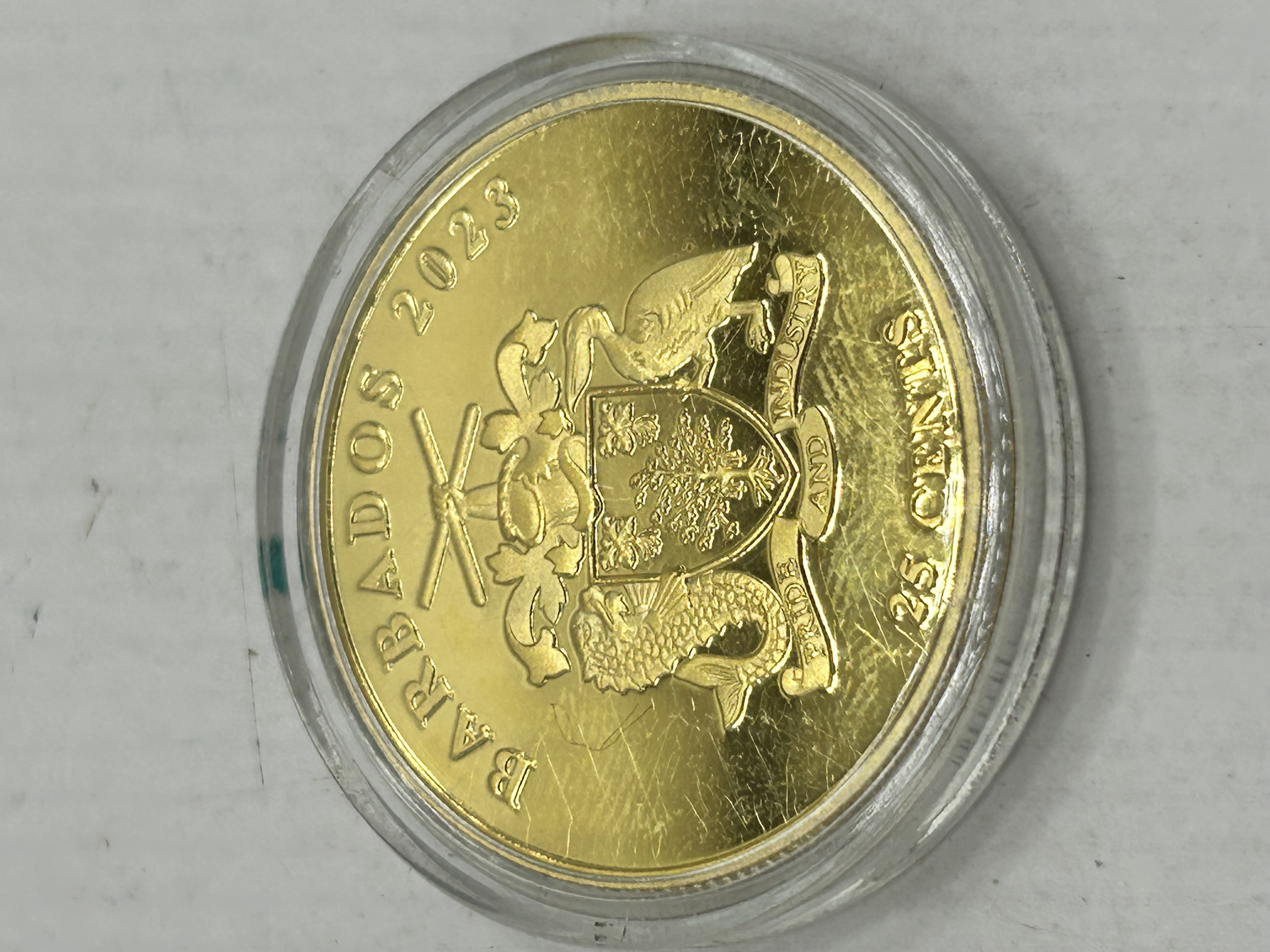 A 2023 Barbados 25 Cents commemorative coin issued for the Disney 100th anniversary. The coin features a gold-toned finish with a colorized depiction of Mickey Mouse on the obverse. The character is depicted in a standing pose against a background of stars and a stylized castle, with the Disney 100 logo and embossed text reading MICKEY MOUSE. The reverse features the Barbados coat of arms with the motto PRIDE AND INDUSTRY, along with the inscriptions BARBADOS 2023 and the denomination 25 CENTS. The coin is presented in a clear plastic protective capsule.