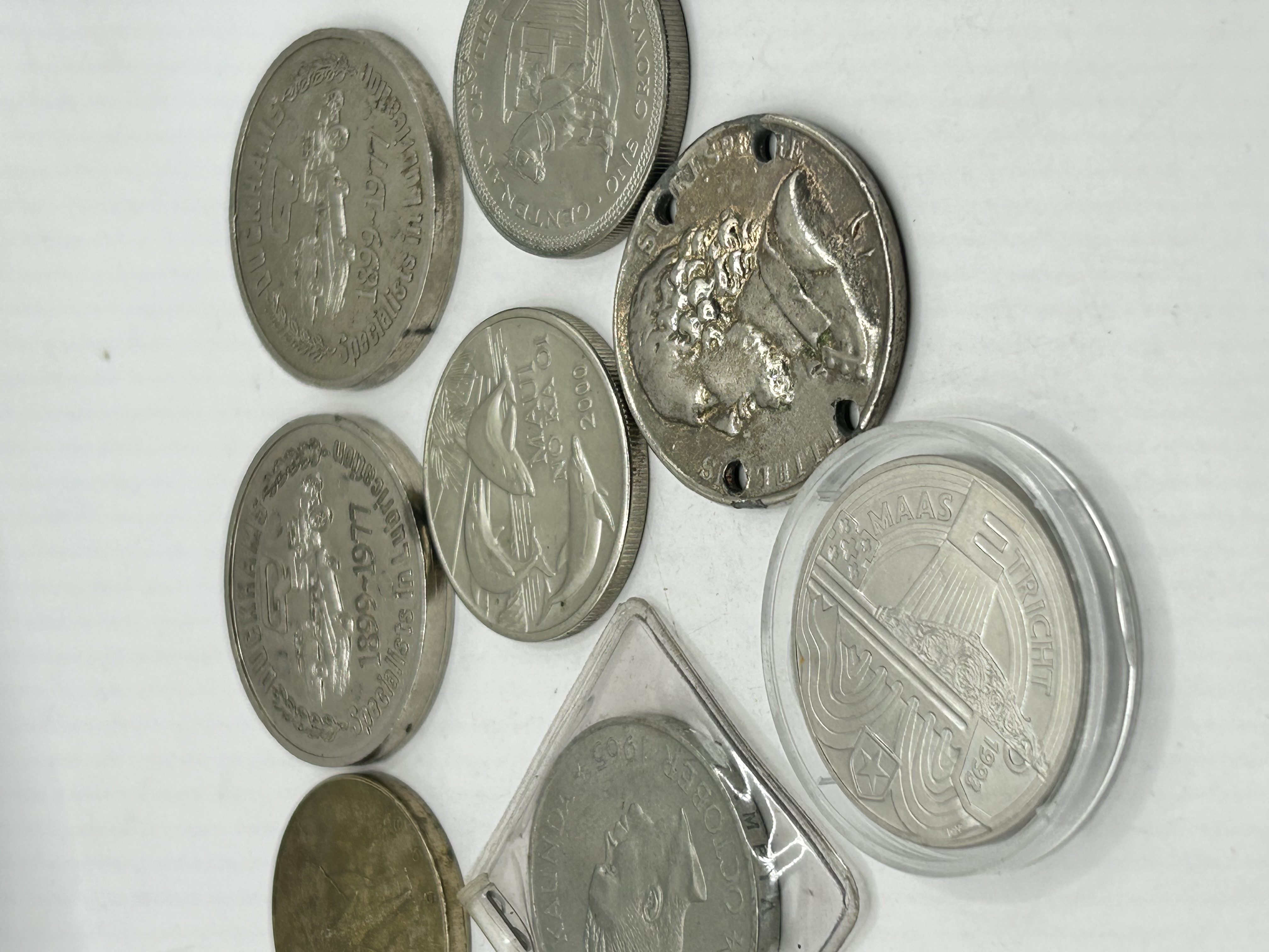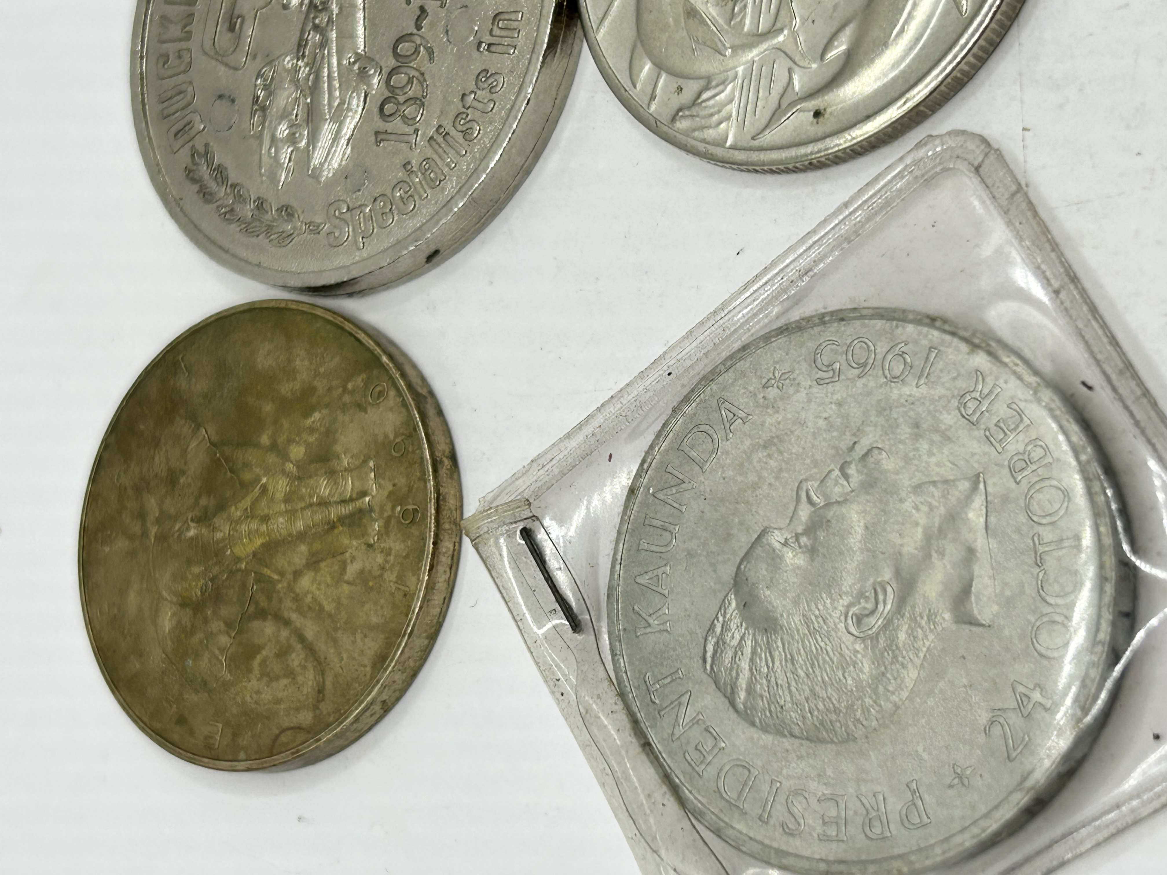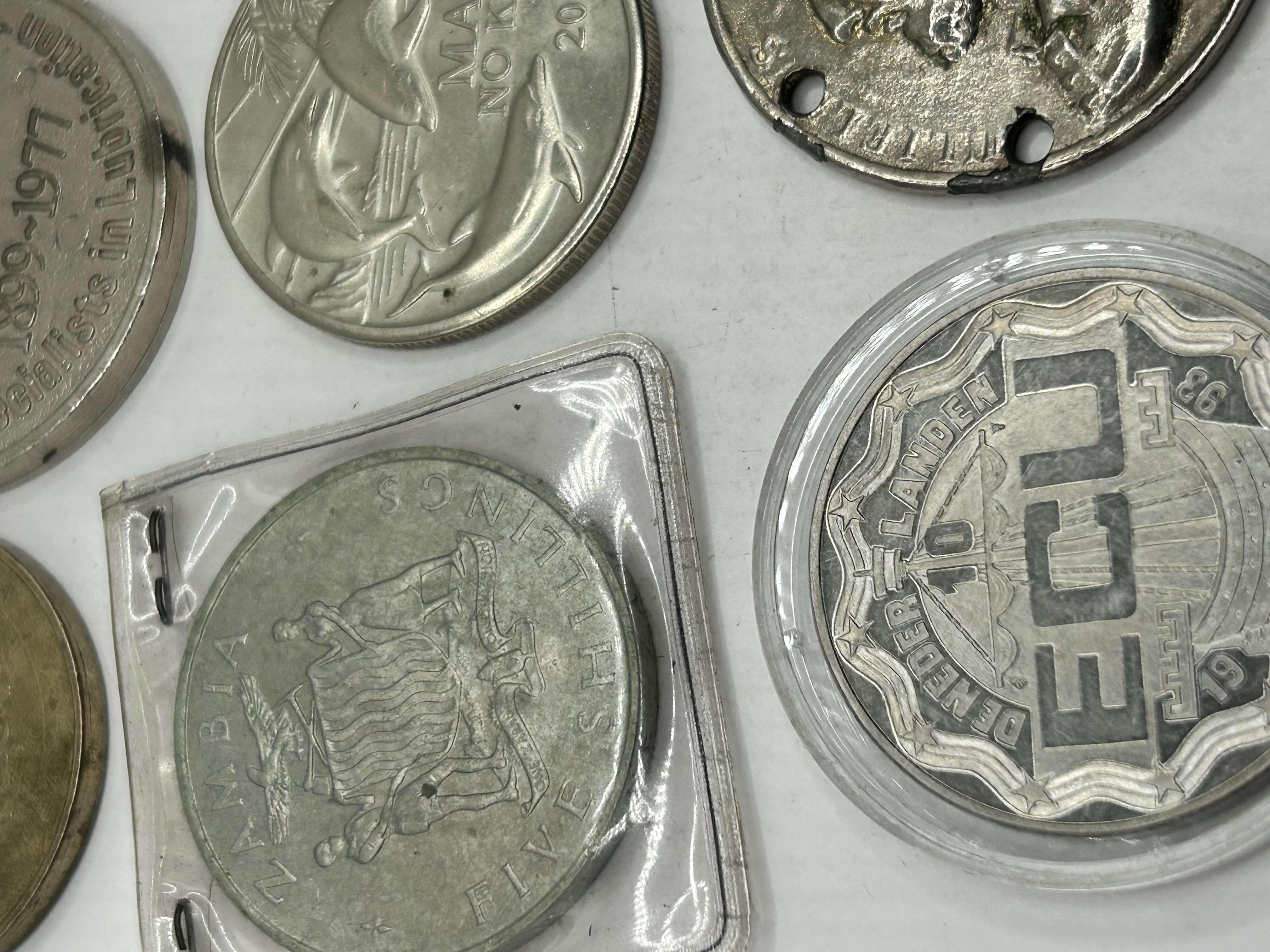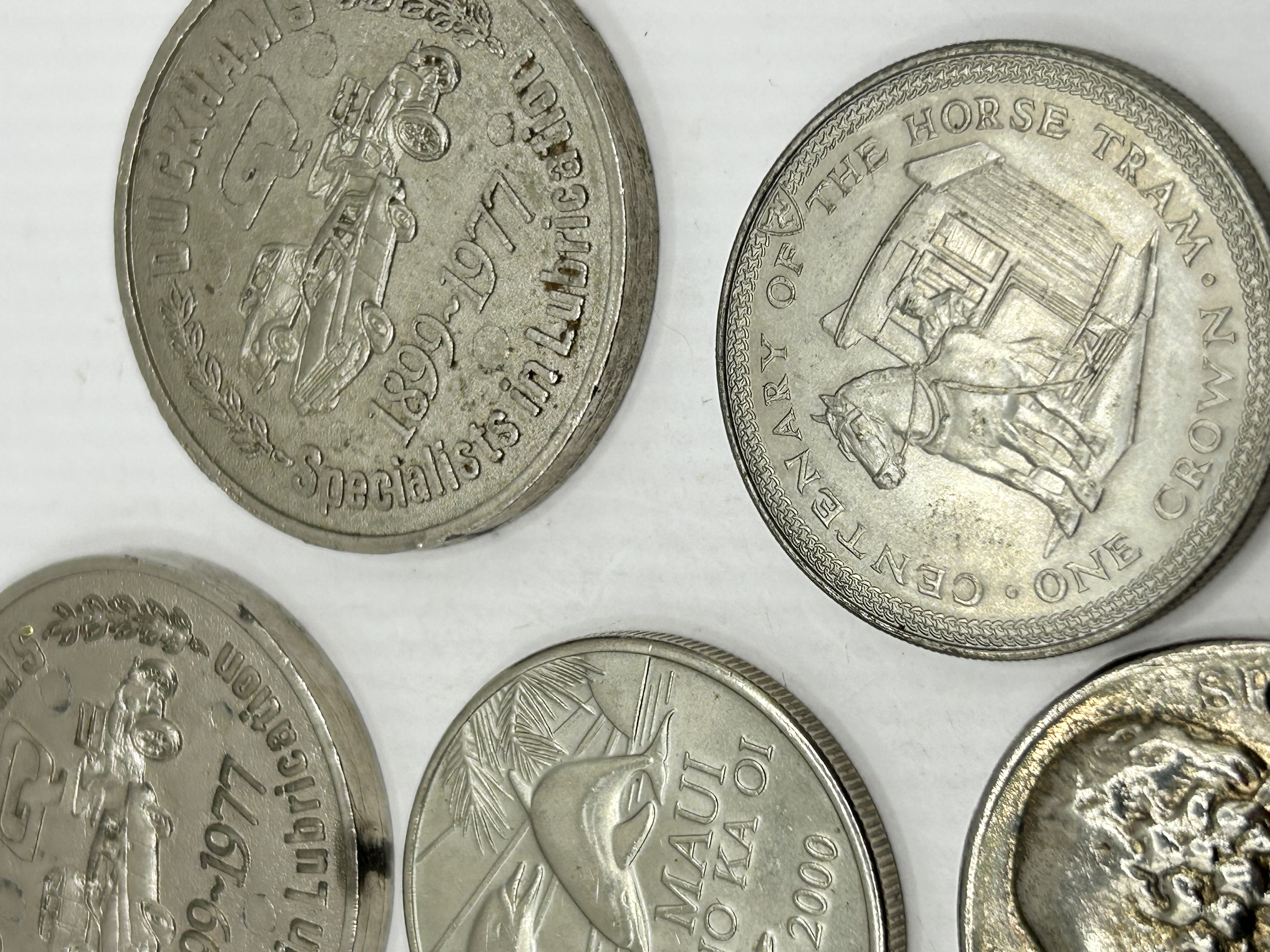 A collection of various commemorative coins, medals, and tokens struck in various base metals and alloys. The group includes Duckhams 1899-1977 Specialists in Lubrication commemorative medals. Also present is a Centenary of the Horse Tram one-crown coin and a year 2000 Maui No Ka Oi token featuring a dolphin. International coinage includes a 1964 Zambia five-shillings coin commemorating President Kenneth Kaunda and a 1993 10 ECU De Nederlanden coin from Maastricht housed in a plastic case. The assortment also contains a brass-toned coin depicting an elephant and a perforated metal disc featuring a relief bust of a bearded figure, likely William Shakespeare.