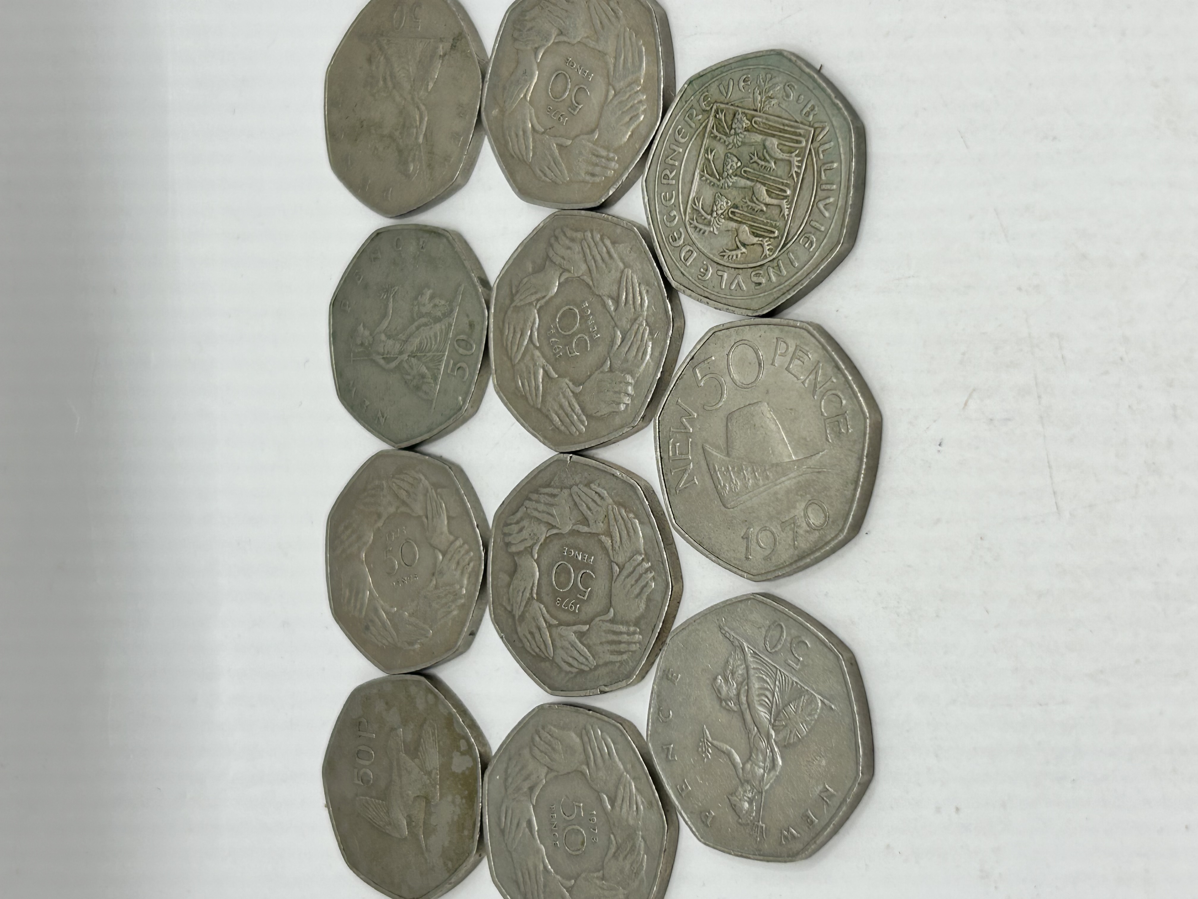 A collection of United Kingdom and Bailiwick of Guernsey cupro-nickel fifty pence coins. The assortment includes several 1973 commemorative issues marking the United Kingdom accession to the European Economic Community, designed with a ring of nine clasped hands. The collection also contains 1970 New Pence coins featuring the seated figure of Britannia. Included is a Bailiwick of Guernsey coin featuring the seal of the island with the inscription S’ BALLIVIE INSVLE DE GERNEREVE. All coins feature the second portrait of Queen Elizabeth II on the obverse.