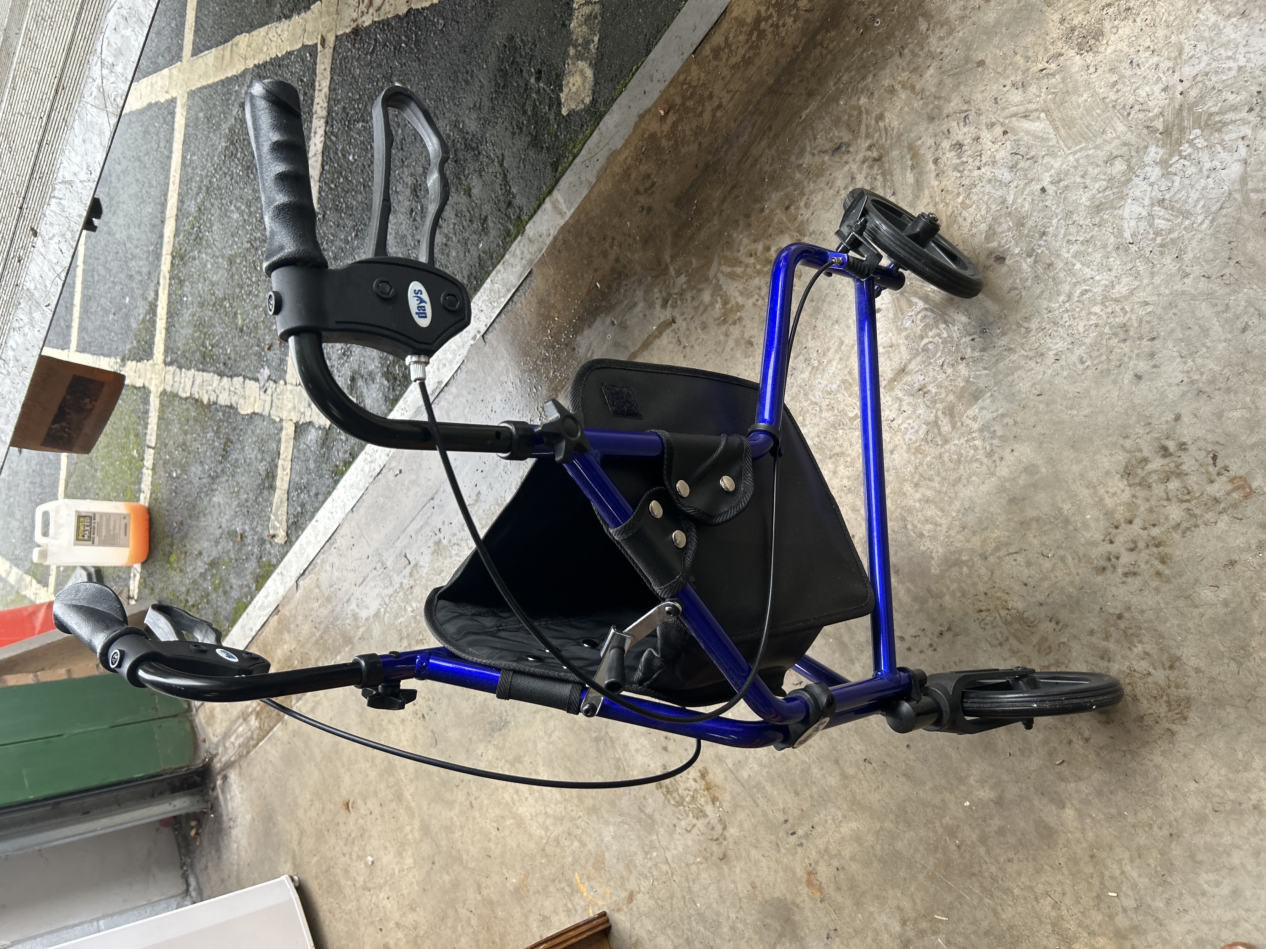 A Days brand three-wheeled mobility walker, also known as a tri-walker, featuring a blue-finished metal frame. The apparatus is equipped with height-adjustable handles and ergonomic black rubber grips. It includes integrated dual-lever hand brakes and a detachable black canvas storage bag secured with snap fasteners. The walker stands on three solid black wheels. The Days brand name is visible on a decal on the right brake assembly.