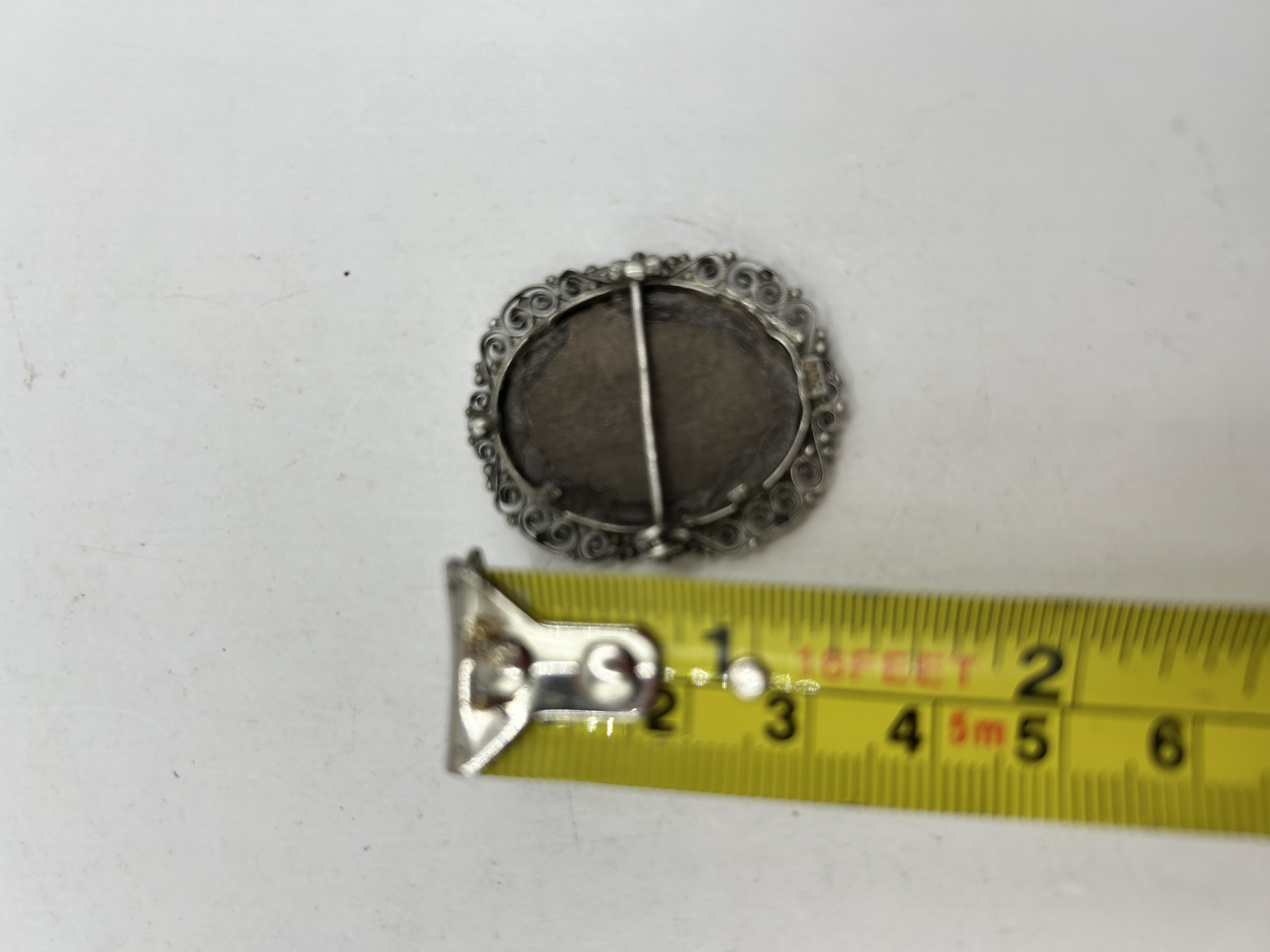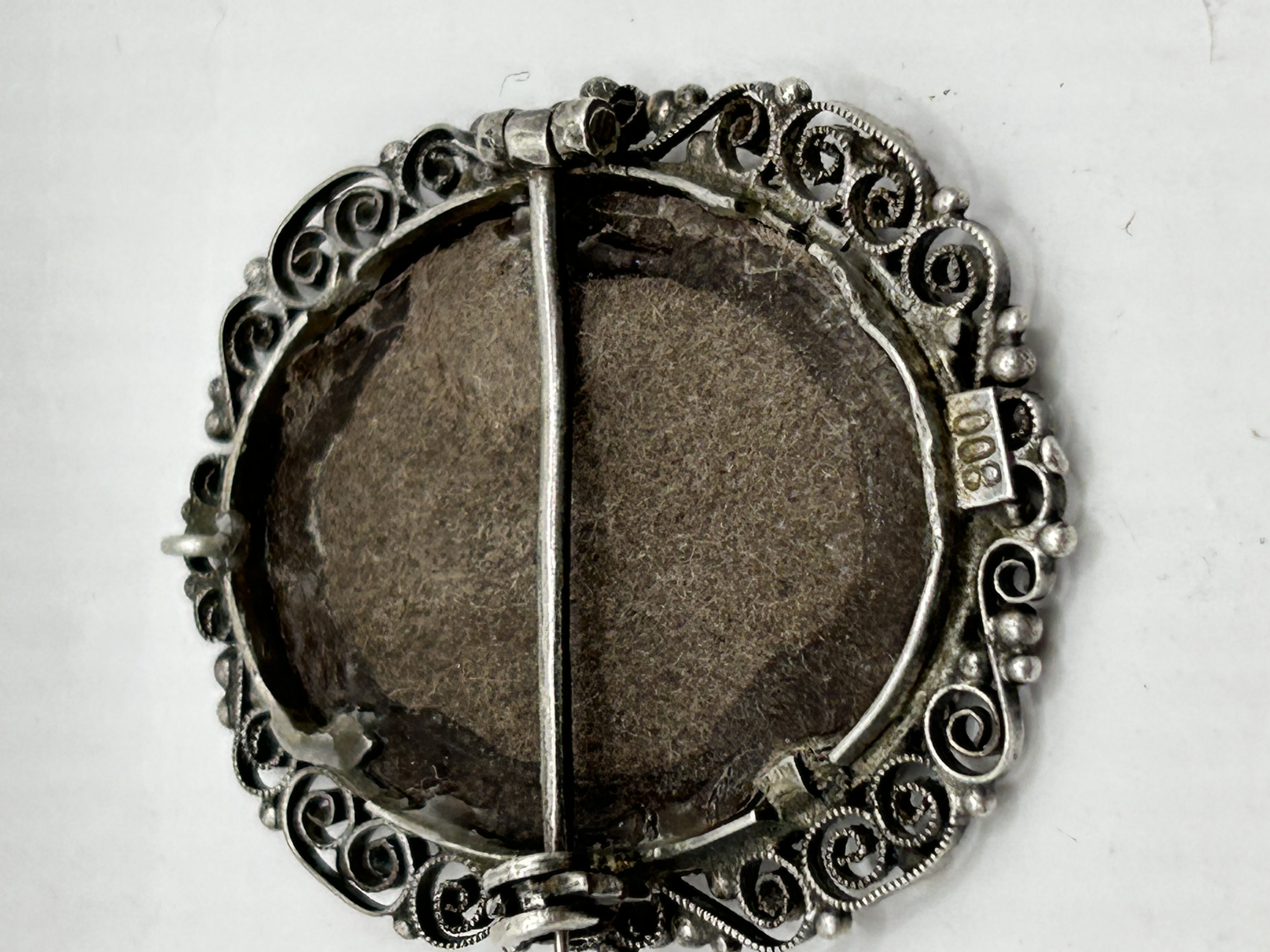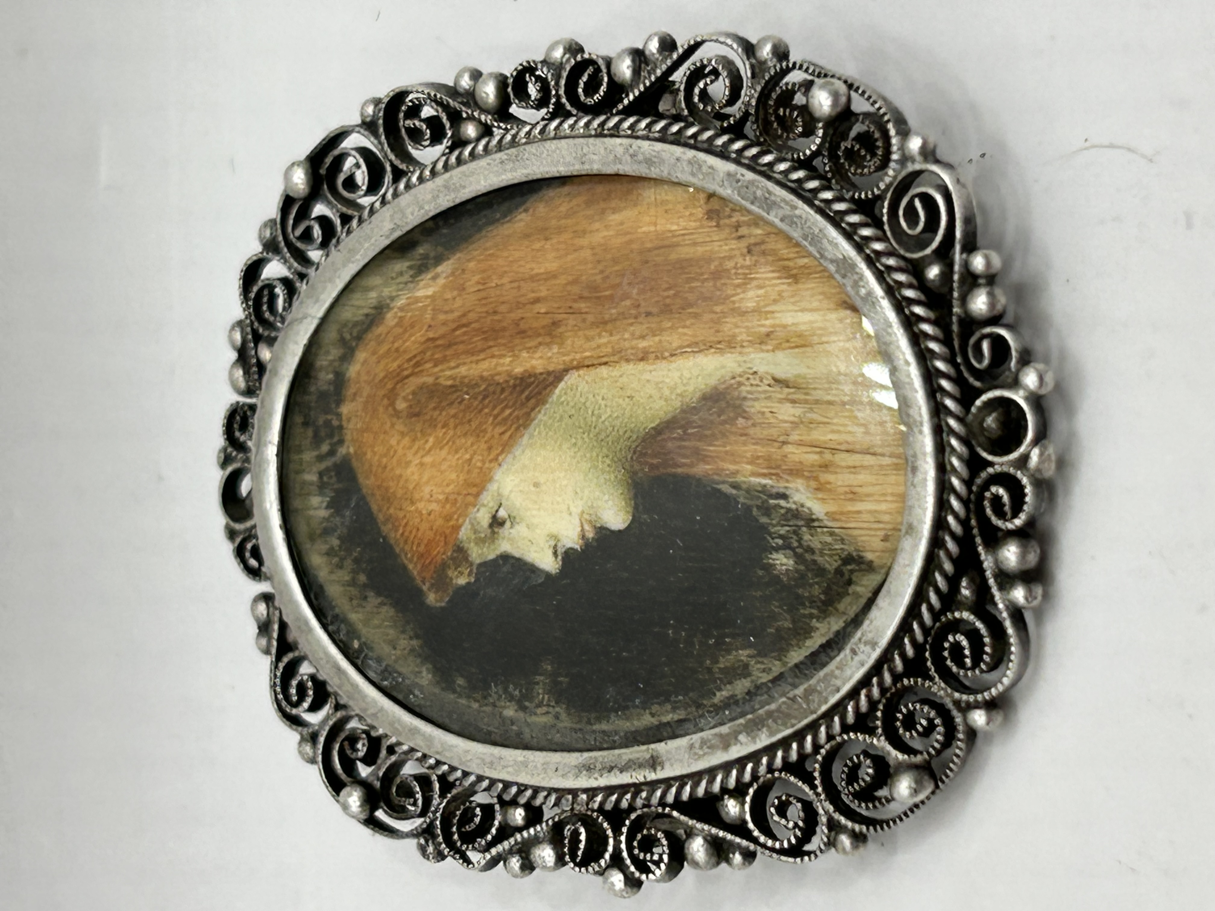This oval portrait miniature brooch depicts a profile of St. Fabiola with auburn hair, executed in the style of Jean-Jacques Henner. The hand-painted miniature is set under a protective cover and housed within an 800 silver filigree frame. The frame features ornate scrollwork and small spherical accents. The reverse of the brooch is fitted with a pin-back mechanism and is stamped with an 800 hallmark, denoting silver purity.