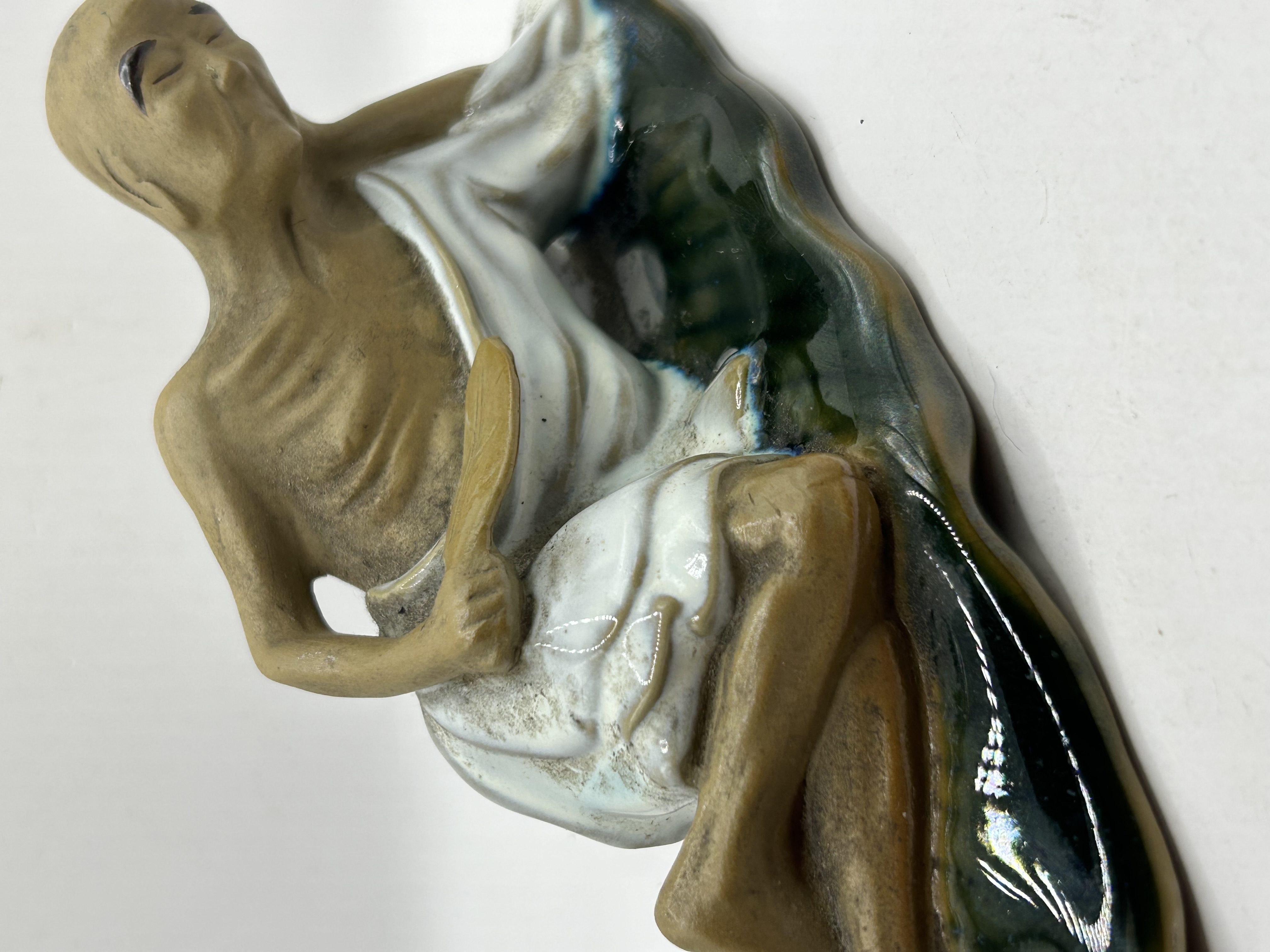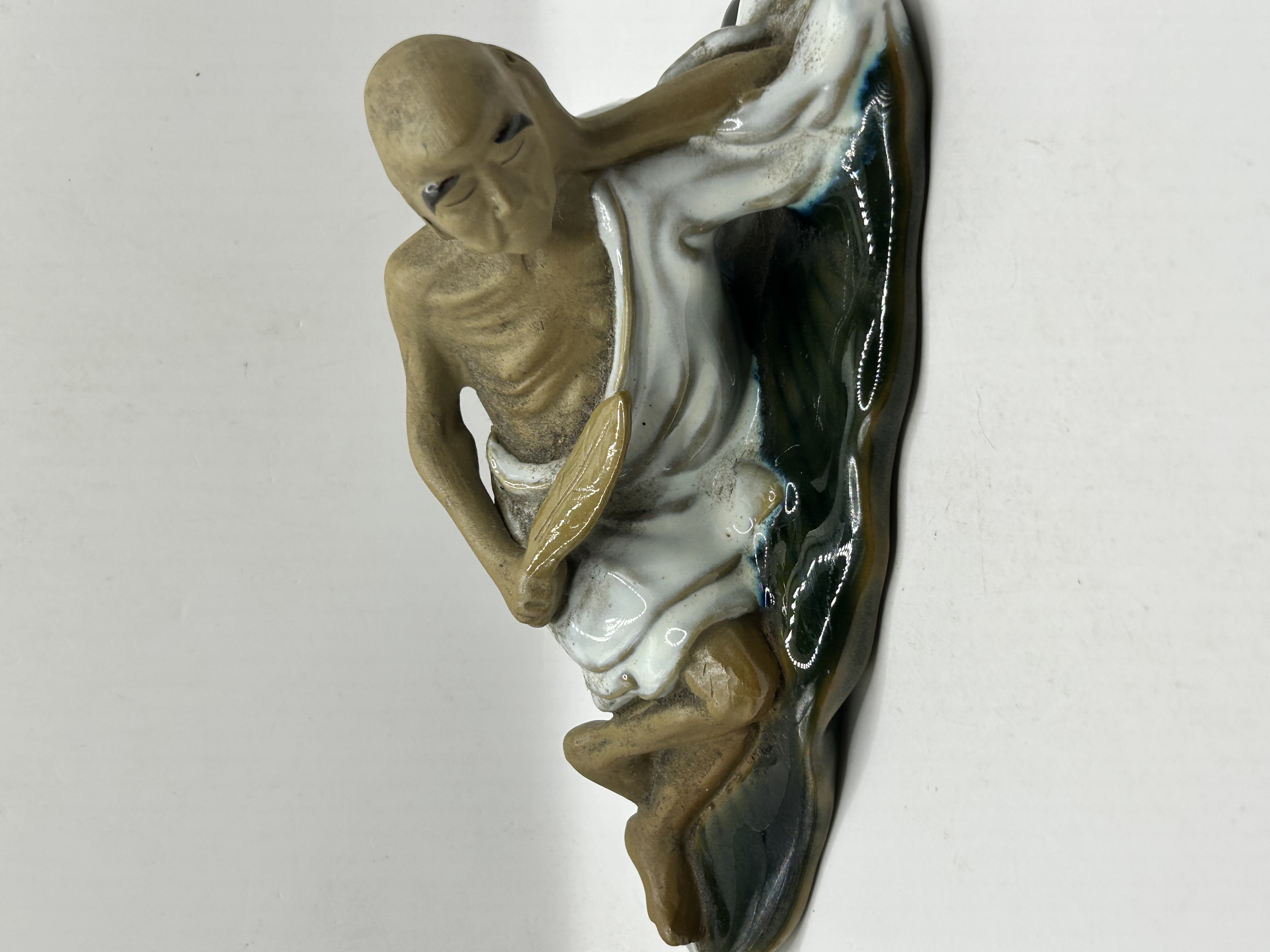 A Chinese Shiwan ceramic figure, commonly referred to as a Mudman, depicting a reclining ascetic monk or Arhat. The figure is modeled with an emaciated torso and limbs featuring a matte, unglazed tan finish. He is draped in a flowing white glazed robe and holds a leaf-form fan. The subject is positioned against a stylized rocky outcrop decorated with deep green and black drip glazes. The underside features an impressed and partially obscured mark reading MADE IN CHINA alongside the numeral 208.