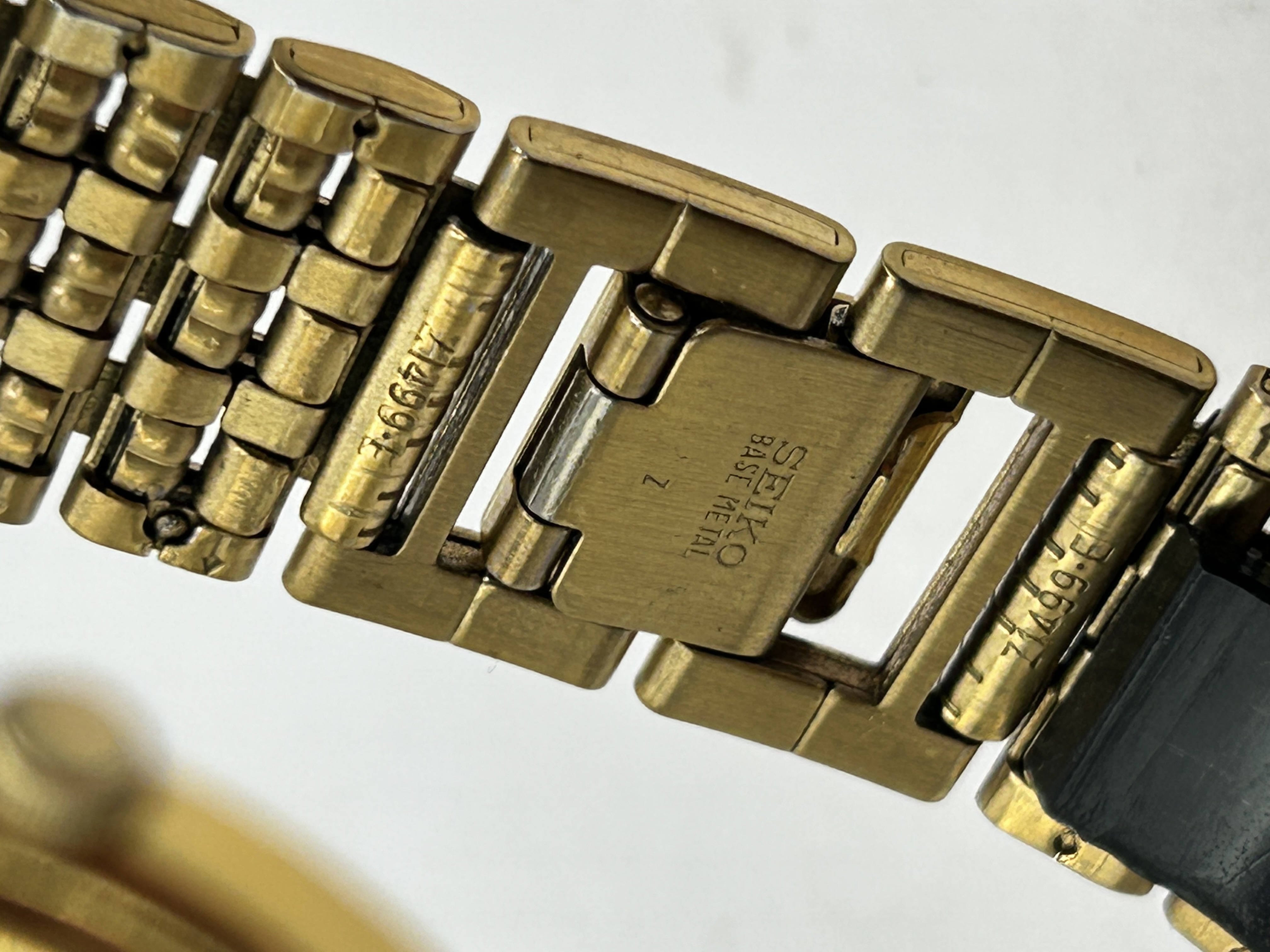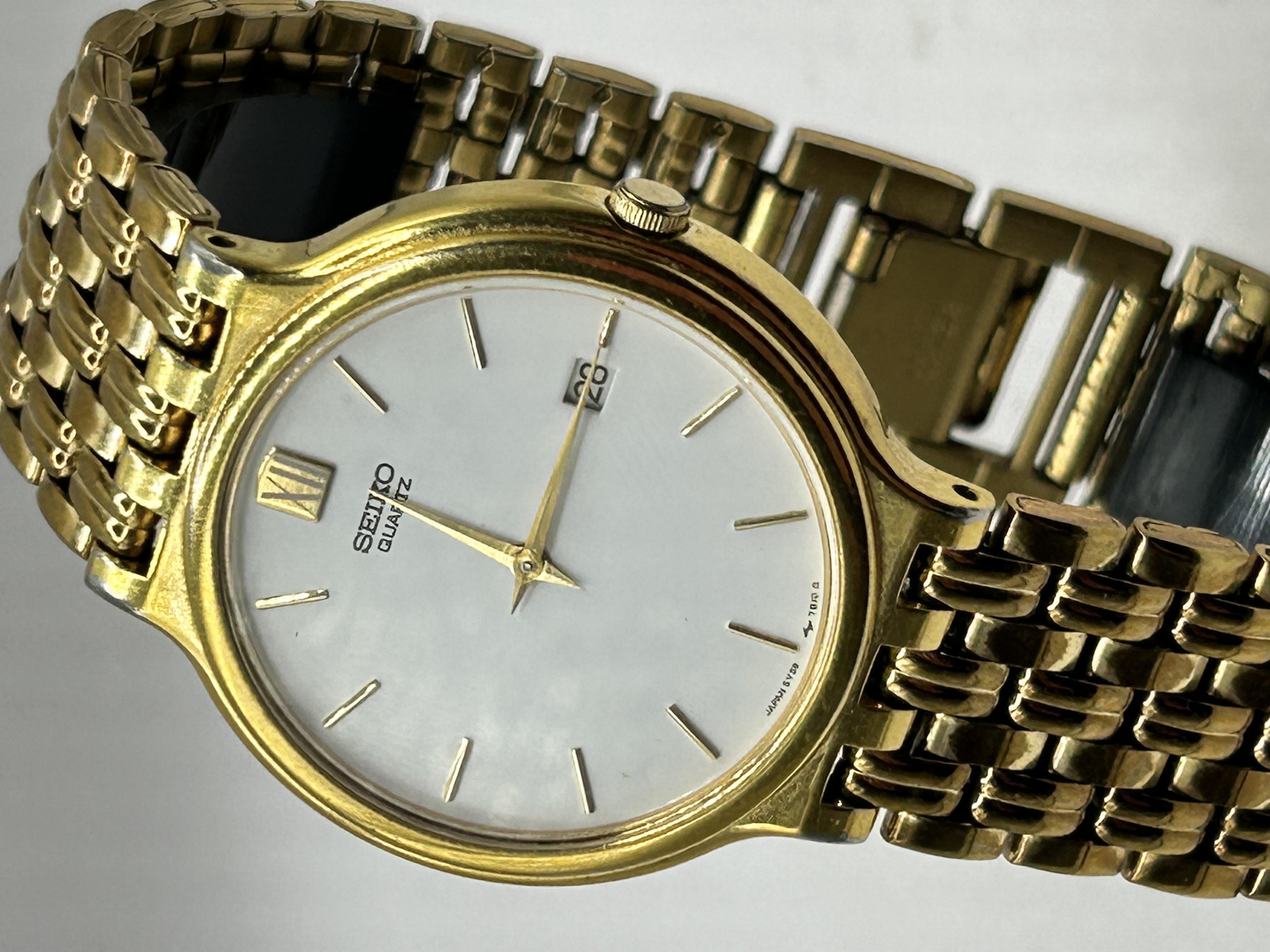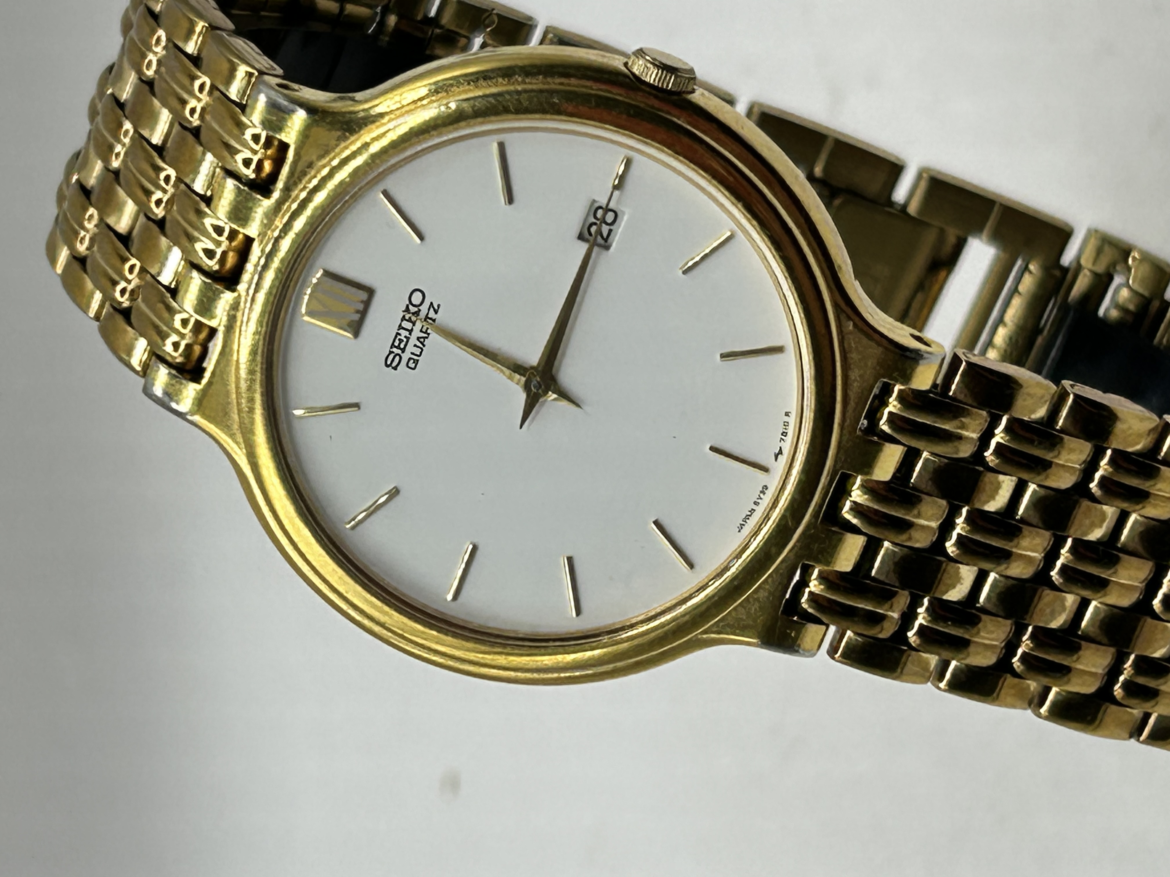 A vintage Seiko quartz dress wristwatch, model 5Y39-7010, dating to the 1990s. The timepiece features a gold-tone base metal case with a coordinating multi-link beads-of-rice style bracelet. The white dial is appointed with gold-tone baton hour markers, a Roman numeral XII at the twelve o’clock position, gold-tone hands, and a date aperture at the three o’clock position. Dial markings include SEIKO QUARTZ and JAPAN 5Y39-7010 R. The fold-over clasp is stamped SEIKO BASE METAL Z, and the bracelet end links are marked Z1499-E.