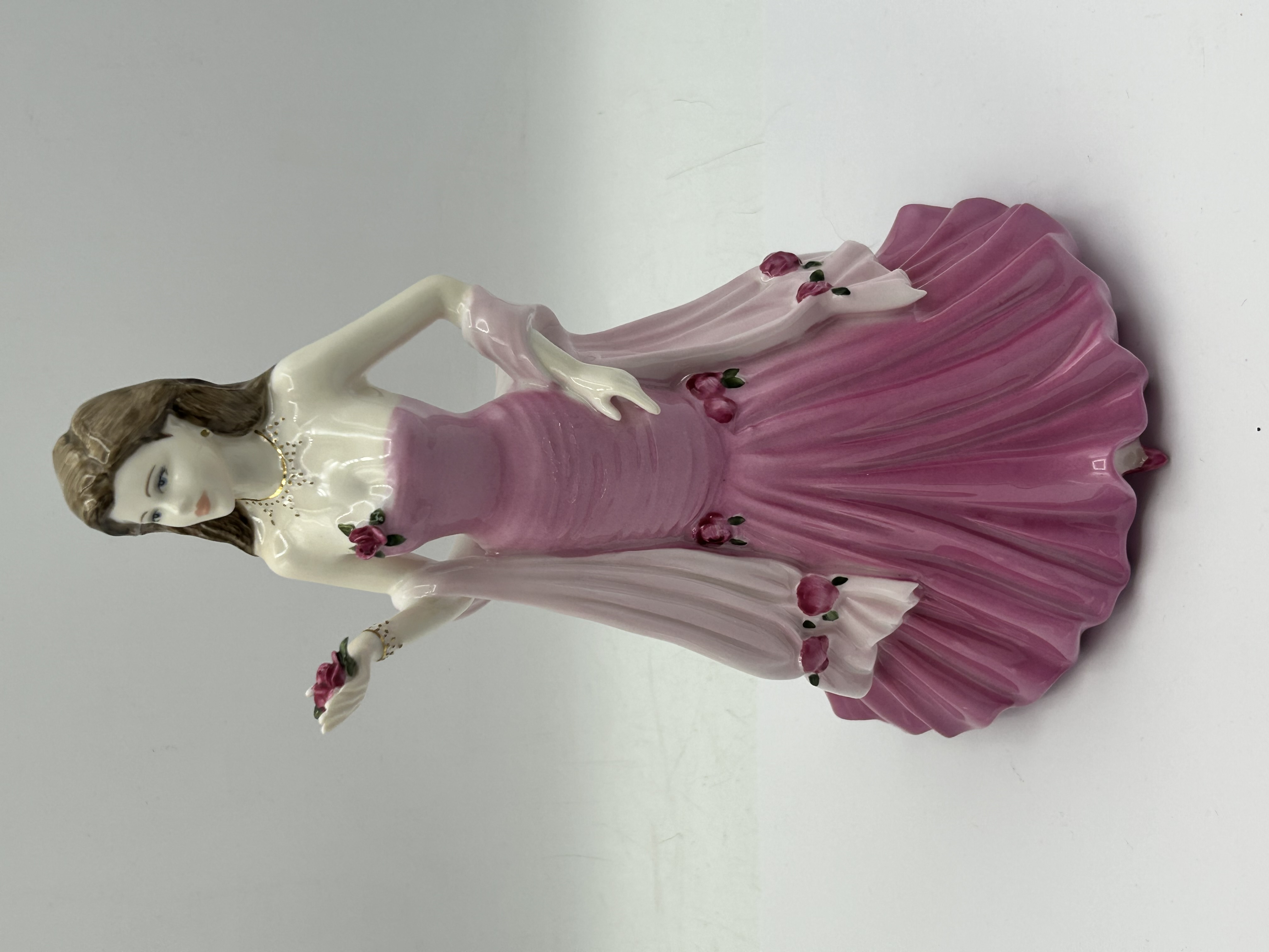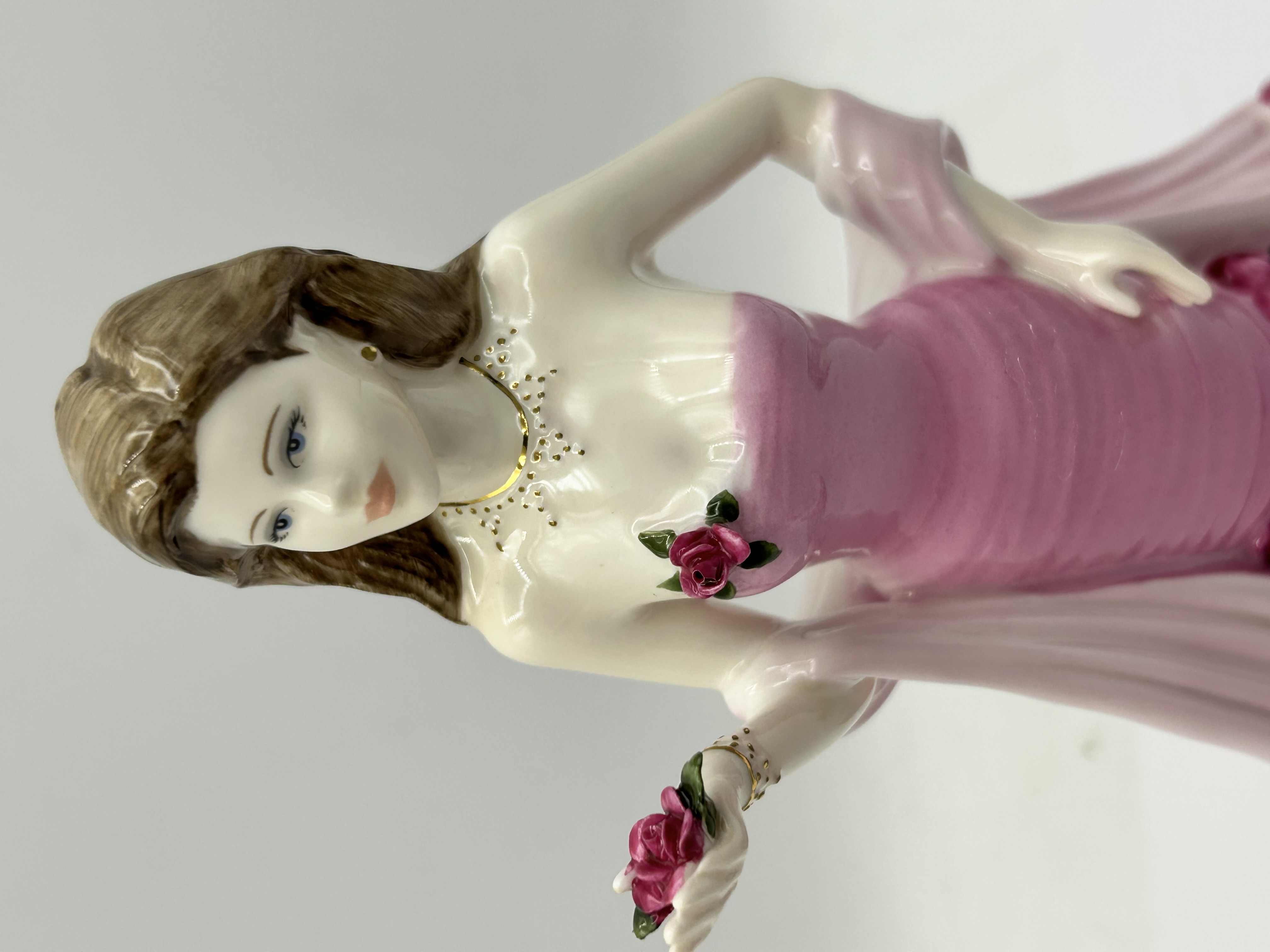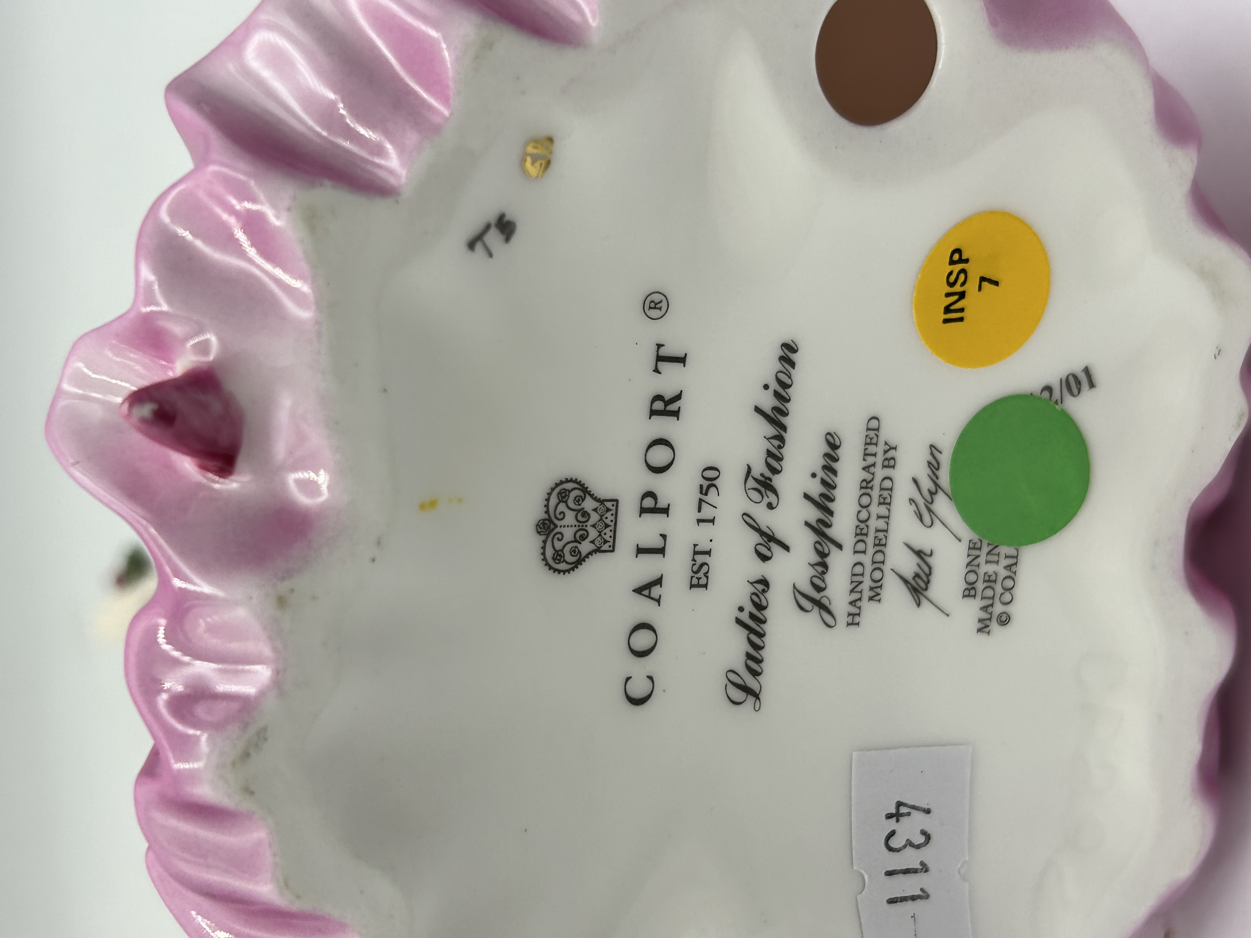 A Coalport bone china figurine titled Josephine from the Ladies of Fashion series. This figure was modeled by Jack Glynn and hand-decorated in England. The subject is depicted with brown hair wearing a flowing gown in shades of pink and pale pink. The dress is accented with hand-applied pink roses and gilded details on the necklace and bracelet. The base is marked with the Coalport crown logo, the series title, the model name, and the name of the modeler. It also features the inscription Bone China Made in England and a copyright date of 2000. Two circular inspection stickers in yellow and green are present on the underside.