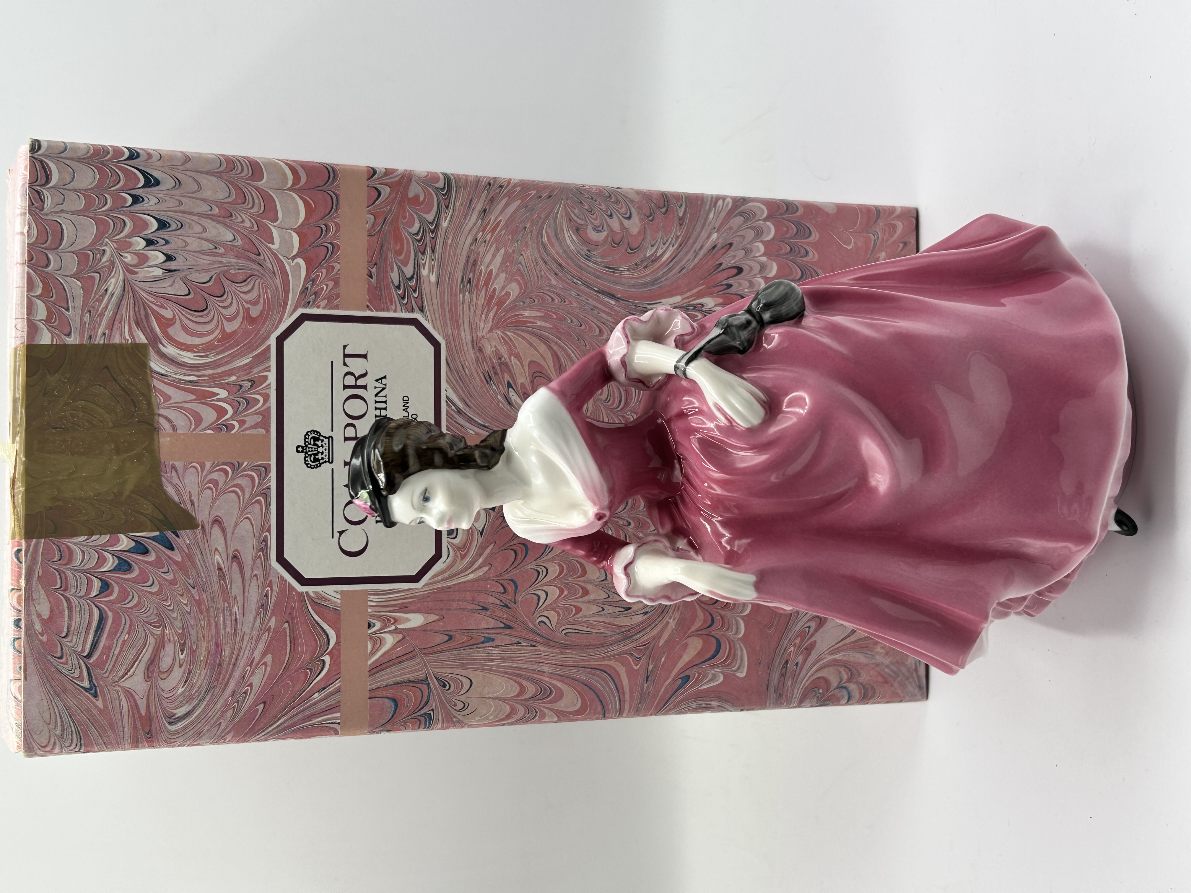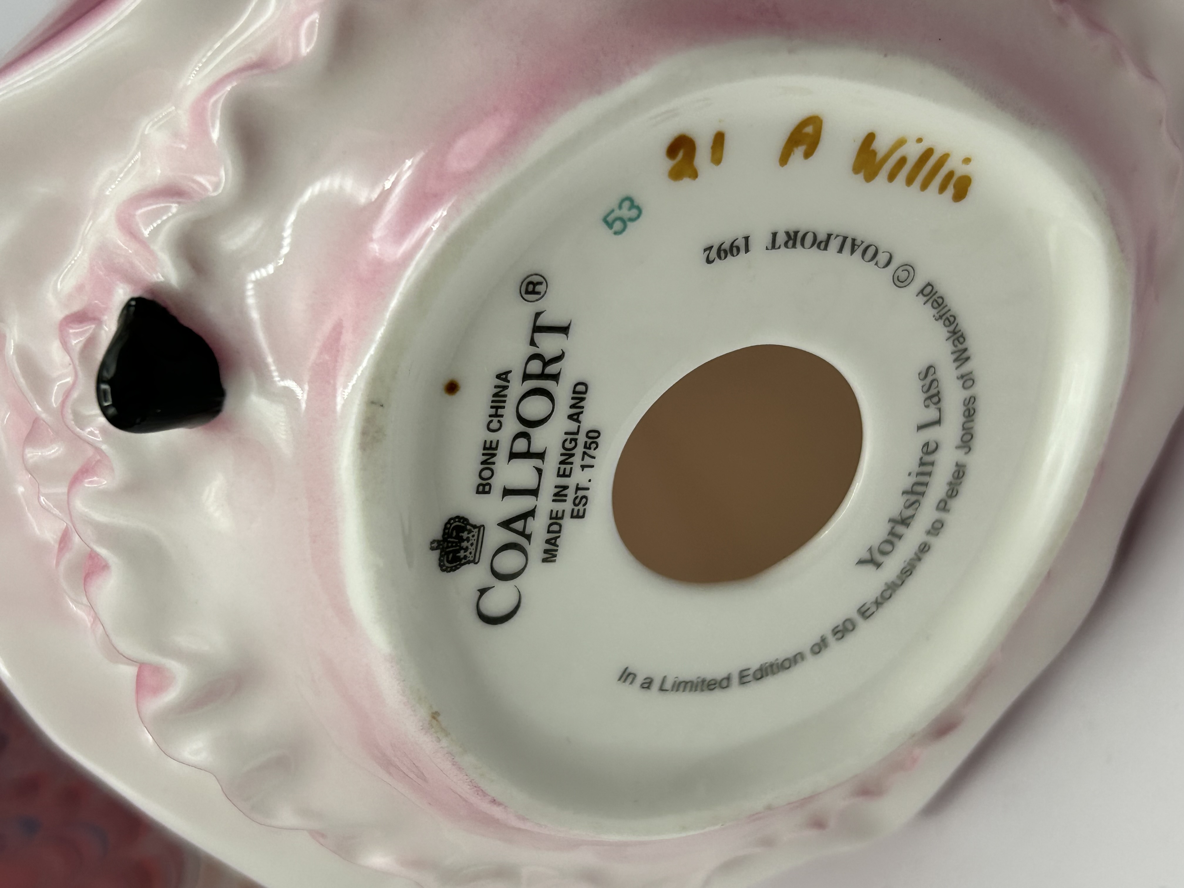 A Coalport bone china figurine titled Yorkshire Lass, manufactured in England and dated 1992. The figure is depicted in a Victorian-style pink gown with white ruffled detailing and a black hat. This item is part of a limited edition of 50 pieces produced exclusively for Peter Jones of Wakefield, hand-numbered 21. The base bears the Coalport factory mark, the title, and the hand-painted signature of artist A. Willis. The figurine is accompanied by its original pink marbled presentation box.