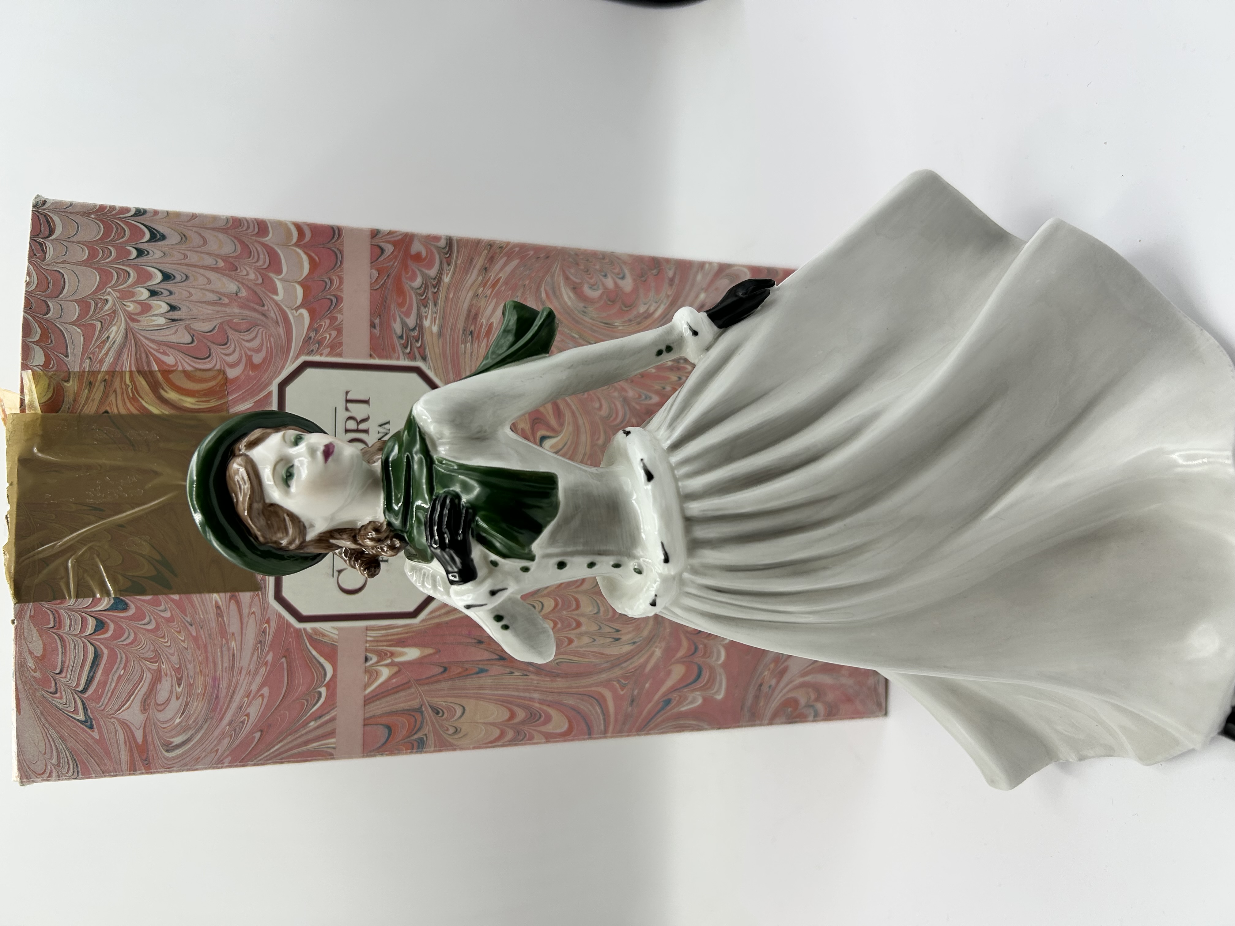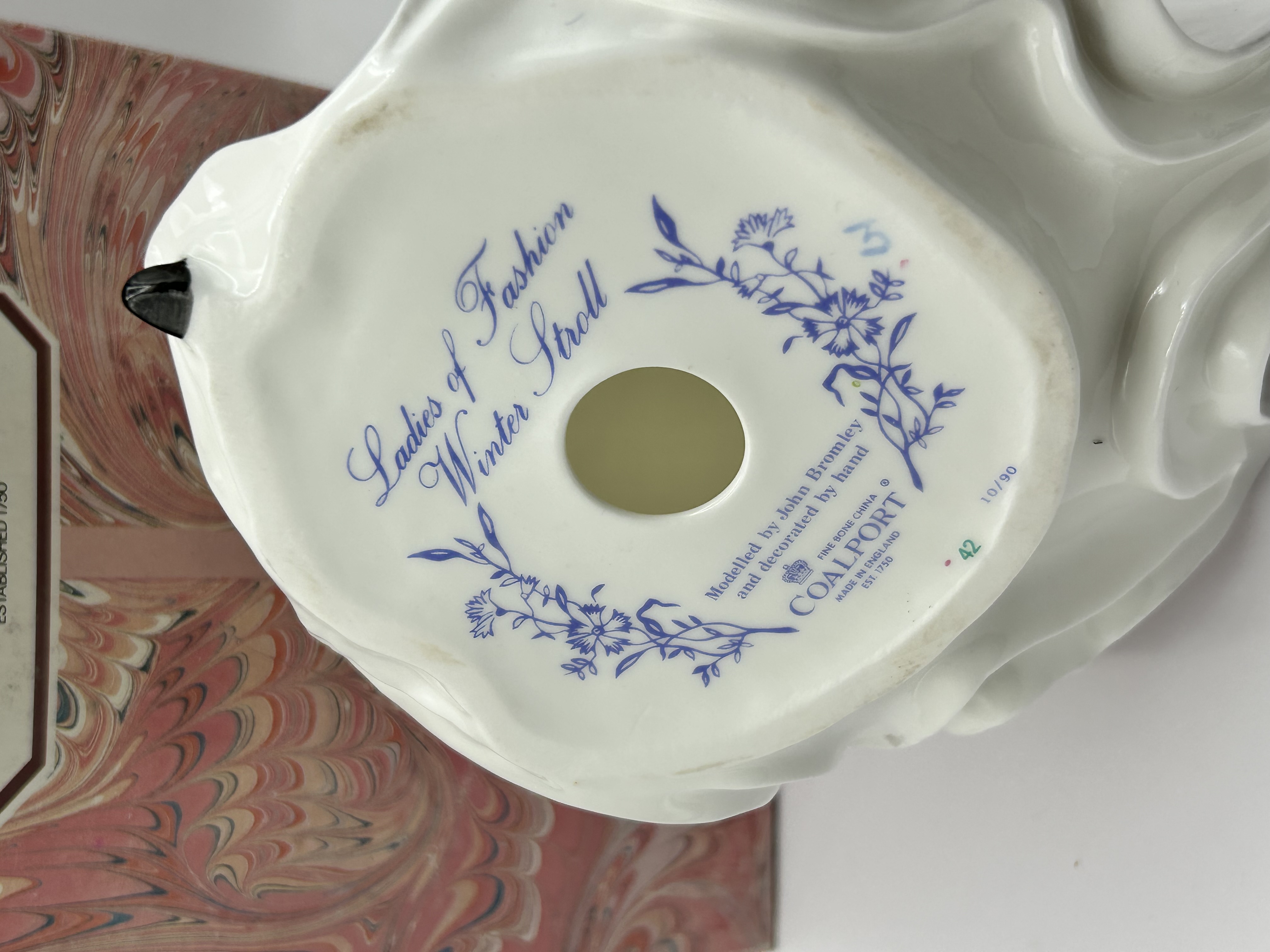 A Coalport fine bone china figurine titled Winter Stroll from the Ladies of Fashion series. This piece was modeled by John Bromley and decorated by hand. The figure is depicted in period winter attire, featuring a white gown with black-spotted trim, a deep green scarf and hat, and black gloves. The underside bears a blue printed Coalport mark, identifying the piece as fine bone china made in England, and includes the handwritten numerical markings 42 and 10/90. The item is presented with its original pink marbled box.