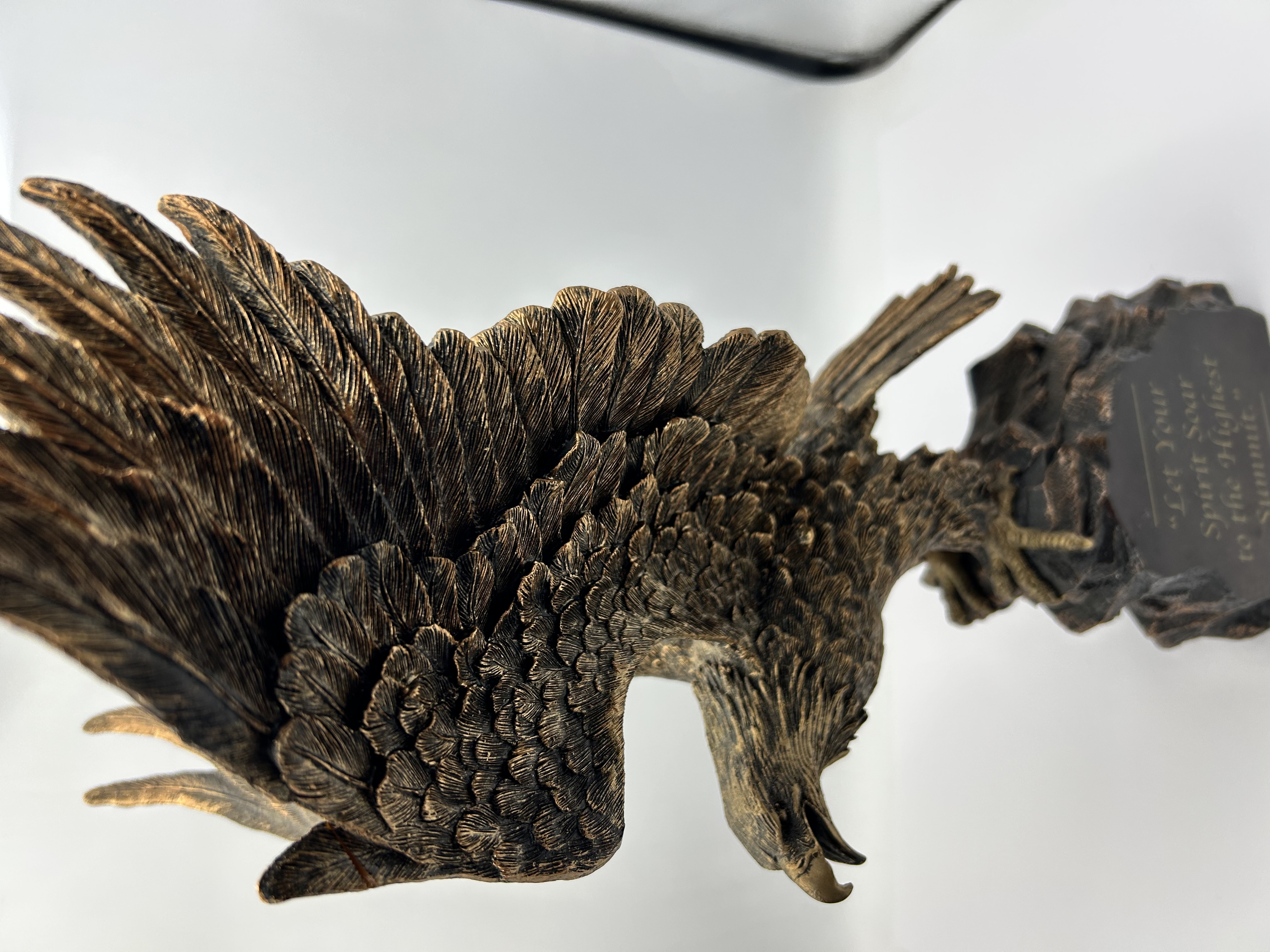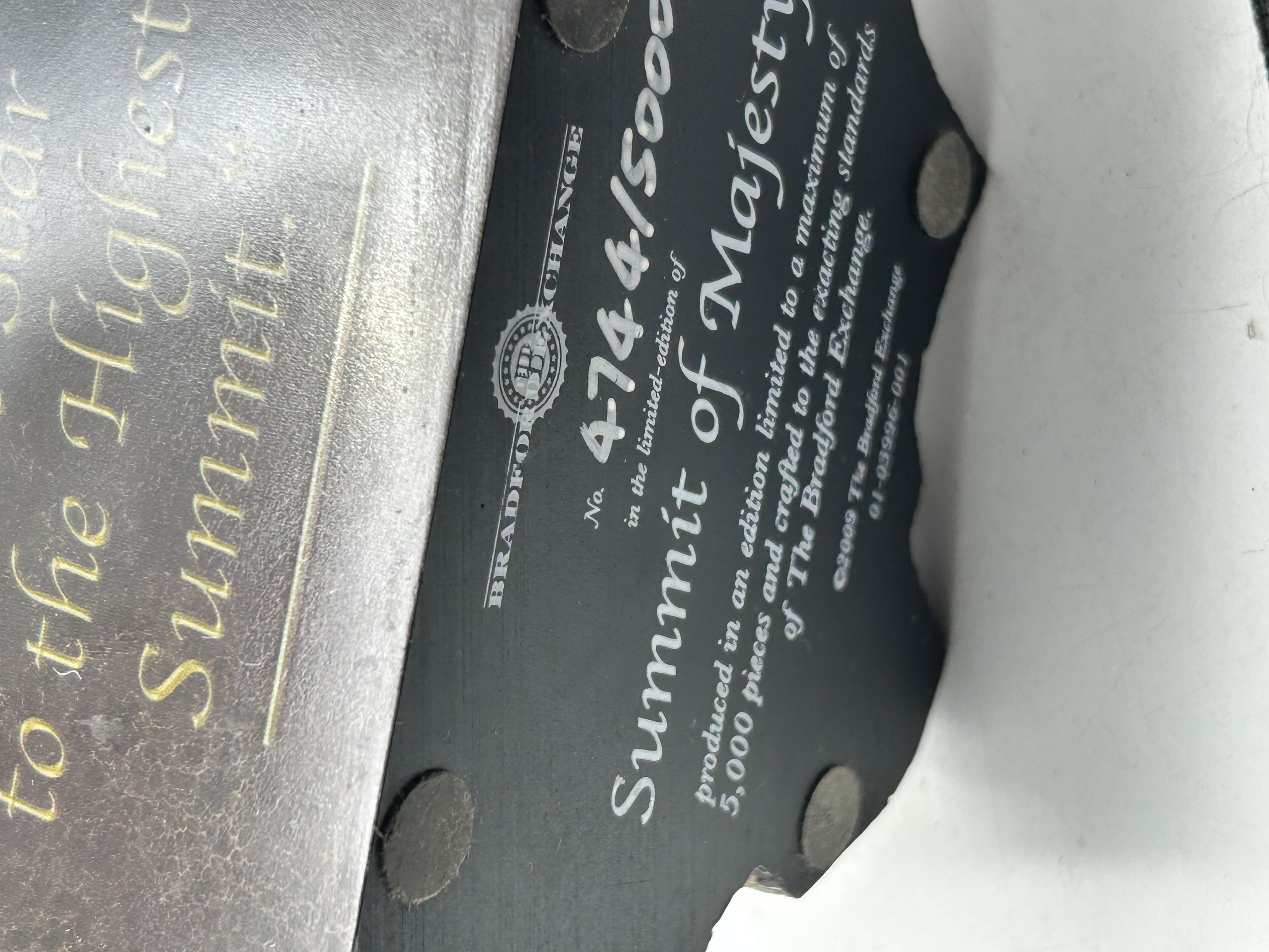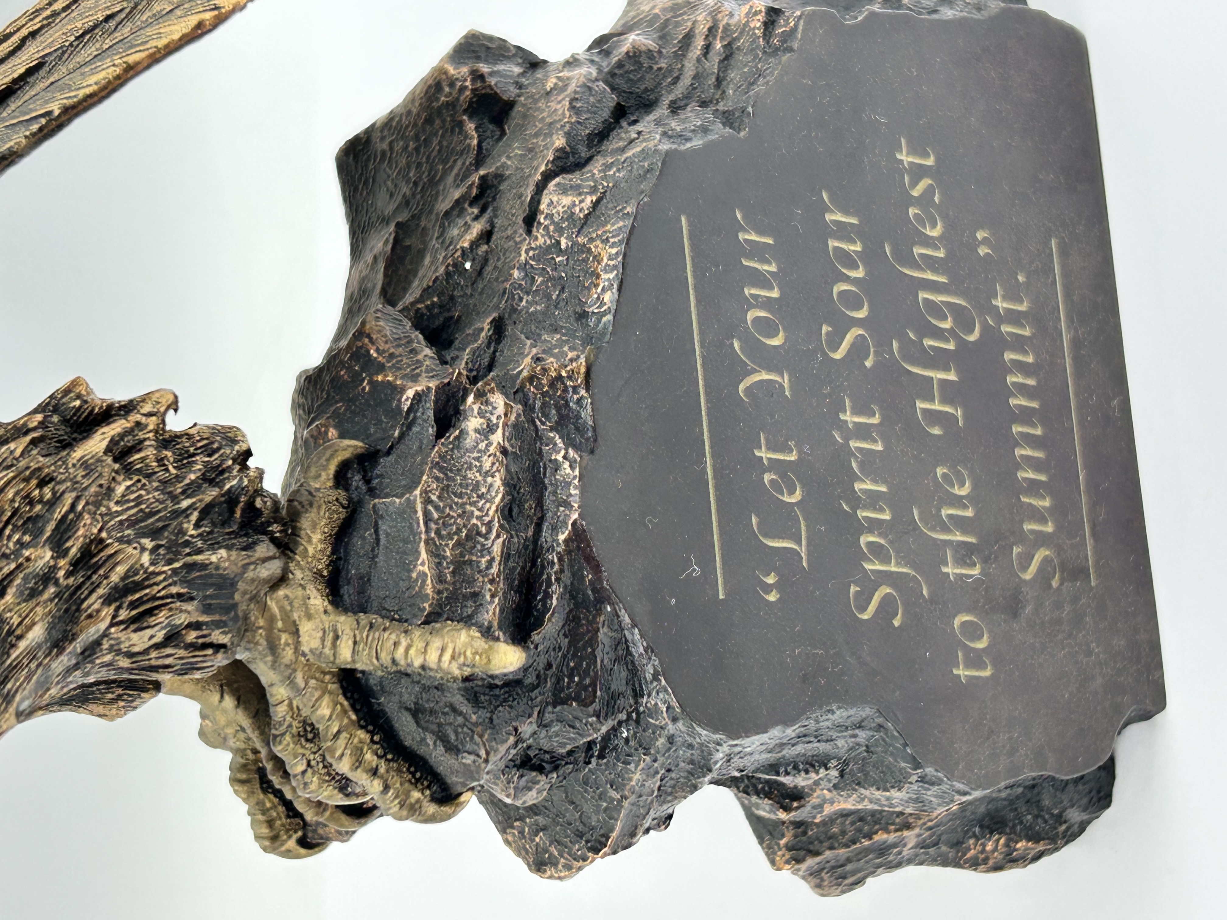 A limited edition sculpture titled Summit of Majesty, produced by The Bradford Exchange in 2009. The piece depicts an eagle with outspread wings descending toward a rocky outcrop. It is constructed of cast resin with a metallic bronze-toned finish. The side of the base is inscribed with the phrase Let Your Spirit Soar to the Highest Summit in gold-tone lettering. The underside features the official hallmark of The Bradford Exchange and identifies the item as number 4744 from a limited edition of 5,000. The base is fitted with four protective felt pads.