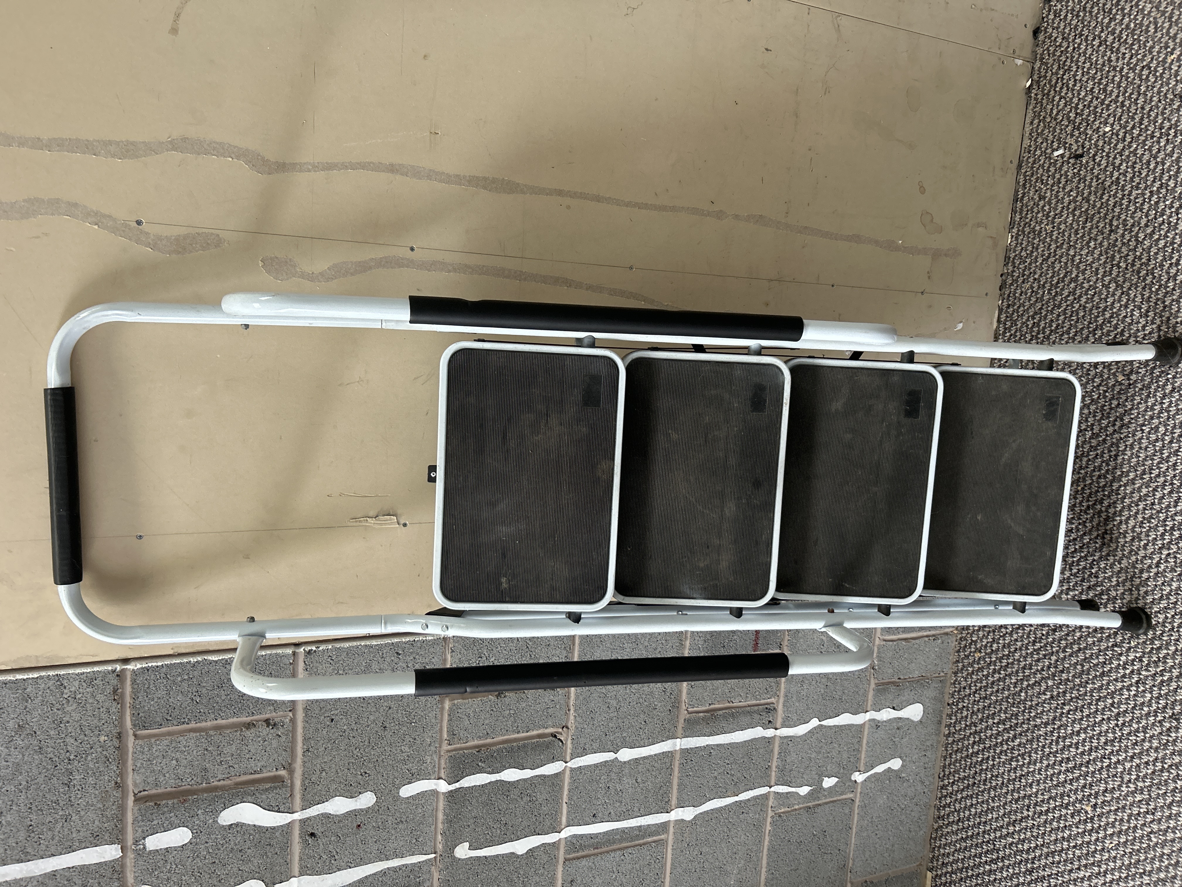 A BIG RED Torin 4-step ergonomic folding ladder featuring a white-finished tubular metal frame. The unit is designed with a high safety handrail and four wide steps, each surfaced with a black, ribbed, non-slip rubberized tread. Black foam padding is integrated along the top and side handgrips for added security and comfort during use. The ladder utilizes a folding mechanism for compact storage and transport.