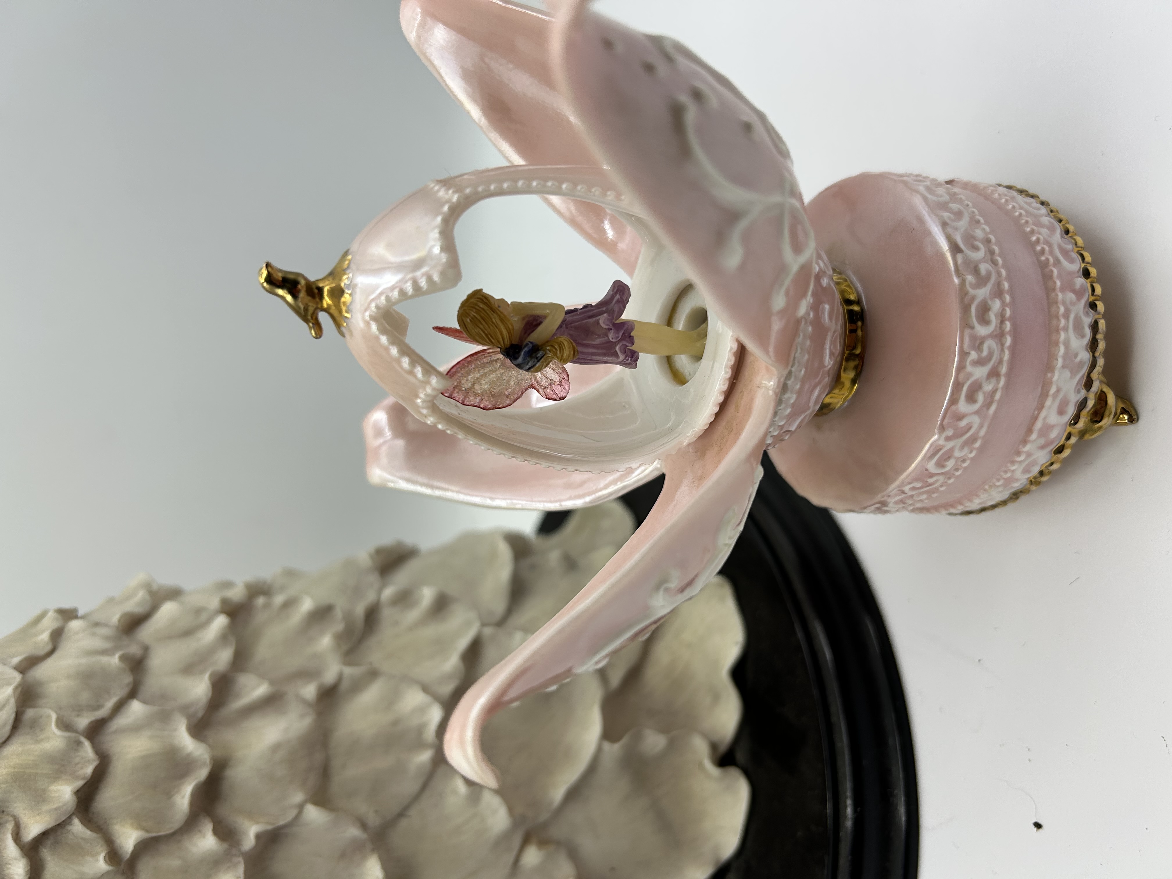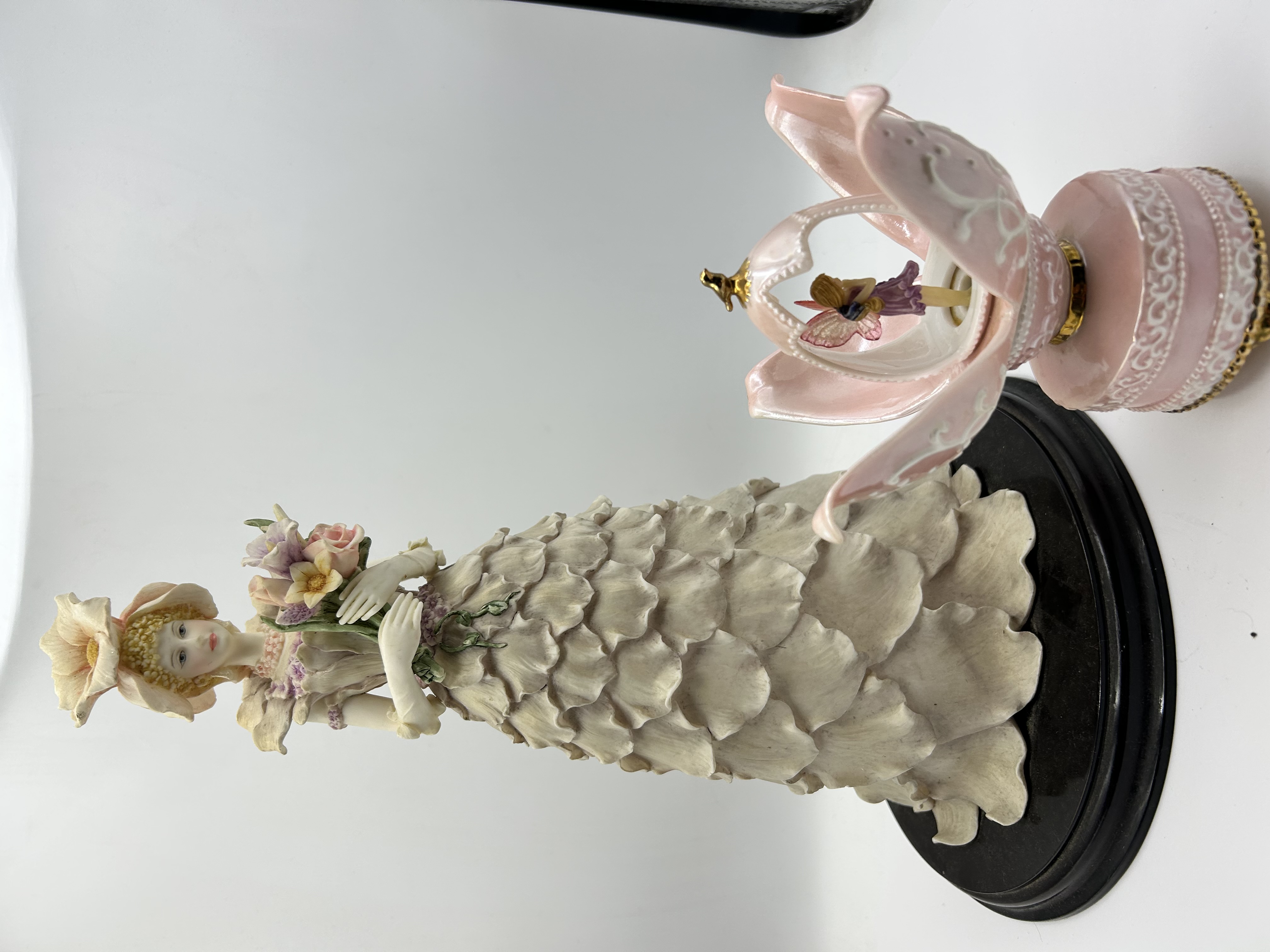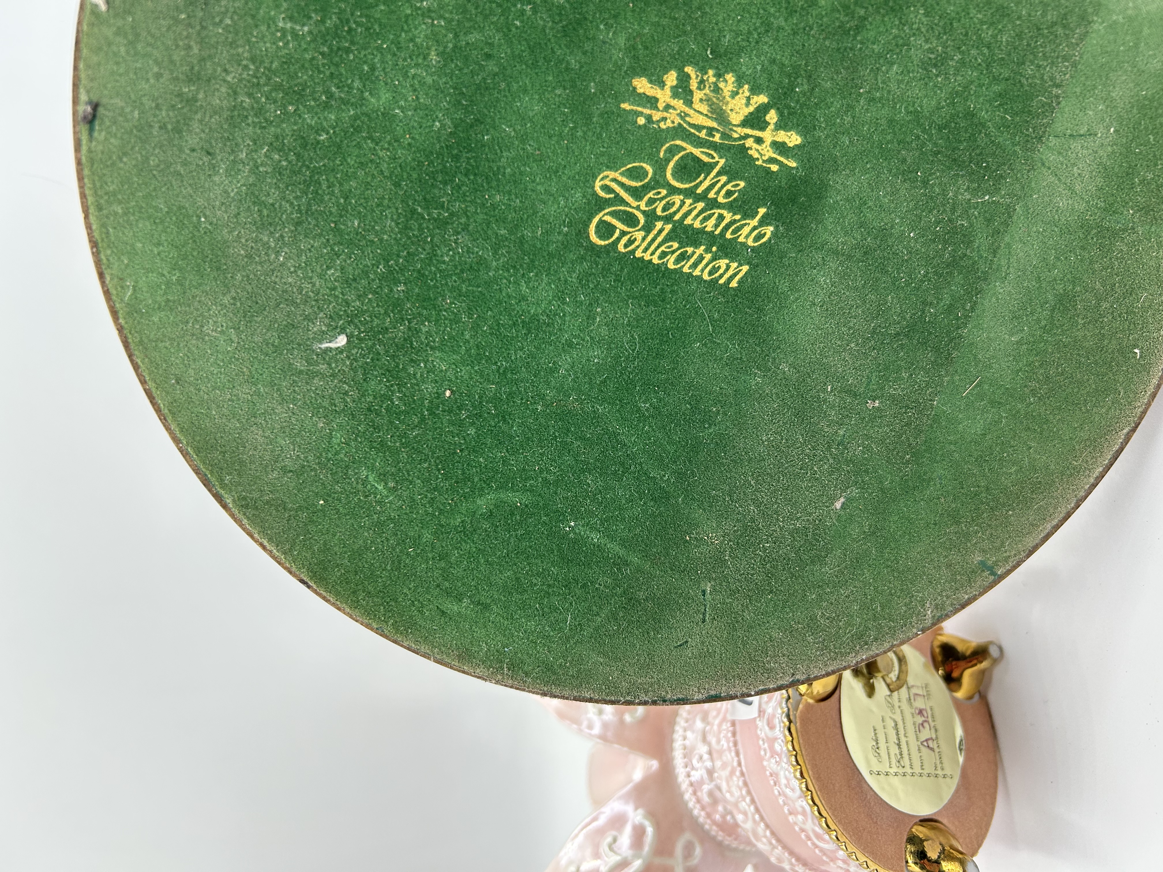 A collection of two contemporary decorative objects. The first is a tall figurine from The Leonardo Collection, as indicated by the gold-stamped mark on the green felt-lined base. The figure is depicted wearing a tiered cream-colored petal dress, a floral hat, and holding a matching bouquet. The second item is a pink flower-shaped musical box featuring a glazed finish with white scrollwork relief and gold-toned accents. The interior contains a small, winged fairy figure. A label on the base identifies the piece as an Enchanted Butterfly from Ardleigh Elliott, number A3877.