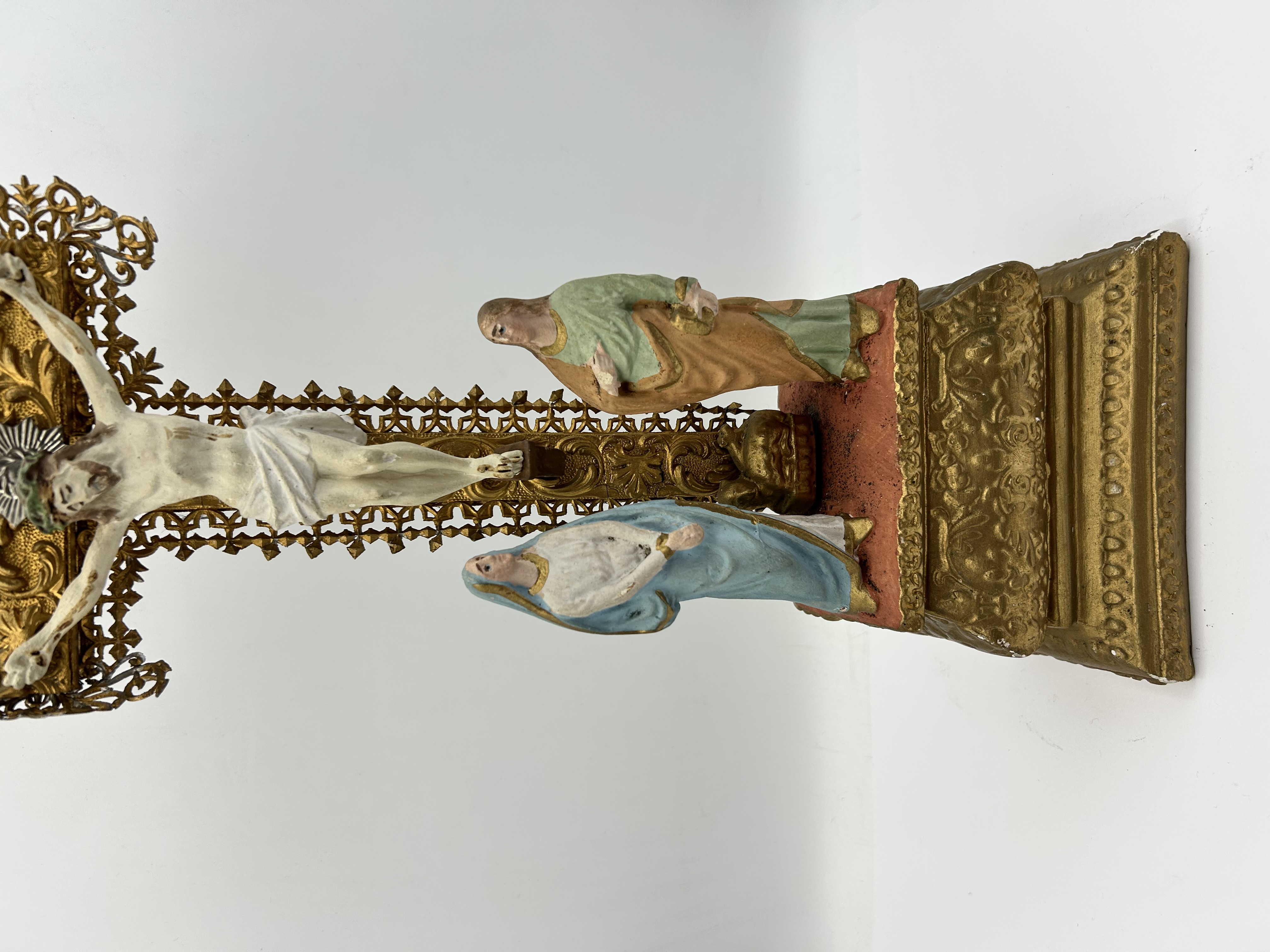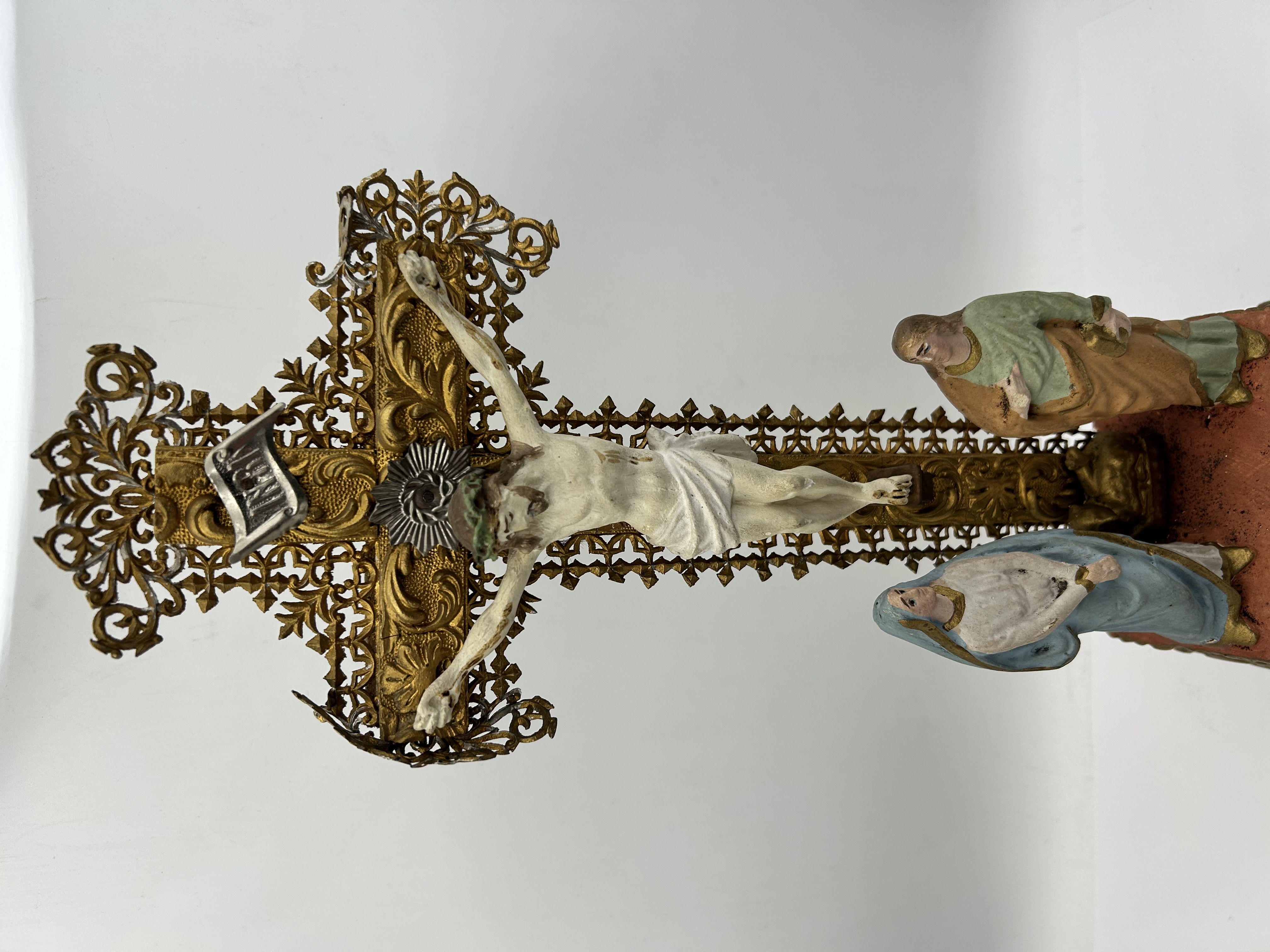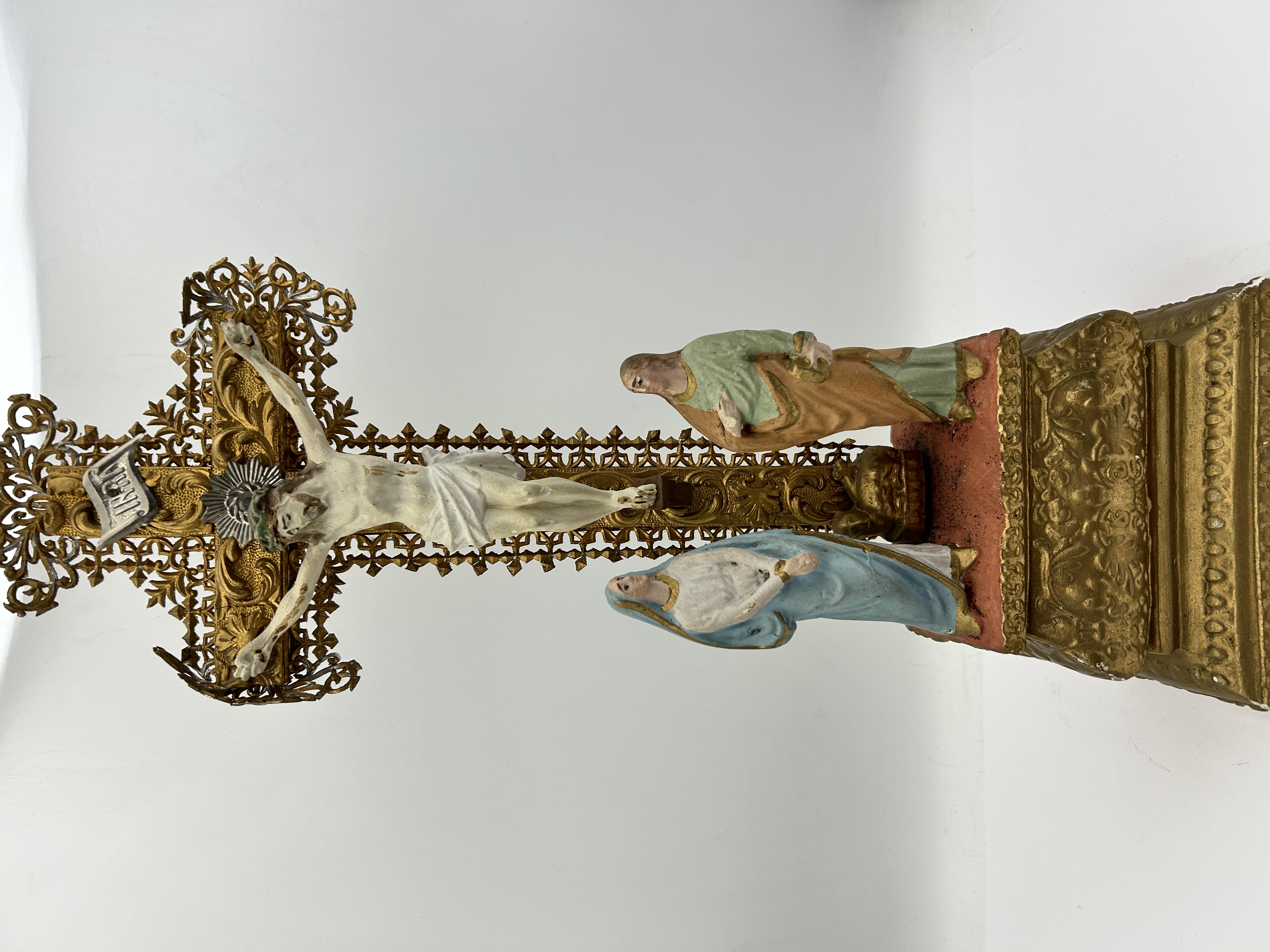 This antique French Calvary sculptural group features a central crucifix mounted on an ornate tiered pedestal. The structure is composed of gilt-finished metal, likely brass or bronze, featuring intricate openwork filigree and molded scrollwork motifs. The group includes three polychrome-painted figures crafted from plaster or a similar composition material, depicting Christ on the cross, the Virgin Mary in blue robes, and St. John the Apostle in green and peach garments. A silver-toned plaque inscribed with INRI is positioned above the central figure of Christ. The crucifix is supported by a rectangular base with matching gilt finish and decorative molding.