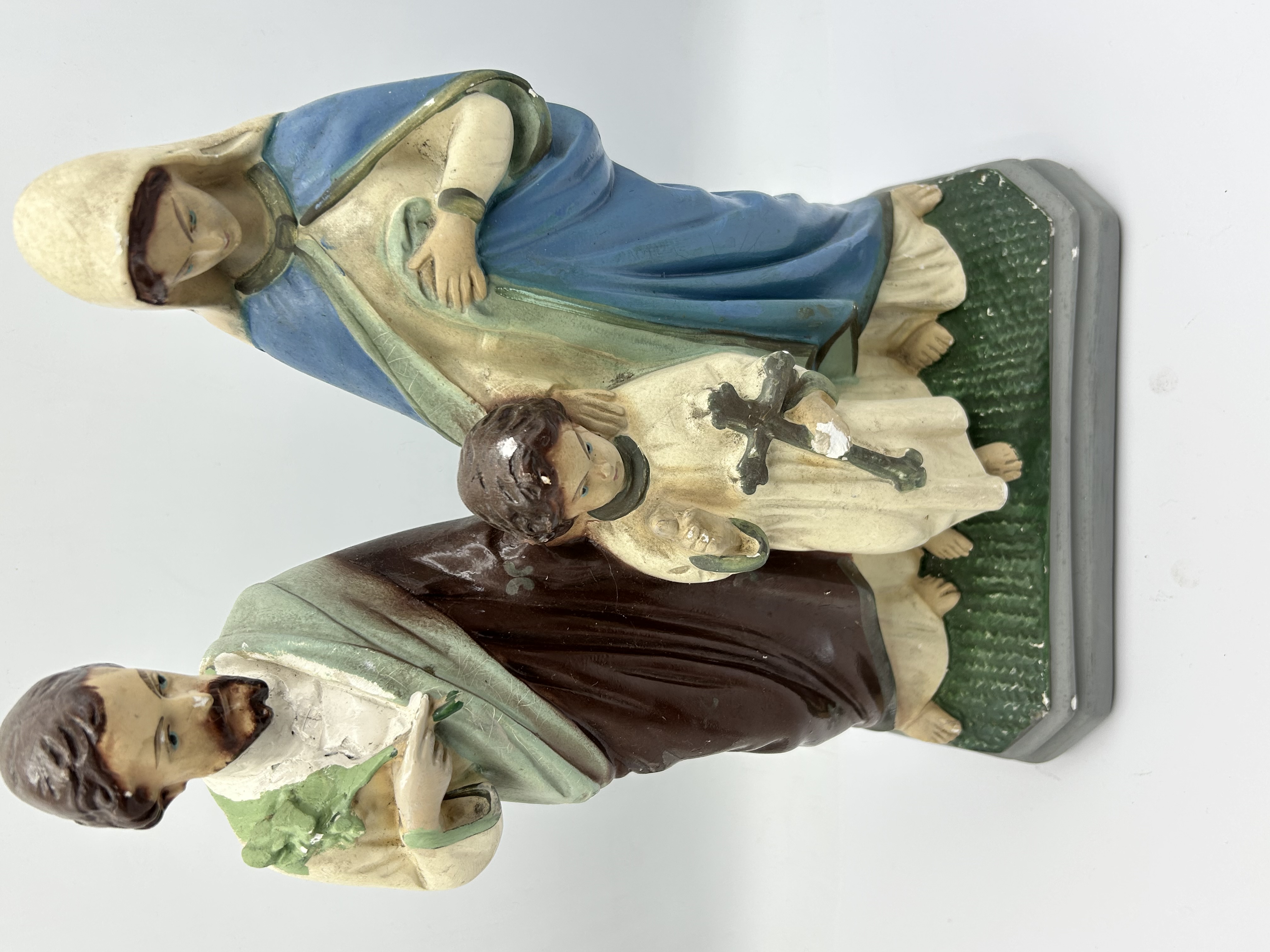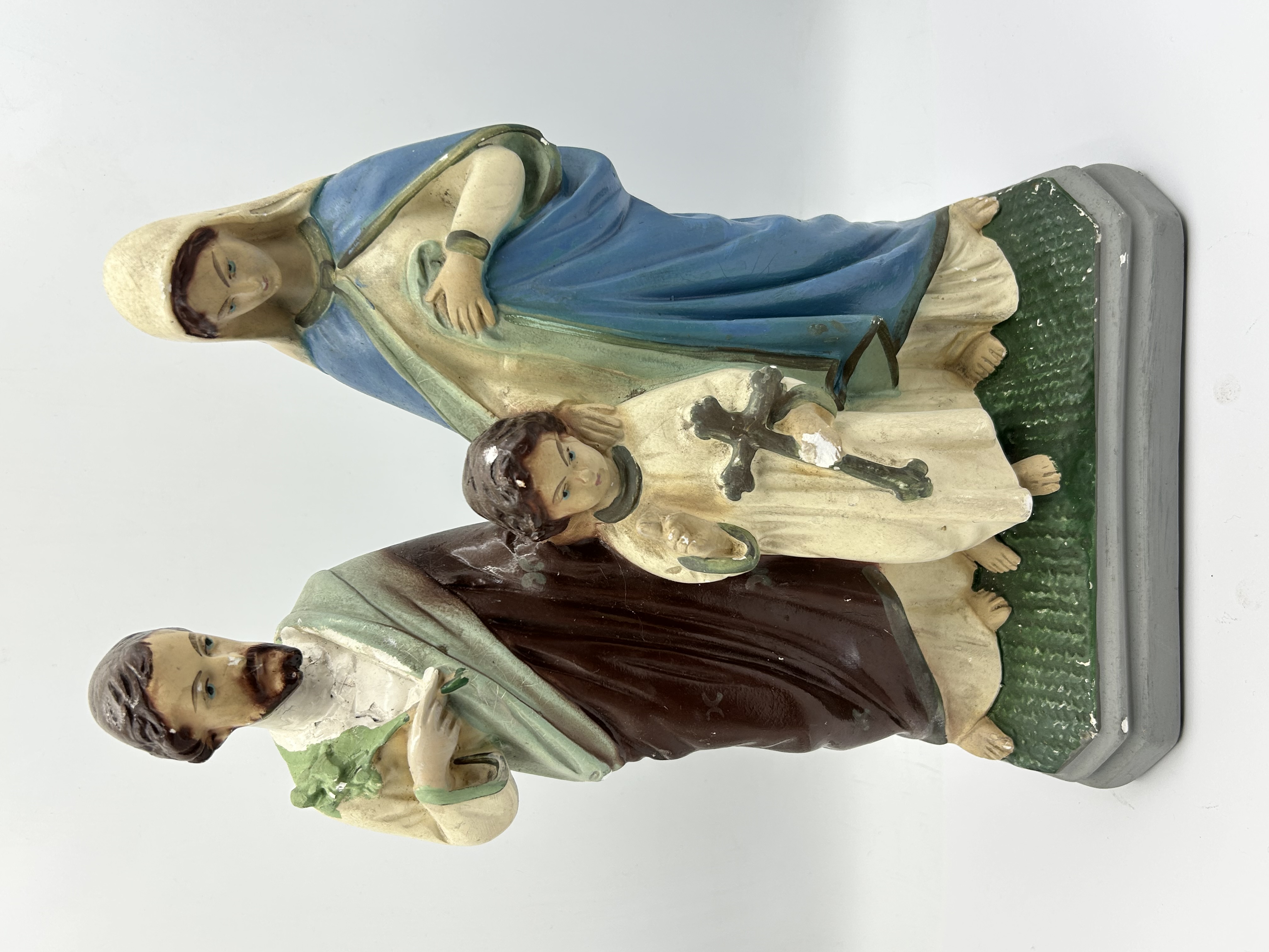 A vintage hand-painted chalkware statuette depicting the Holy Family, likely of Italian origin. The grouping features Mary in a blue cloak, Joseph in a brown robe holding a flowering staff, and the Christ Child standing centrally holding a large cross. The figures are set upon a textured green base mounted on a stepped gray pedestal. An impressed numerical marking 267 is visible on the rear edge of the base. The piece is constructed from cast plaster with a polychrome finish.