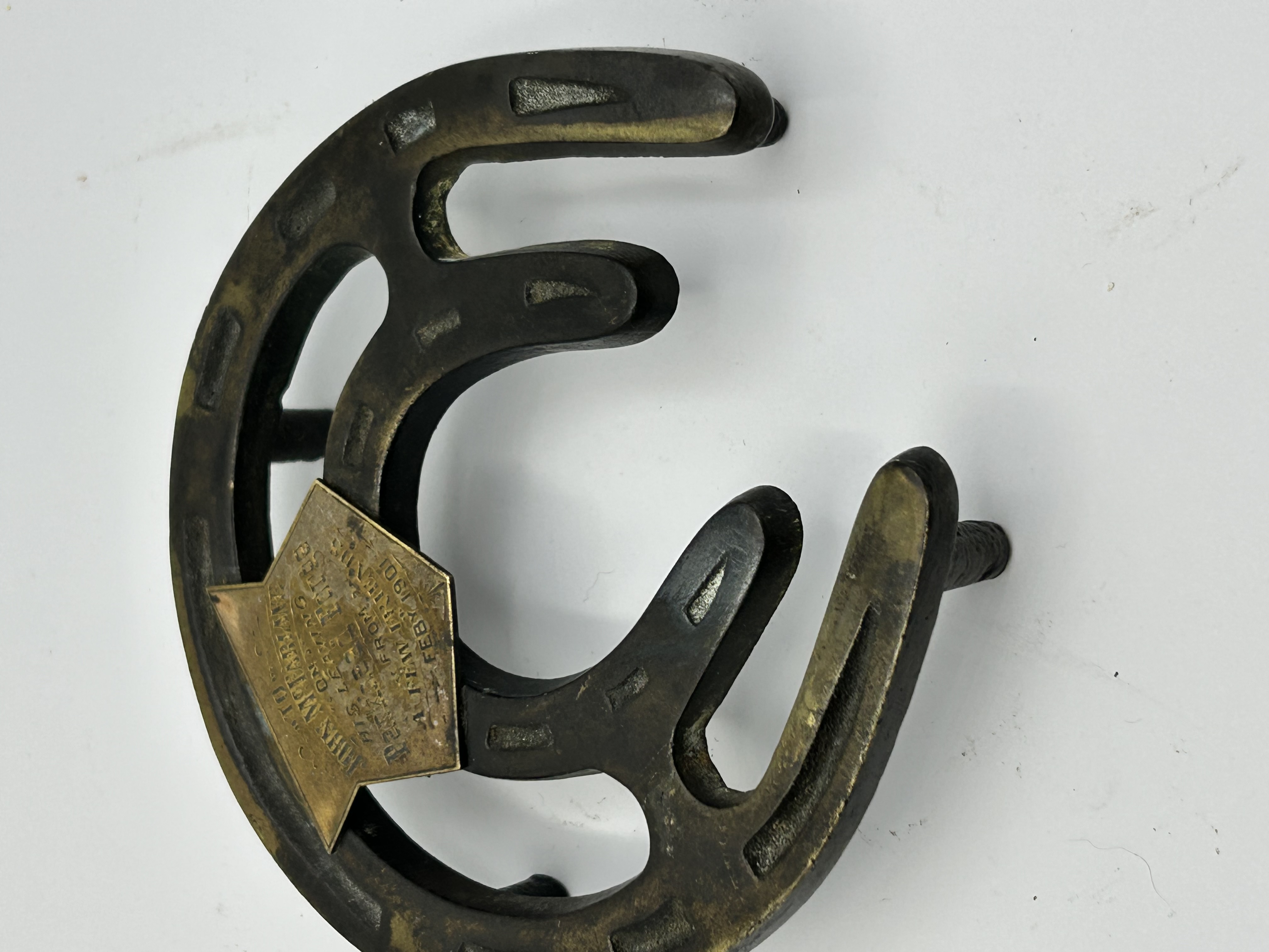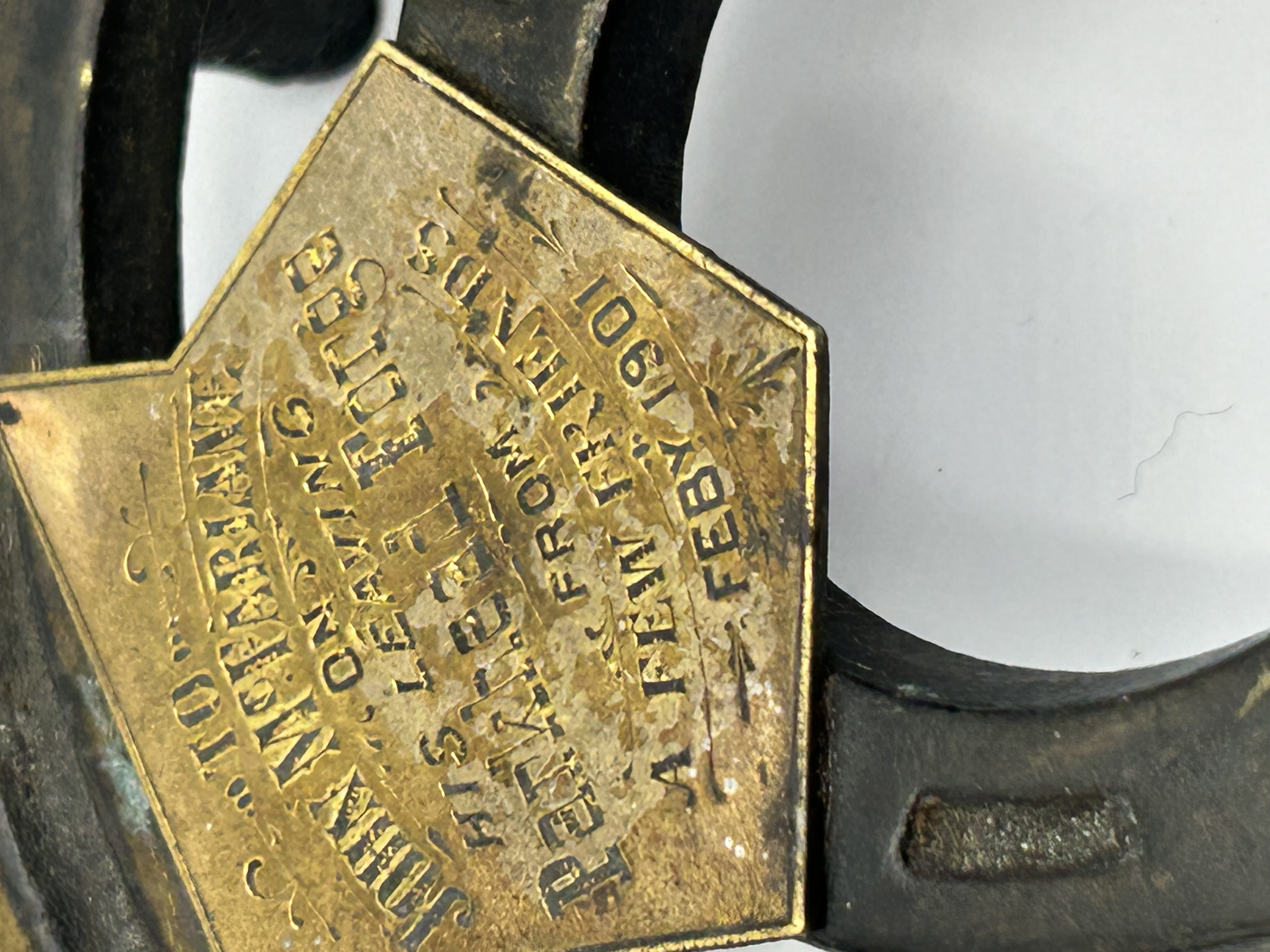 A commemorative horseshoe-shaped presentation trivet or stand cast in a dark-patinated metal. The piece is supported by three short integrated feet. It features an applied pentagonal brass presentation plaque engraved with decorative lettering. The inscription reads TO JOHN MCFARLANE ON HIS LEAVING POTTS & LEITCH FROM A FEW FRIENDS FEBY 1901. The object is constructed of a cast metal frame with a separate brass plate attachment.