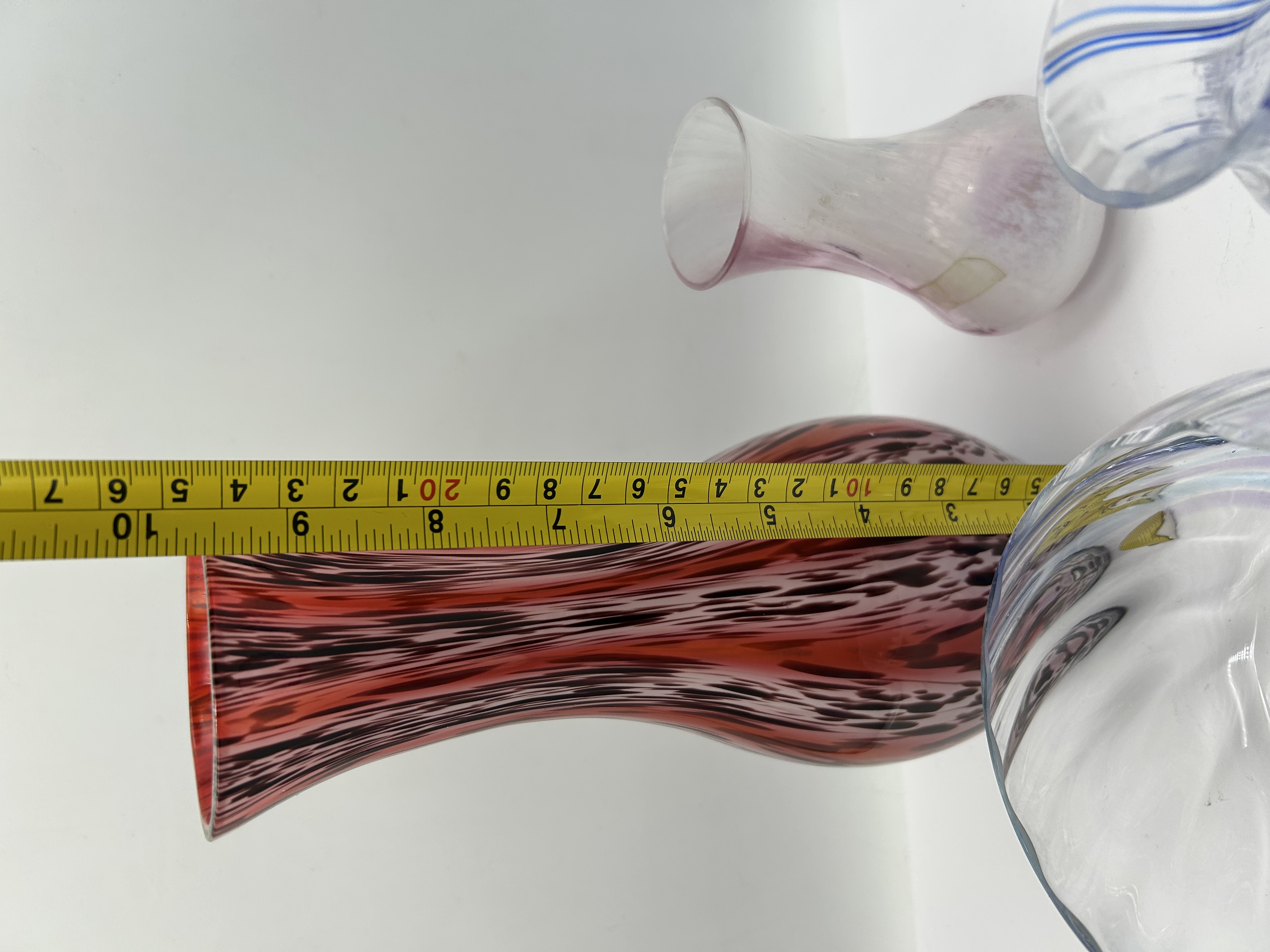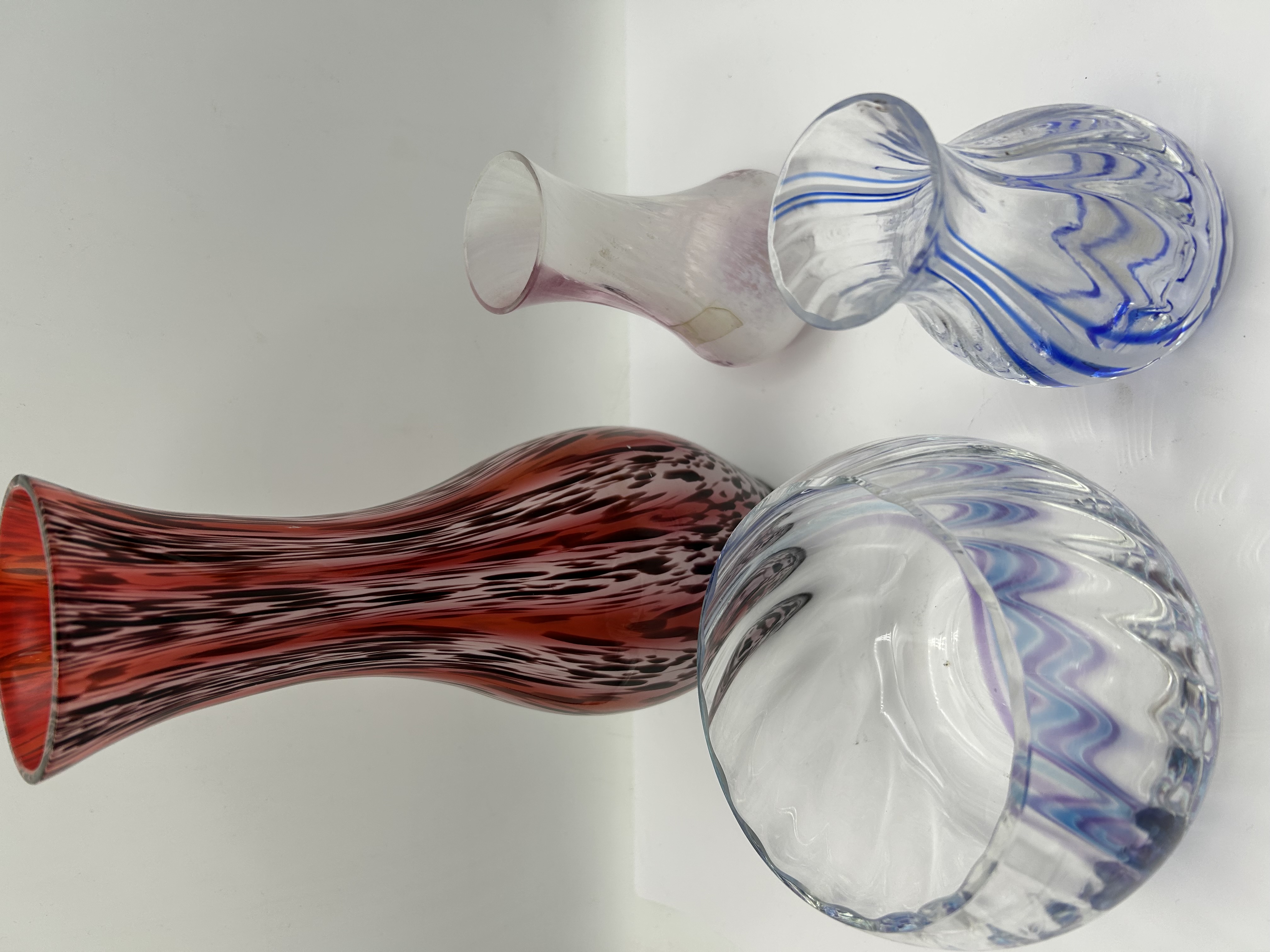 A collection of decorative art glass items featuring various forms and patterns. The group includes a tall, slender vase with a red and black speckled, pulled pattern and a flared rim. Also present is a low, clear glass bowl with a ribbed exterior and internal blue and purple combed zigzag motifs. The collection further includes a clear glass vase with blue linear accents and a ribbed body, and a smaller vase with an opaque, mottled white and pink finish and a flared rim. No maker marks or signatures are visible on the pieces.
