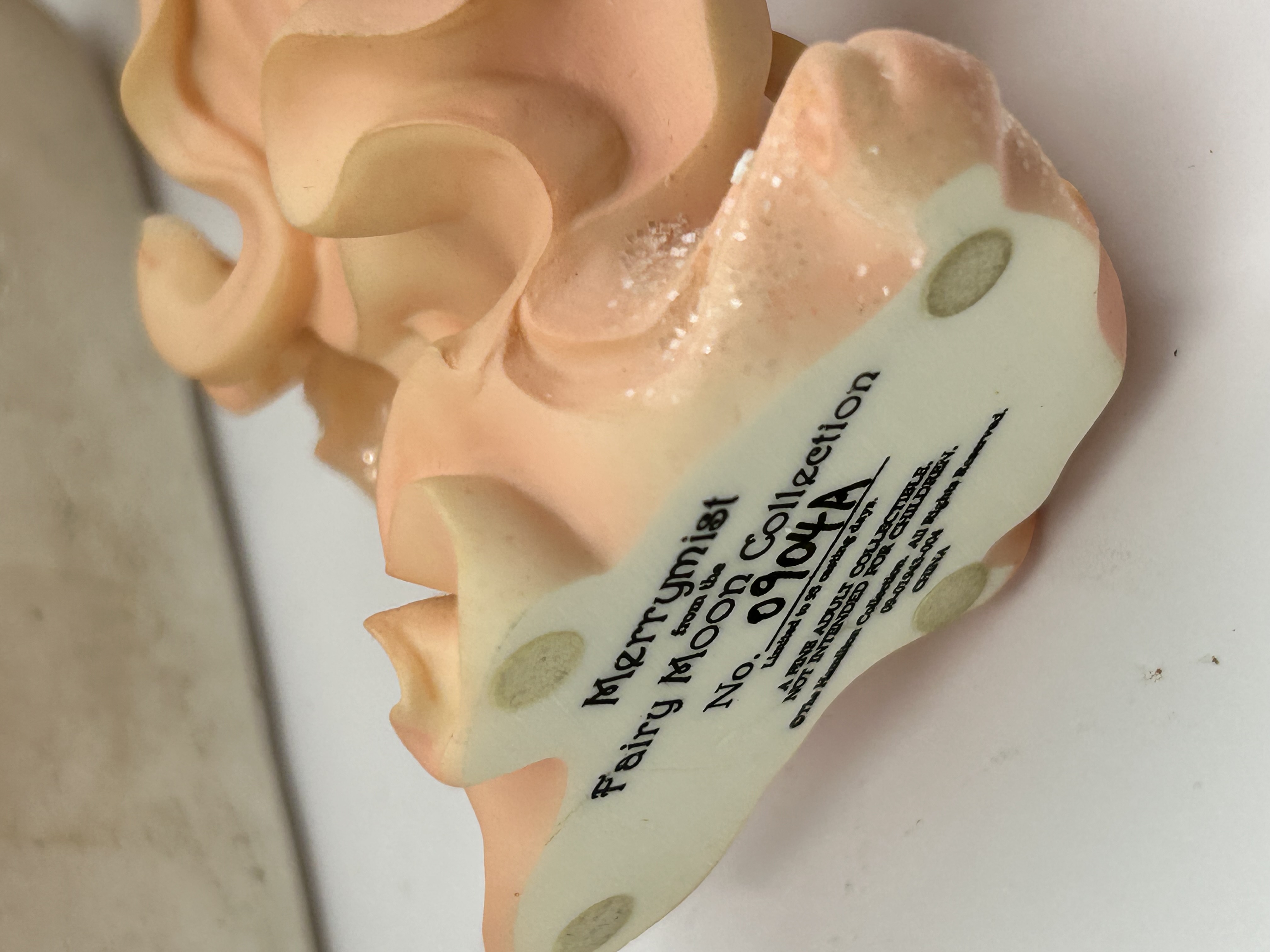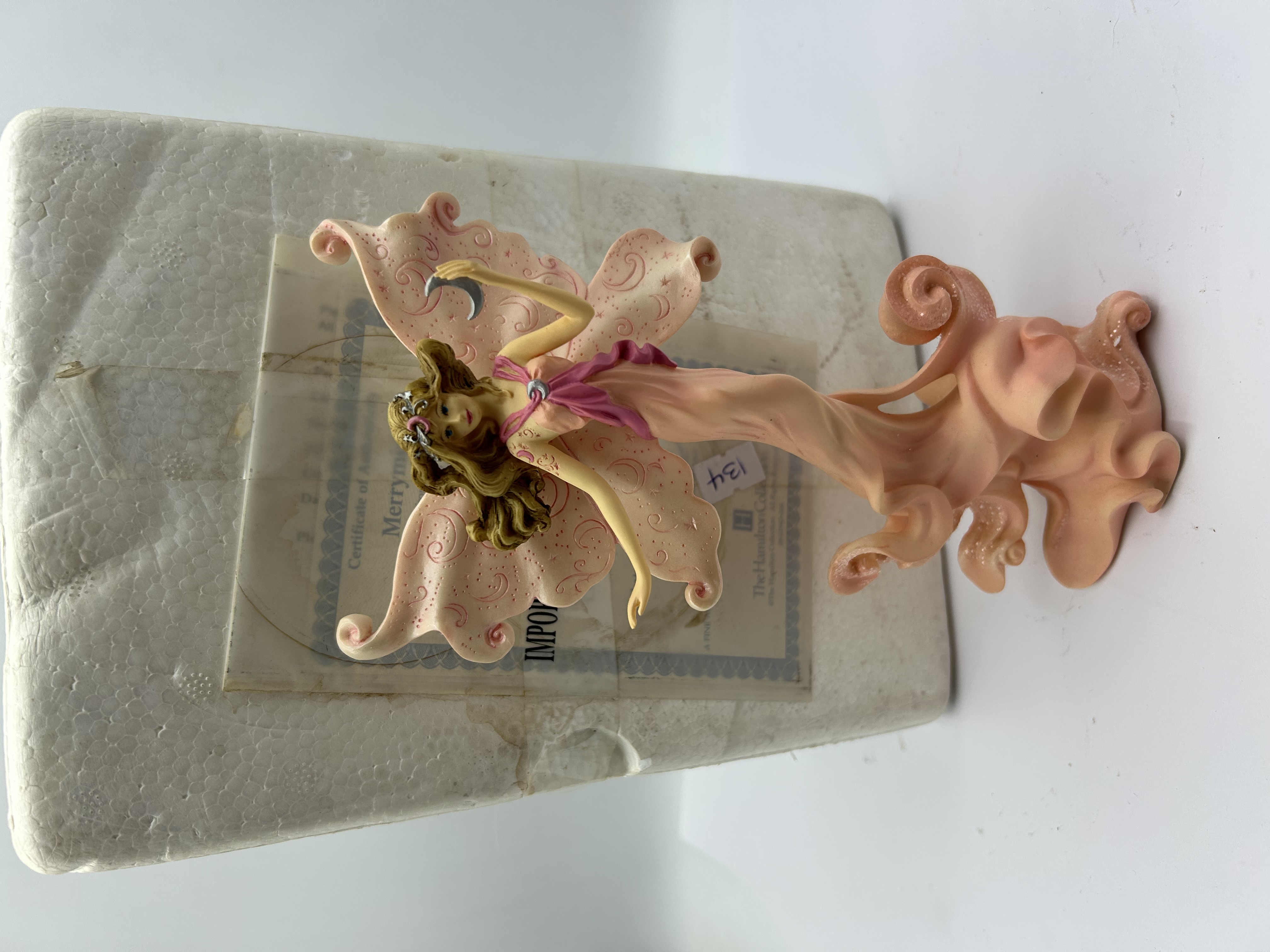 A cast resin figurine titled Merrymist from the Fairy Moon Collection by The Hamilton Collection. The figure is depicted in a flowing peachy-pink gown with large wings featuring scrolled tips and celestial star and moon patterns. The fairy wears a tiara and holds a small crescent moon accessory. The underside of the base is marked No. 0904A and notes its status as a limited edition produced over 95 casting days. The base includes the manufacturer mark and a Made in China designation. This lot is accompanied by its original styrofoam protective packaging and a Certificate of Authenticity.