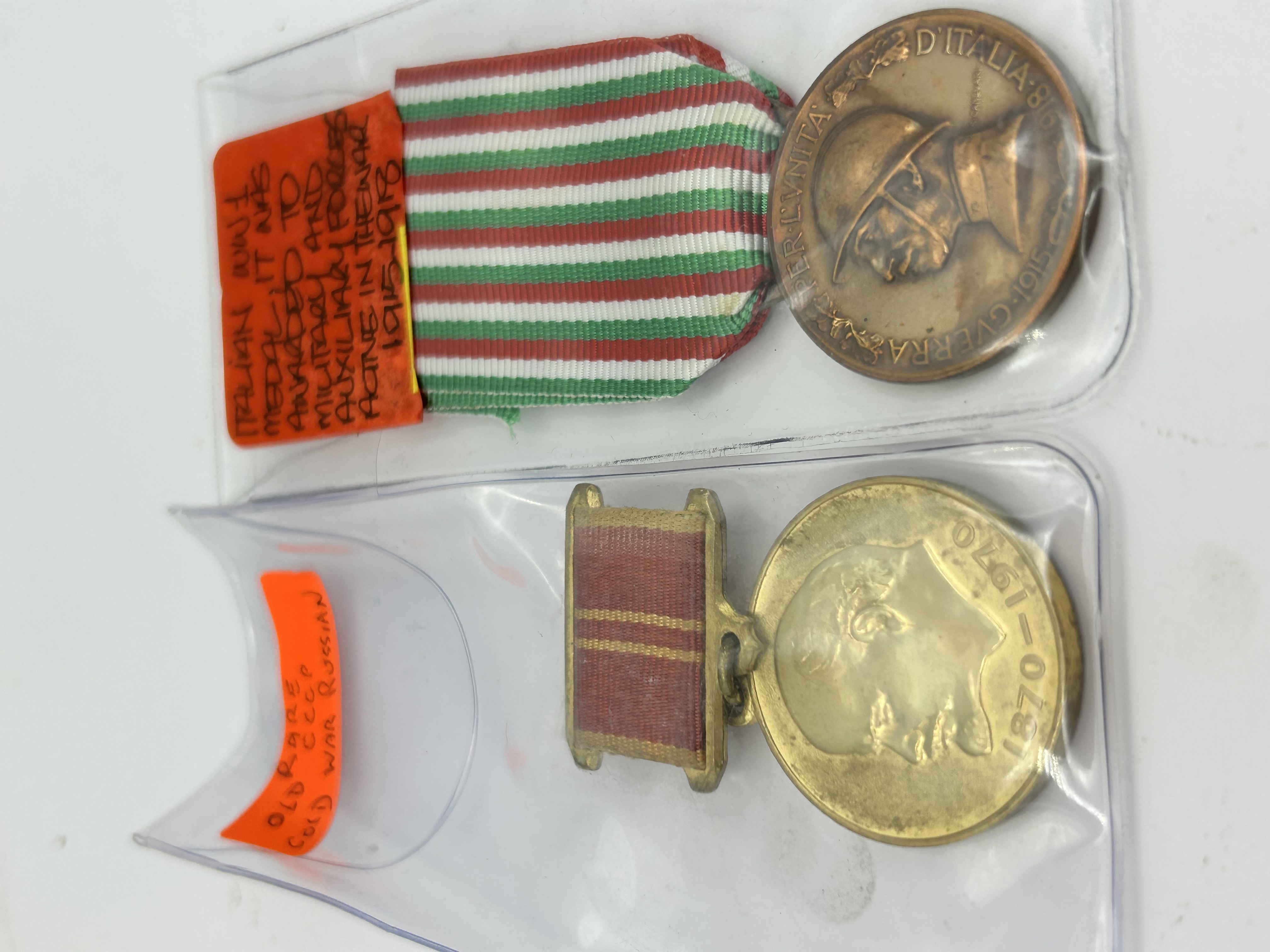 This lot consists of two commemorative military and jubilee medals. The first is an Italian WWI Commemorative Medal for the Italo-Austrian War 1915-1918, also known as the Medal for the Unity of Italy. Struck in bronze, the obverse features the profile of King Victor Emmanuel III in a military helmet, encircled by the inscription GUERRA PER LUNITA DITALIA 1915-1918. It is suspended from a fabric ribbon with vertical stripes of green, white, and red. The second item is a Soviet Jubilee Medal marking the 100th anniversary of the birth of Vladimir Lenin (1870-1970). The obverse displays a relief profile of Lenin with the dates 1870-1970. This medal is attached to a rectangular brass suspension bar wrapped in a red fabric ribbon with yellow stripes. Both items are presented in clear plastic protective sleeves with orange adhesive identification labels.