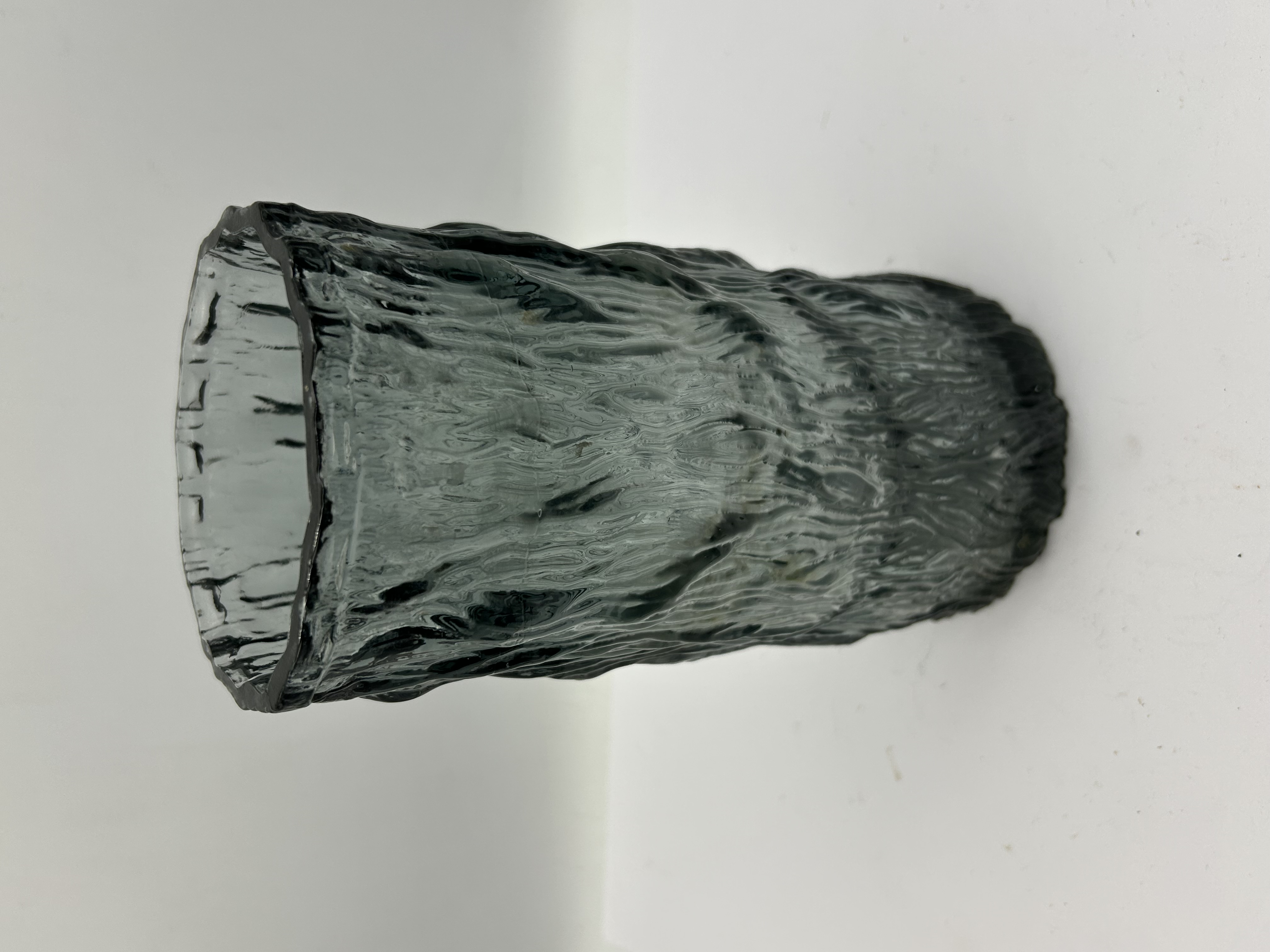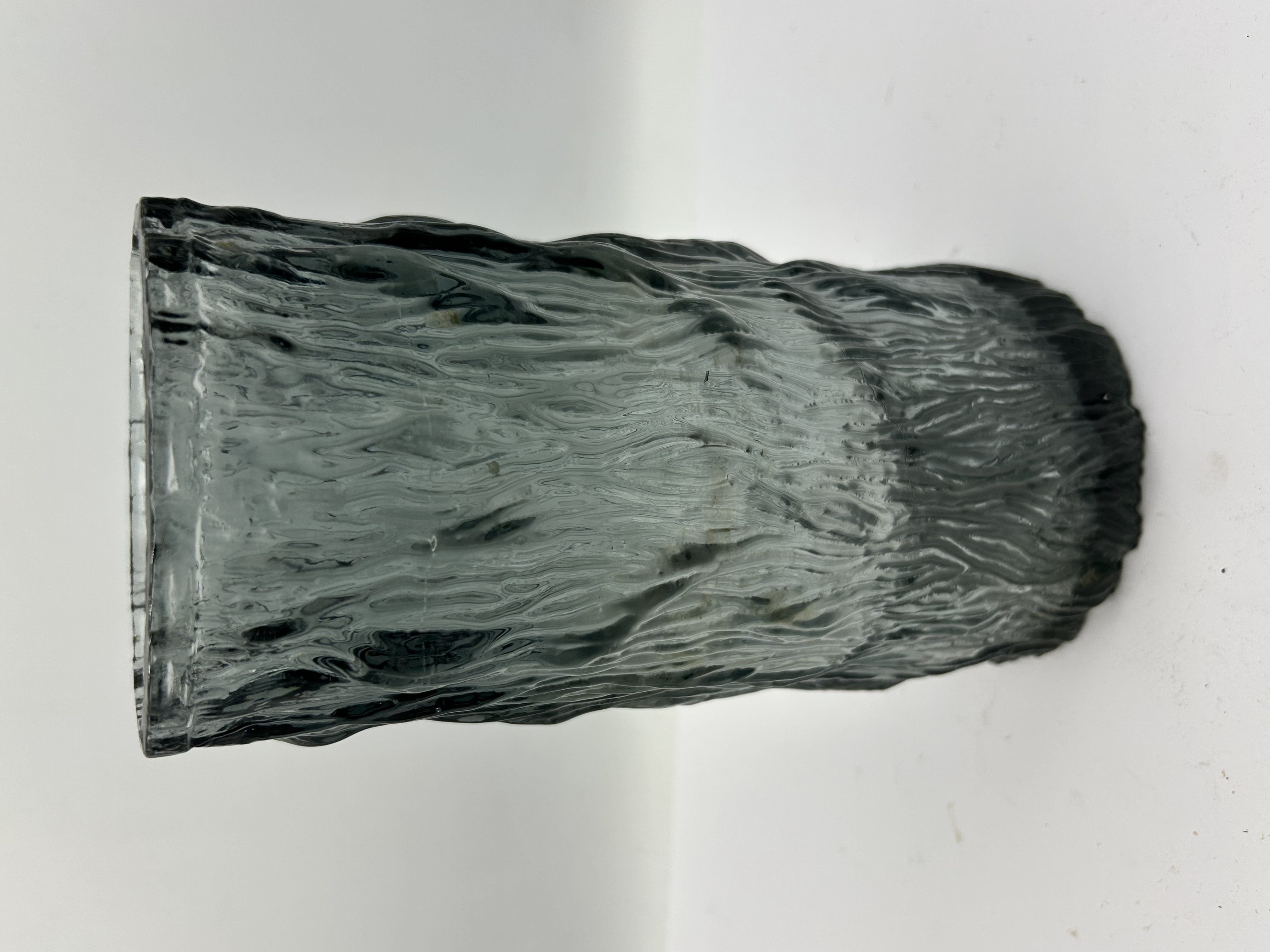 A cylindrical art glass vessel in the Mid-Century Modern style. The body is composed of transparent gray-tinted glass with a deeply molded exterior texture resembling natural tree bark or undulating waves. The vessel features an irregular rim that follows the contours of the external pattern. No maker marks or signatures are visible.