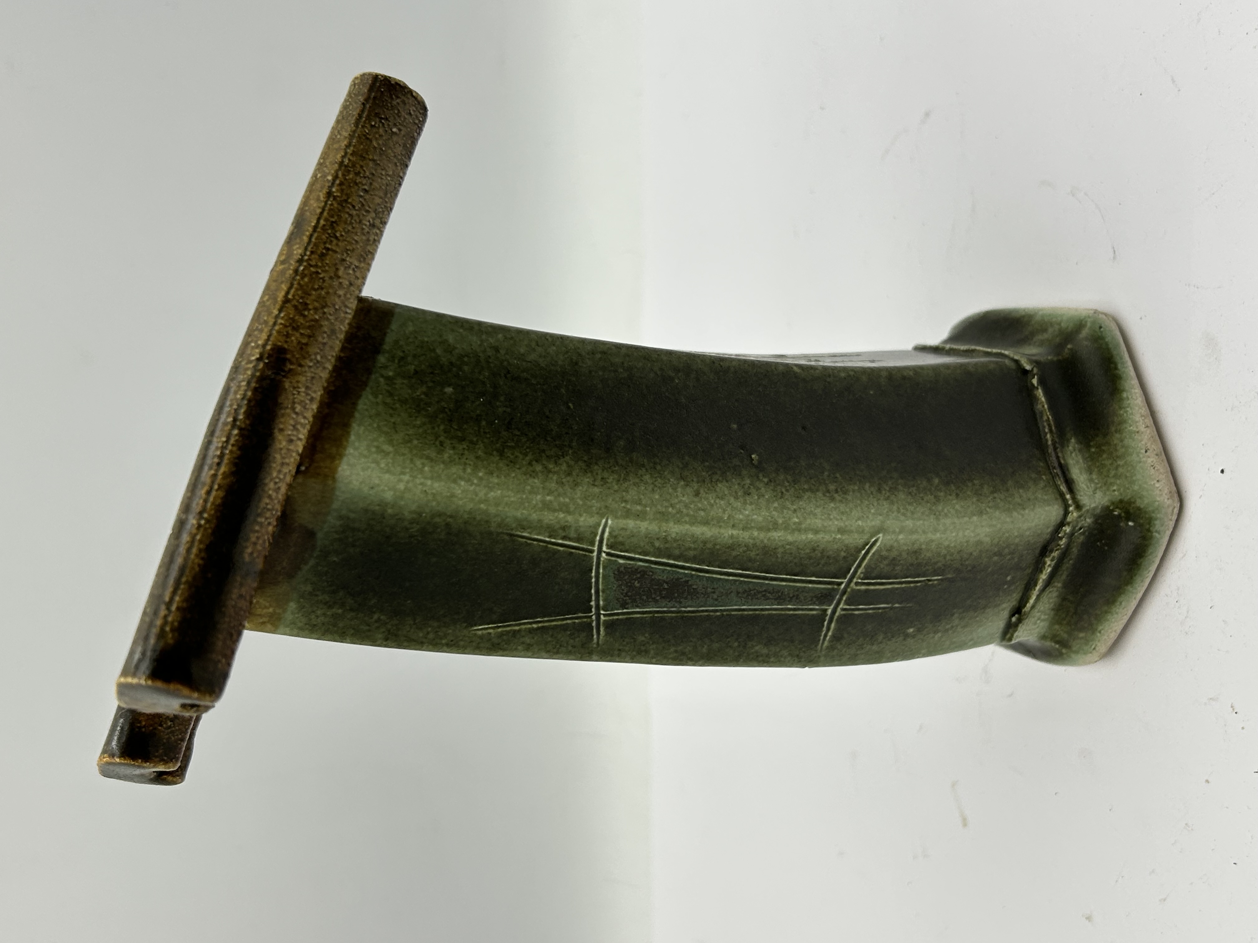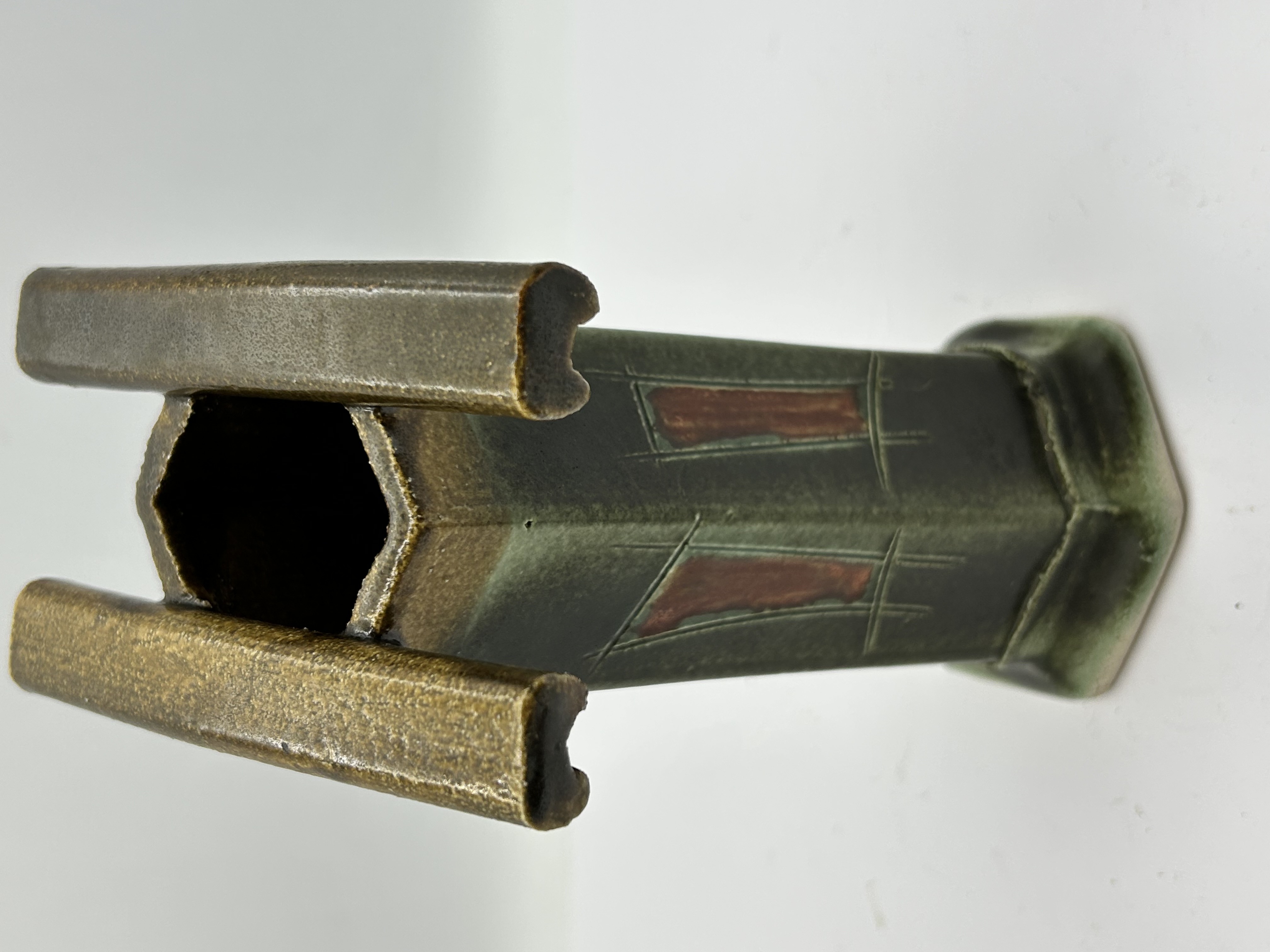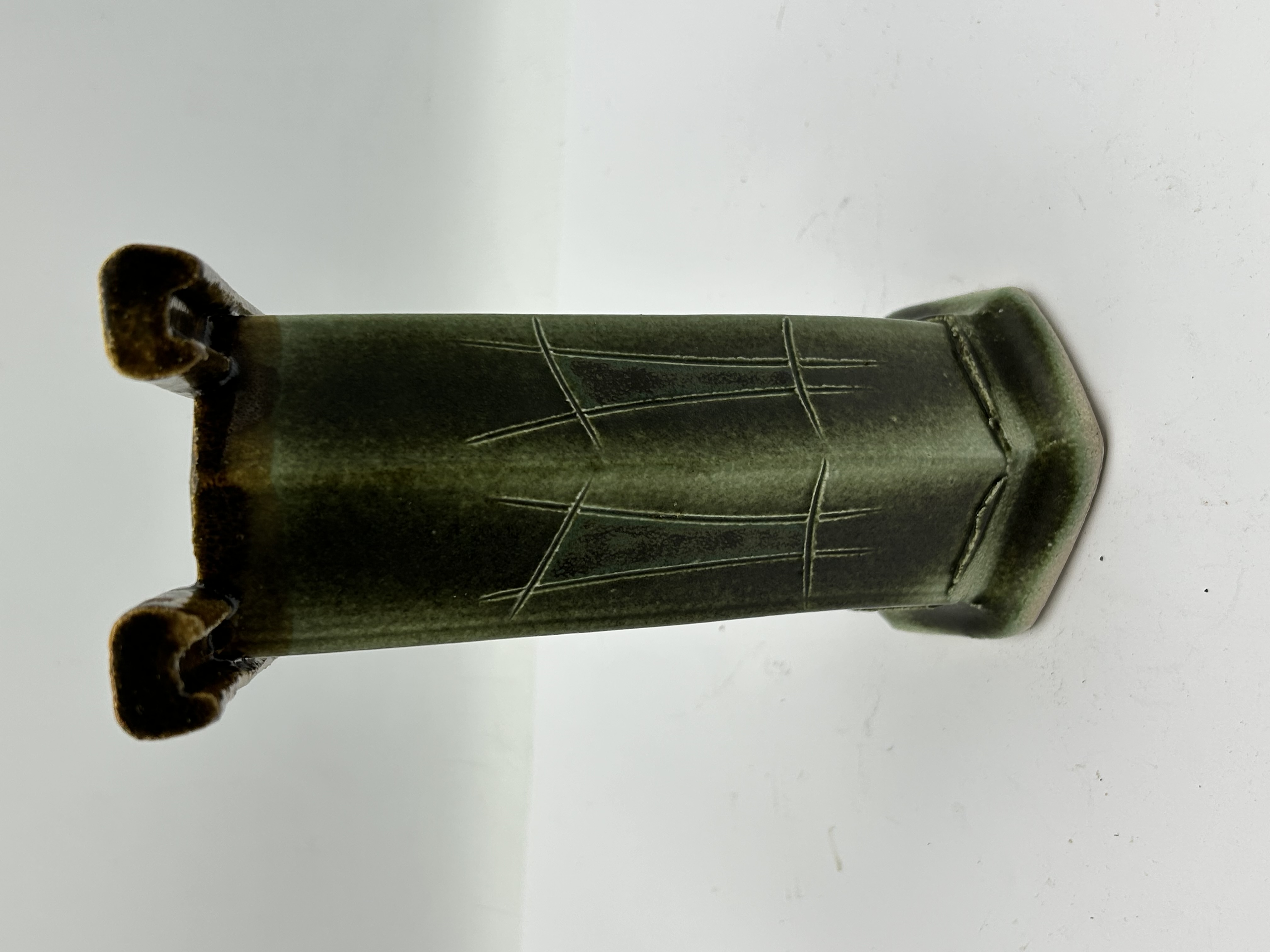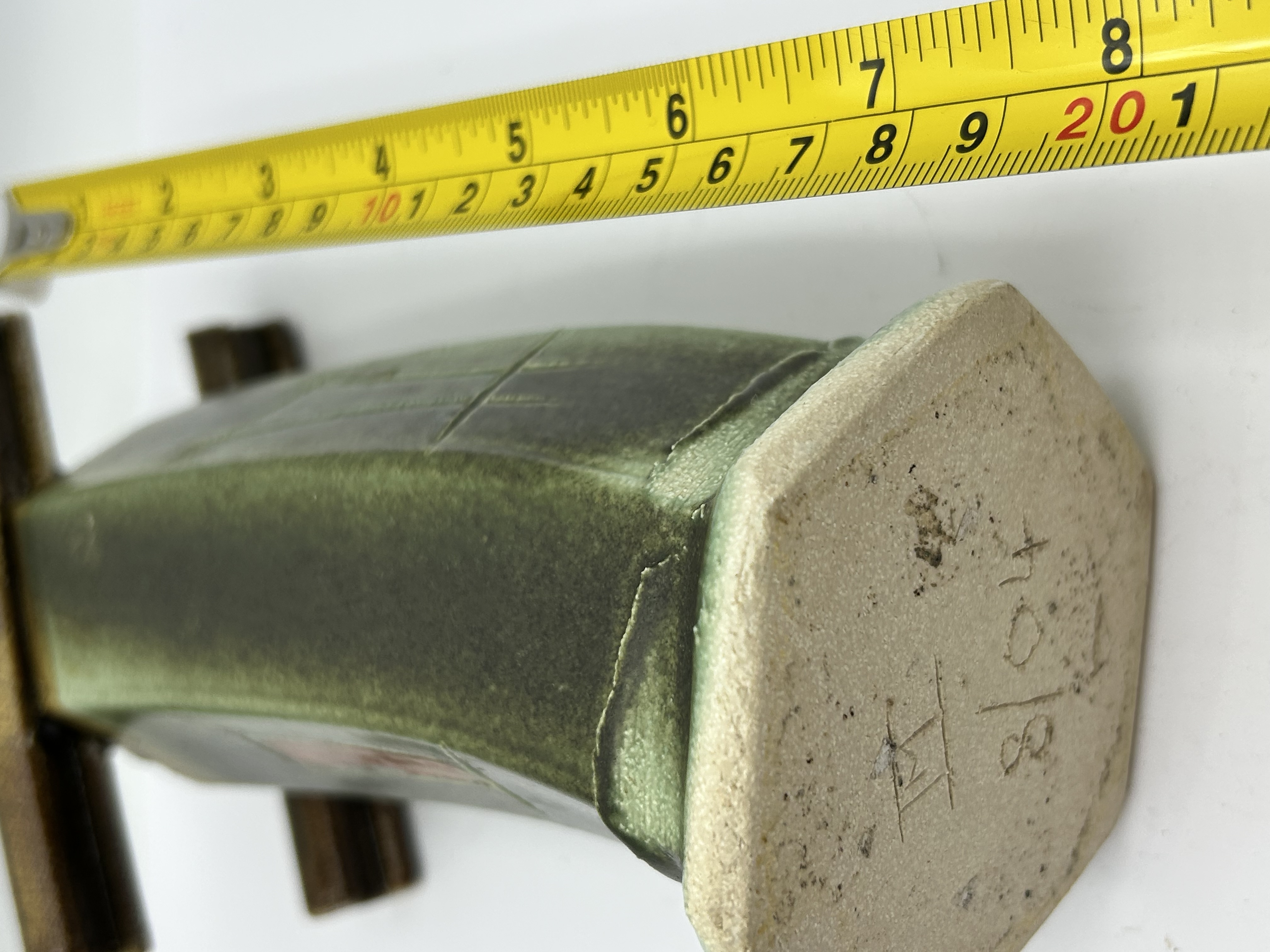 This studio pottery ceramic vase features a tapering hexagonal form with a flared base and two horizontal bar-style handles at the rim. The vessel is finished in a mottled dark green matte glaze, with bronze-toned accents on the upper handles. The side panels are decorated with incised abstract geometric designs, some of which frame rectangular fields of reddish-brown slip. The unglazed underside bears an incised potter’s mark consisting of a stylized H and M, alongside the numeric notations 40/8.