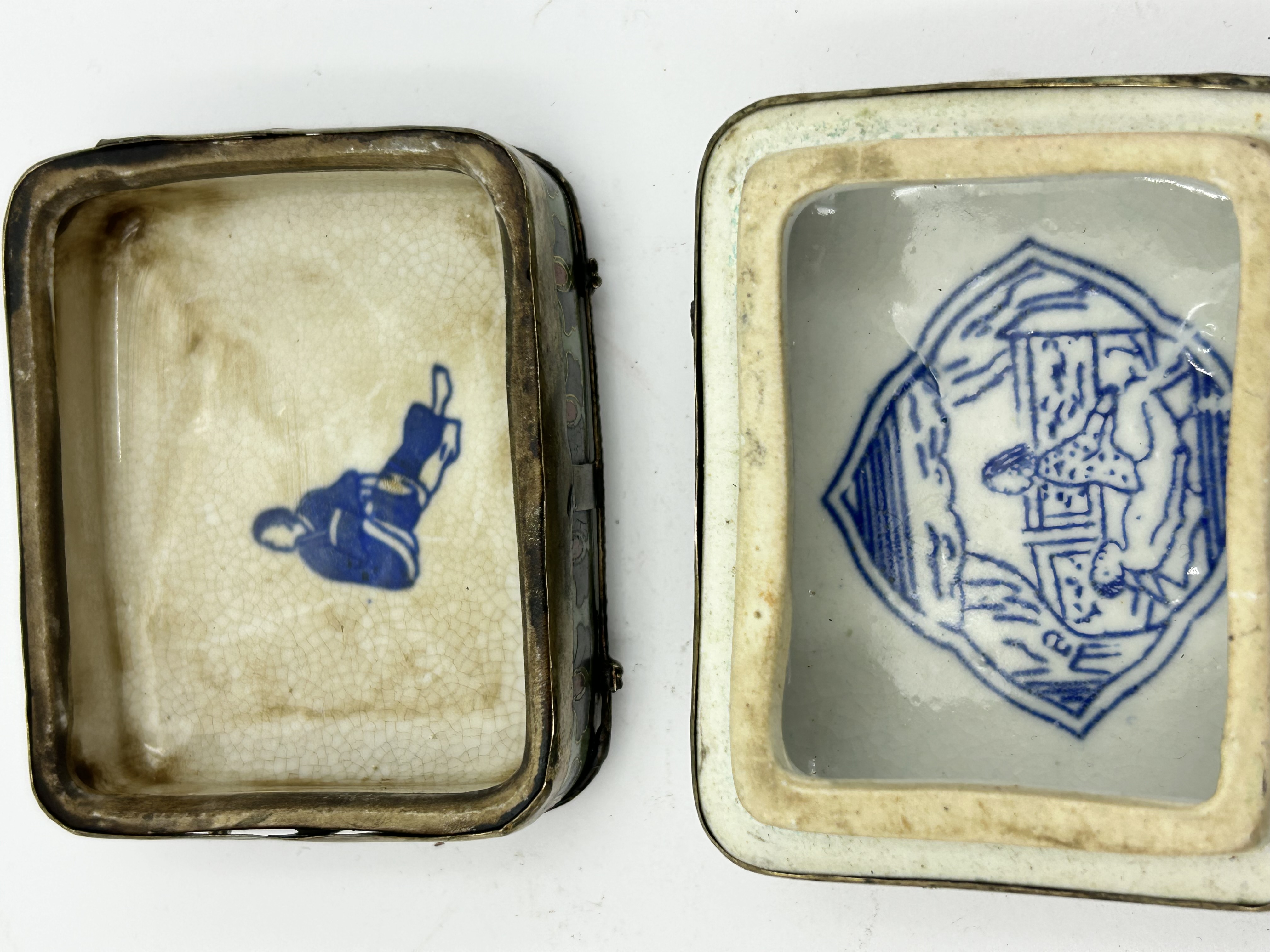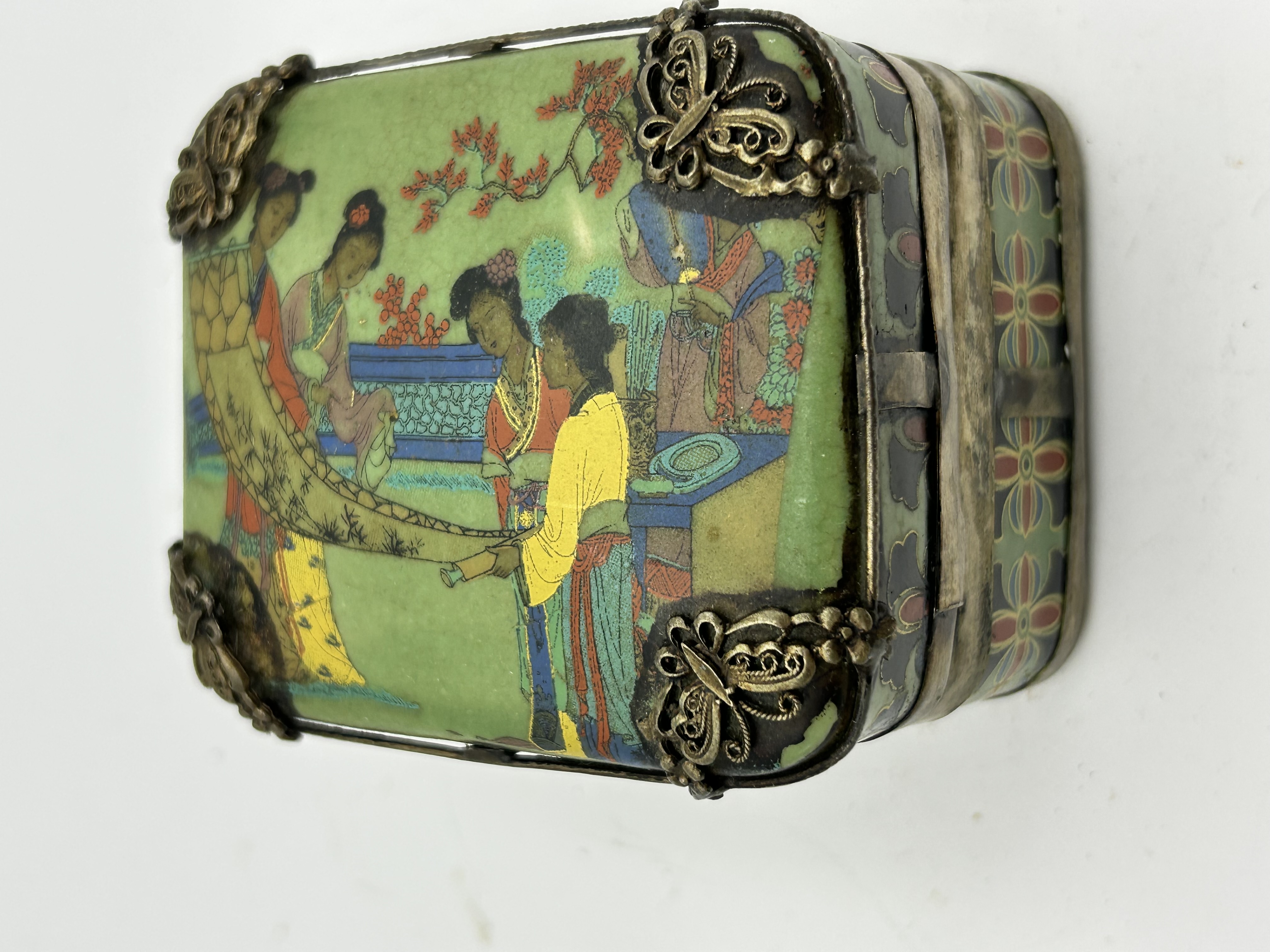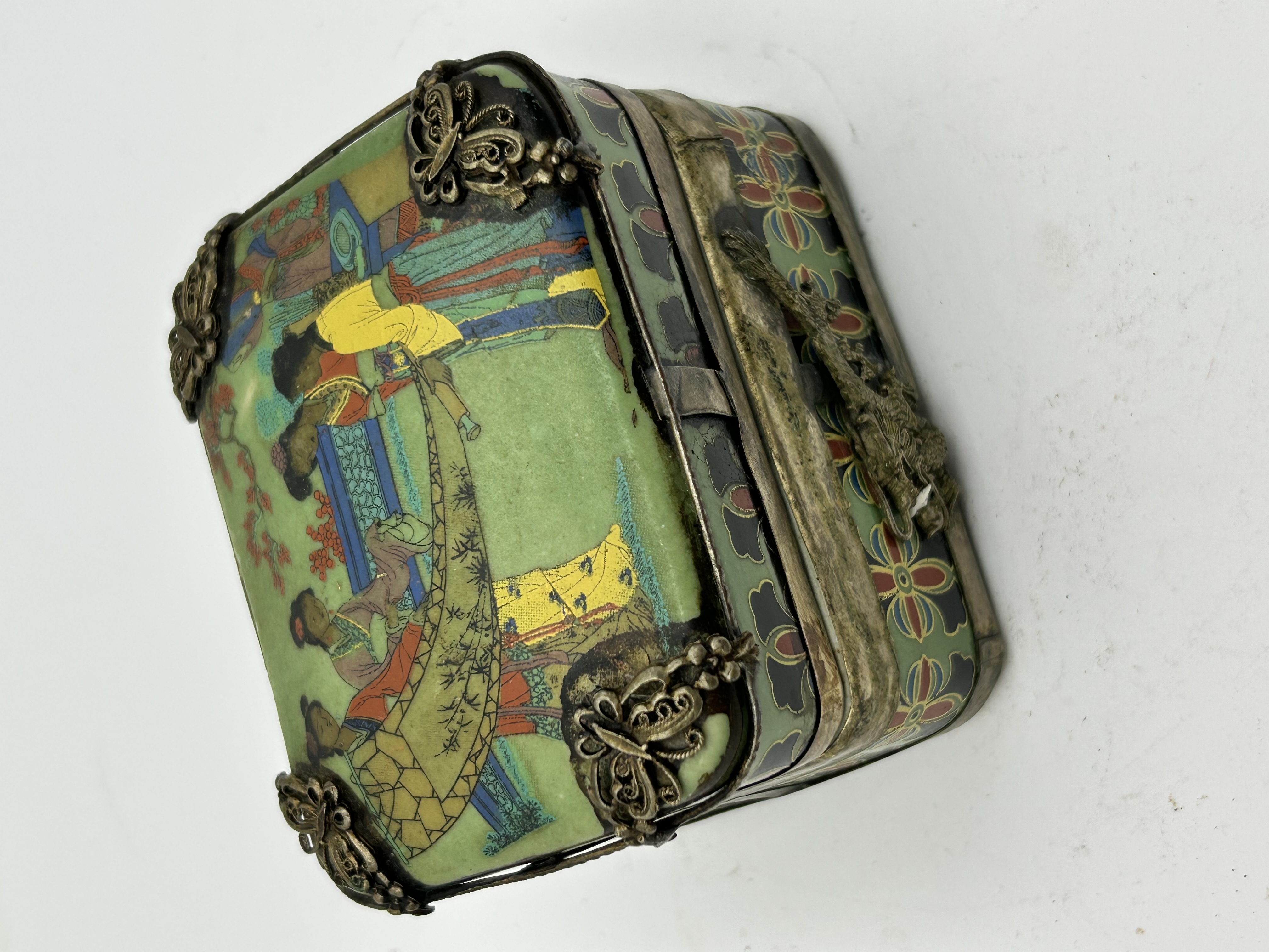 A Chinese export-style rectangular lidded box featuring polychrome decorated porcelain panels set within an ornate metal frame. The exterior lid is decorated with a narrative scene depicting figures in traditional attire within a garden setting, while the side panels feature stylized floral patterns. The box is constructed with decorative butterfly-shaped corner mounts and a hinged metal latch. The interior is lined with ceramic featuring pronounced crazing and underglaze blue pictorial scenes depicting erotic subjects.