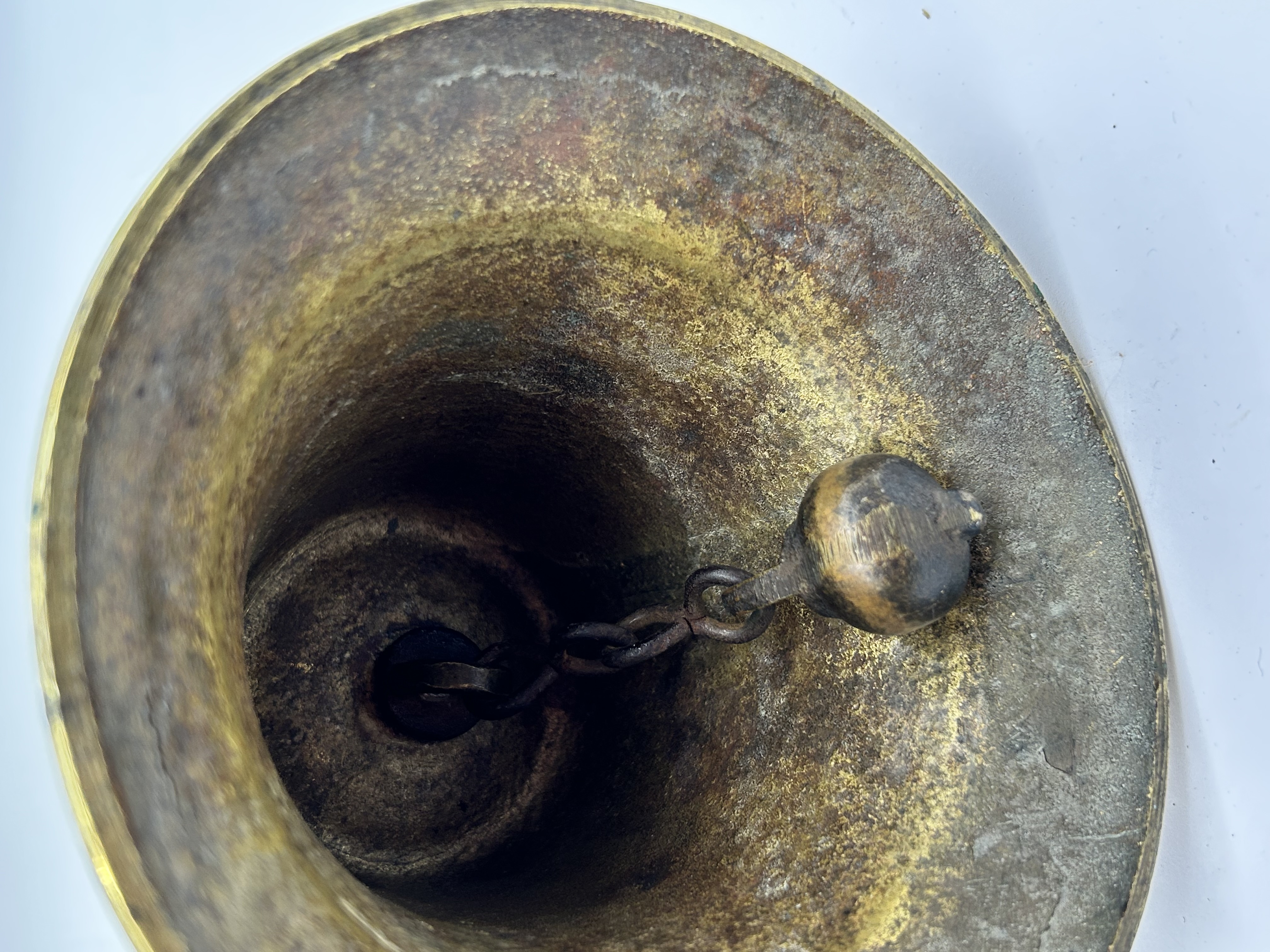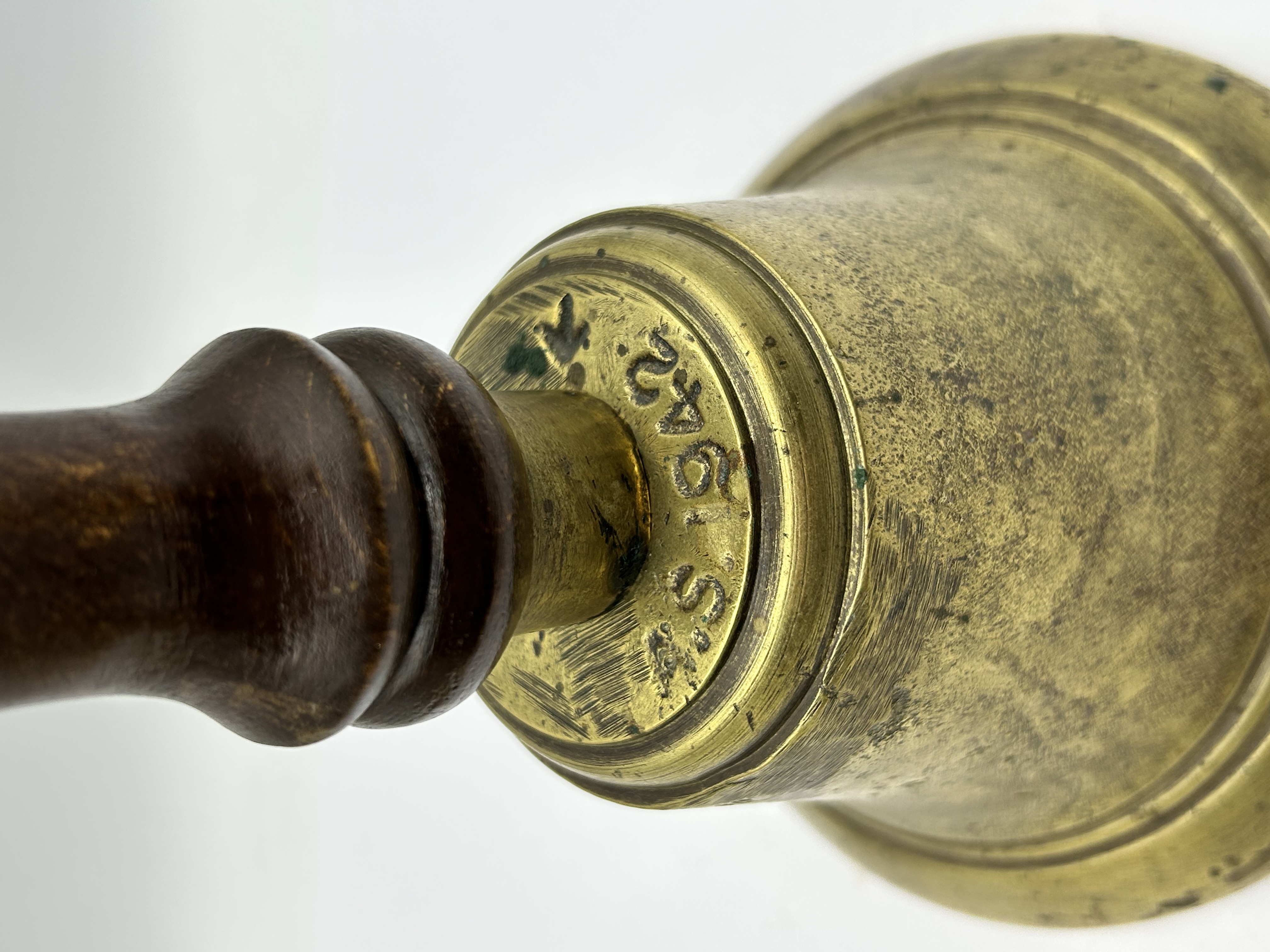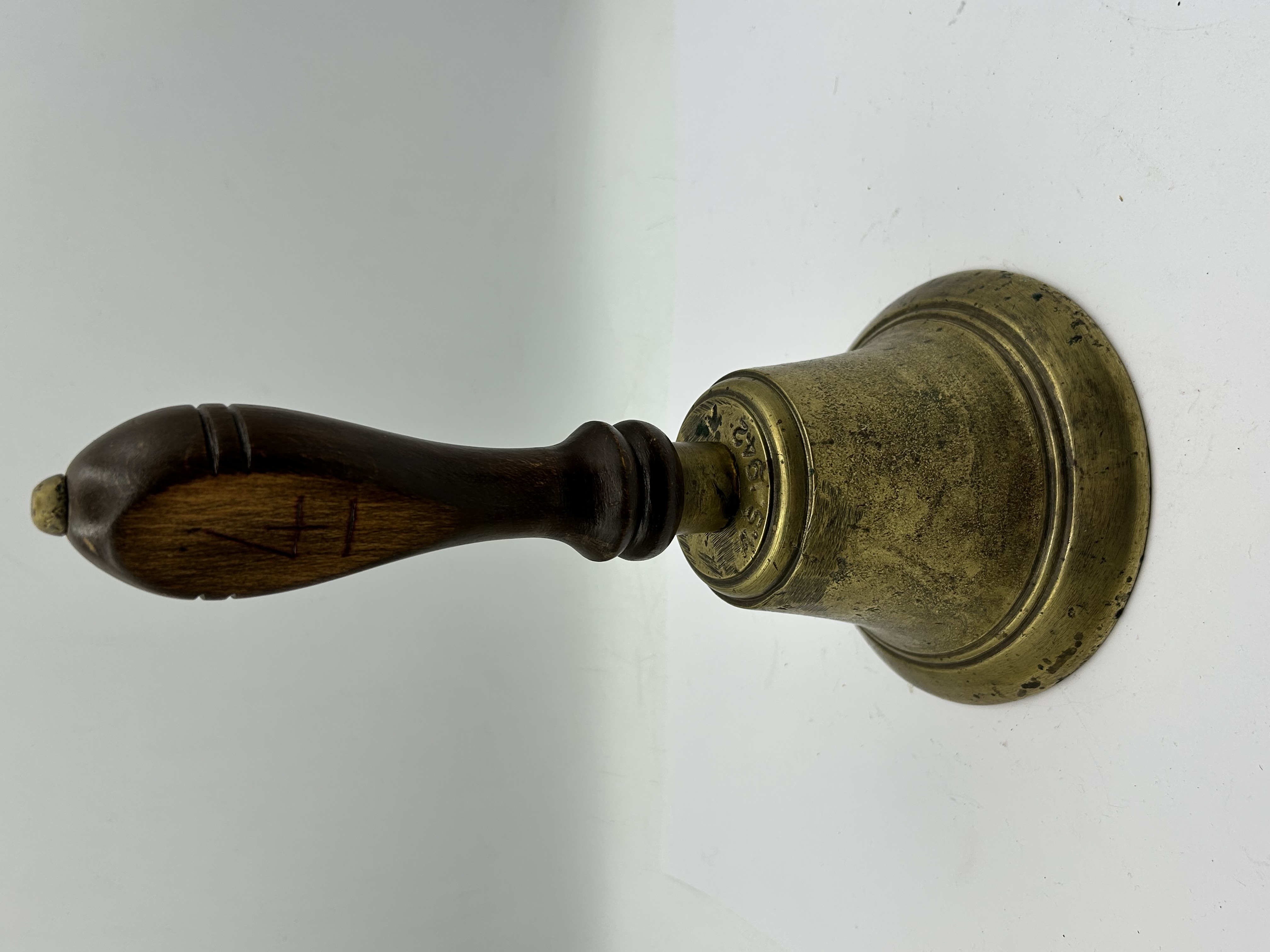A British military issue hand bell featuring a cast brass body and a turned wooden handle. The shoulder of the bell is stamped with the British Broad Arrow pheon mark, the date 1942, and the letter S. The wooden handle is finished with a hand-carved Roman numeral VI. The interior contains a metal clapper attached to the crown via a metal chain. This type of bell was utilized during World War II for civil defense and air raid precaution signaling.
