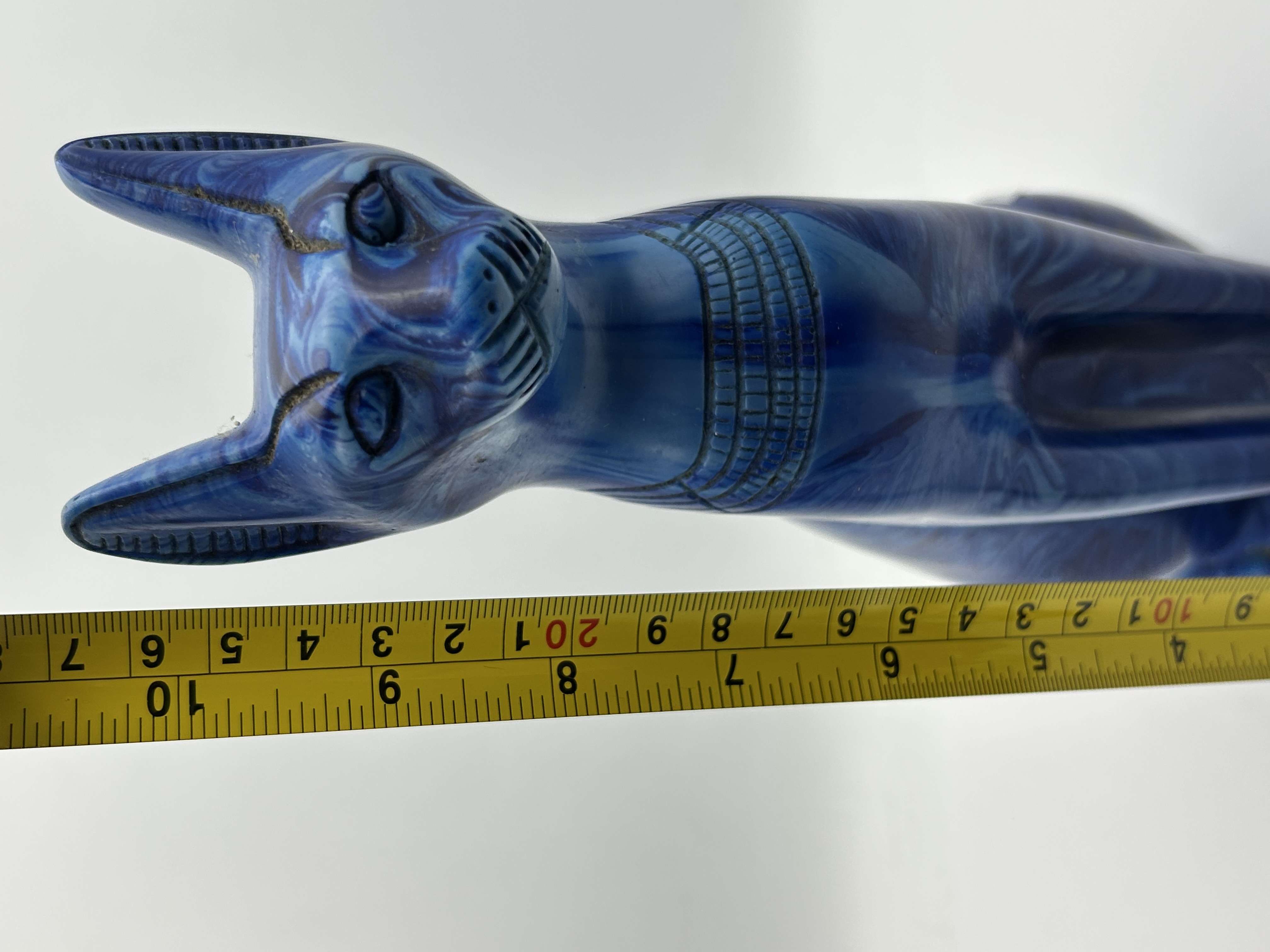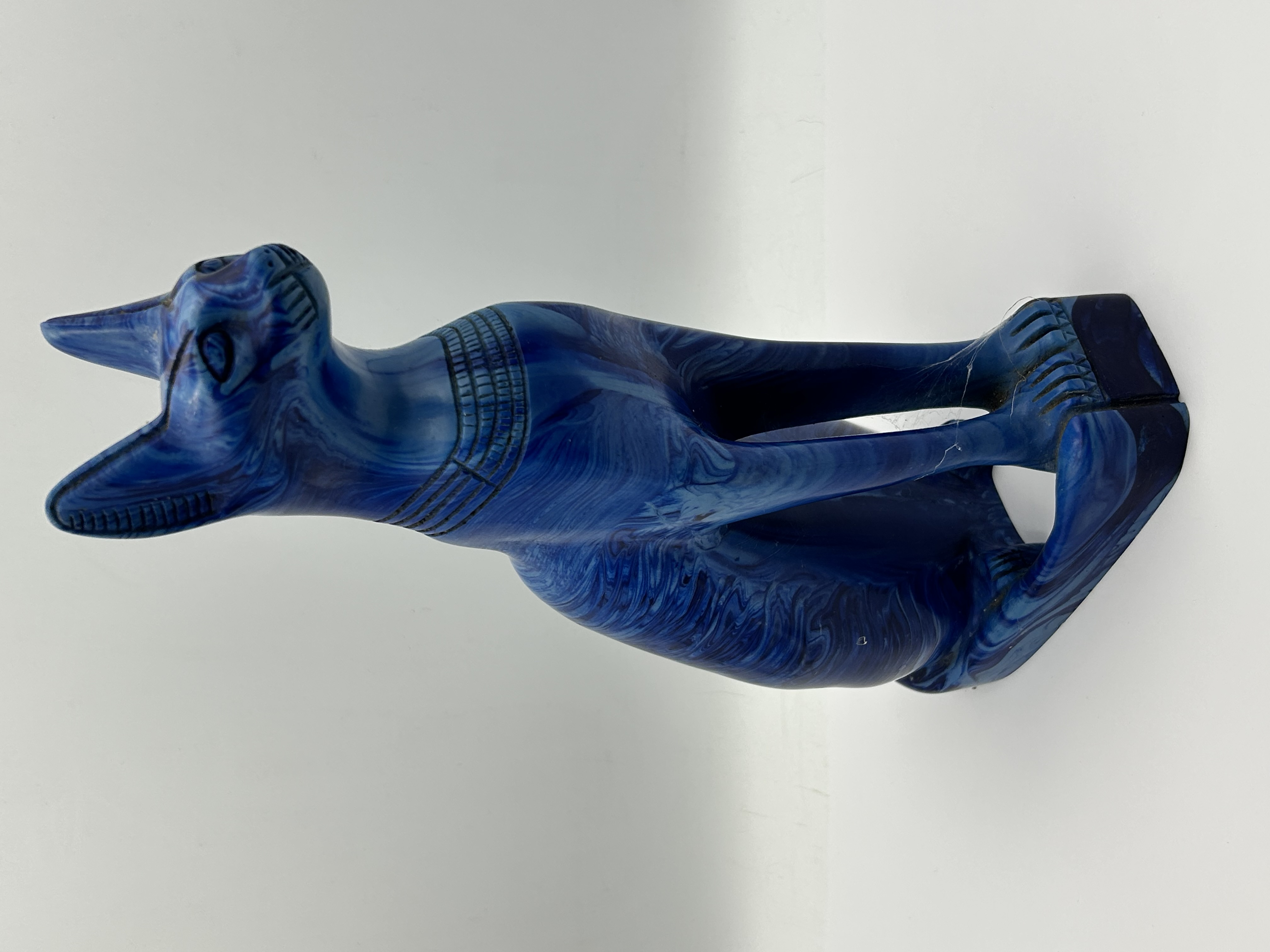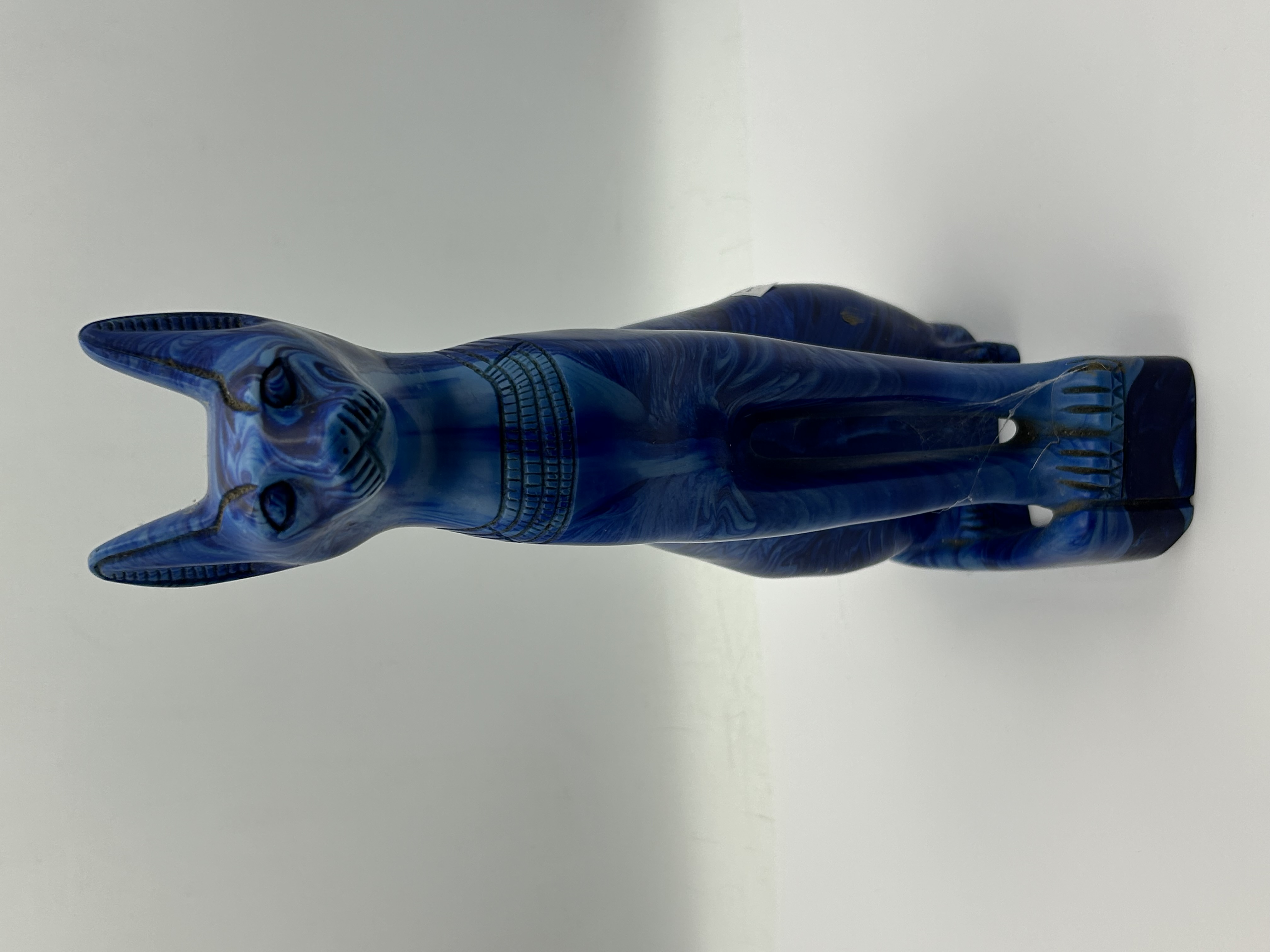 An Egyptian Bastet cat statue rendered in a seated position. The figurine is composed of a blue material with dark, marbled swirl patterns throughout, consistent composite construction. The piece features incised decorative elements, including a broad collar around the neck and stylized facial features accented with dark pigment. The design reflects the Ancient Egyptian revival style associated with the goddess Bastet.