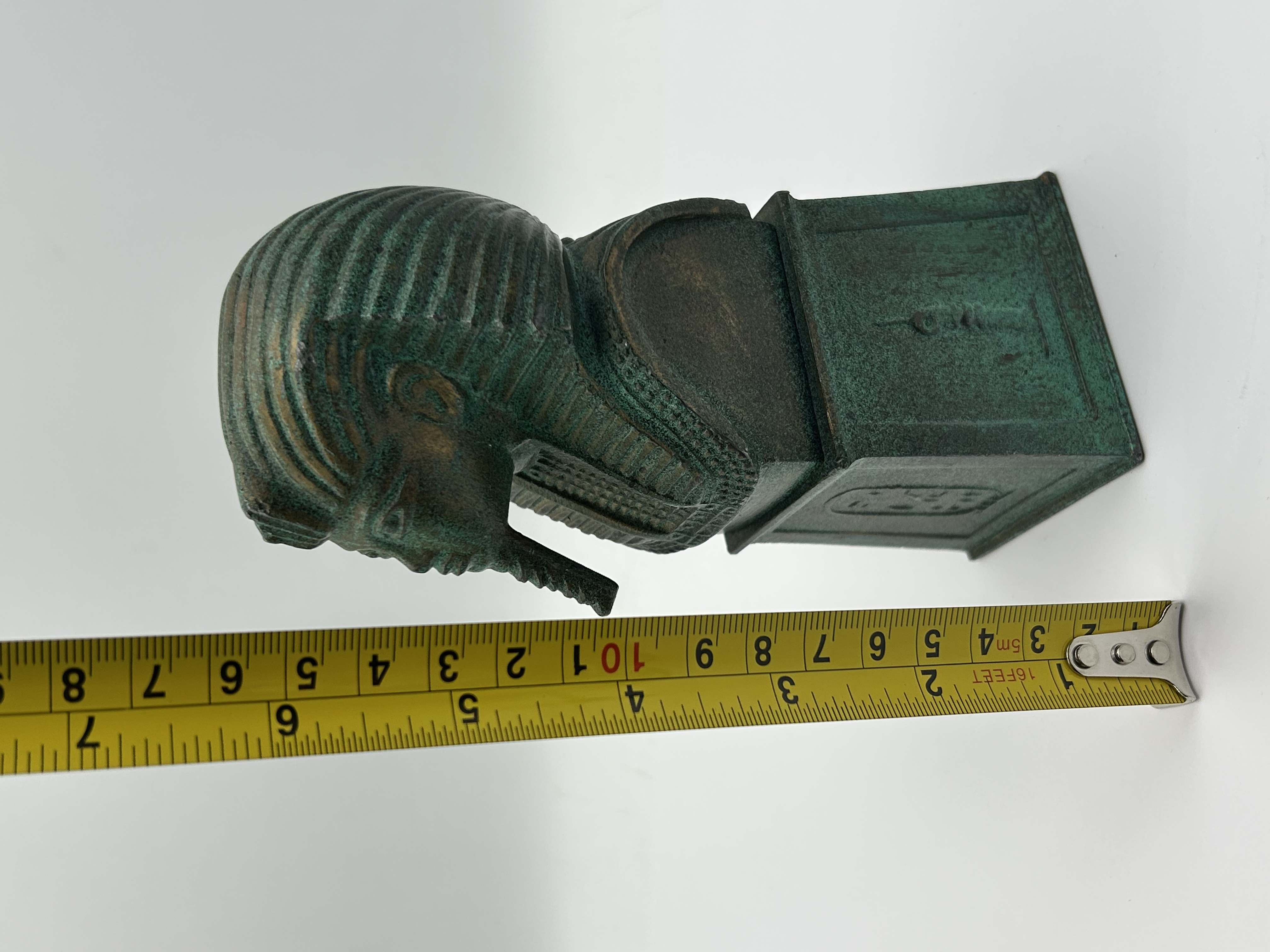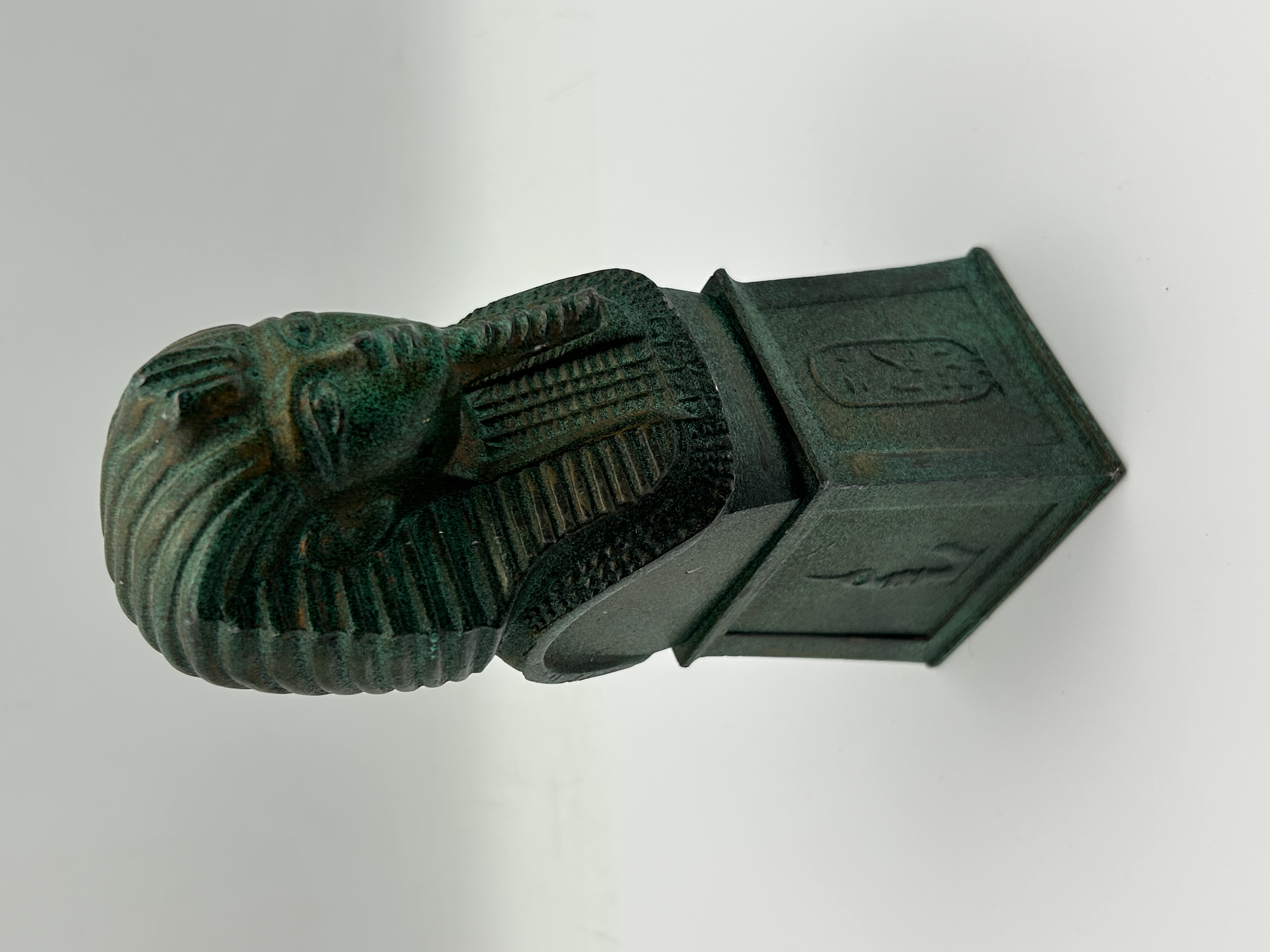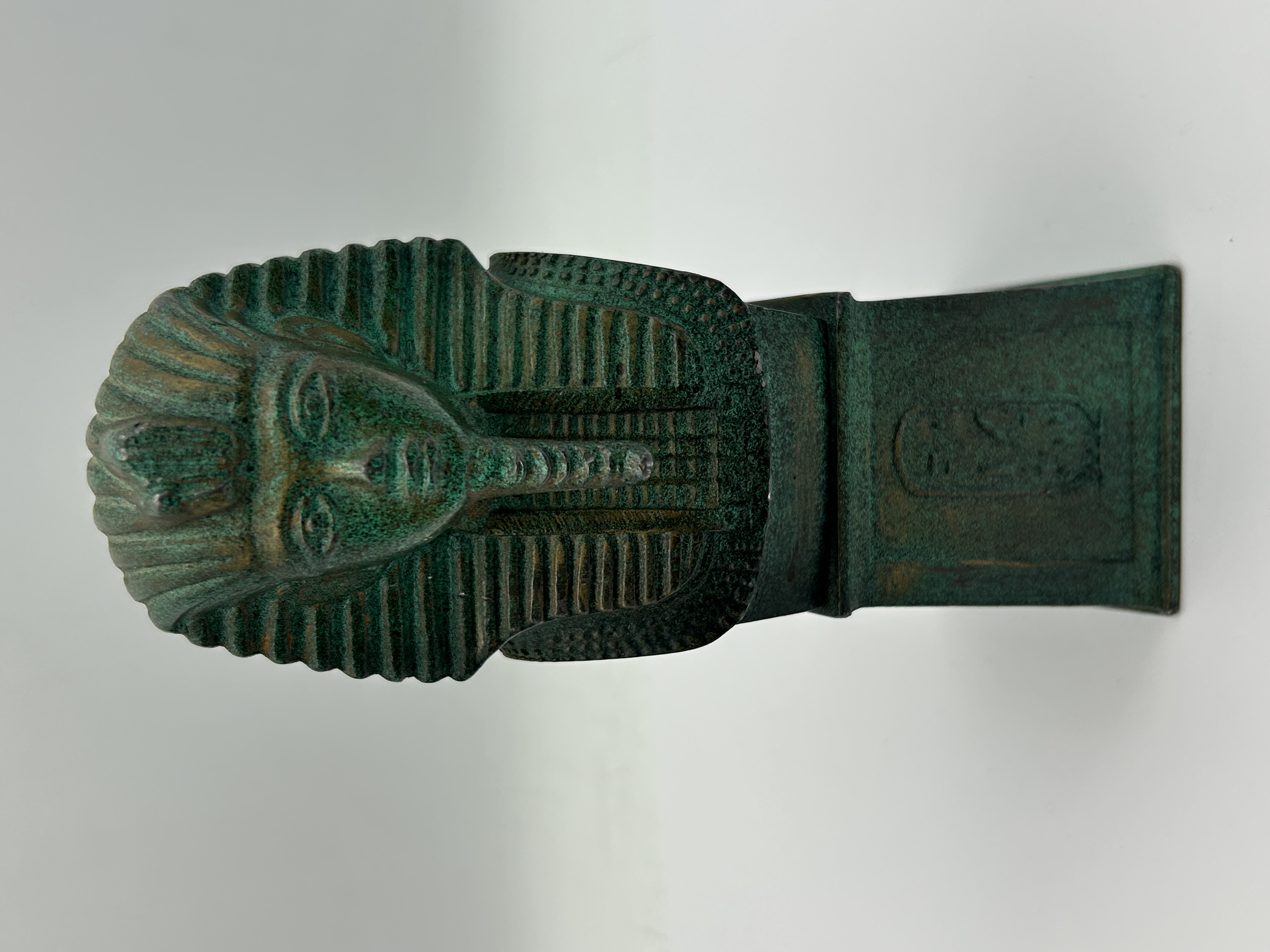 An Egyptian Revival pharaoh bust, likely a decorative sculpture or bookend, executed in cast metal with a heavy green verdigris patina. The figure depicts a pharaoh wearing a traditional striped nemes headdress and a long, braided false beard. The head is integrated into a rectangular pedestal base featuring cast Egyptian-style cartouches and hieroglyphic-inspired markings on several faces. The construction shows an intentionally aged finish with surface oxidation.