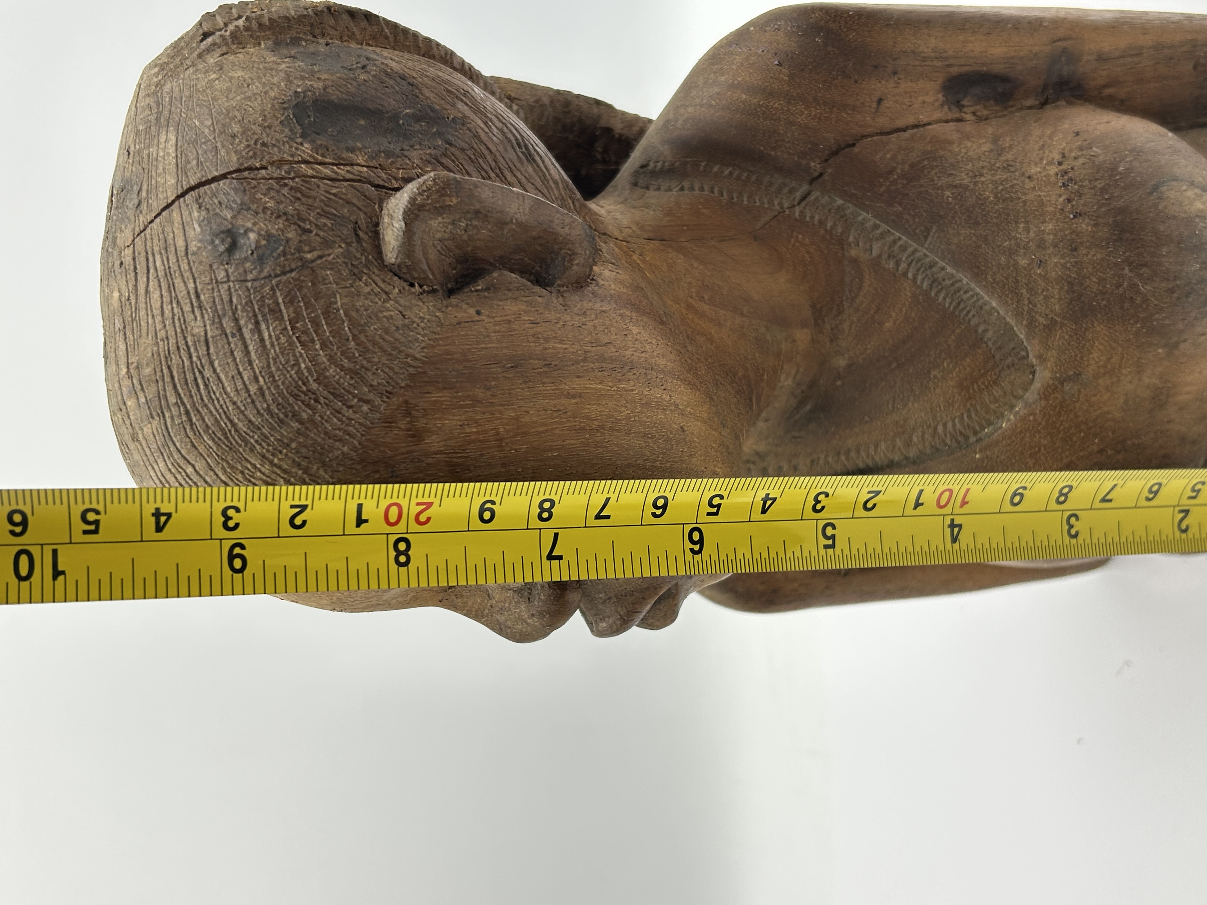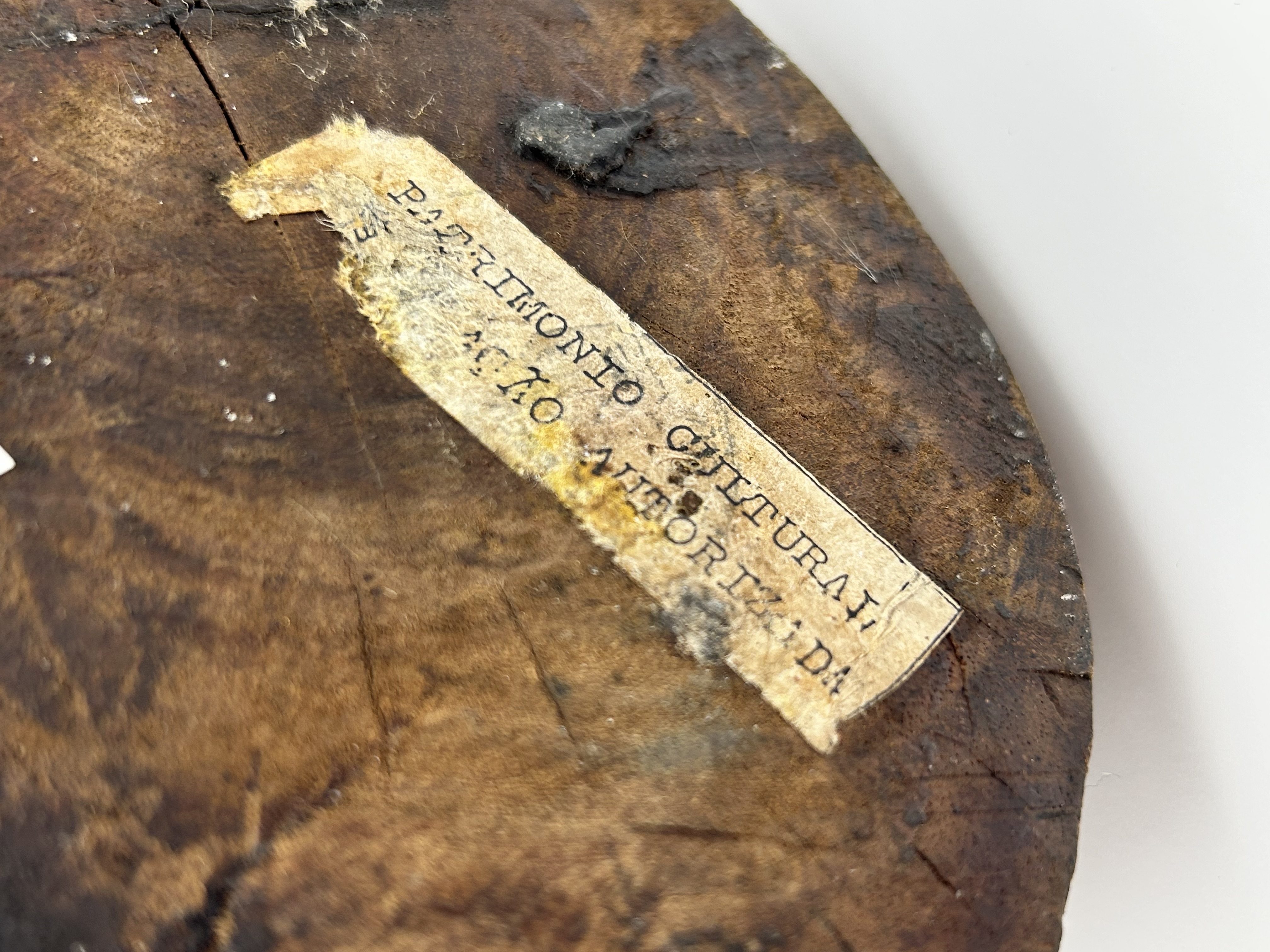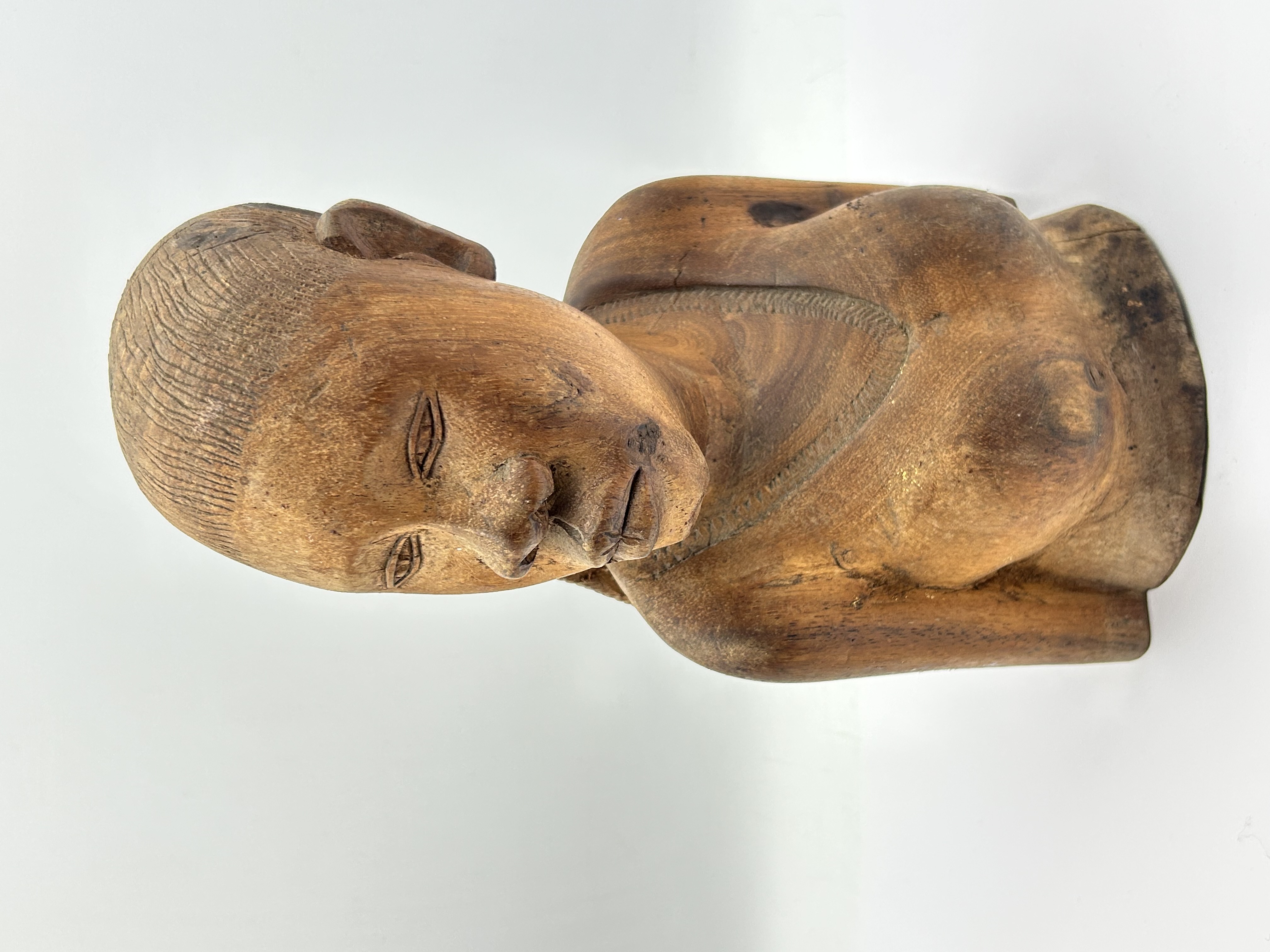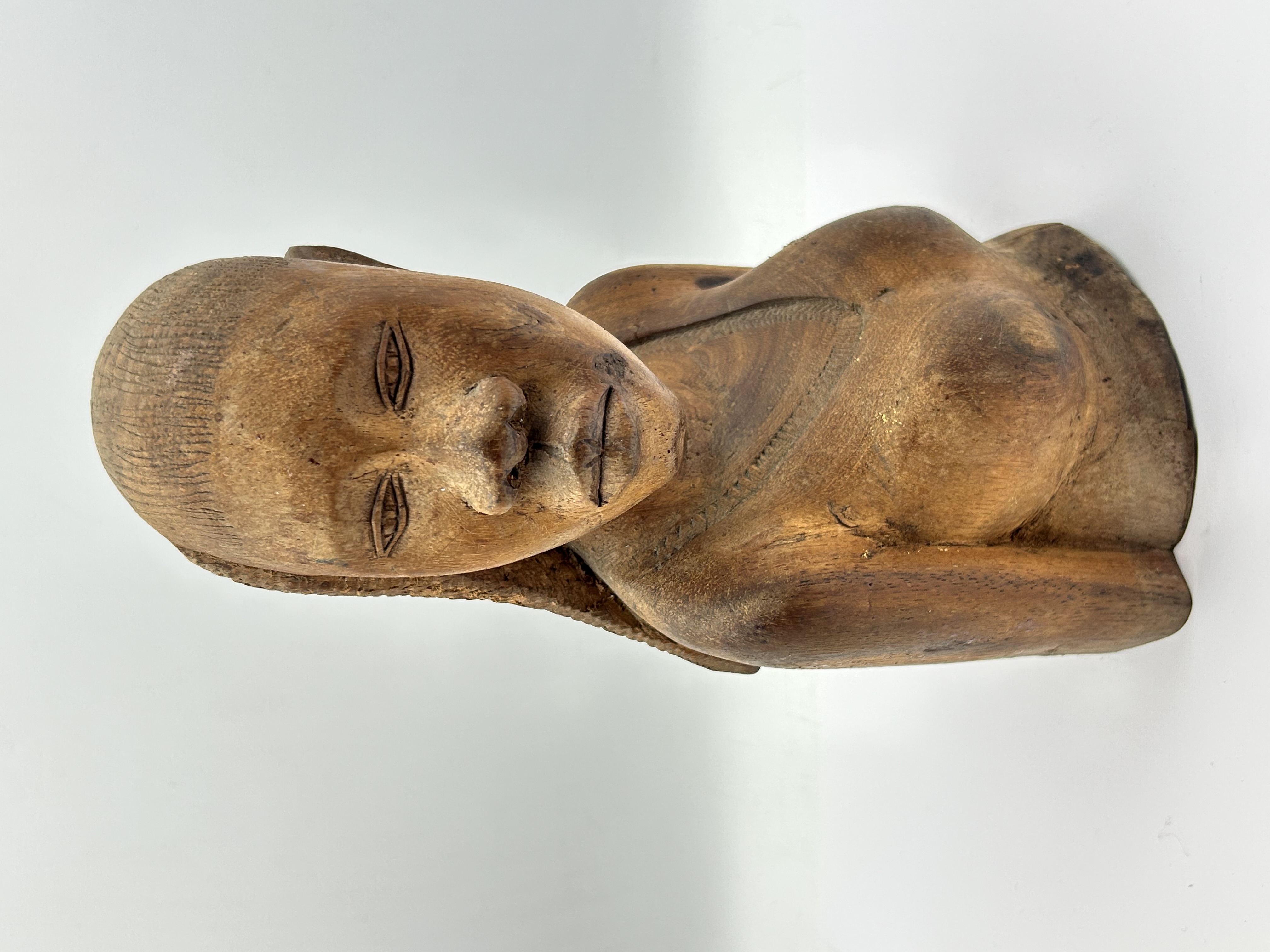 This hand-carved wooden bust depicts a female figure in a traditional style, crafted from a single block of polished hardwood. The sculpture features stylized facial features with downcast eyes, finely incised hair texture, and a decorative carved necklace. A partially preserved paper label on the base is inscribed with the Portuguese text PATRIMONIO CULTURAL / EXPORTAÇÃO AUTORIZADA DA.